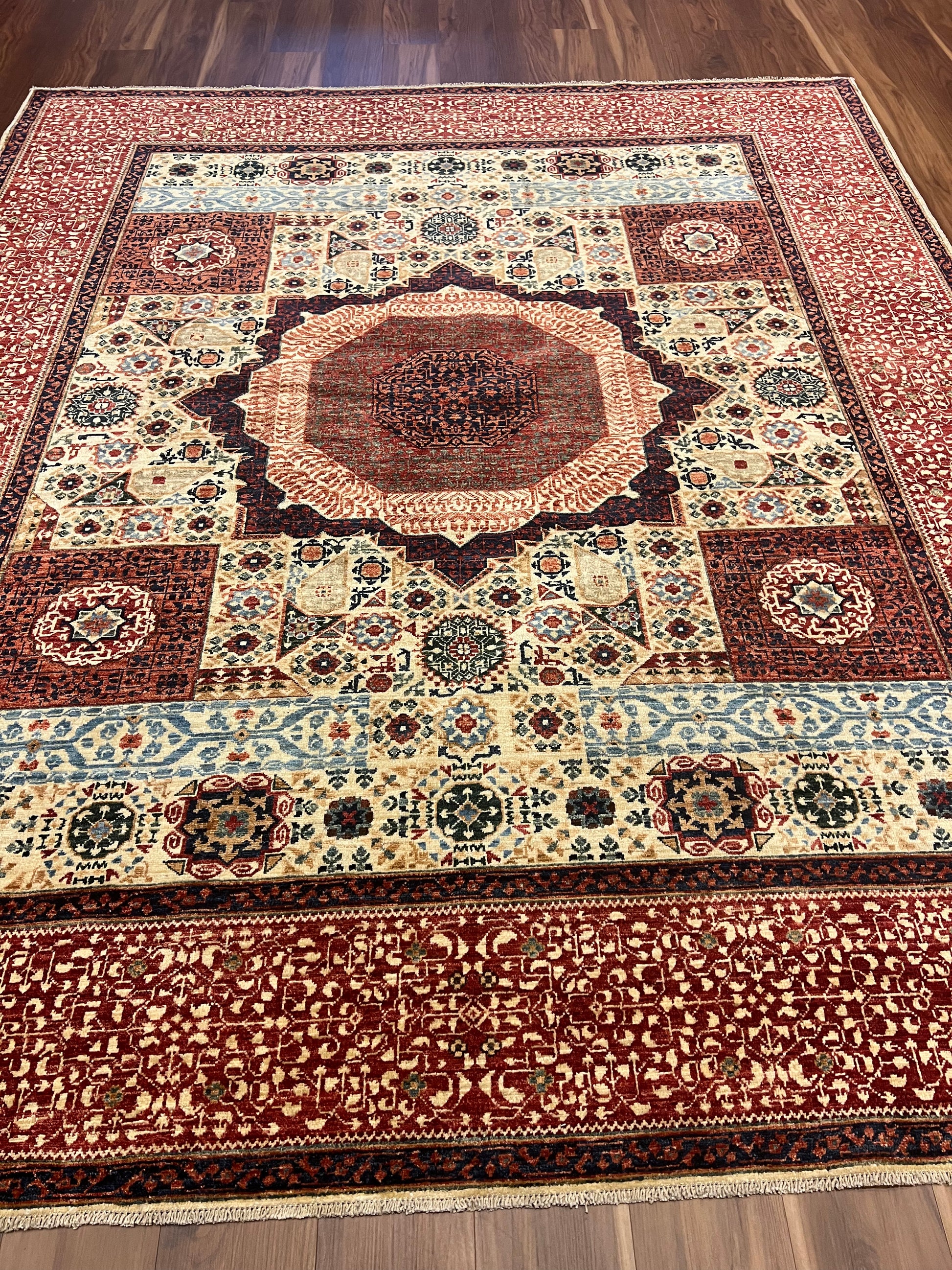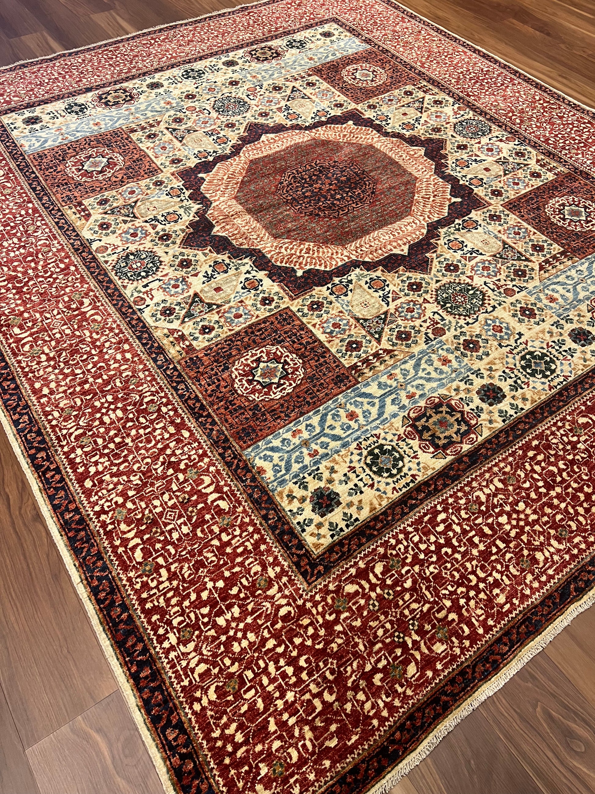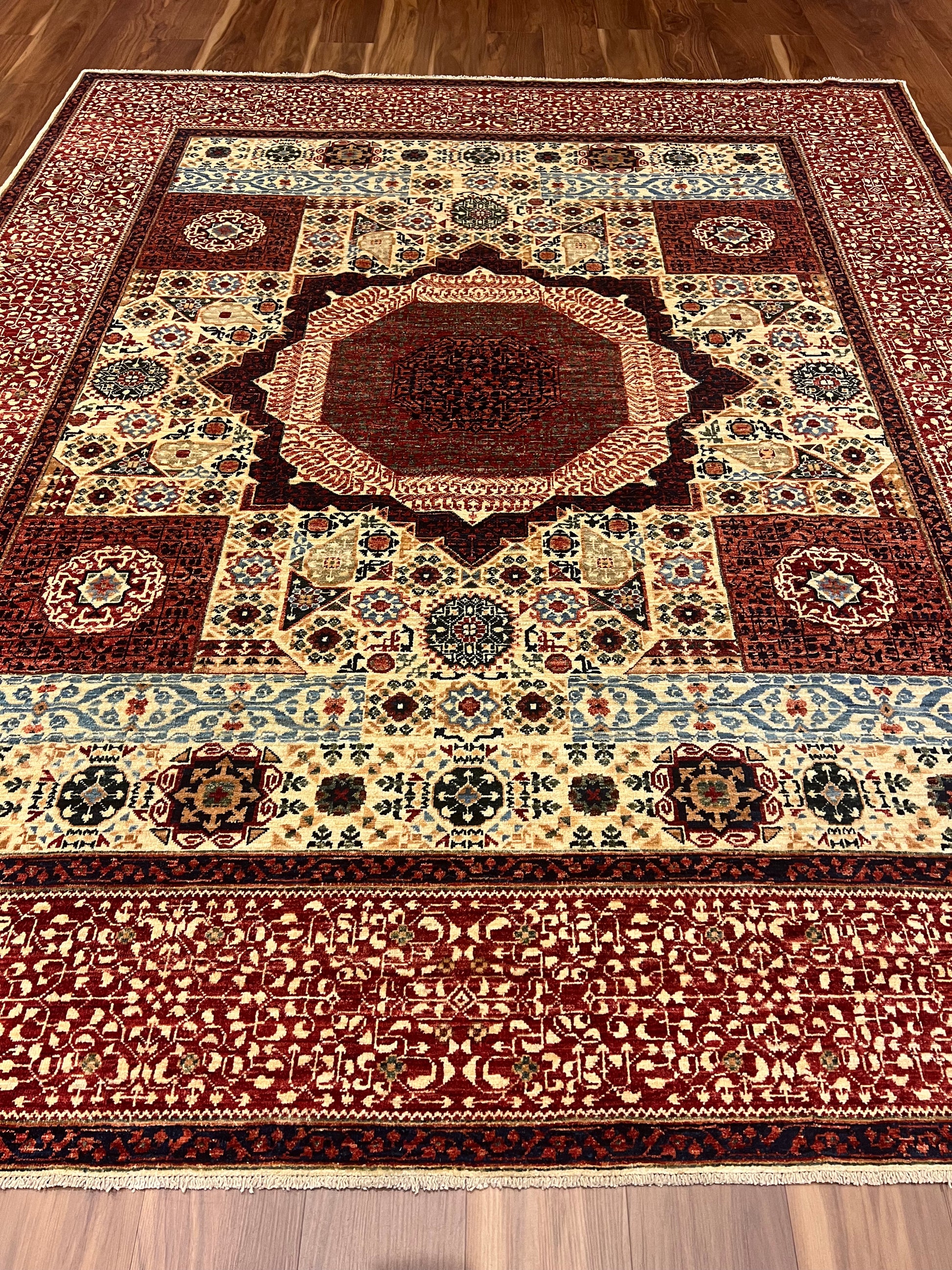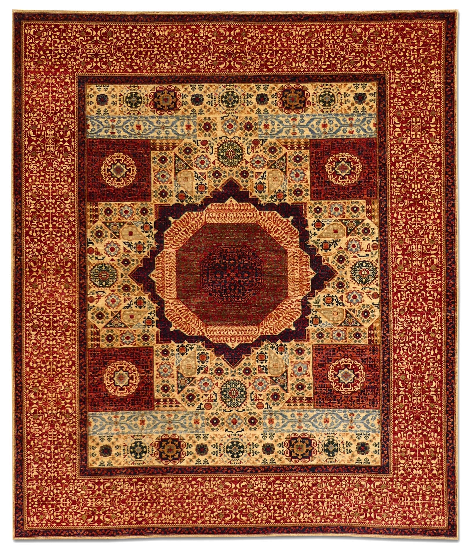 The Cairo Mamluk rug is an exquisite piece, showcasing masterful artistry with its detailed geometric and medallion patterns. The rug boasts a rich palette of red, blue, beige, and gold, creating a vibrant yet classic look. Made of high-quality wool, it offers both durability and comfort underfoot. The intricate design is inspired by historic Mamluk textiles, featuring layered borders that encompass a central octagonal medallion. Perfect for adding a touch of elegance and history to any room.