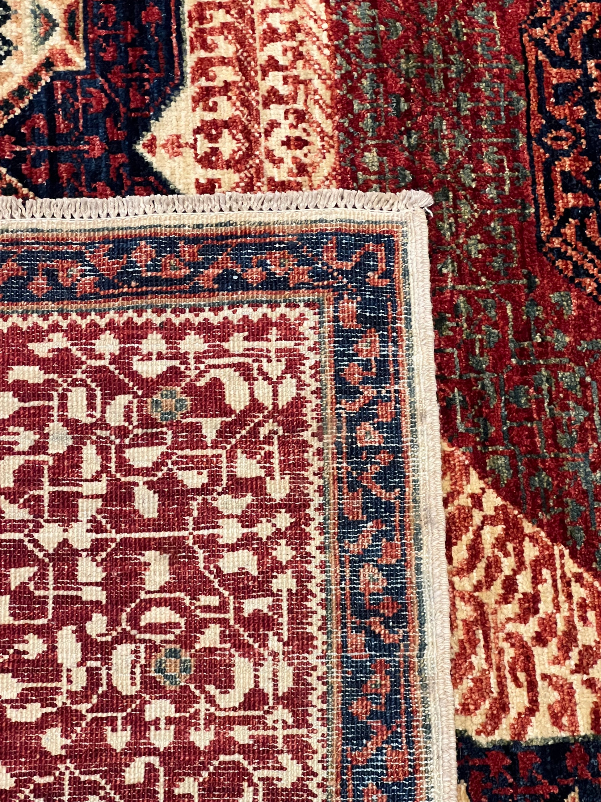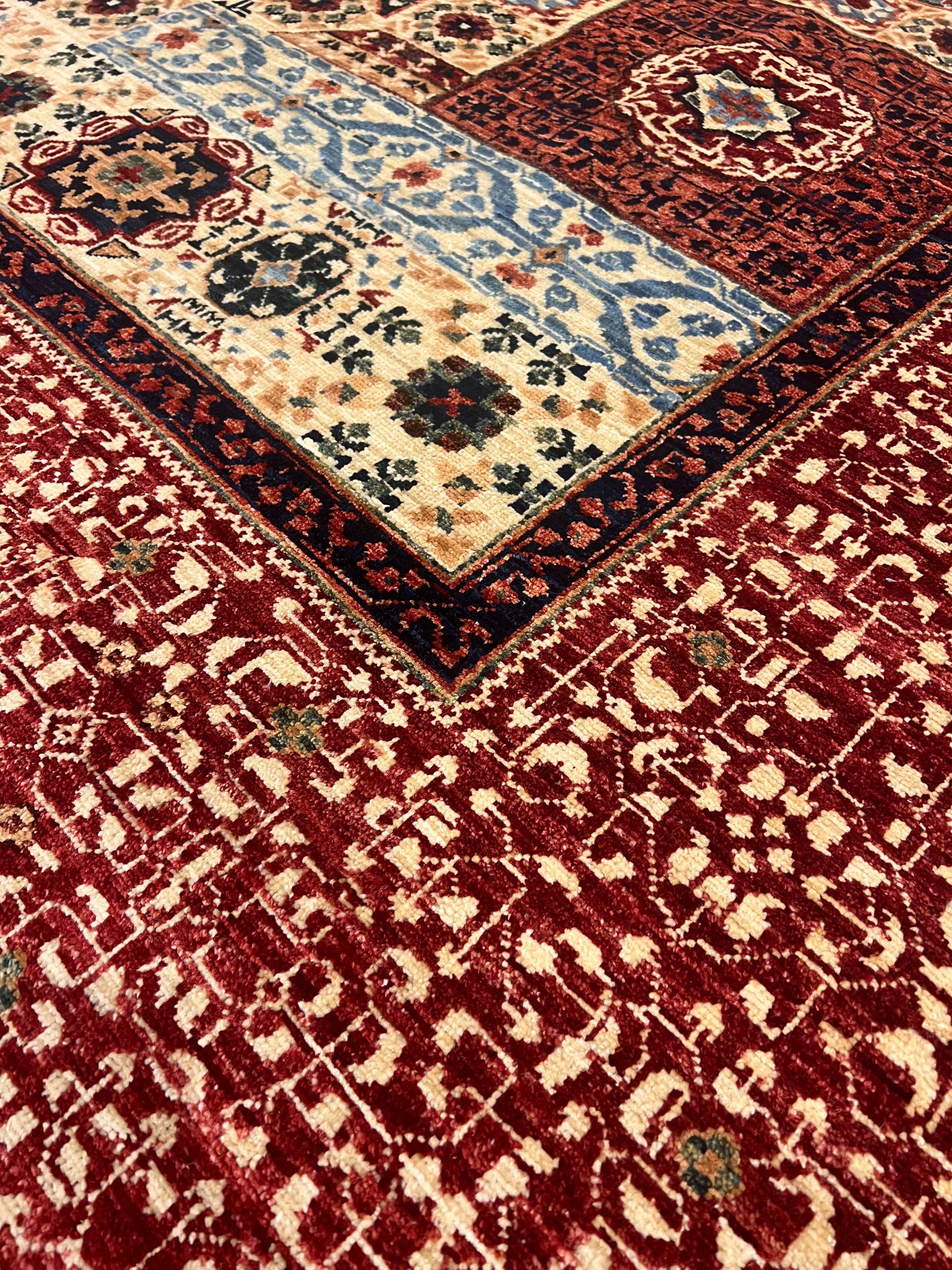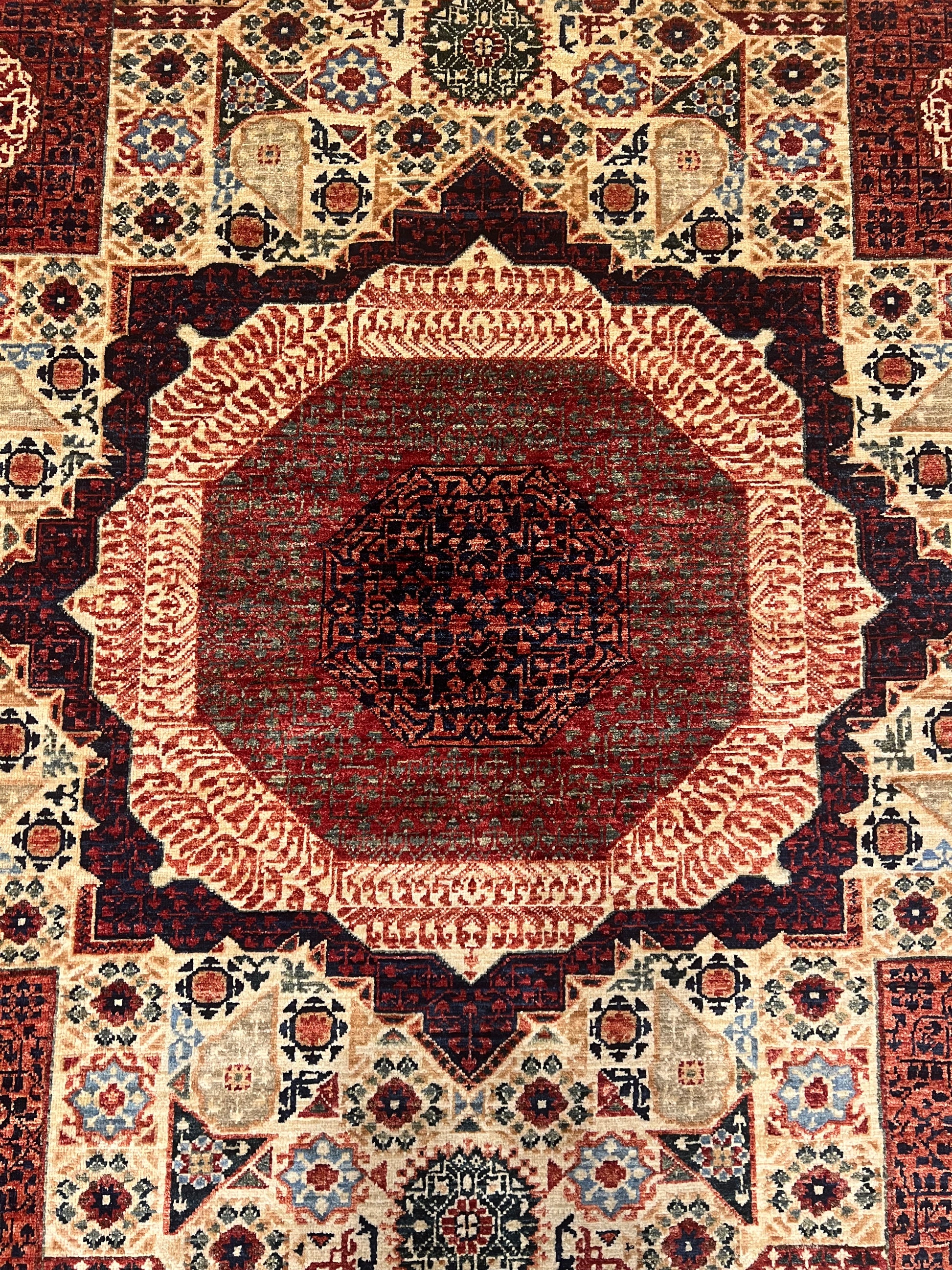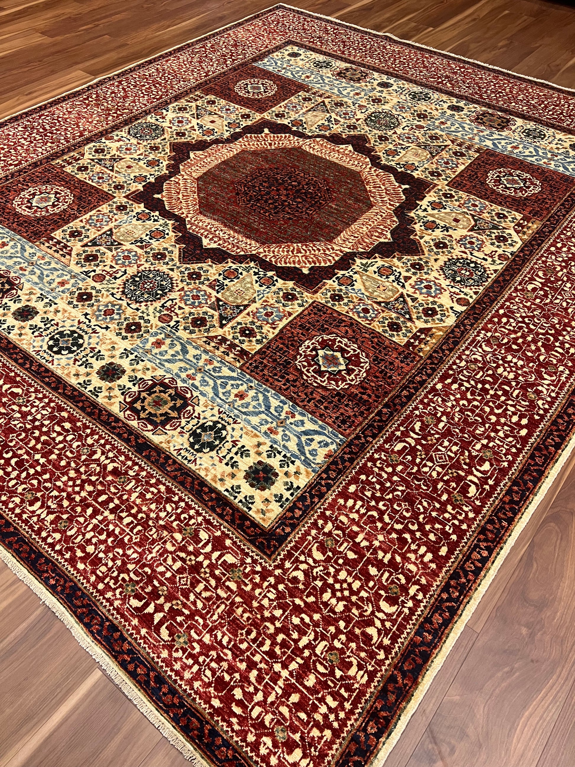 The Cairo Mamluk rug is an exquisite piece, showcasing masterful artistry with its detailed geometric and medallion patterns. The rug boasts a rich palette of red, blue, beige, and gold, creating a vibrant yet classic look. Made of high-quality wool, it offers both durability and comfort underfoot. The intricate design is inspired by historic Mamluk textiles, featuring layered borders that encompass a central octagonal medallion. Perfect for adding a touch of elegance and history to any room.