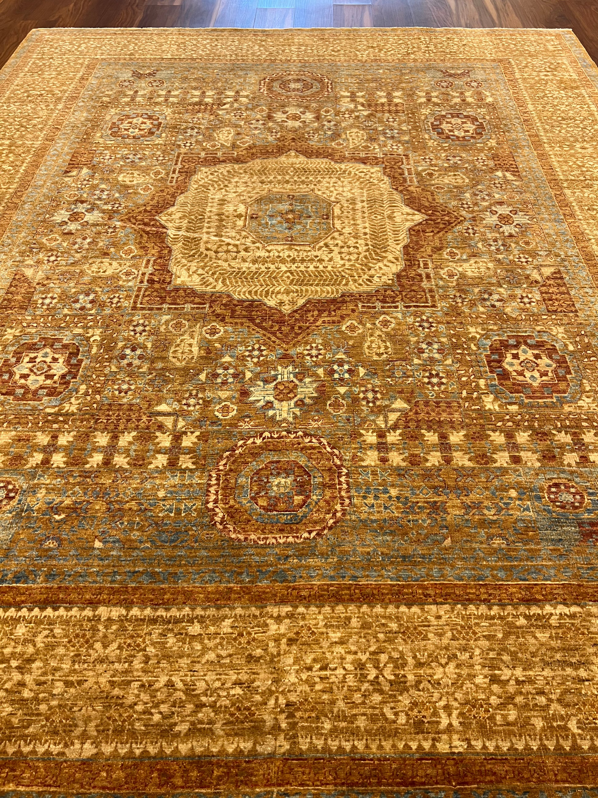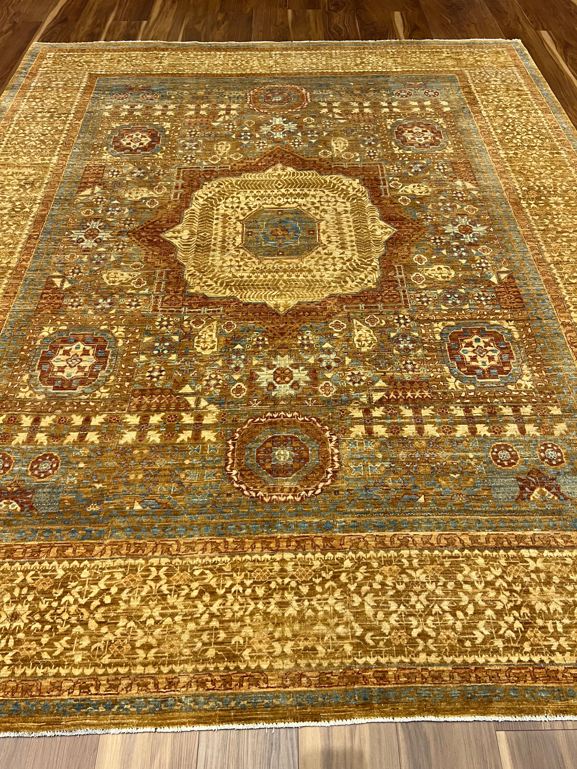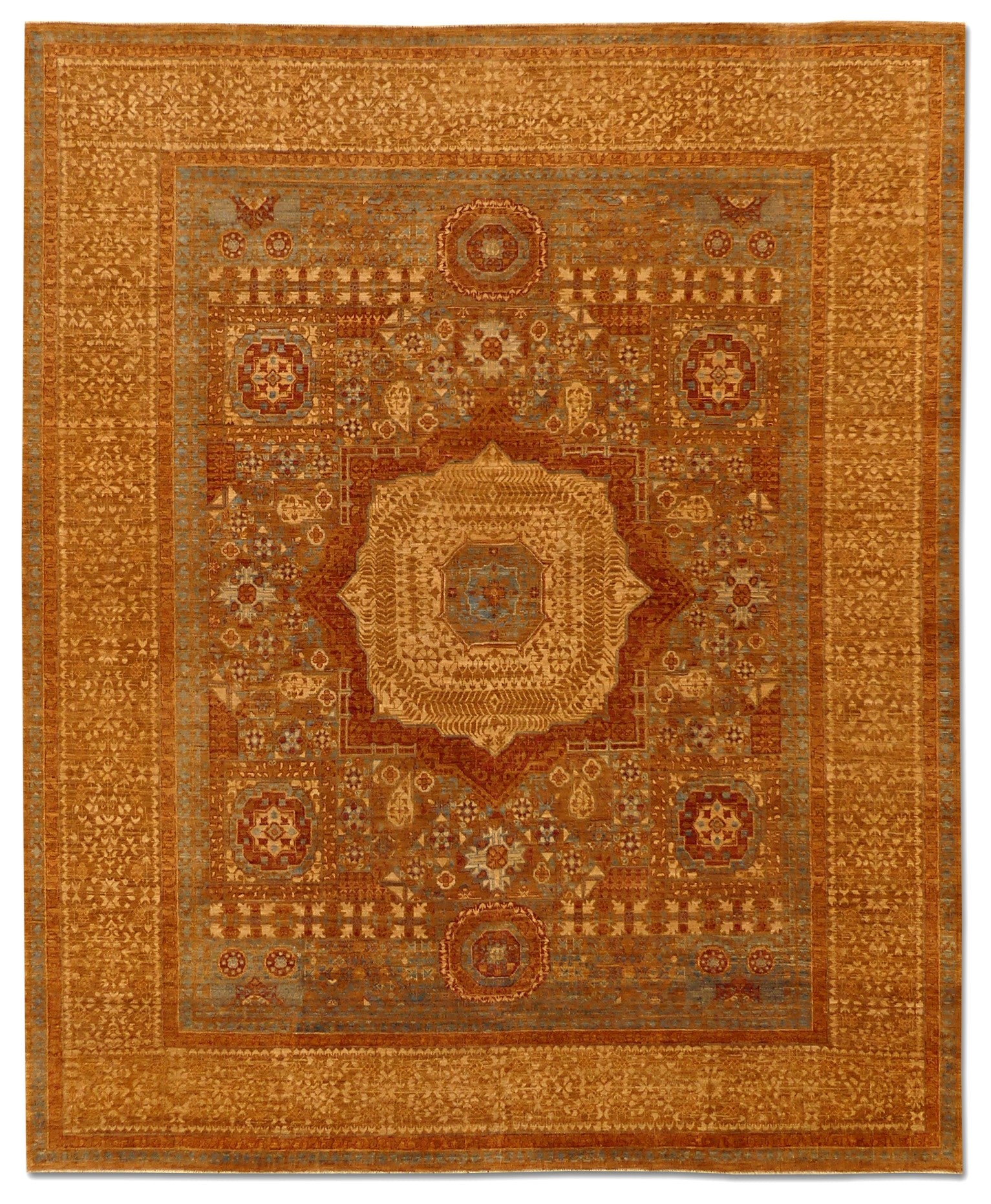 The Cairo Mamluk Wool Rug showcases a magnificent traditional design, resplendent with intricate geometric and floral patterns. Radiating from its centralized medallion, the layers of borders encapsulate a rich cultural heritage. Masterfully woven with high-quality wool, this piece exhibits a harmonious color palette that brings warmth and sophistication to any space. Its durability and plush texture make it a timeless addition to your home, seamlessly blending historic artistry with contemporary living.