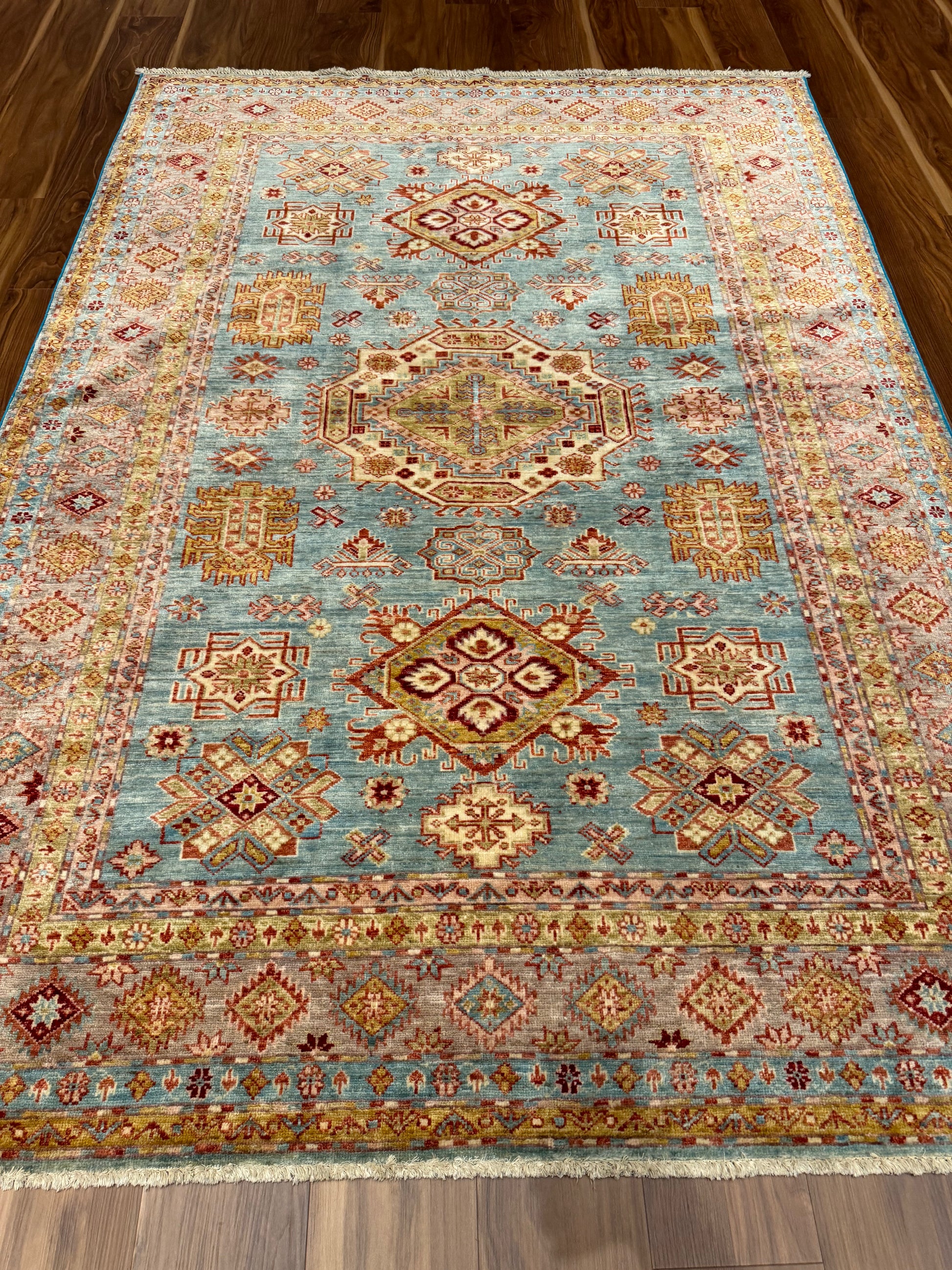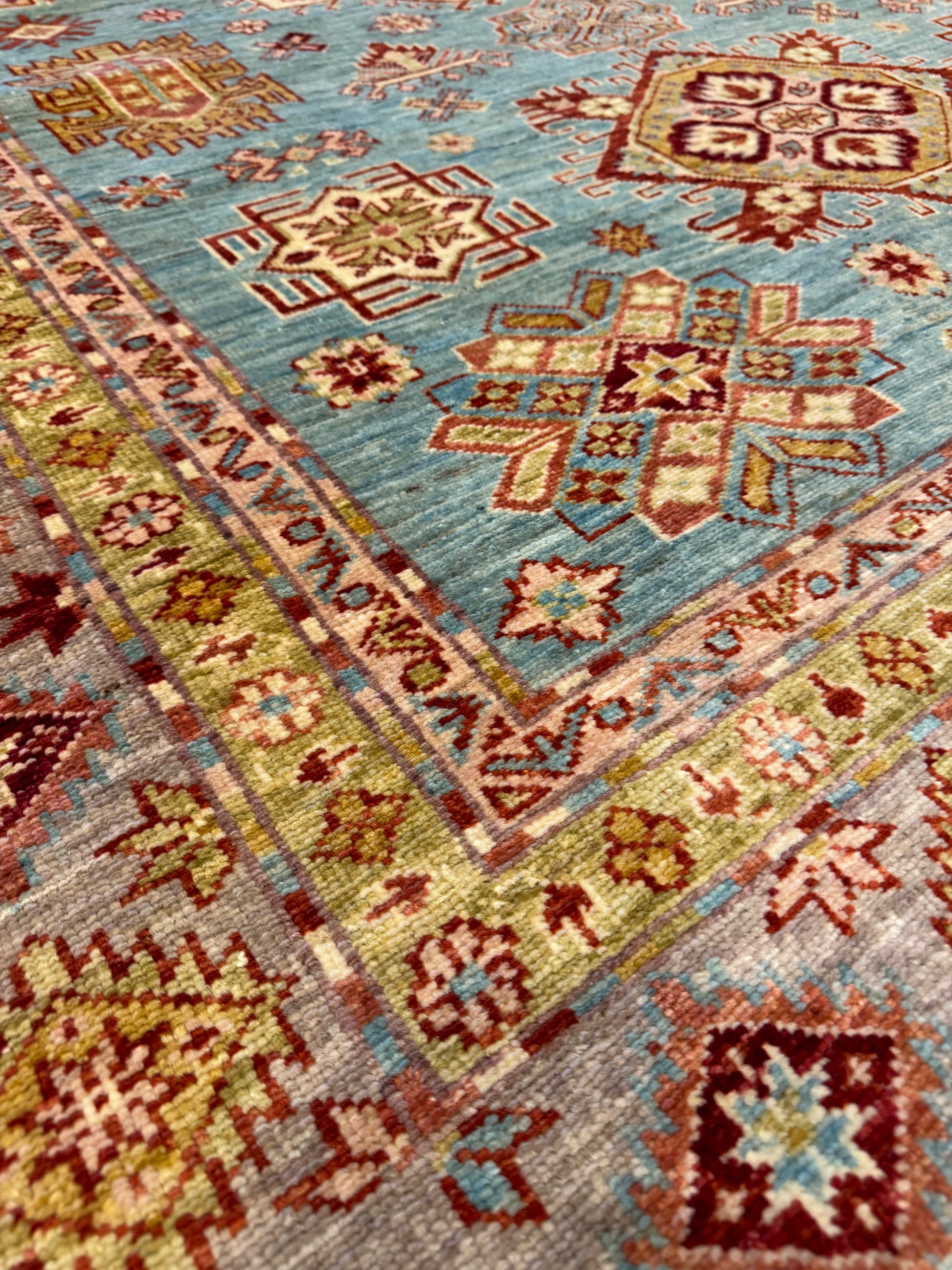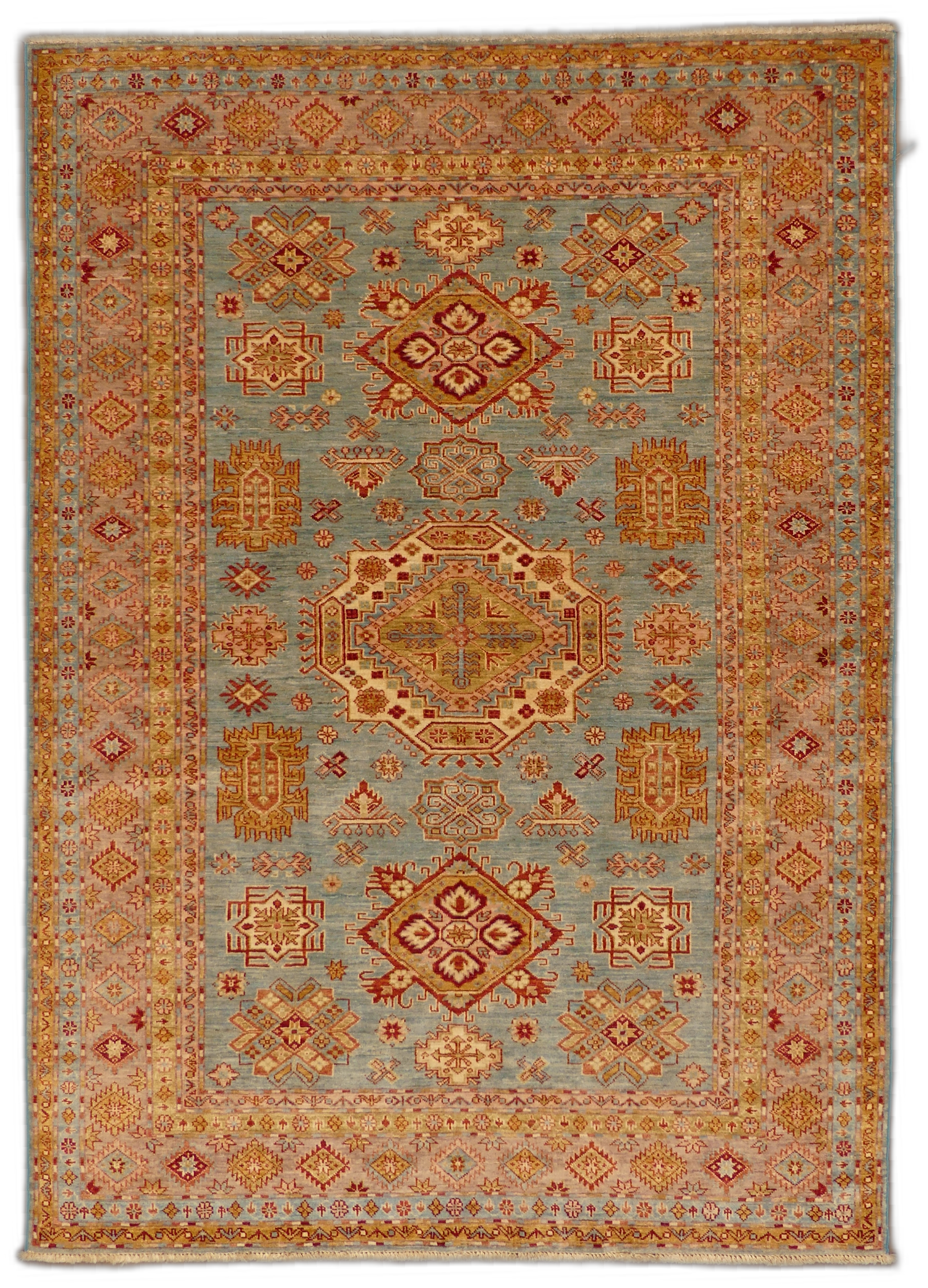 This exquisite Caucasian Kazak rug boasts a traditional style, with a blue field and orange and beige accents creating a striking contrast. Skilled artisans have meticulously crafted this piece from high-quality wool, featuring bold geometric patterns that evoke the rich heritage and craftsmanship of the Caucasus region. The harmonious color palette and the intricate border design add to its timeless appeal, making it a statement piece for both contemporary and classic interiors.