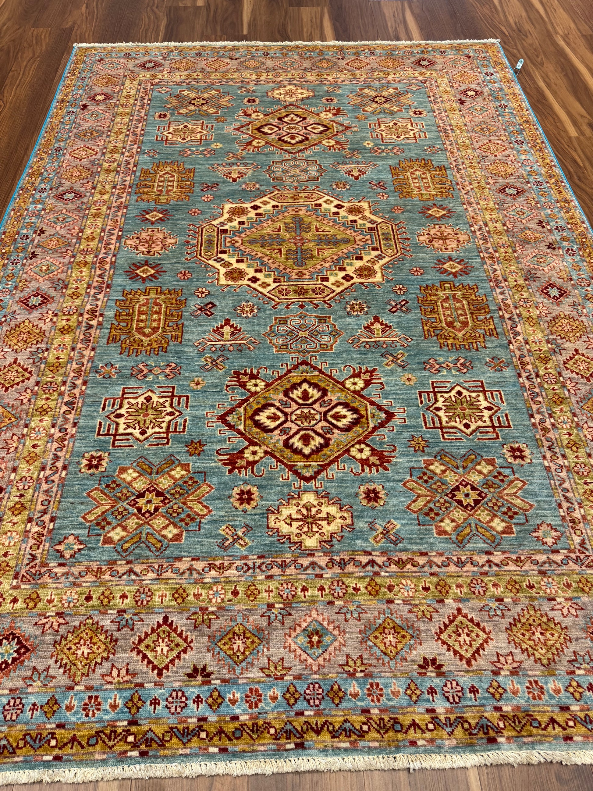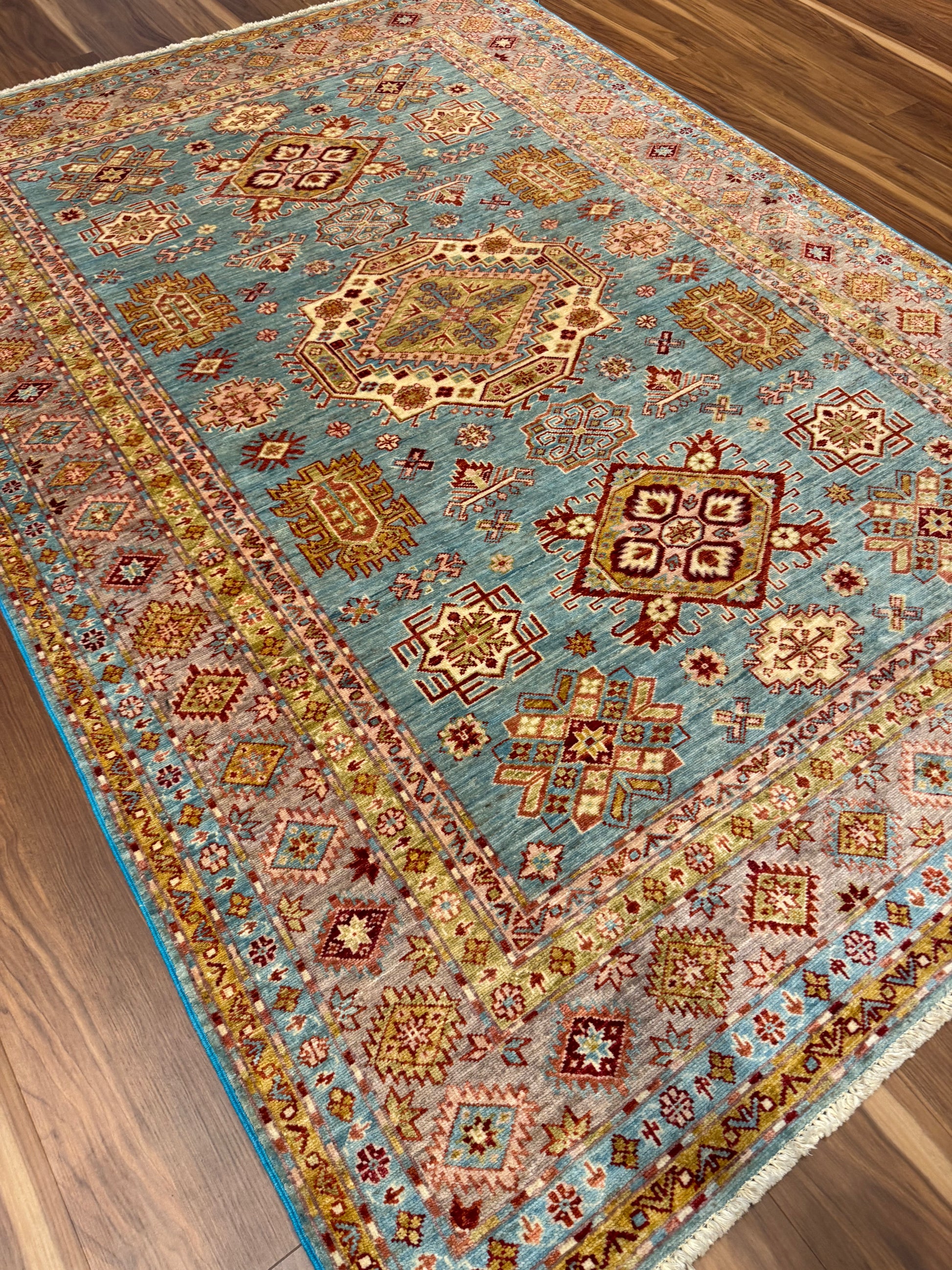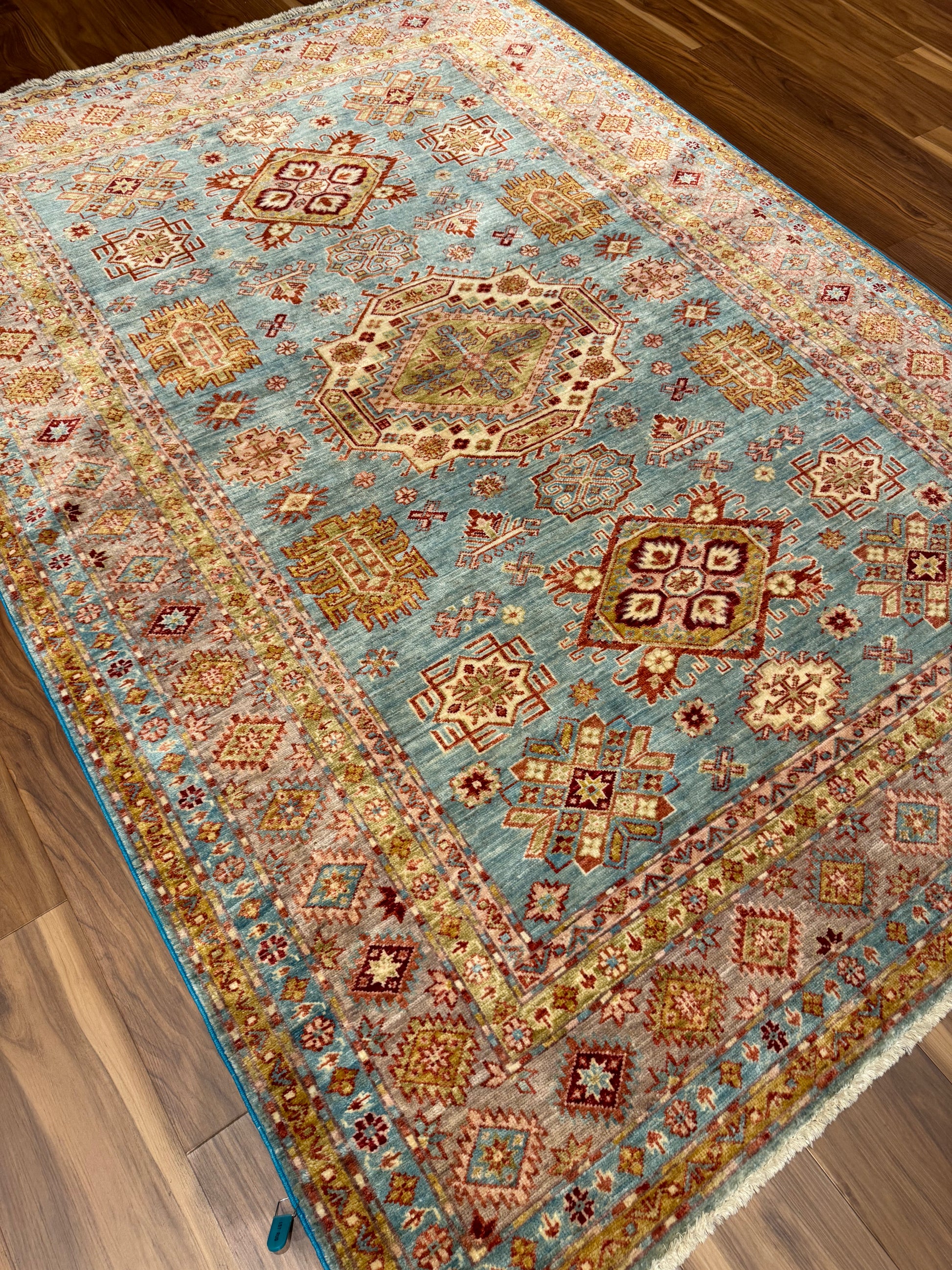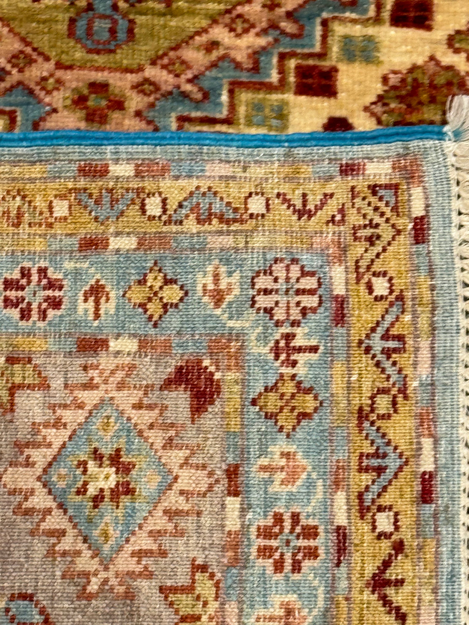 This exquisite Caucasian Kazak rug boasts a traditional style, with a blue field and orange and beige accents creating a striking contrast. Skilled artisans have meticulously crafted this piece from high-quality wool, featuring bold geometric patterns that evoke the rich heritage and craftsmanship of the Caucasus region. The harmonious color palette and the intricate border design add to its timeless appeal, making it a statement piece for both contemporary and classic interiors.