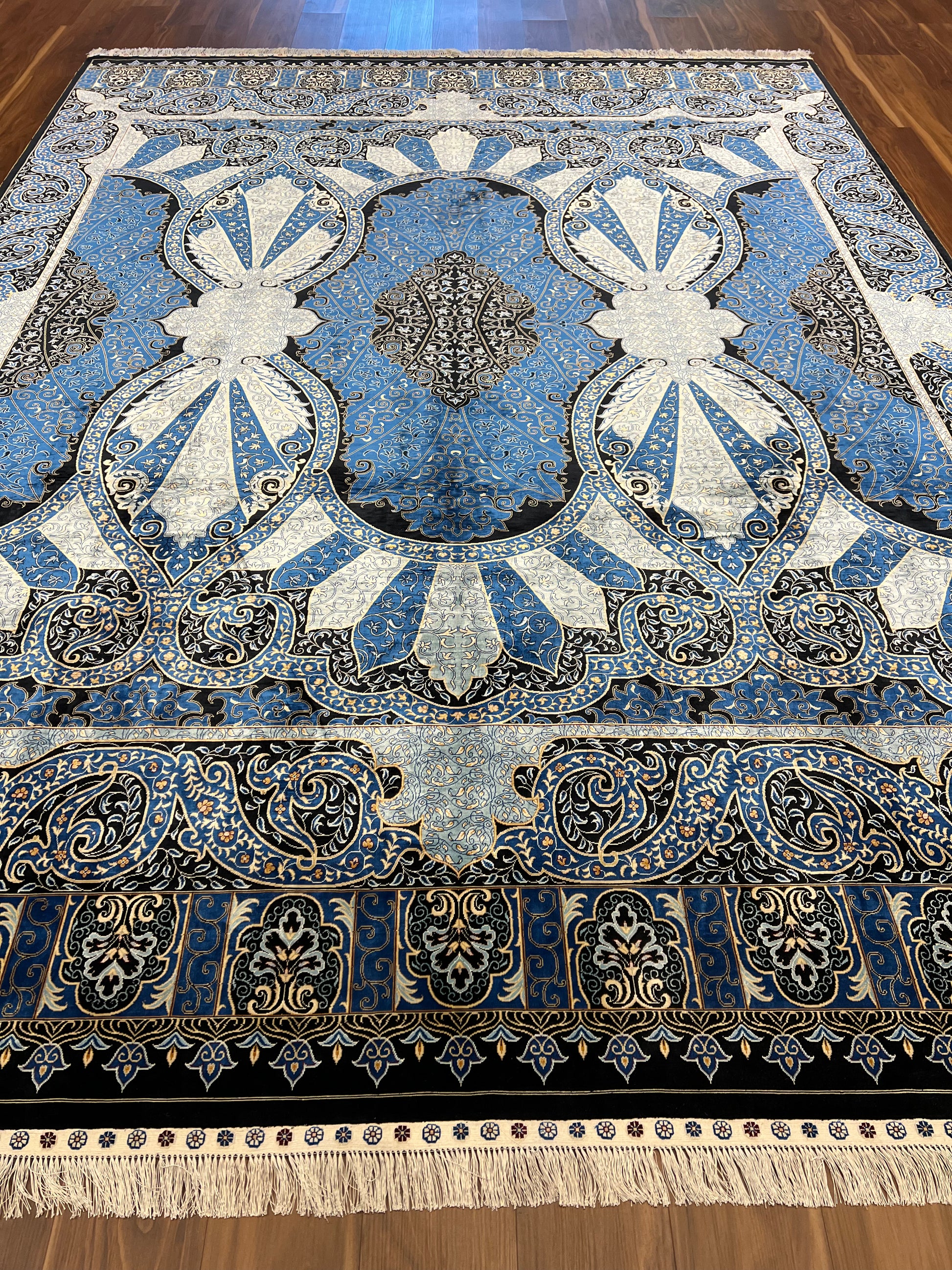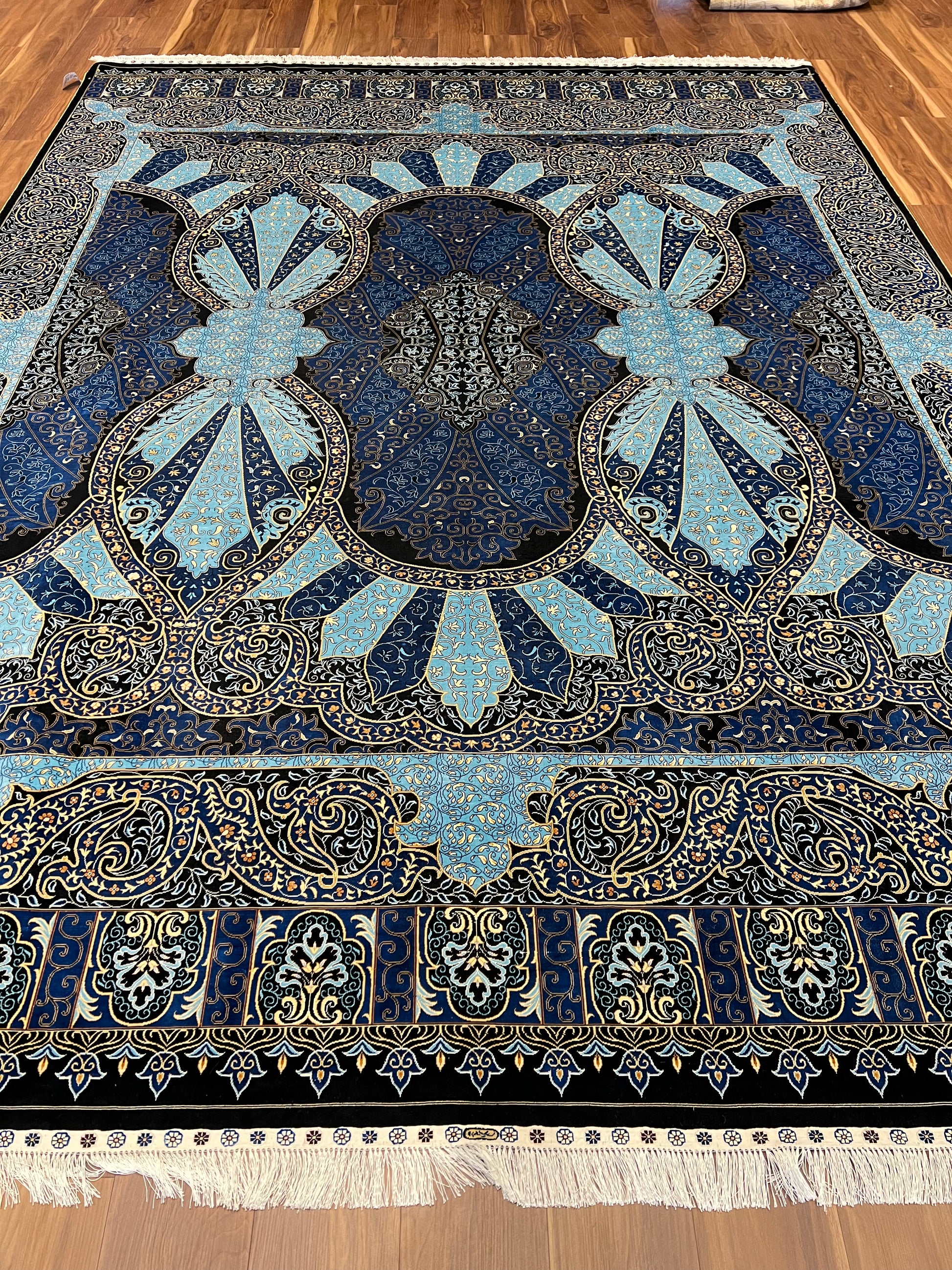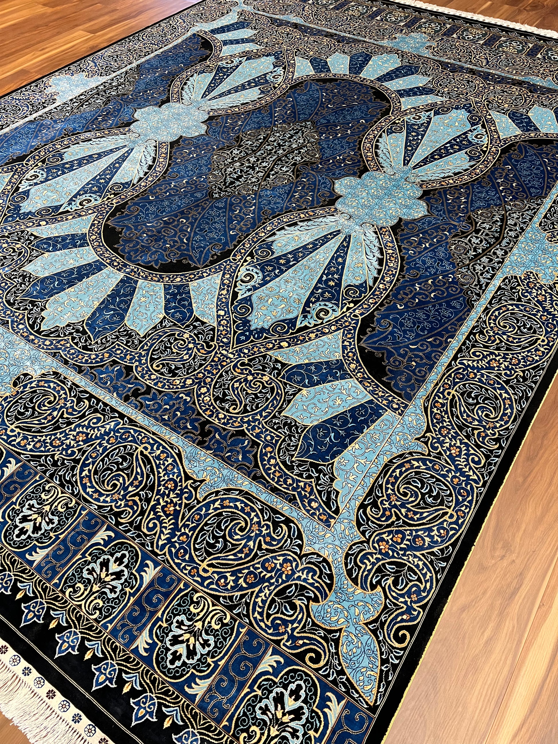 The Cinar King Crest Silk rug exudes regal elegance with its intricate patterns and royal color palette. This exquisite silk rug features a sophisticated design with dominant blue tones complemented by gold and black accents. The detailed motifs and ornamental crests draw inspiration from classic royal emblems, creating a sense of luxury and historical significance. Handcrafted with meticulous attention to detail, this rug is a testament to the artistry and craftsmanship of traditional rug making. It is a superb choice for those who wish to add a touch of opulence to their home decor.