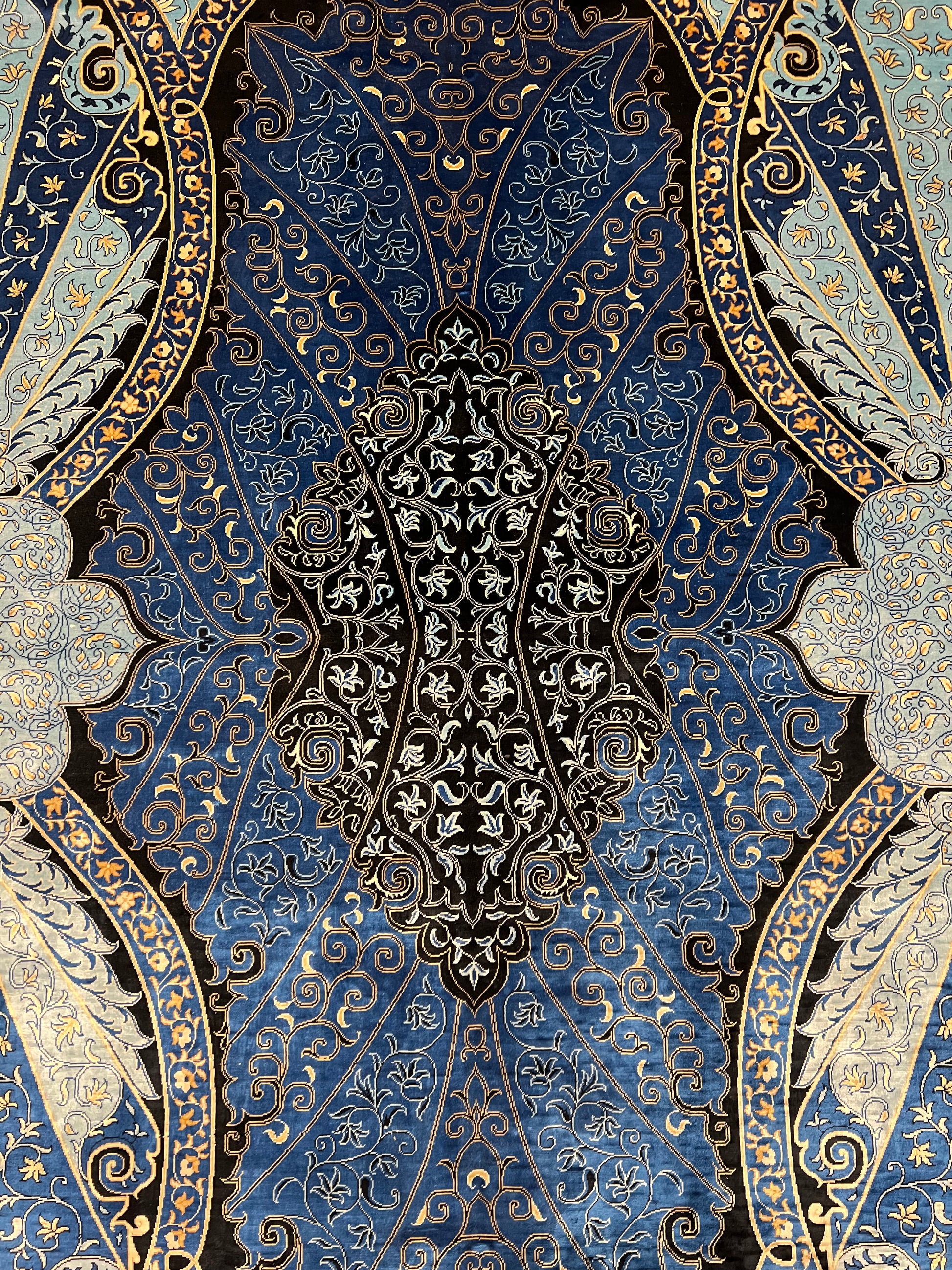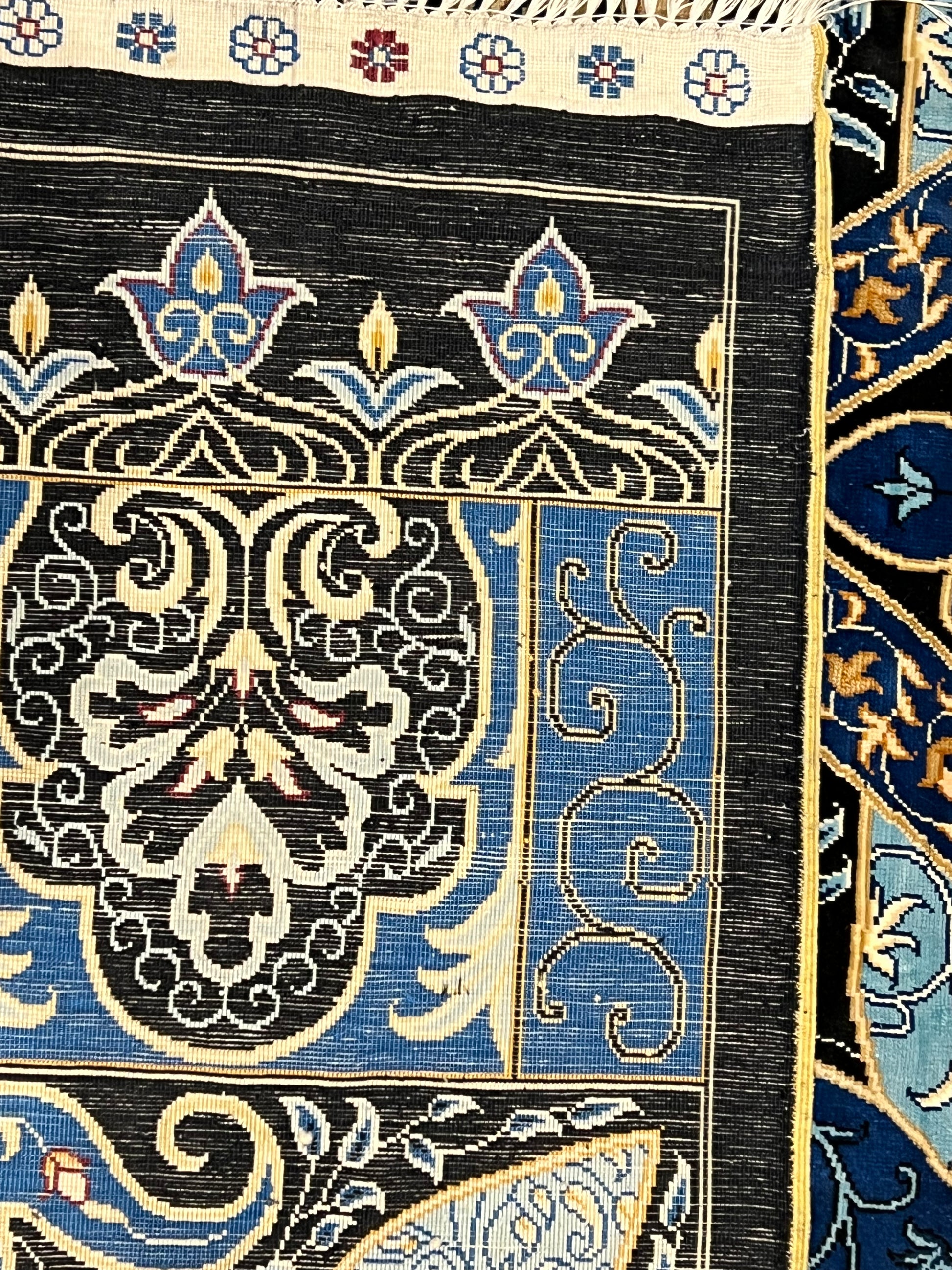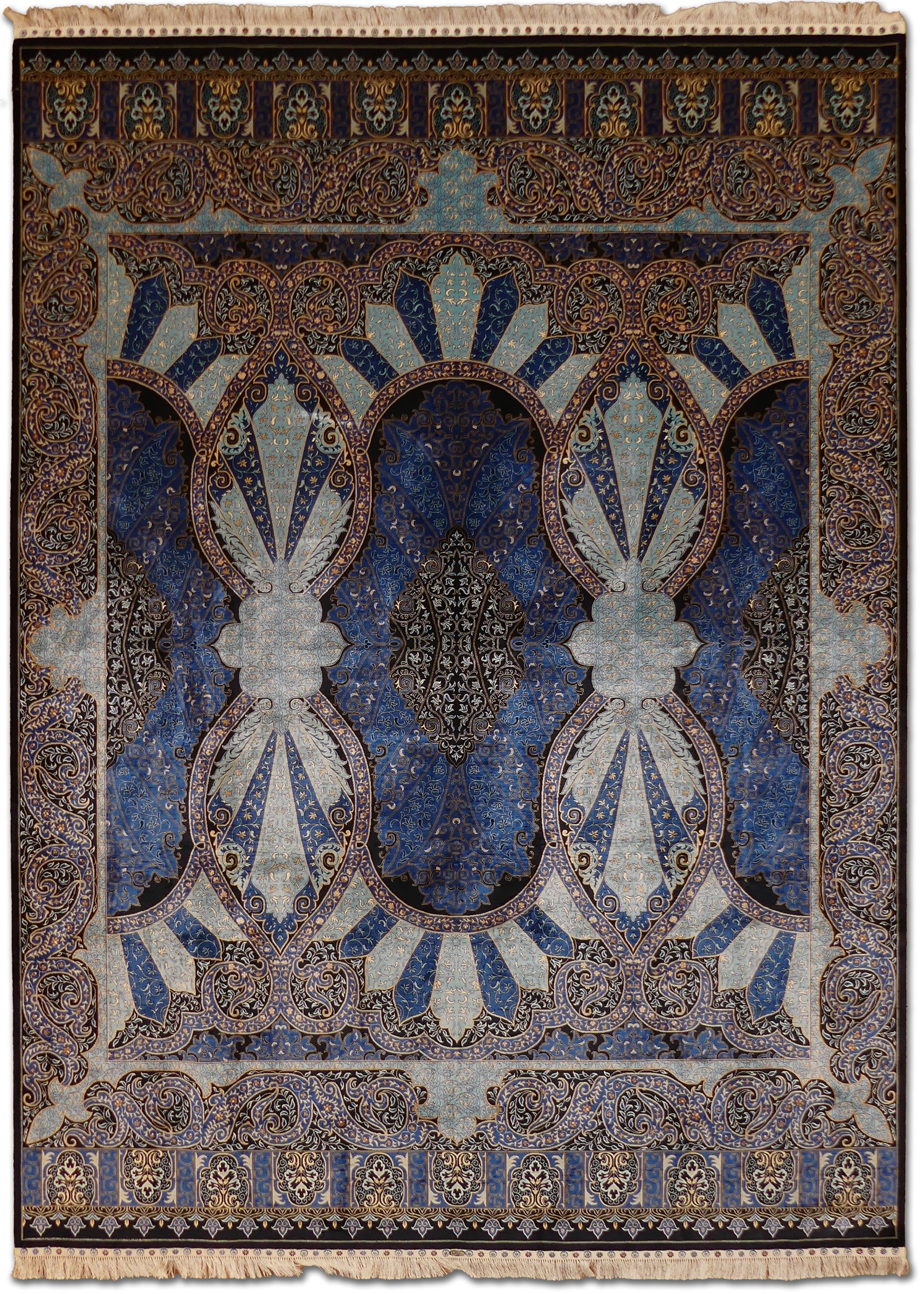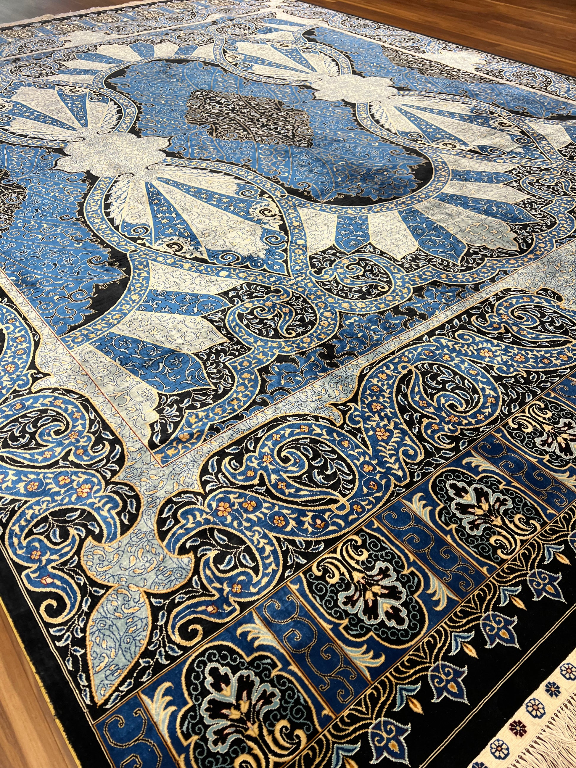 The Cinar King Crest Silk rug exudes regal elegance with its intricate patterns and royal color palette. This exquisite silk rug features a sophisticated design with dominant blue tones complemented by gold and black accents. The detailed motifs and ornamental crests draw inspiration from classic royal emblems, creating a sense of luxury and historical significance. Handcrafted with meticulous attention to detail, this rug is a testament to the artistry and craftsmanship of traditional rug making. It is a superb choice for those who wish to add a touch of opulence to their home decor.
