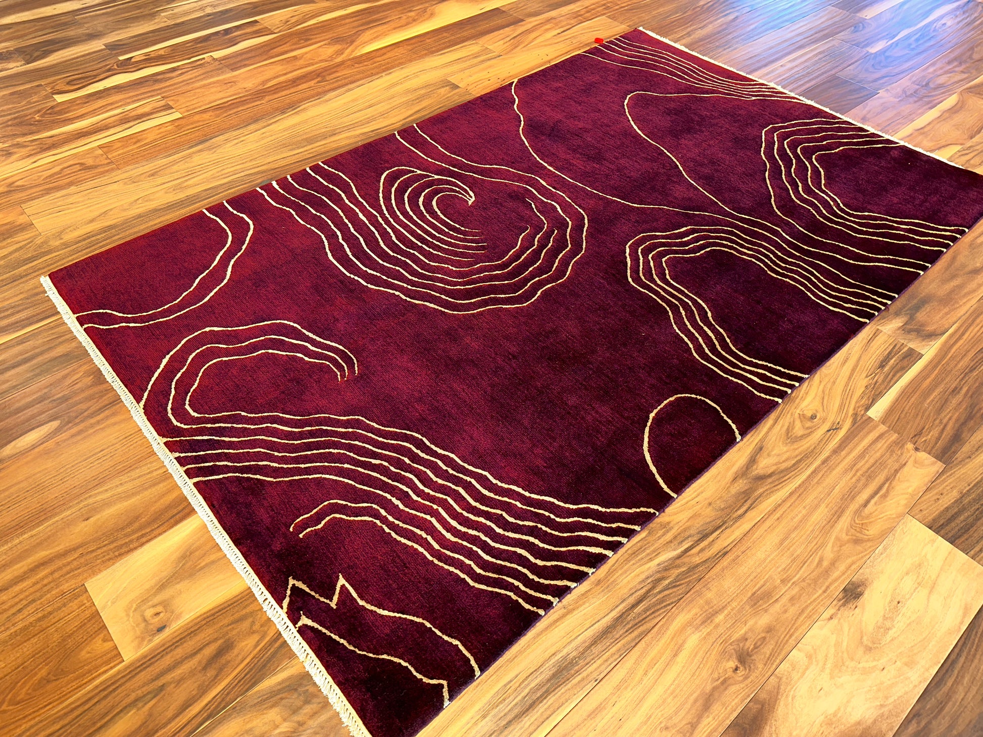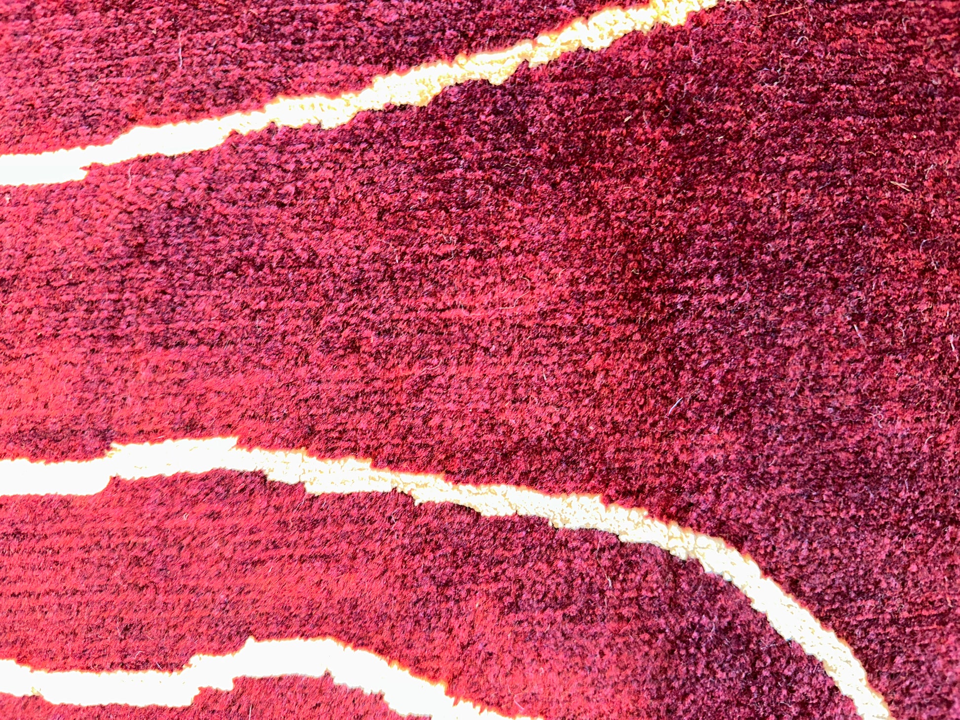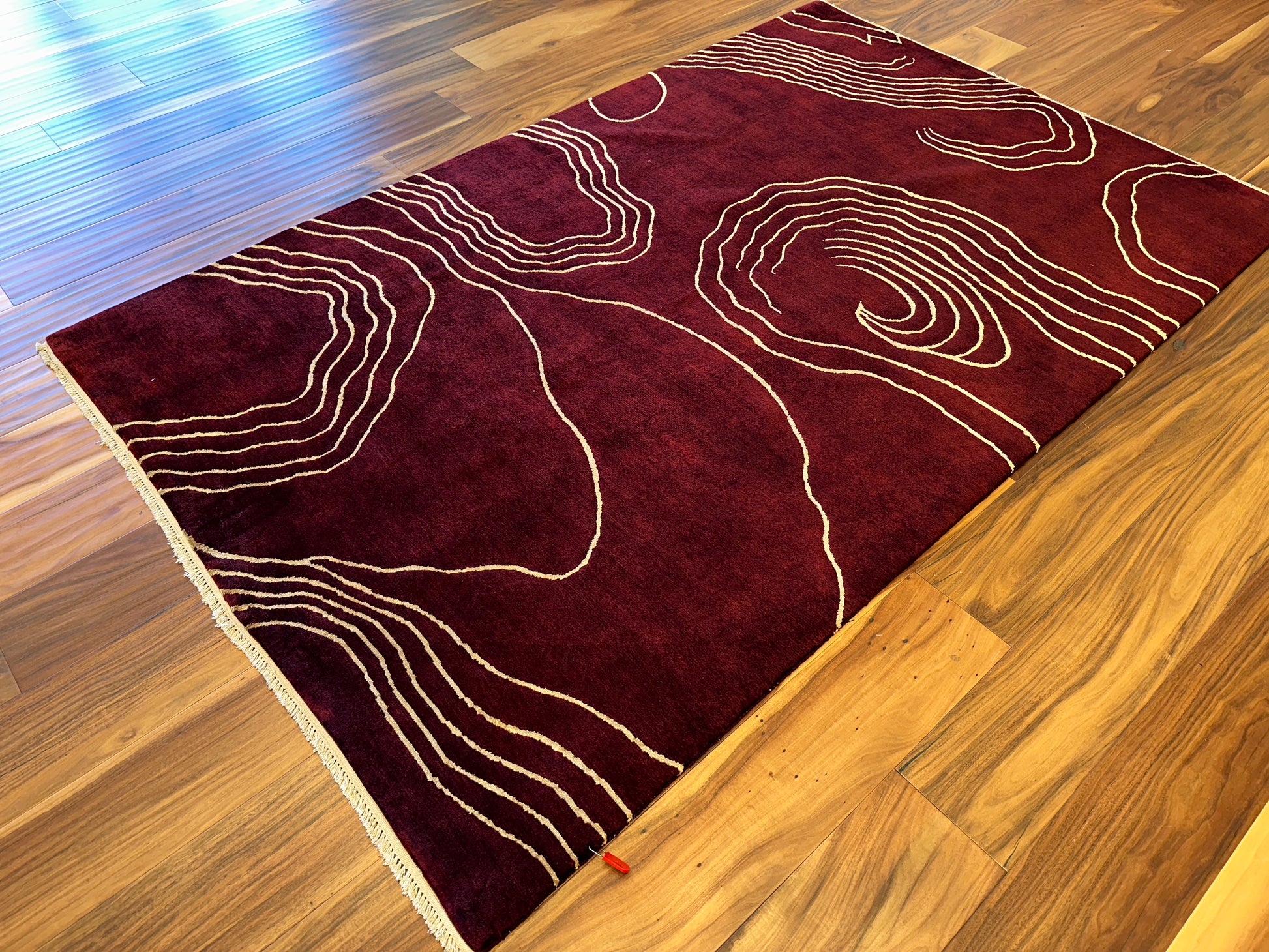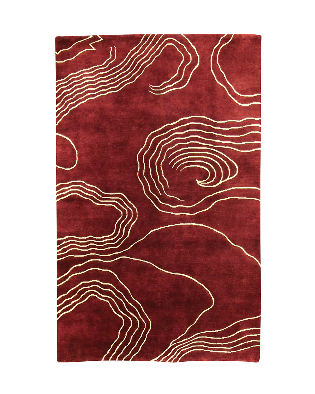 A rich, modern statement piece, this handmade rug features a fluid, organic linework design that echoes the look of topographic maps or wood grain. Set against a deep red background, the undulating beige lines create a sense of depth and motion, bringing a dynamic visual energy to contemporary spaces while maintaining a warm and grounded tone.