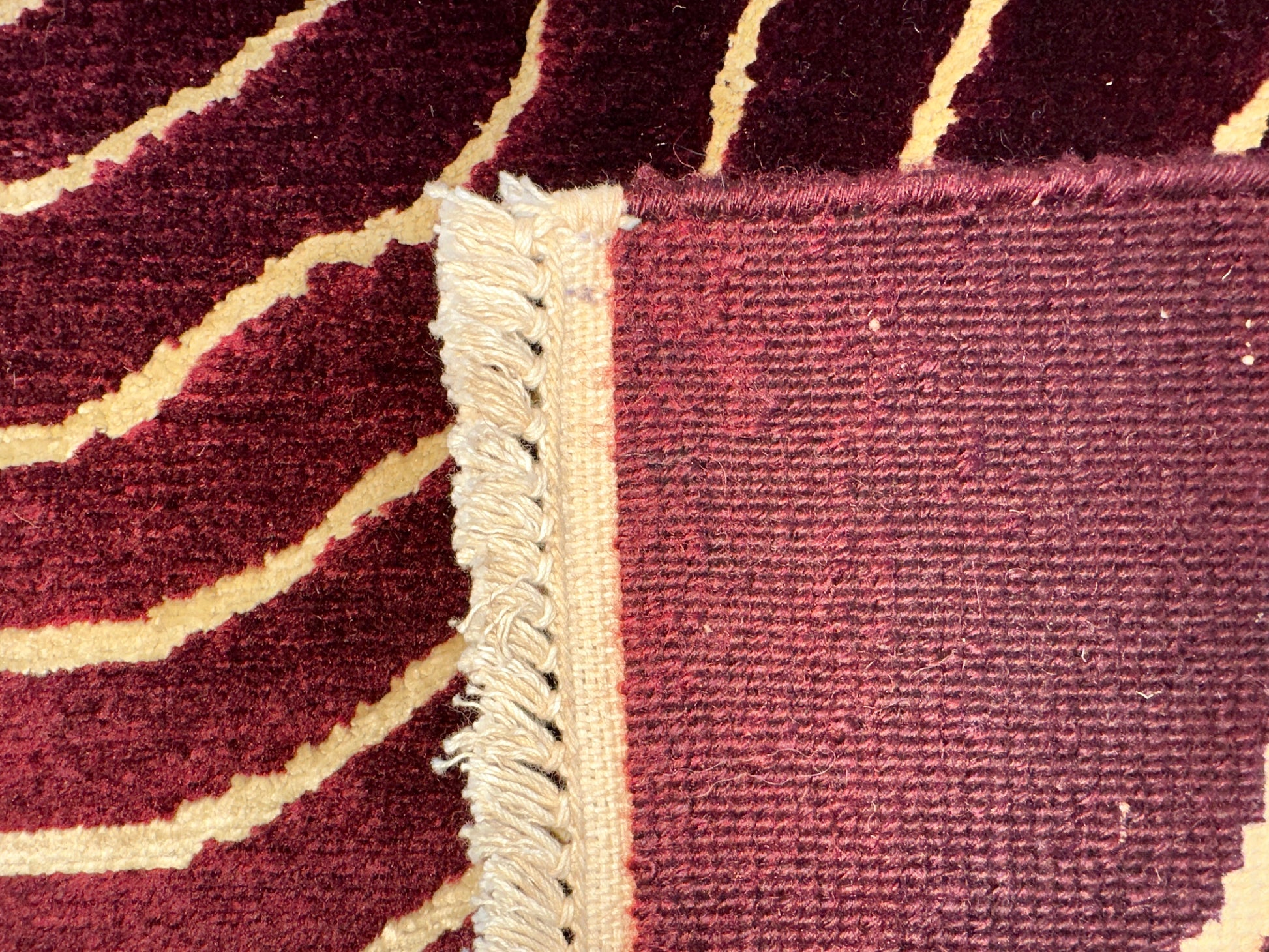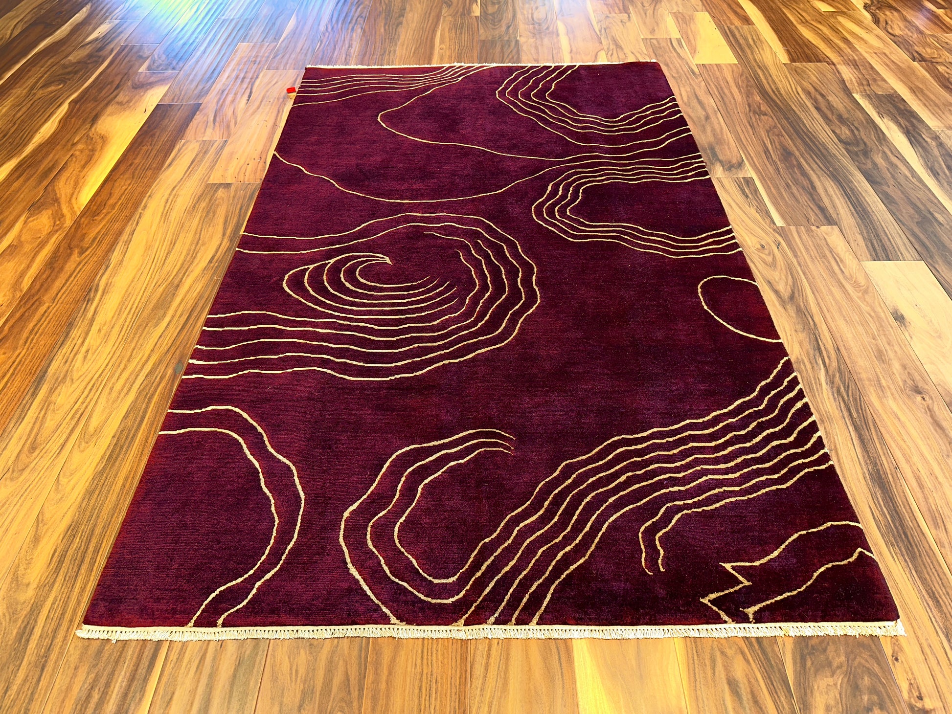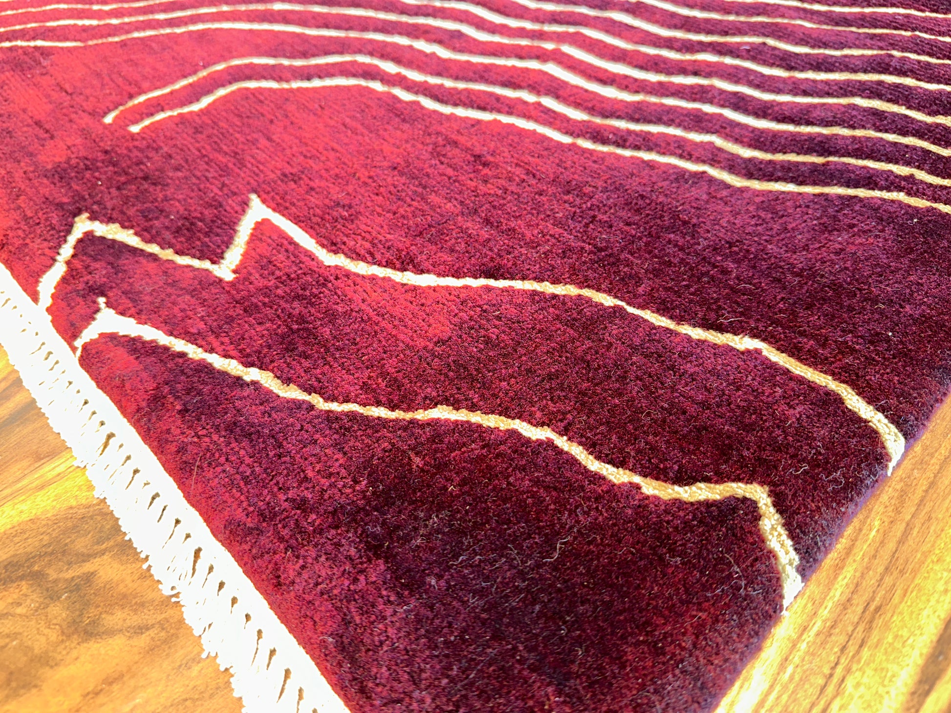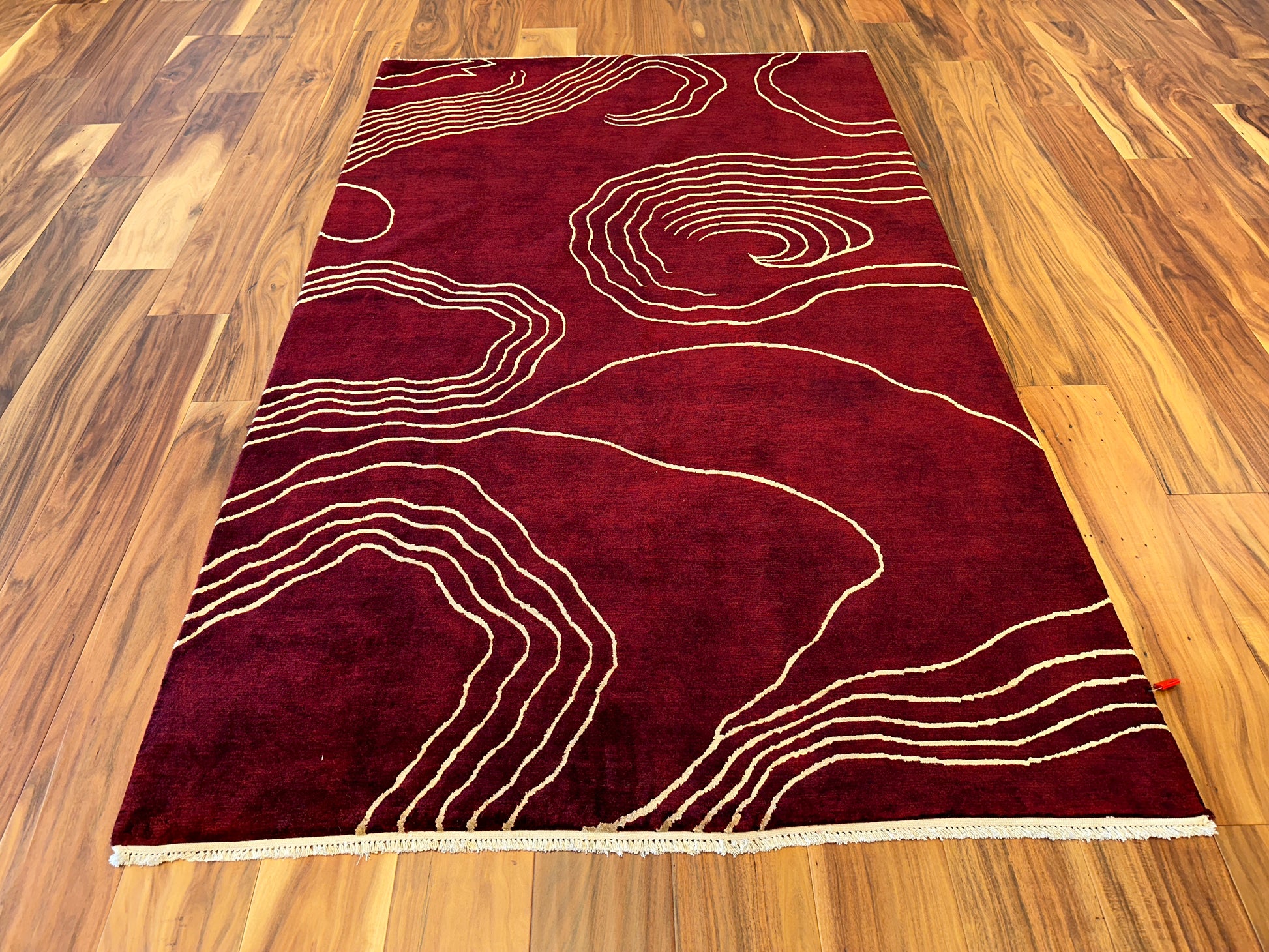 A rich, modern statement piece, this handmade rug features a fluid, organic linework design that echoes the look of topographic maps or wood grain. Set against a deep red background, the undulating beige lines create a sense of depth and motion, bringing a dynamic visual energy to contemporary spaces while maintaining a warm and grounded tone.