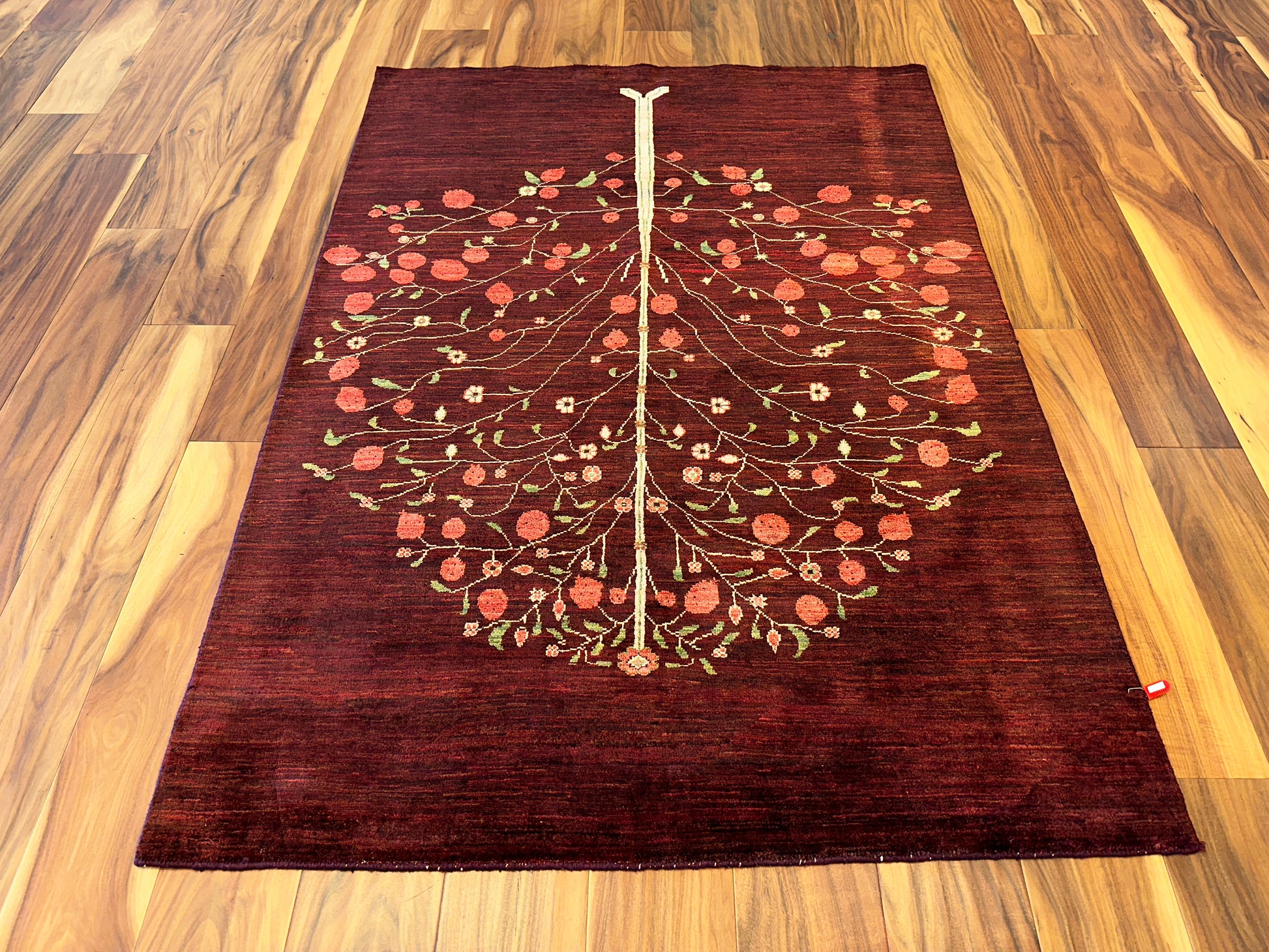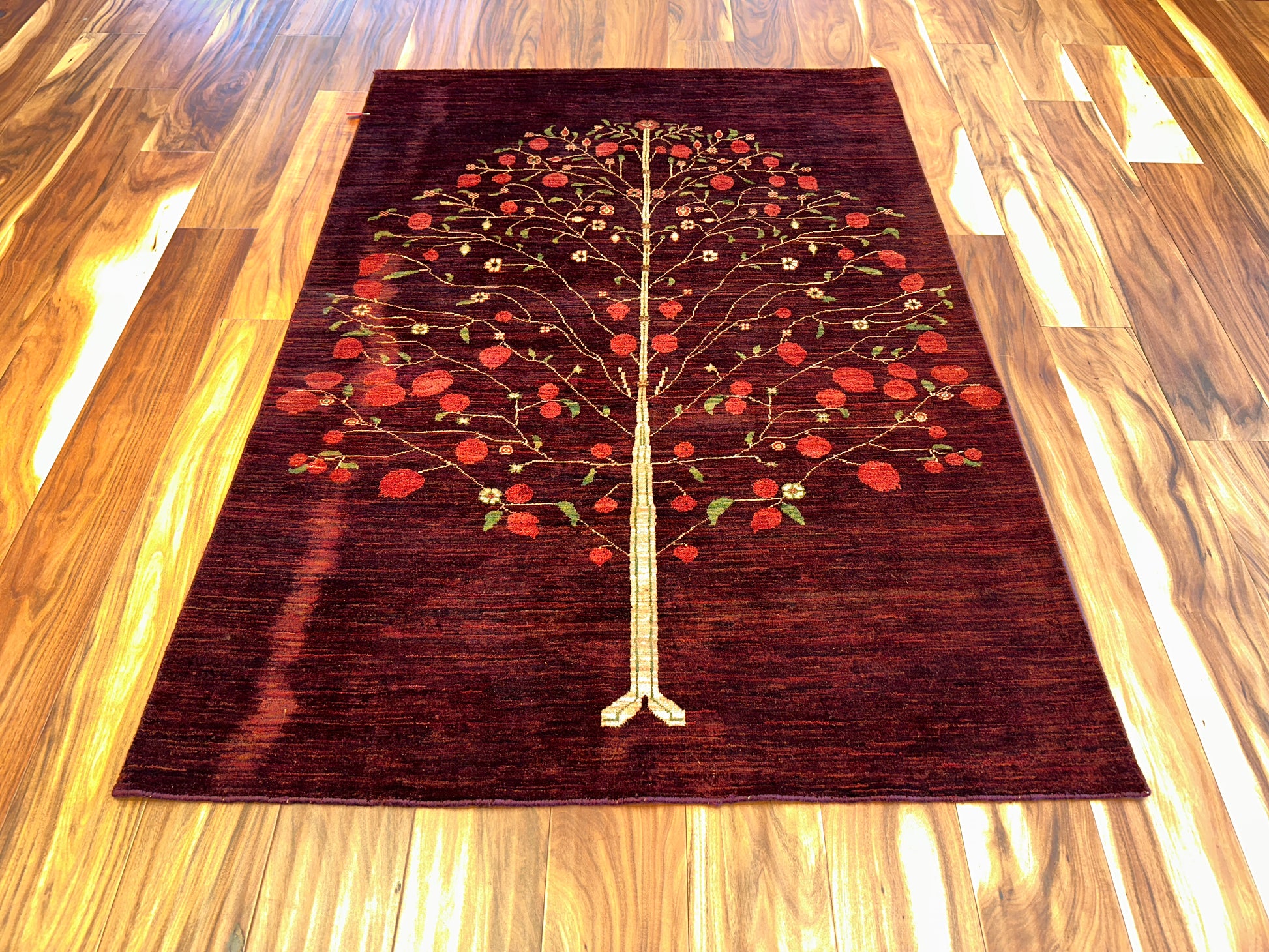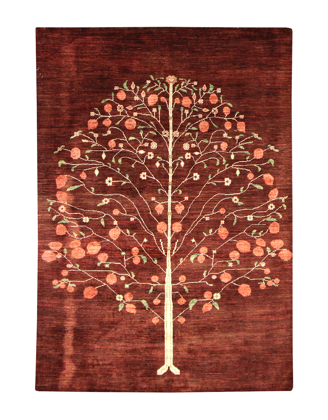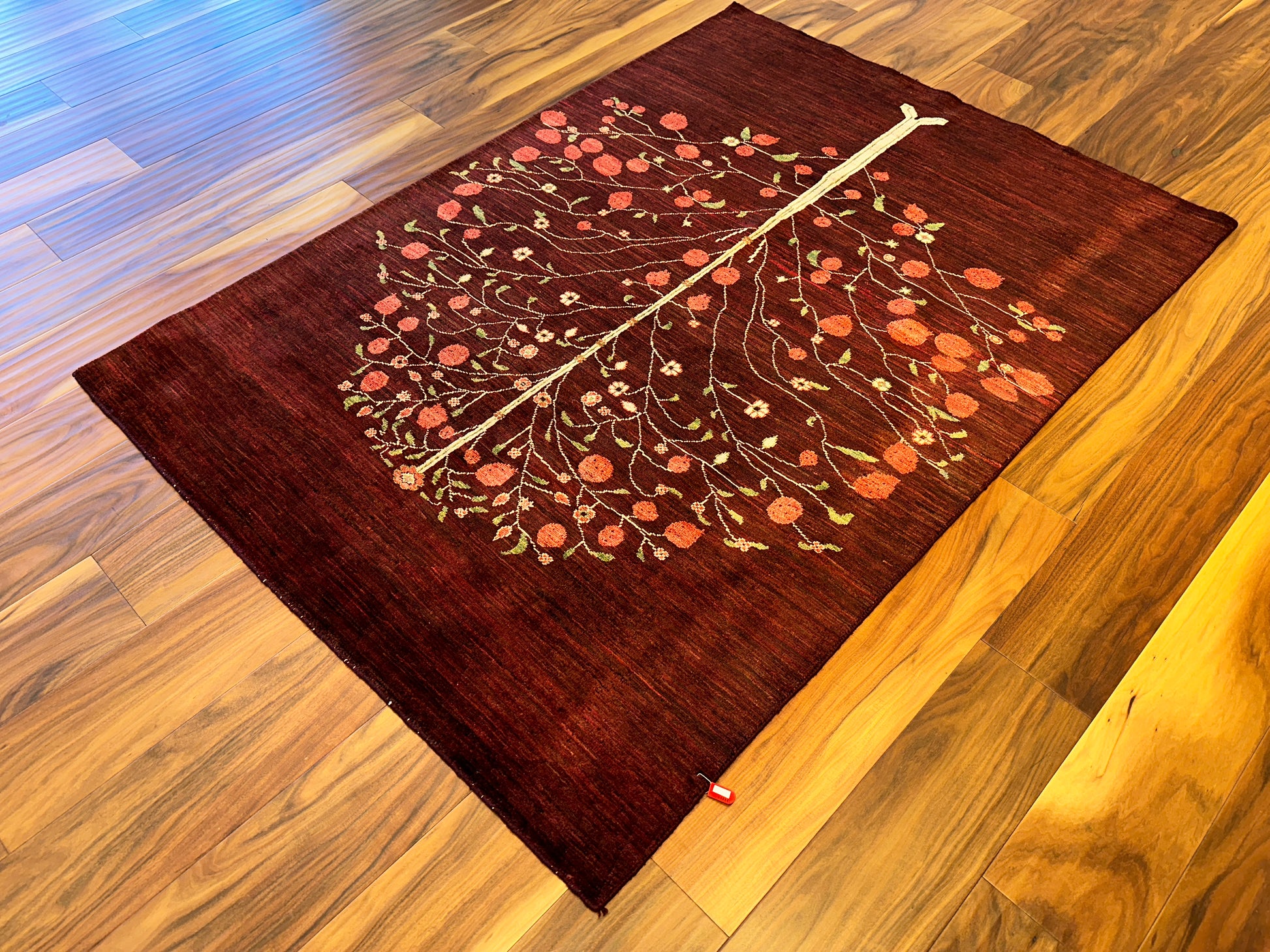 A graceful tree of life motif flourishes at the center of this handmade rug, its delicate branches and blossoms rendered in soft tones of peach, green, and cream against a deep auburn field. The design radiates quiet symbolism and natural harmony, creating a focal point that is both peaceful and richly organic.