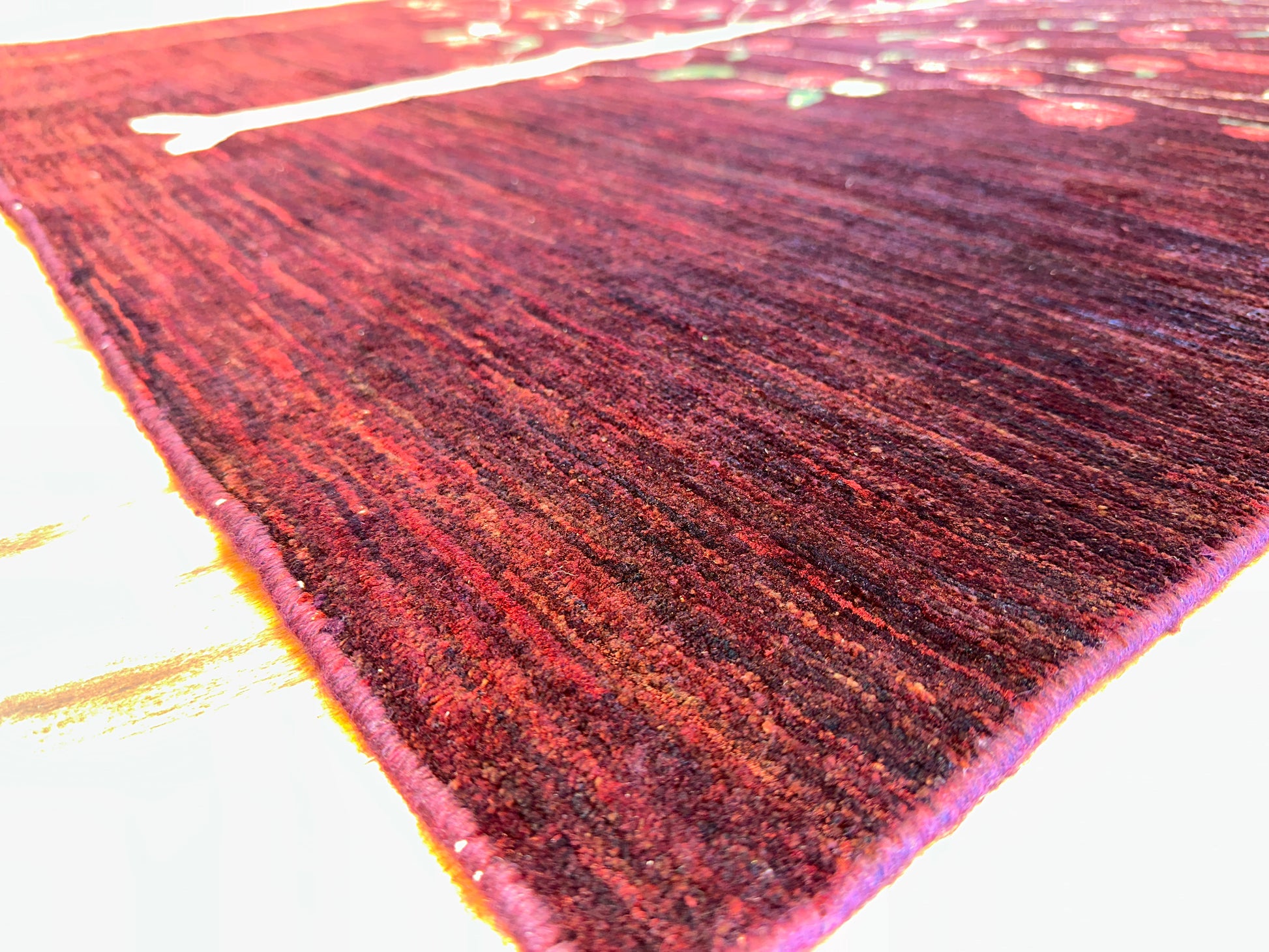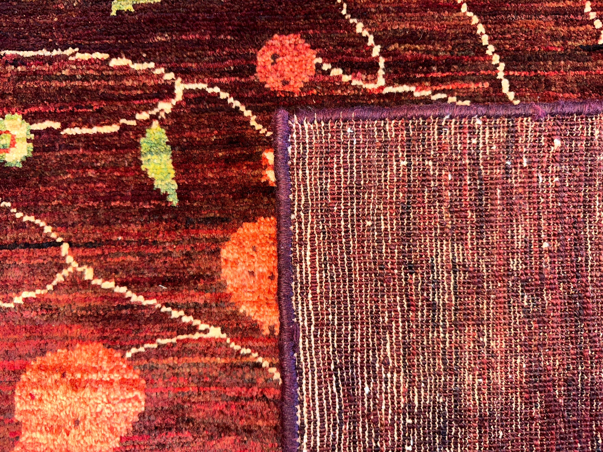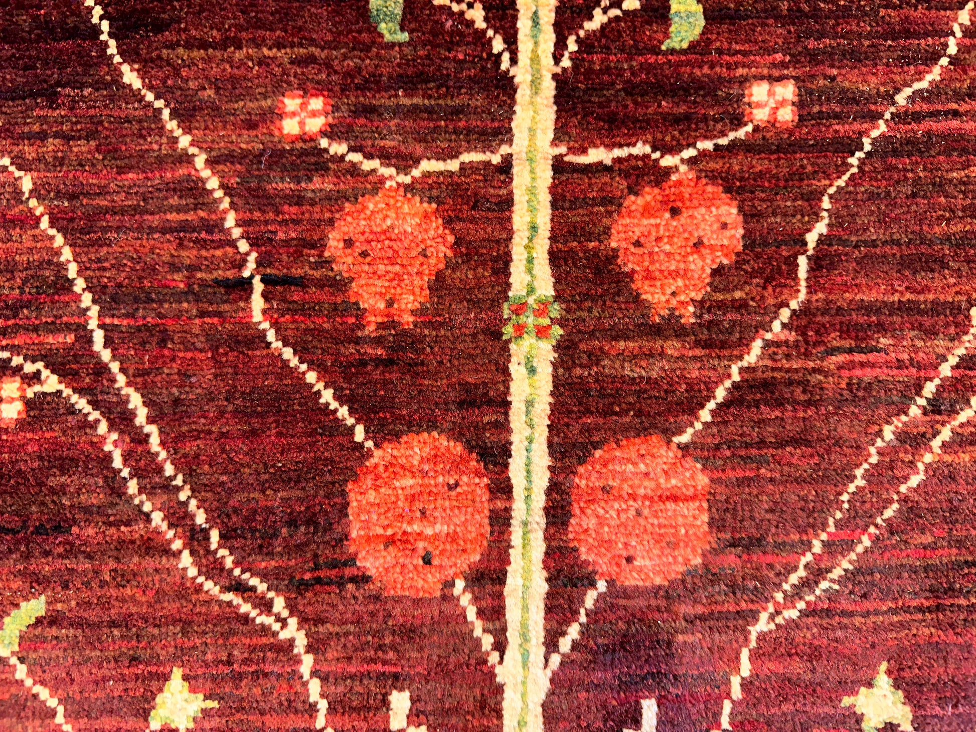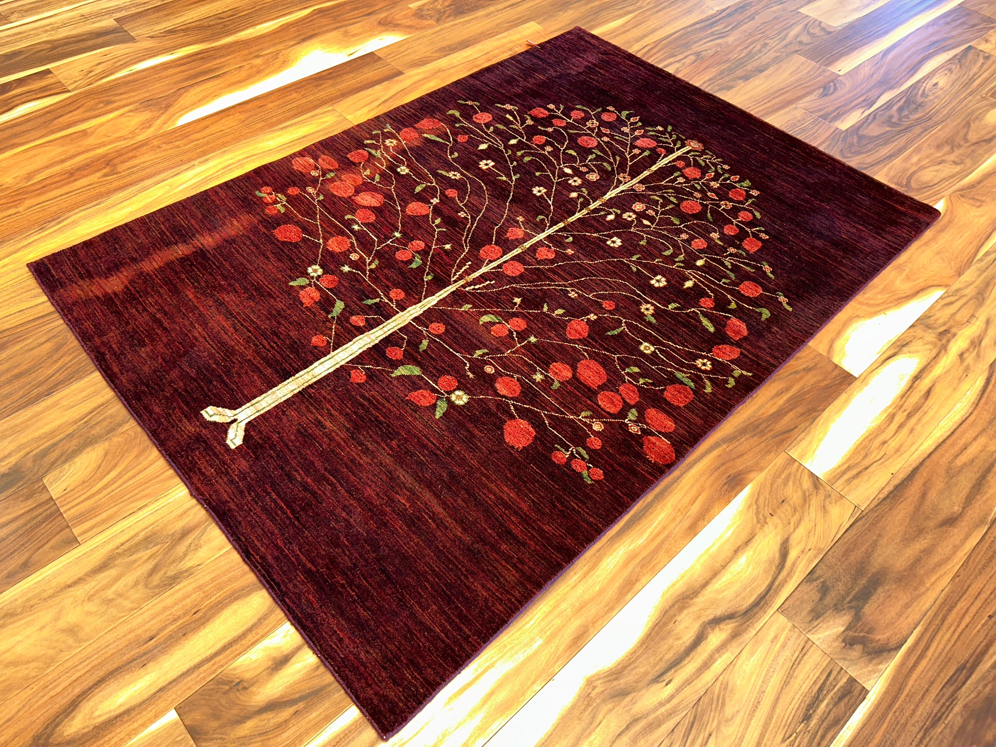 A graceful tree of life motif flourishes at the center of this handmade rug, its delicate branches and blossoms rendered in soft tones of peach, green, and cream against a deep auburn field. The design radiates quiet symbolism and natural harmony, creating a focal point that is both peaceful and richly organic.
