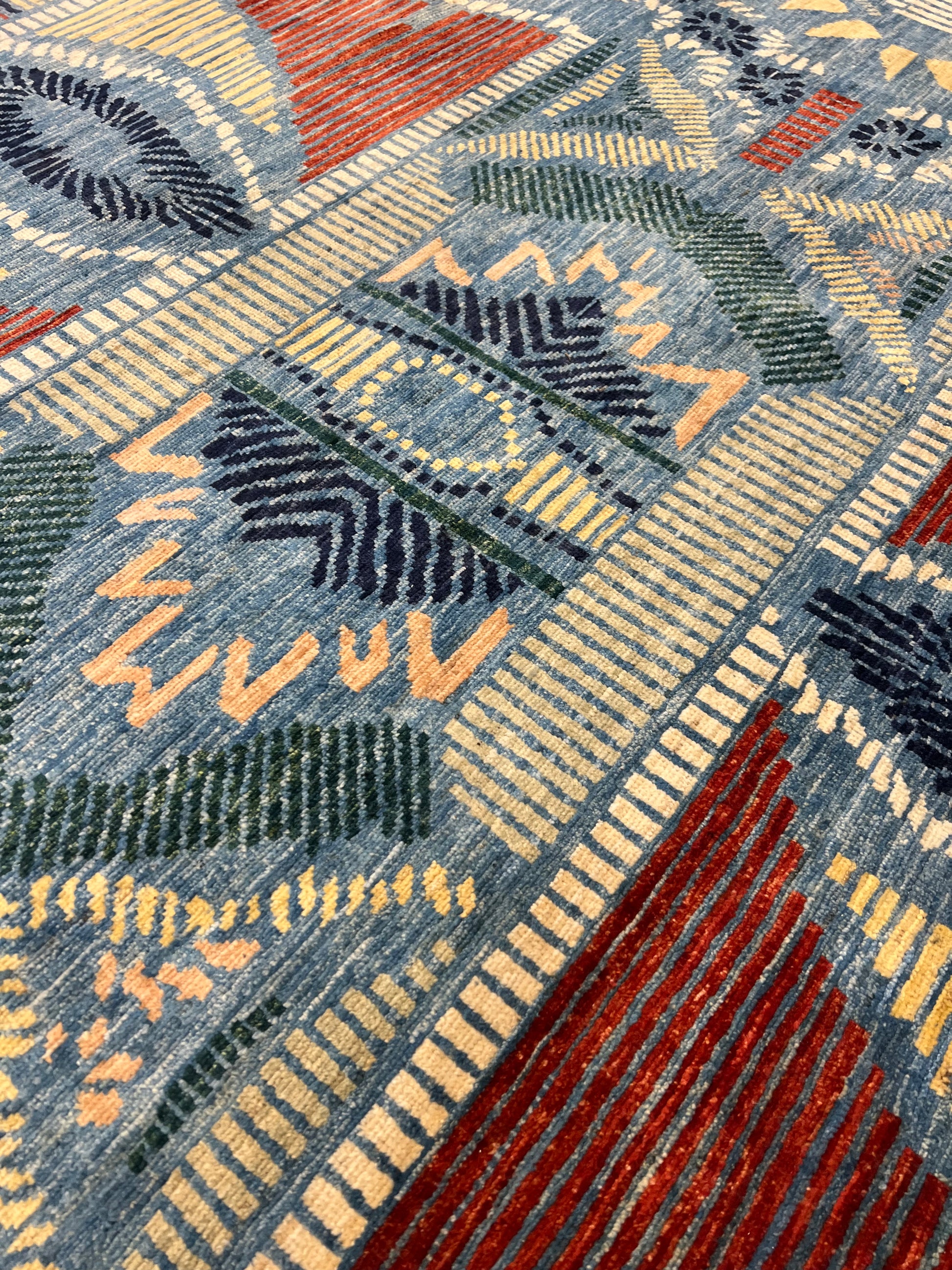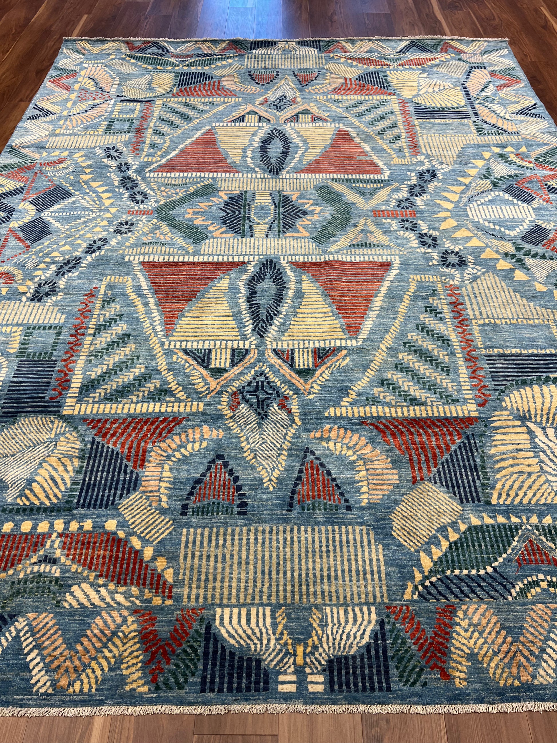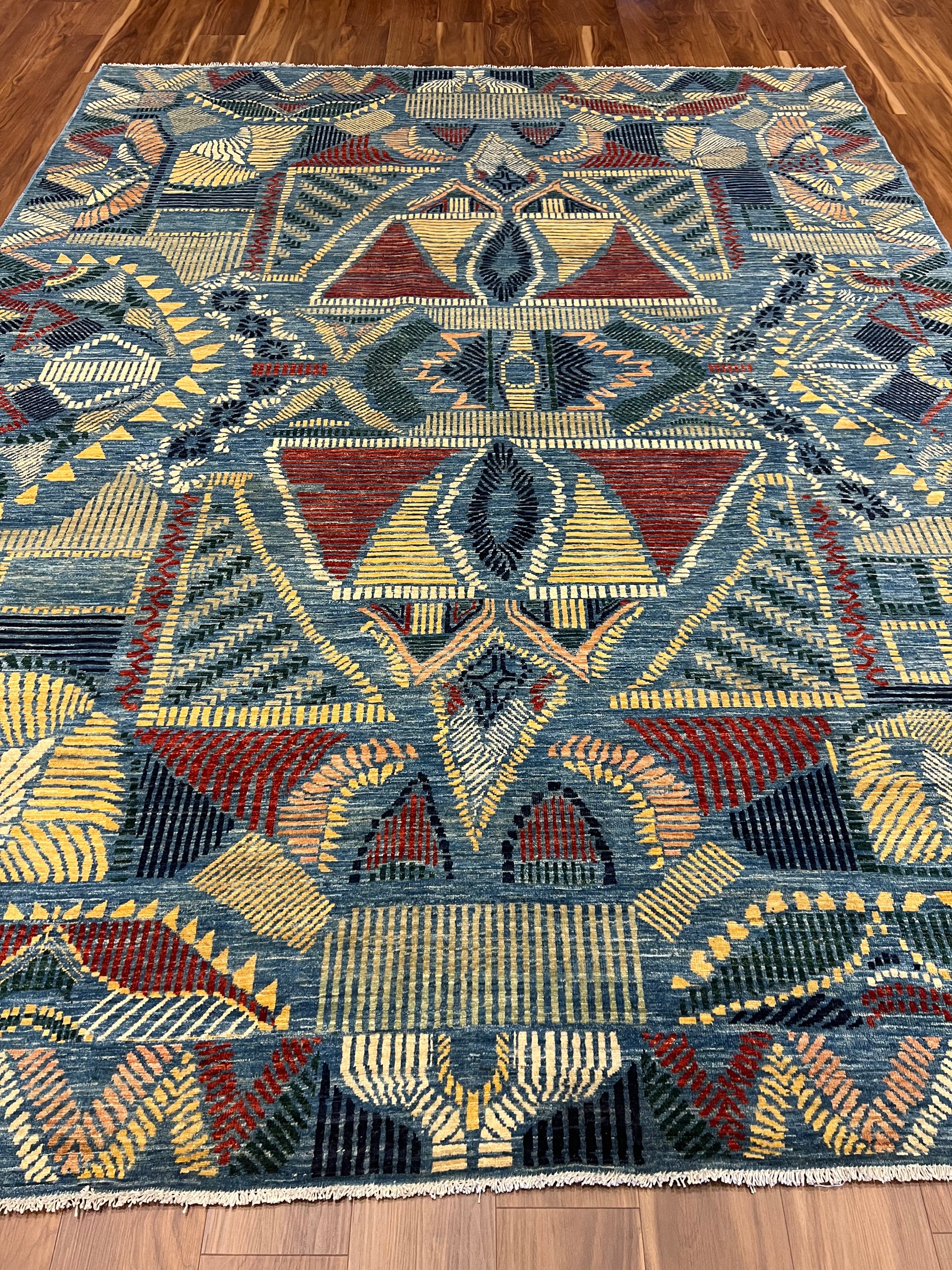The 'Eagle Navajo' is a stunning example of traditional Navajo weaving, infused with a rich array of colors, showcasing nature and tribal motifs. Expertly handcrafted from the finest wool, it features bold geometric patterns, accented by symbols that may tell a story or represent elements of the weavers' surroundings. This rug is an ornate tapestry of culture, perfect for adding a warm, grounded feel to any room. Its intricate details and symmetrical composition are characteristic of Navajo designs, offering both aesthetic pleasure and historical significance.