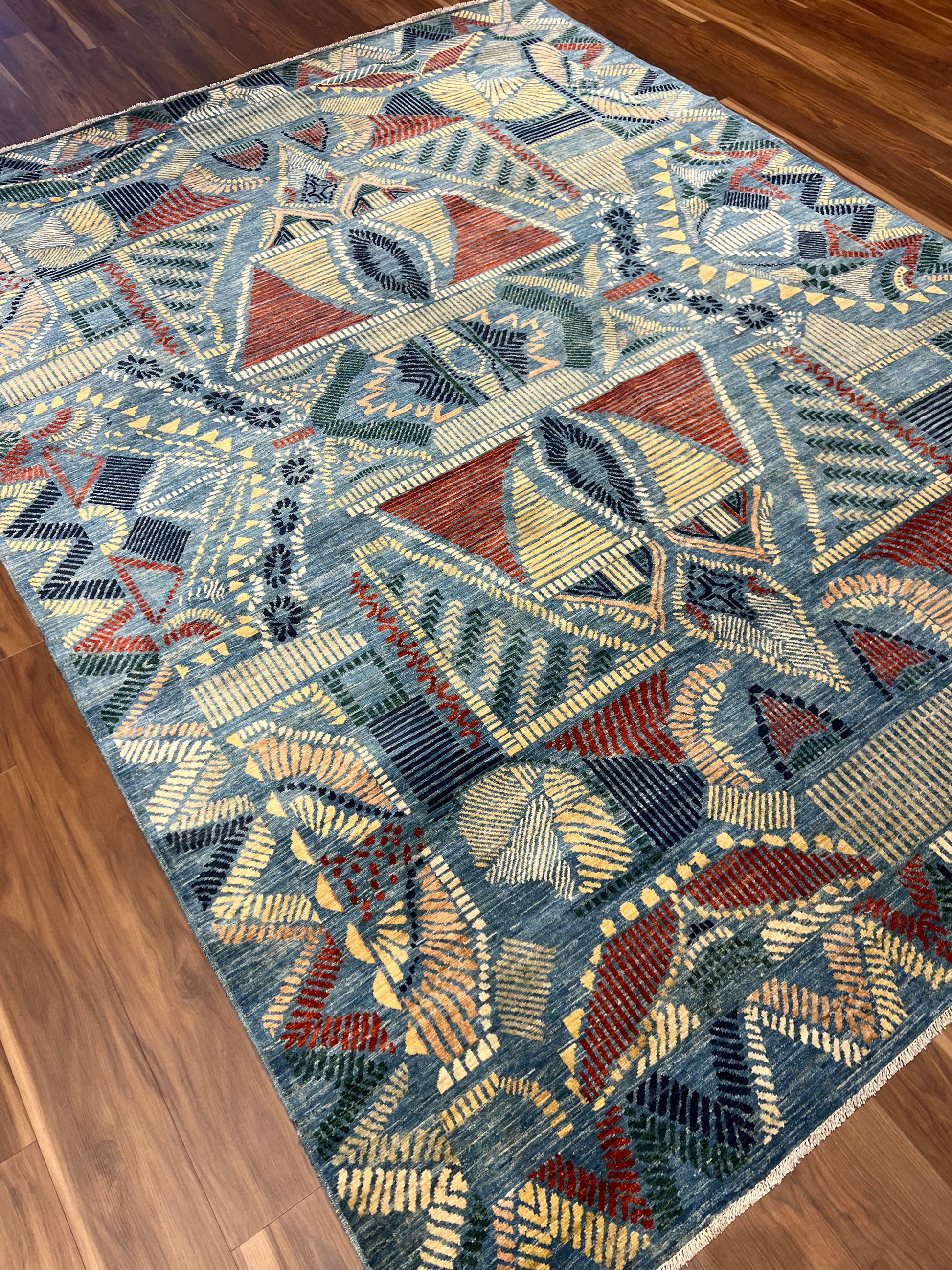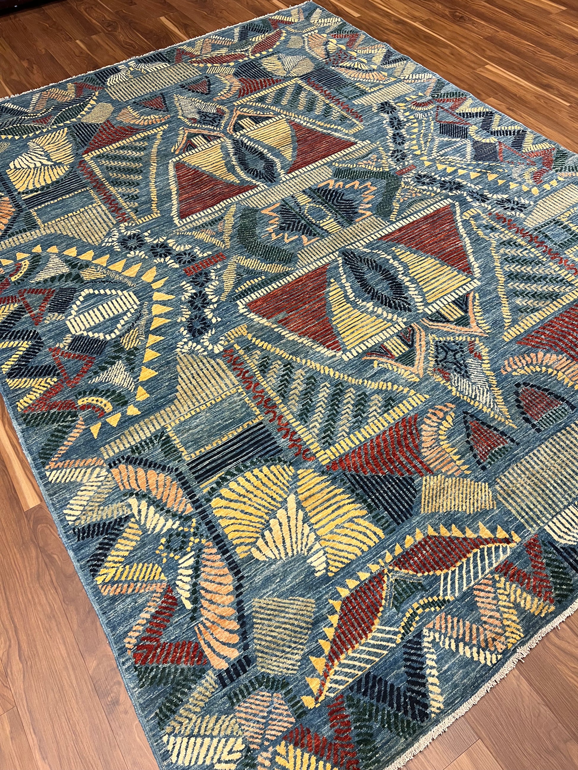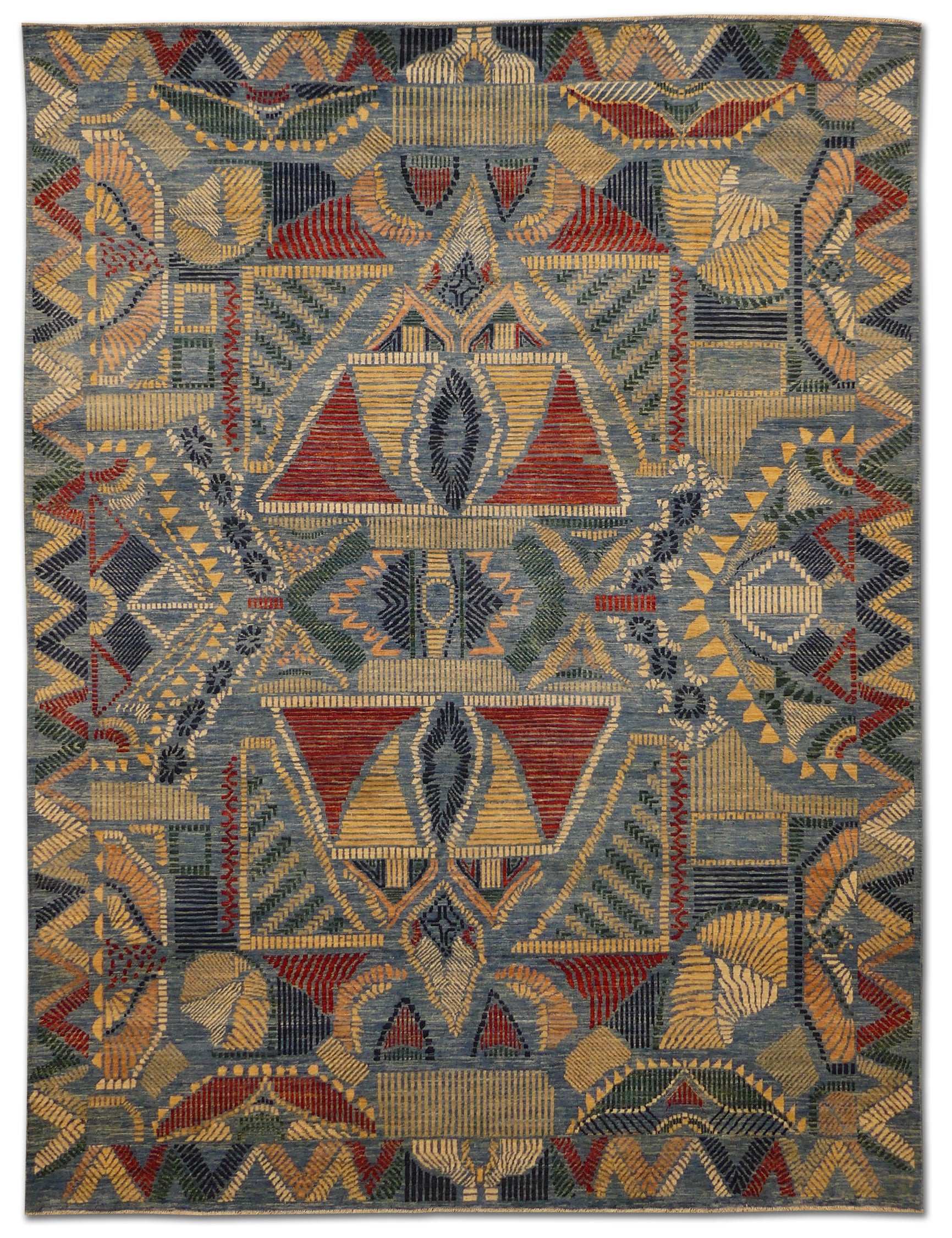 The 'Eagle Navajo' is a stunning example of traditional Navajo weaving, infused with a rich array of colors, showcasing nature and tribal motifs. Expertly handcrafted from the finest wool, it features bold geometric patterns, accented by symbols that may tell a story or represent elements of the weavers' surroundings. This rug is an ornate tapestry of culture, perfect for adding a warm, grounded feel to any room. Its intricate details and symmetrical composition are characteristic of Navajo designs, offering both aesthetic pleasure and historical significance.