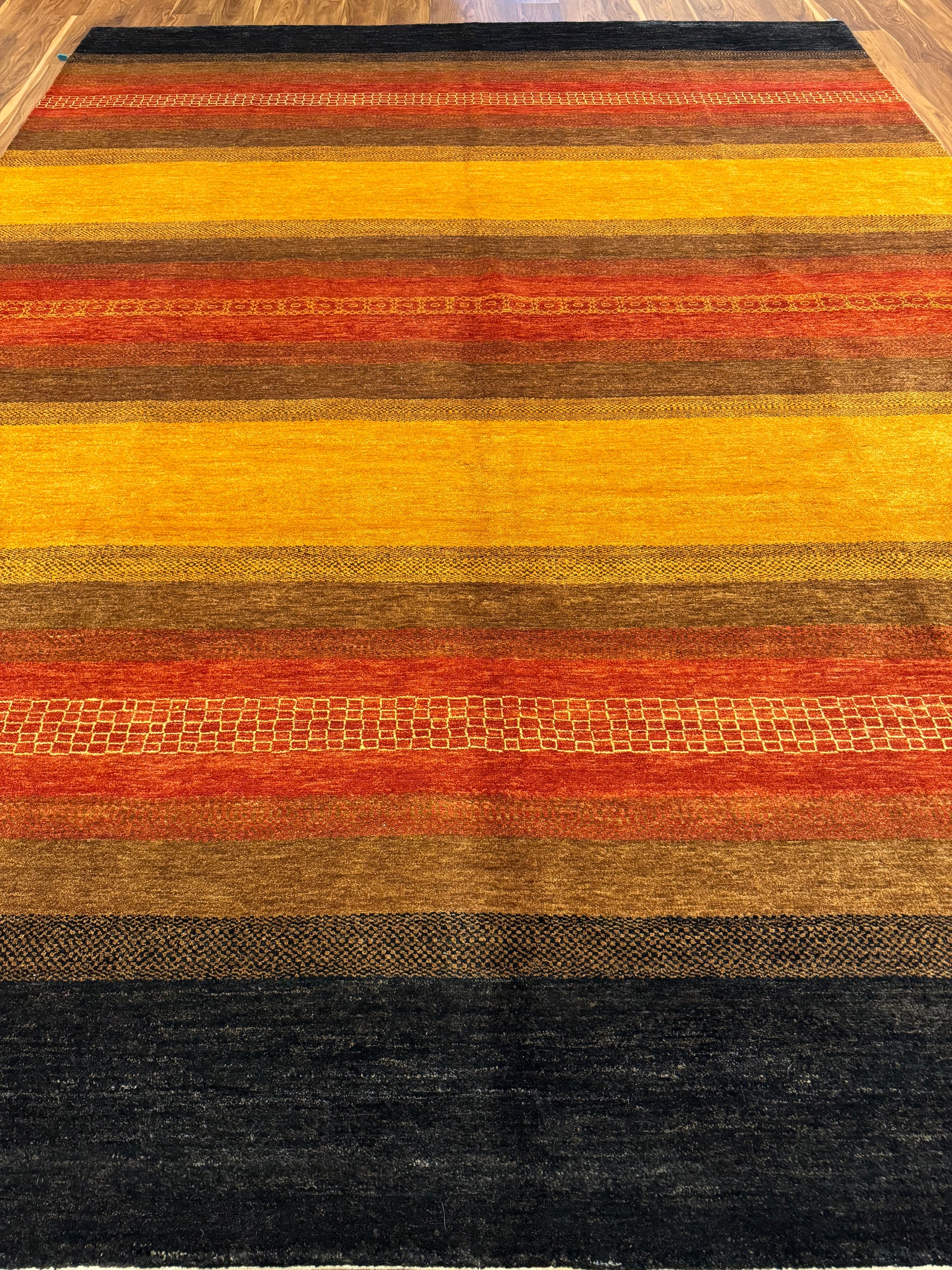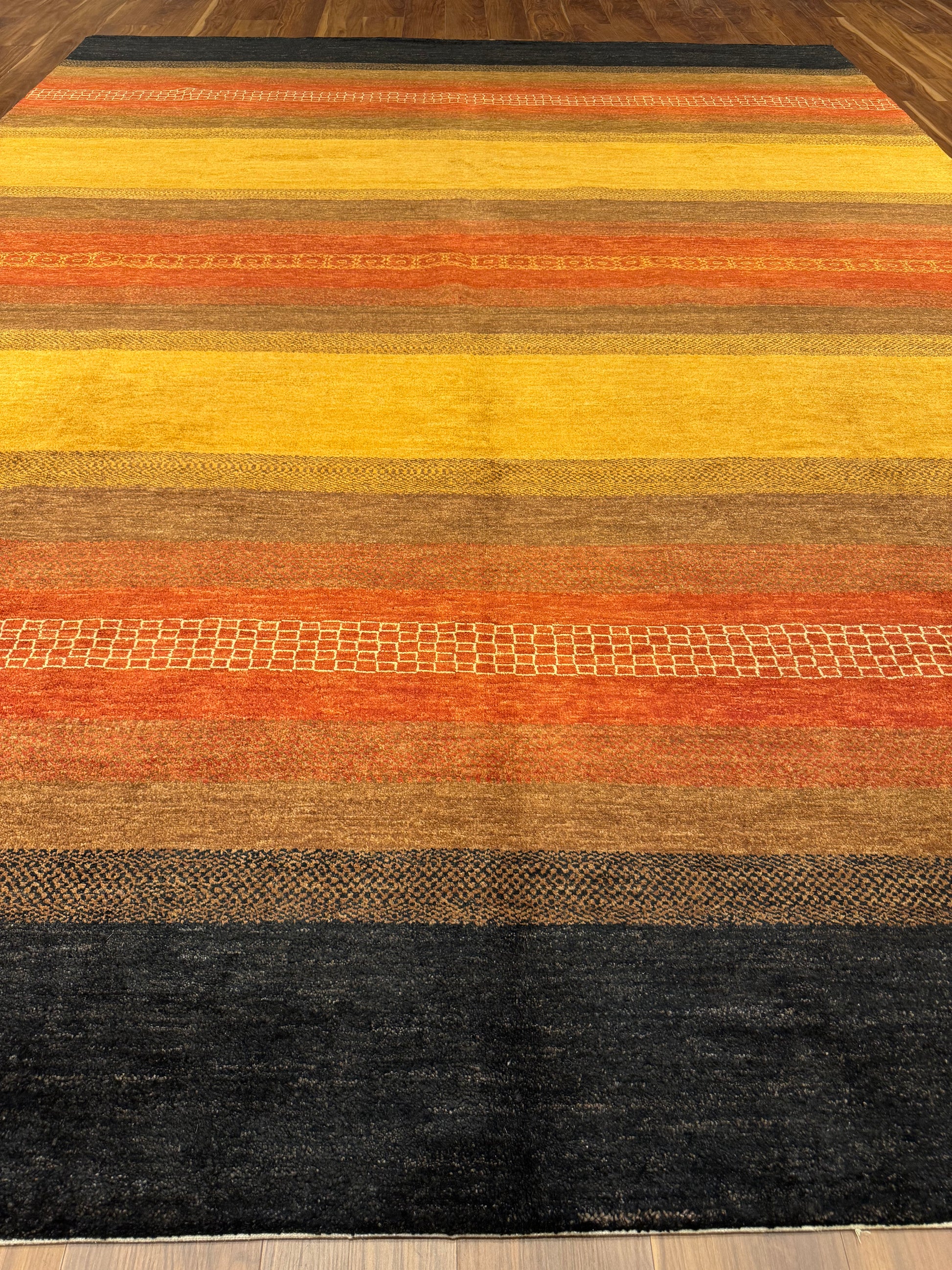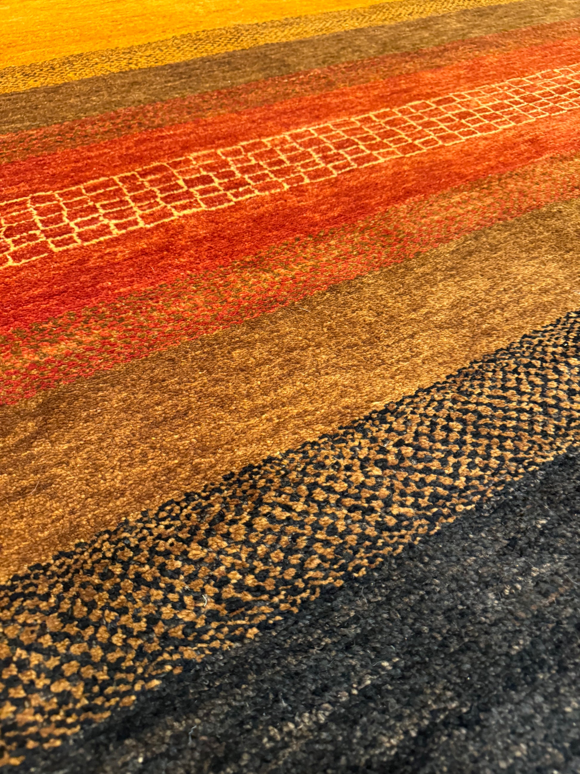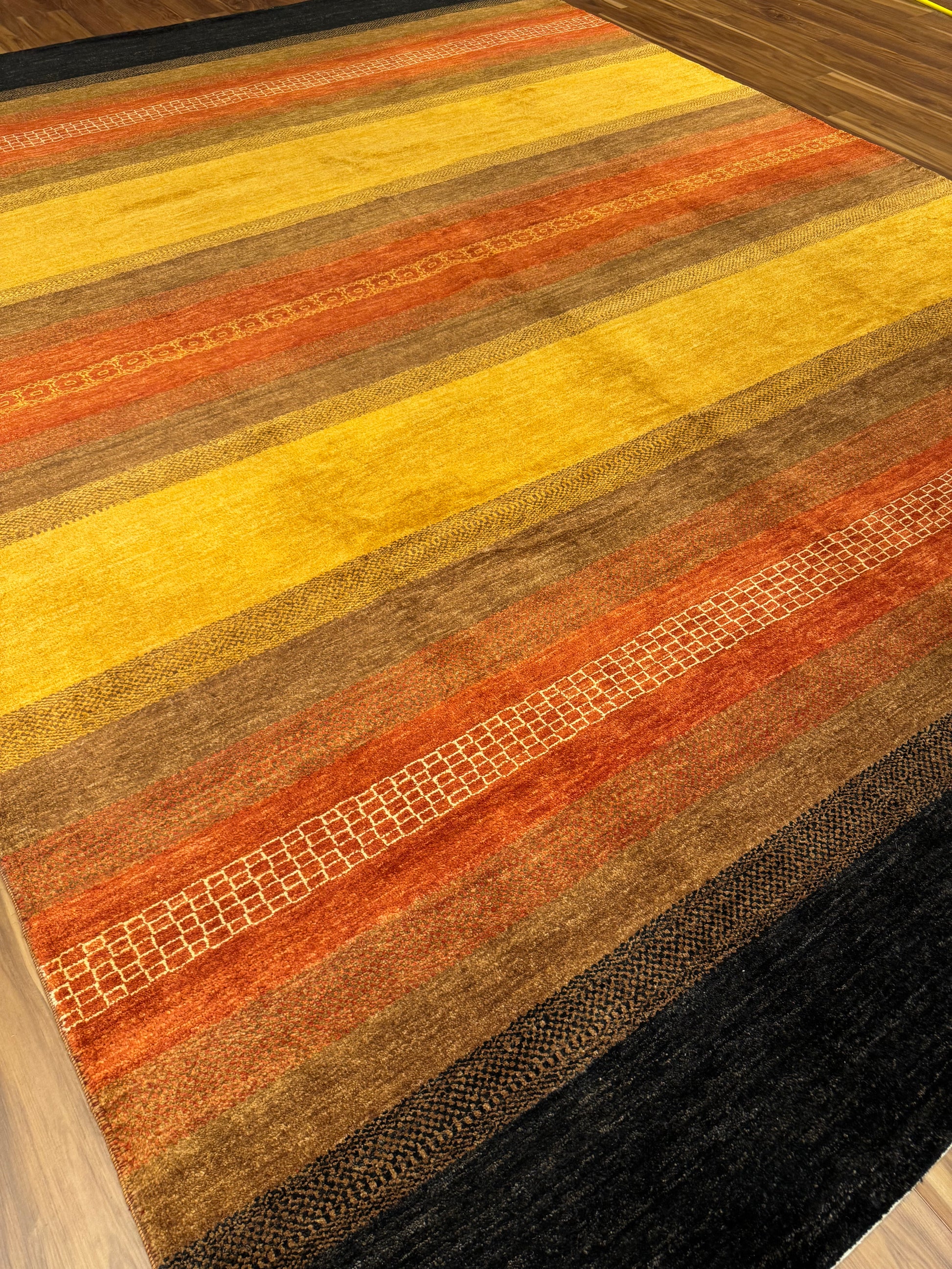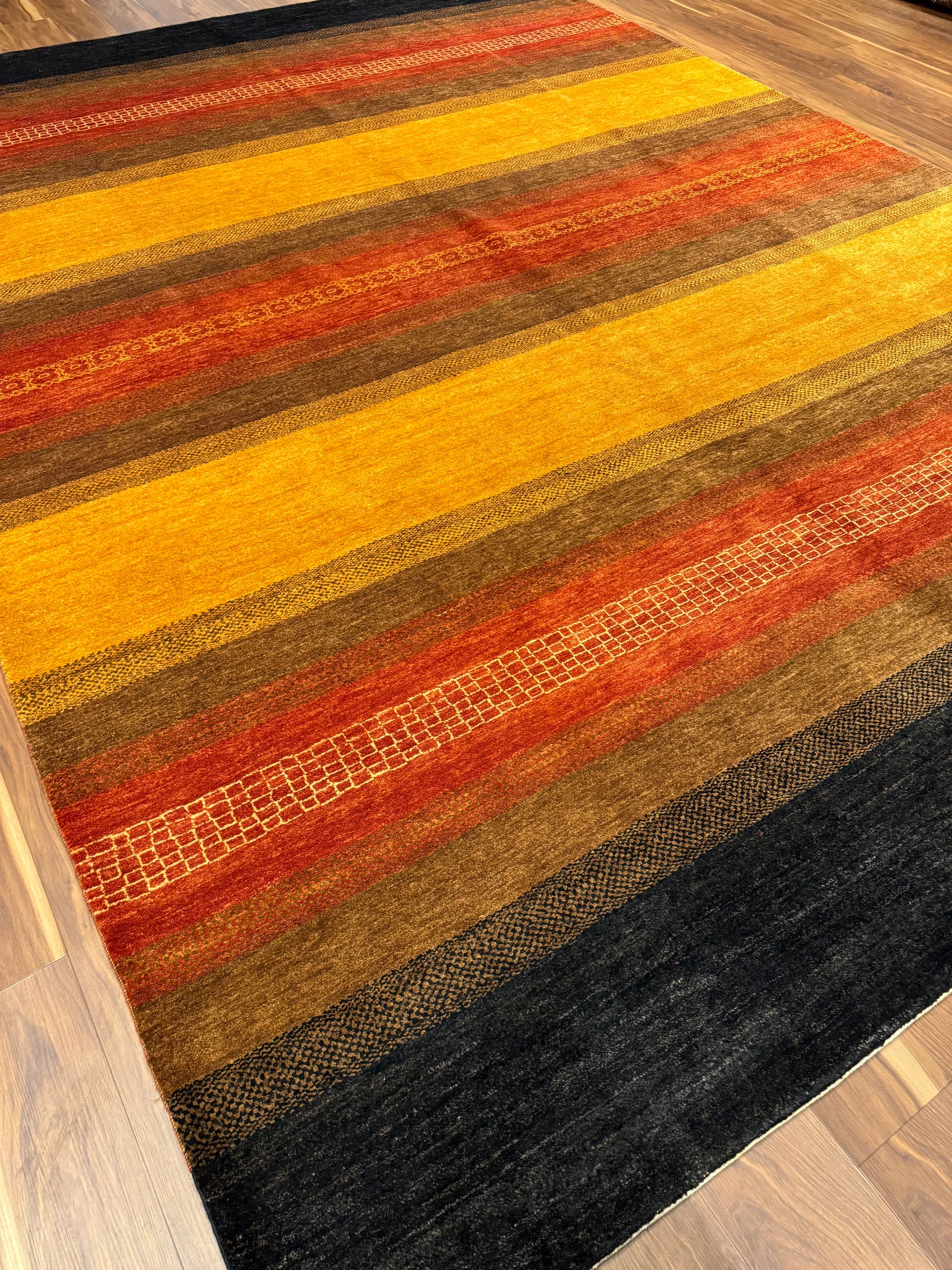 This exquisite Modern Gabbeh wool rug features a harmonious blend of warm, earthy tones, creating an inviting atmosphere. Its bold, yet simple horizontal stripes exude contemporary elegance with a hint of tribal charm. The carefully chosen colors of black, rust, mustard, and brown, paired with subtle texture variations, make it a versatile piece suitable for a variety of interior design themes. Its wool construction ensures both comfort and durability, making it an excellent choice for high-traffic areas. This modern interpretation of the traditional Gabbeh style rug brings a timeless sophistication to any living space.