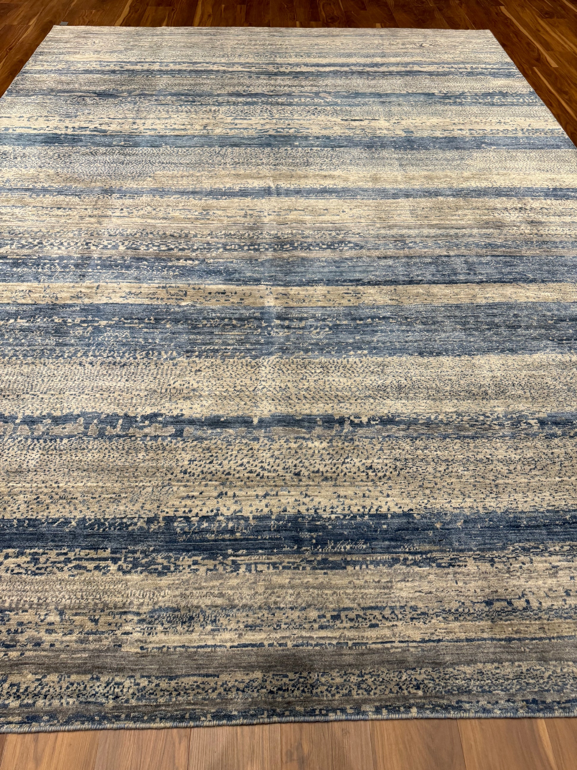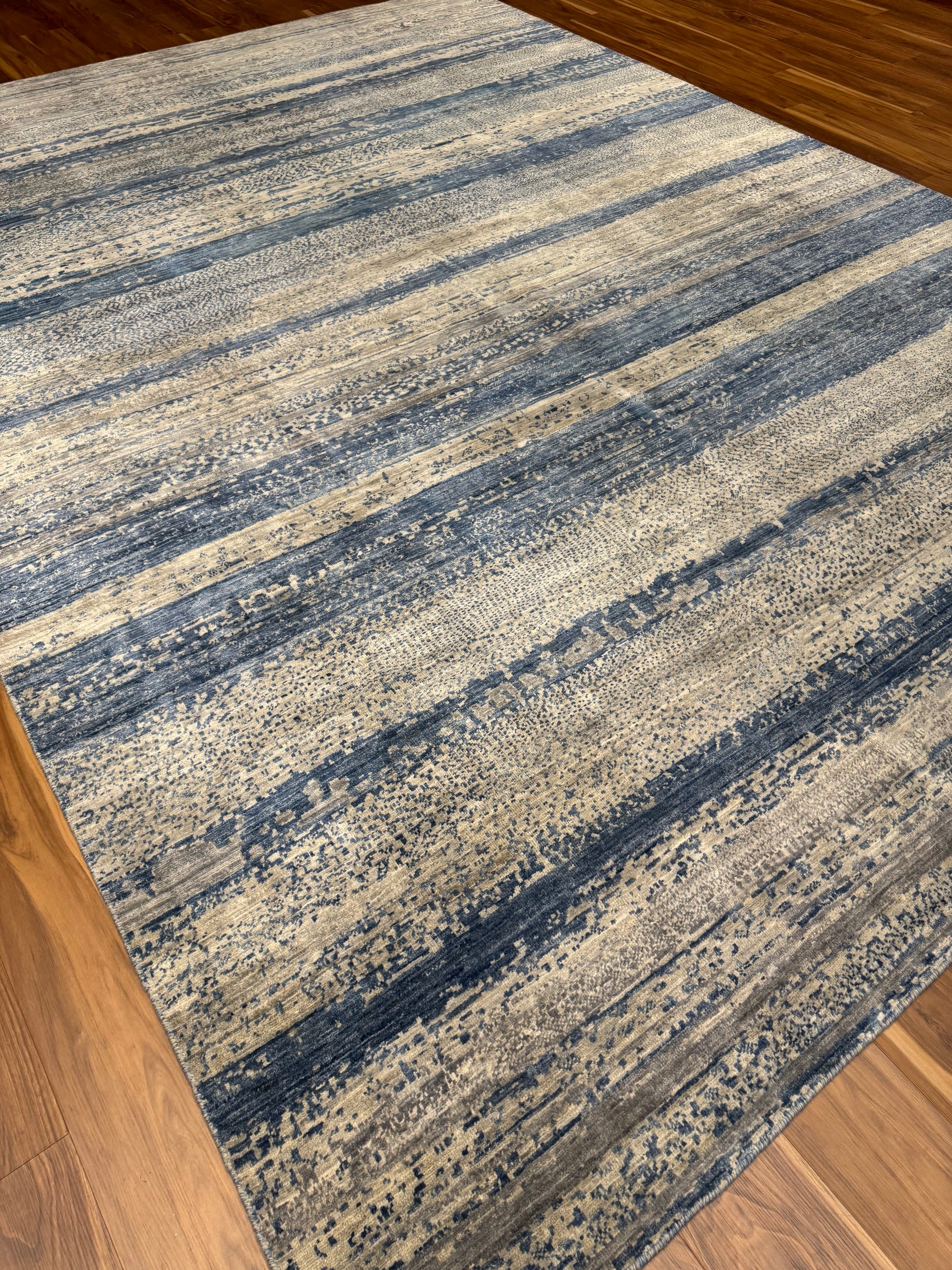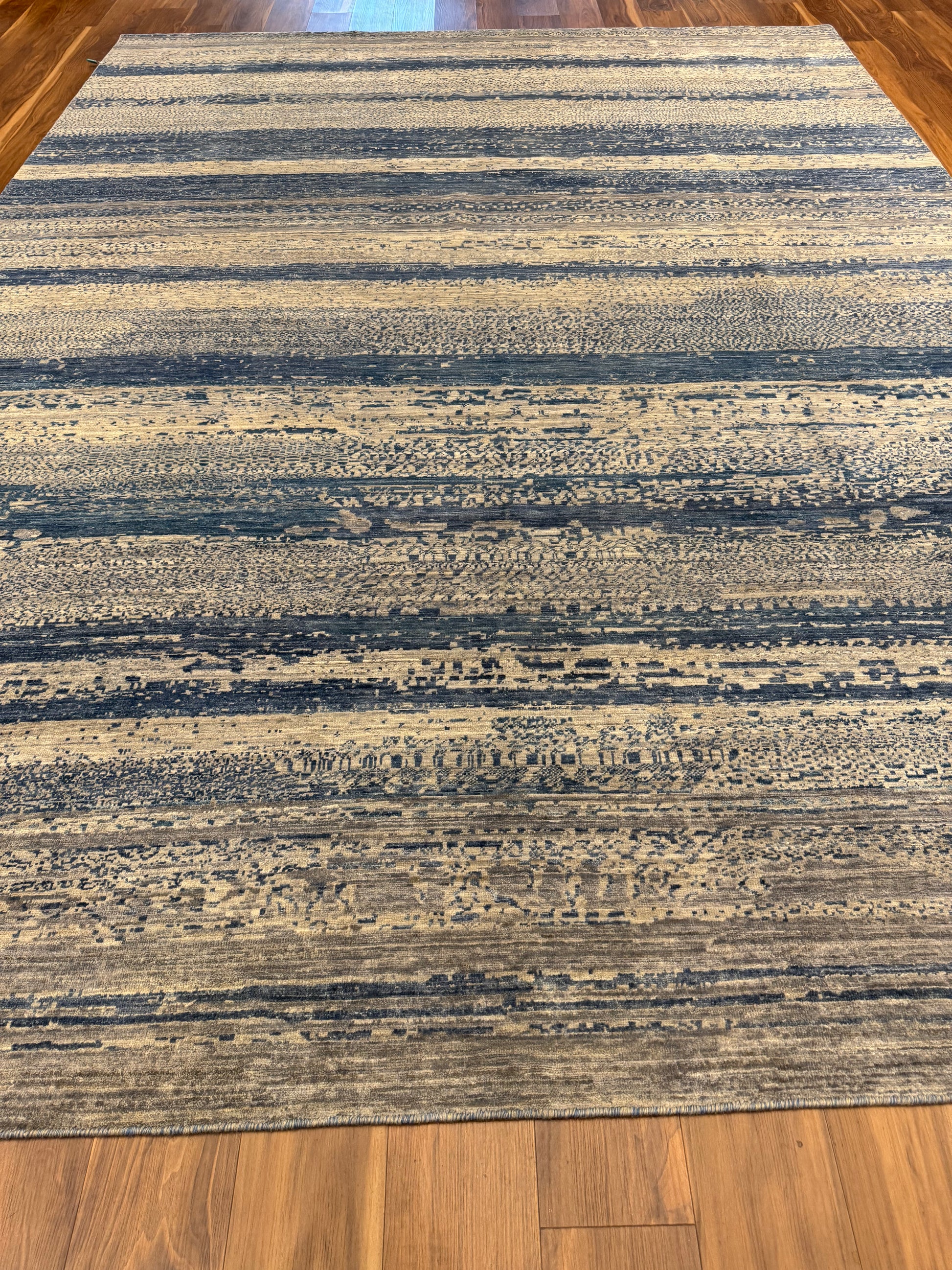 This Modern Gabbeh rug is a perfect embodiment of contemporary sophistication with a nod to traditional craftsmanship. The horizontal striped pattern features variations in shading that create a sense of depth and texture. Made from high-quality wool, this rug guarantees both comfort and durability. Its neutral tones ensure it can complement a wide range of interior designs, and the subtle pattern offers a modern twist on classic aesthetics, making it suitable for both casual and formal settings.
