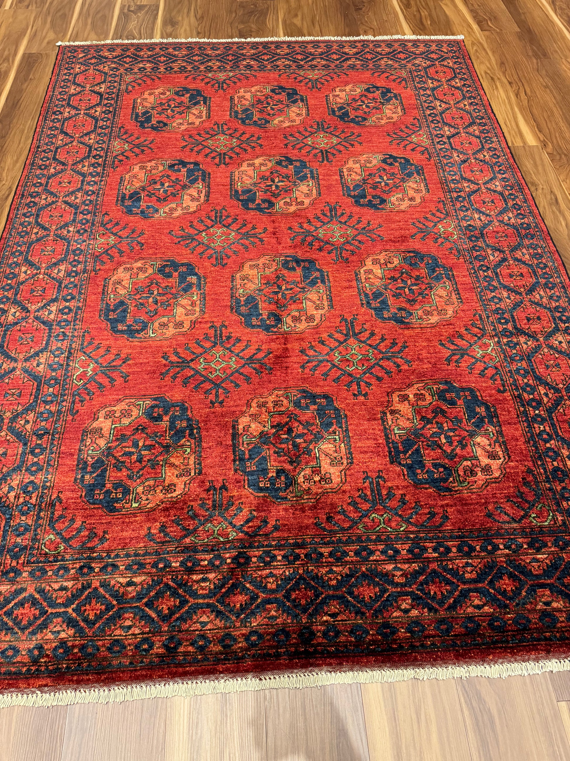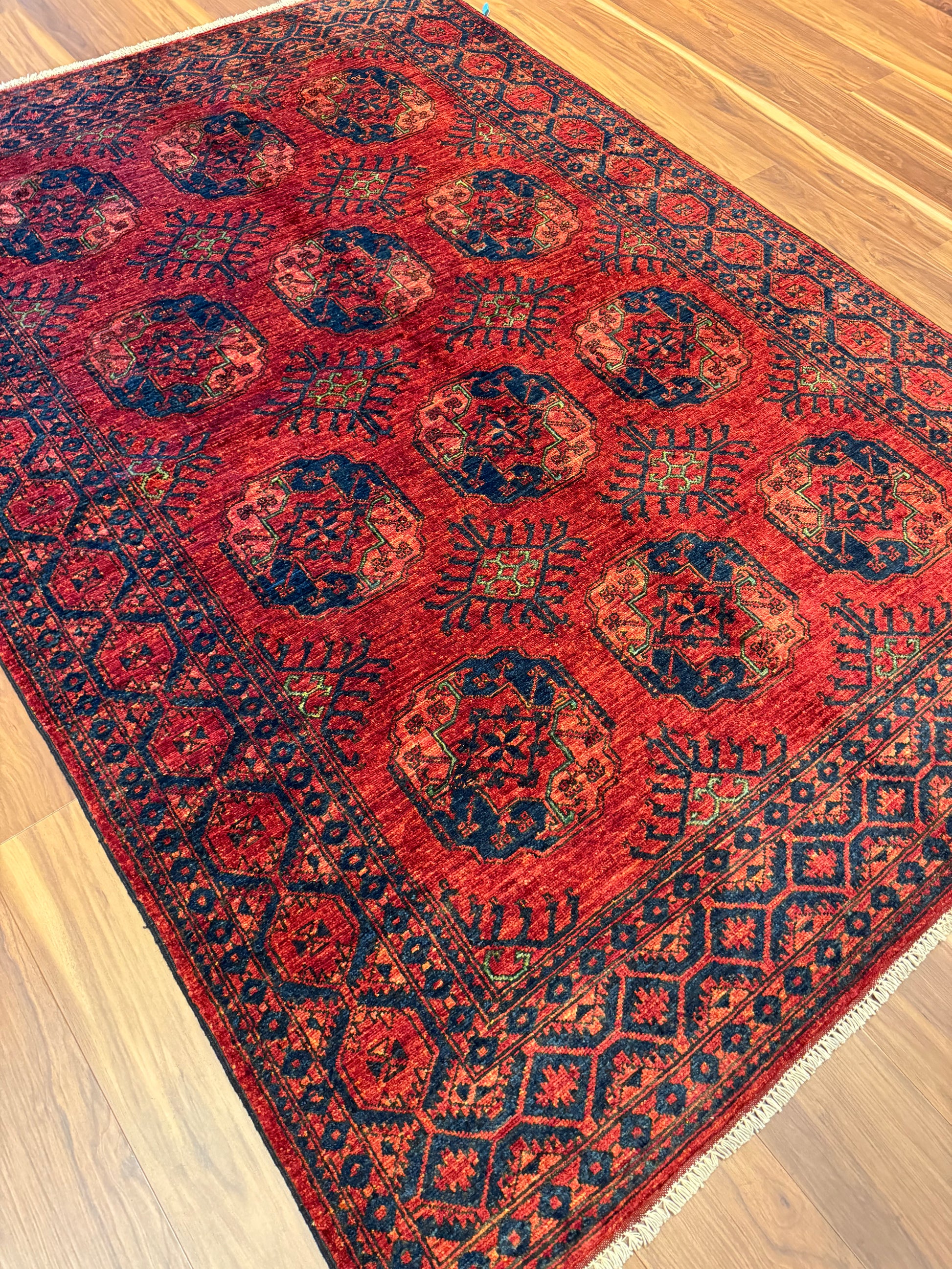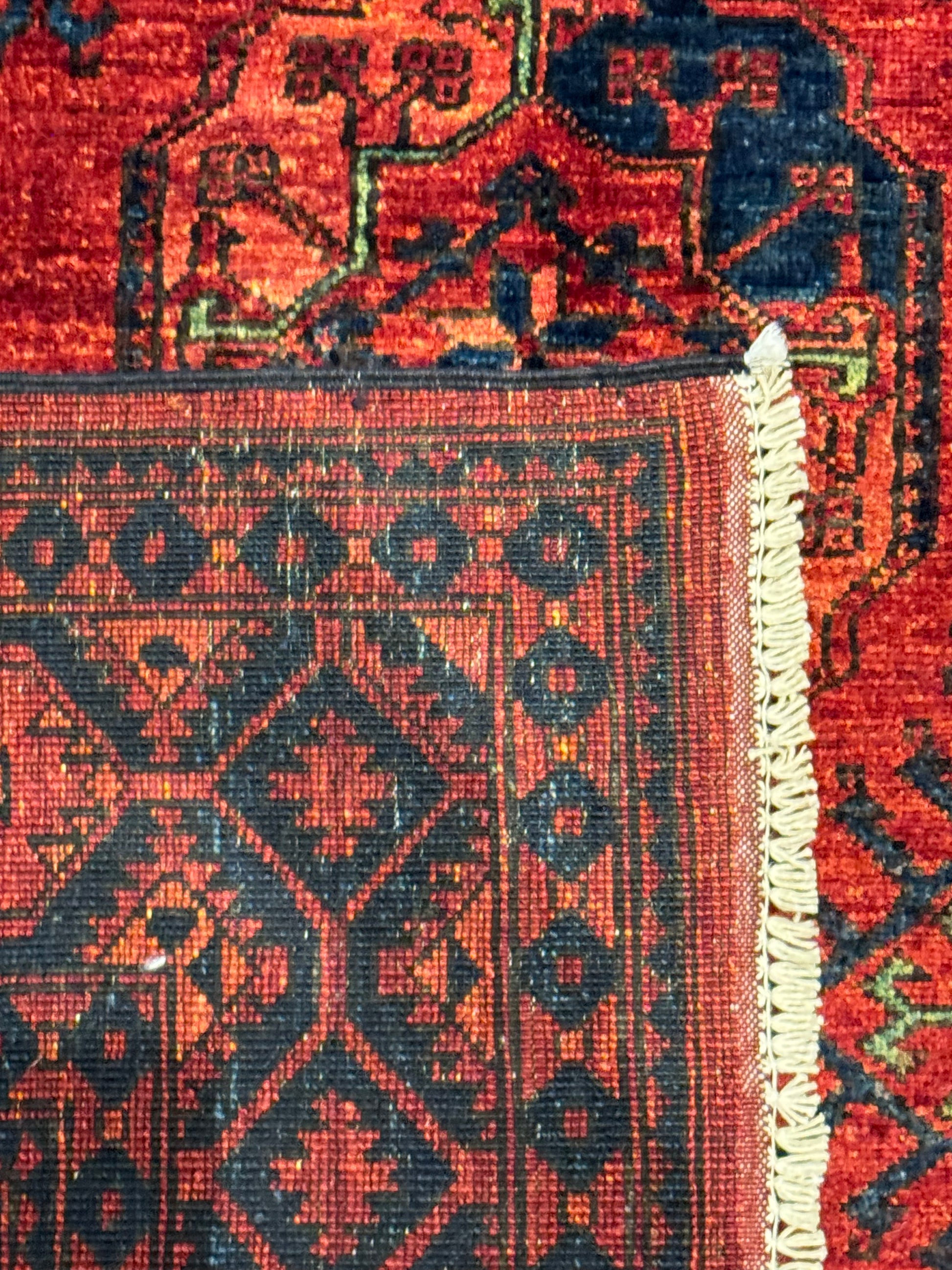 This exquisite Ersari rug showcases a traditional design with rich reds and deep navy blues. Handwoven from high-quality wool, the rug features a geometric pattern with repeating medallions that give it a sense of order and sophistication. The intricate borders and the authenticity of its craft offer a timeless appeal, suitable for both modern and classic interiors.