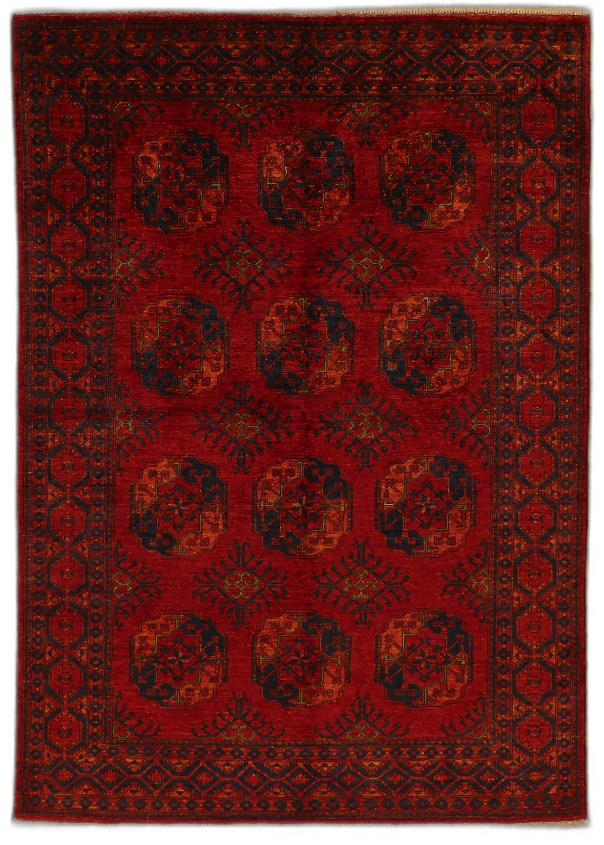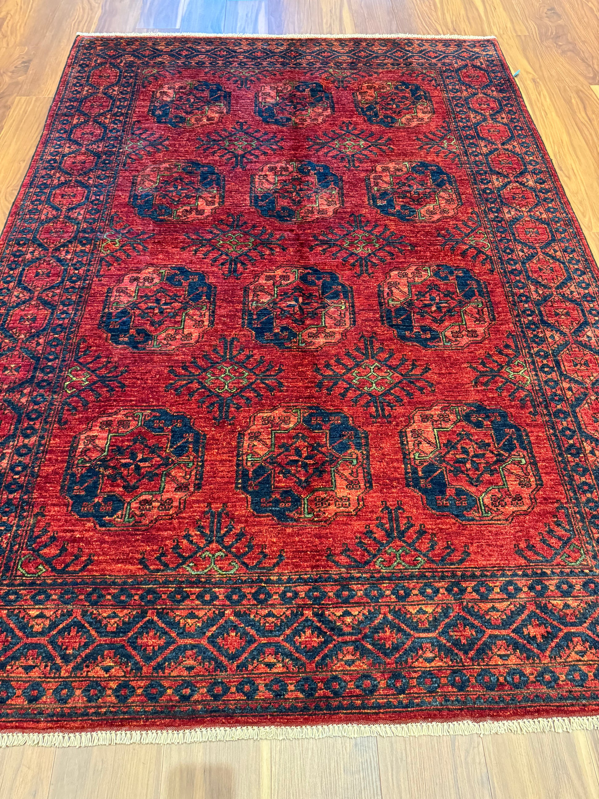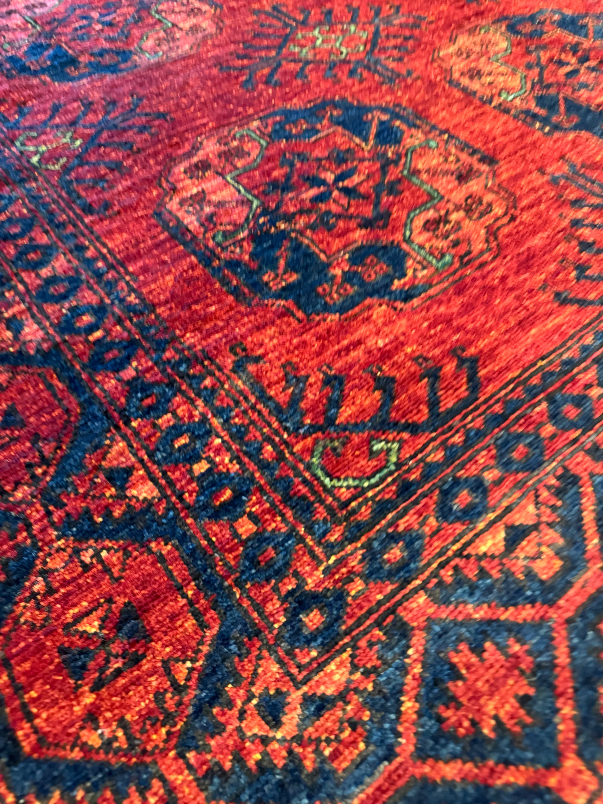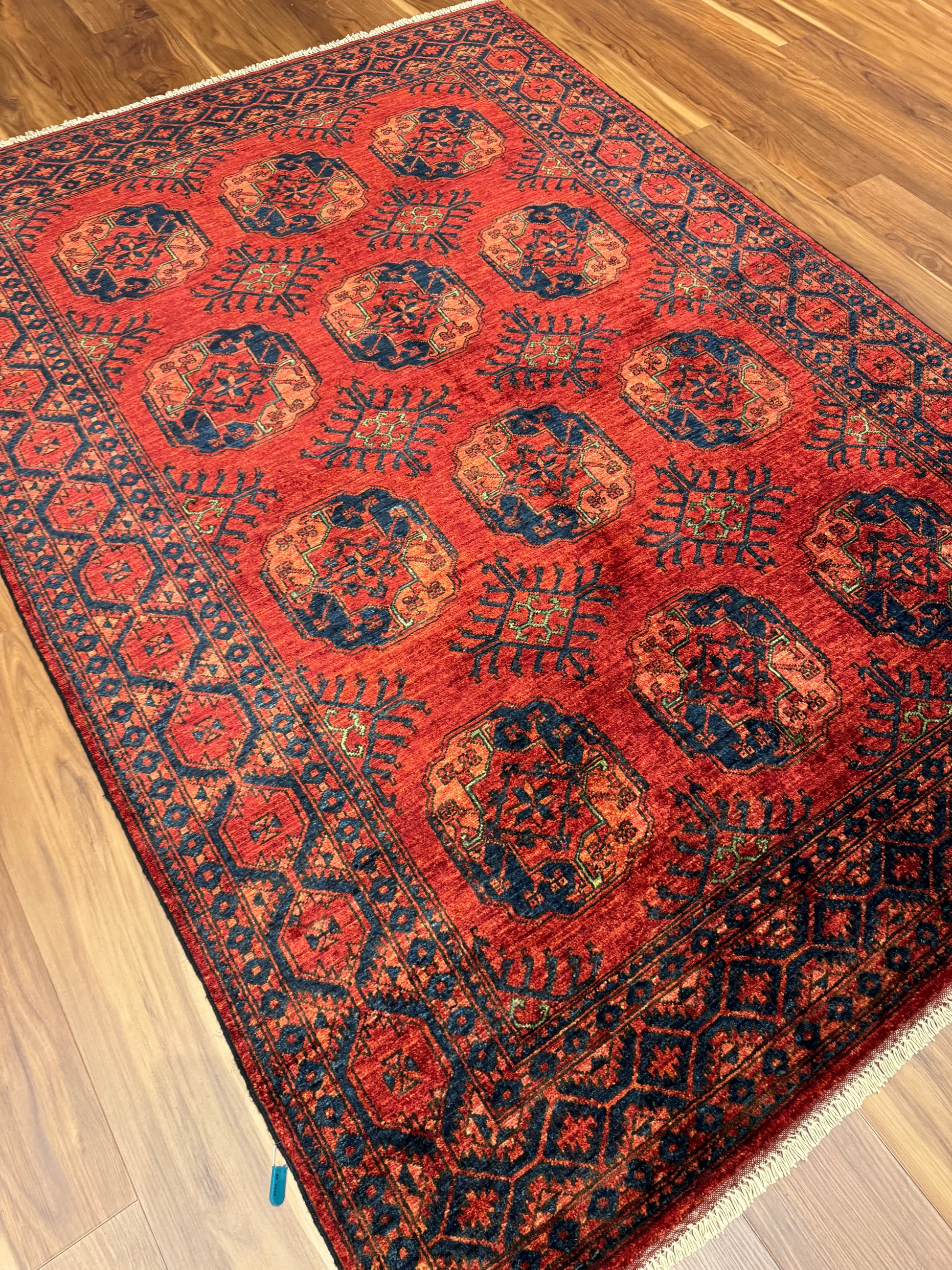This exquisite Ersari rug showcases a traditional design with rich reds and deep navy blues. Handwoven from high-quality wool, the rug features a geometric pattern with repeating medallions that give it a sense of order and sophistication. The intricate borders and the authenticity of its craft offer a timeless appeal, suitable for both modern and classic interiors.