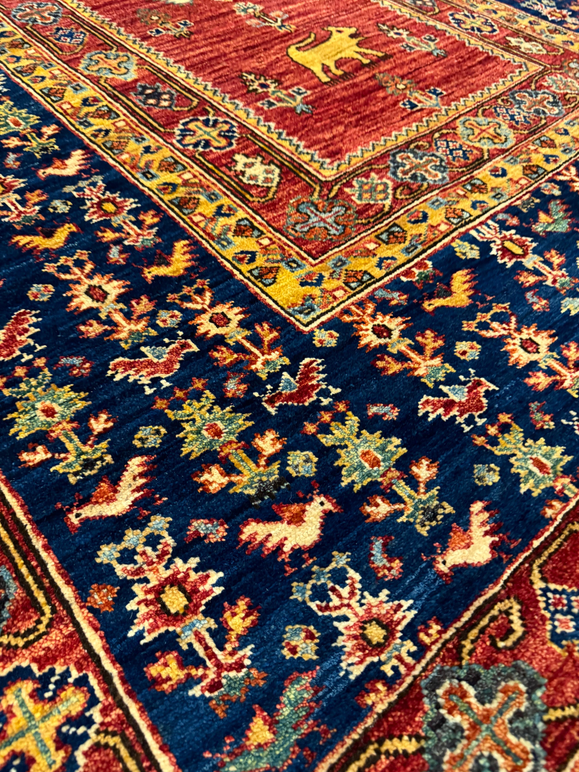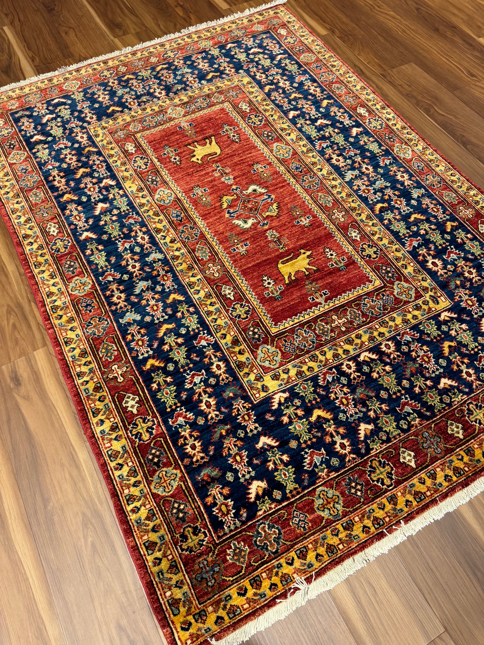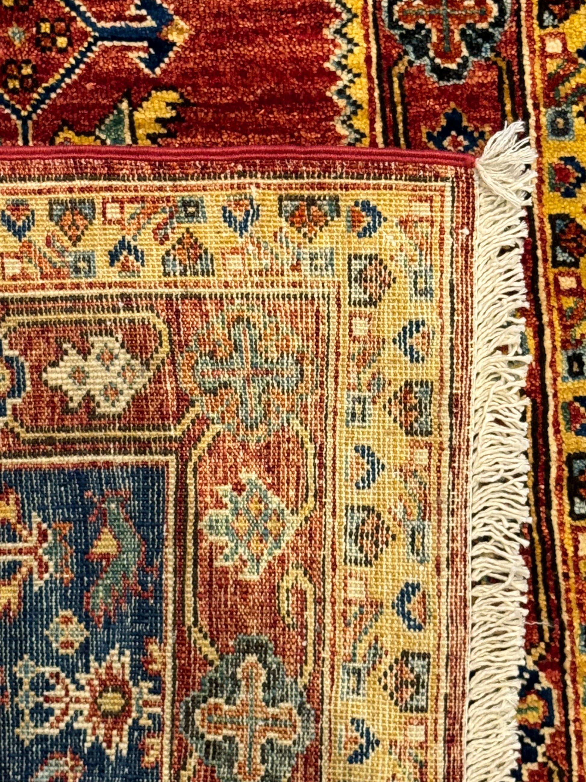 This exquisite Fine Ariana rug boasts a rich tapestry of intricate patterns and a classic medallion centerpiece, enveloped by ornate borders. Handwoven from high-quality wool, this rug showcases exceptional craftsmanship. Its warm and inviting palette combines deep navy blues with vibrant reds, accented by golden and ivory highlights, creating a timeless and elegant addition to any room.