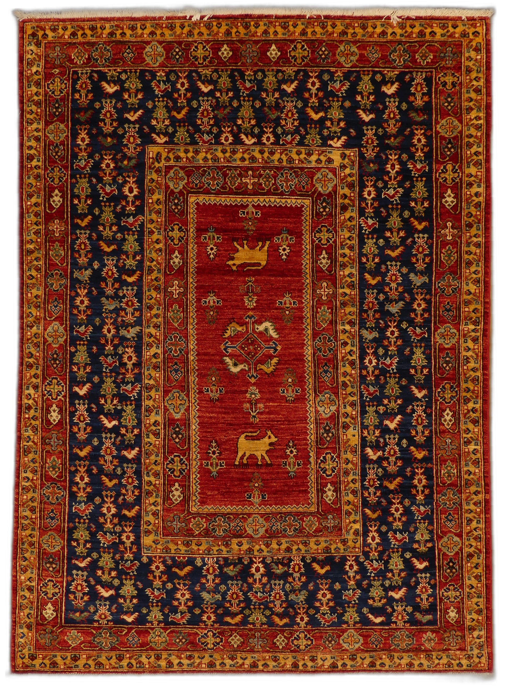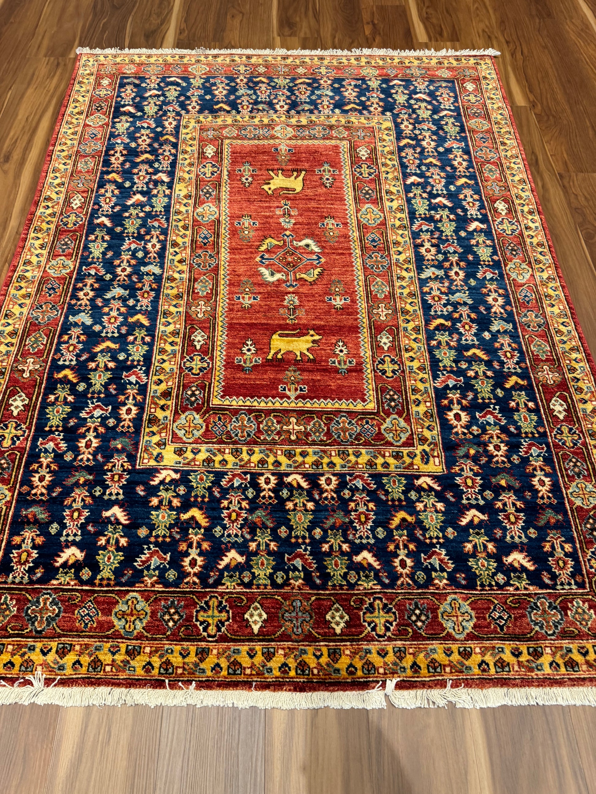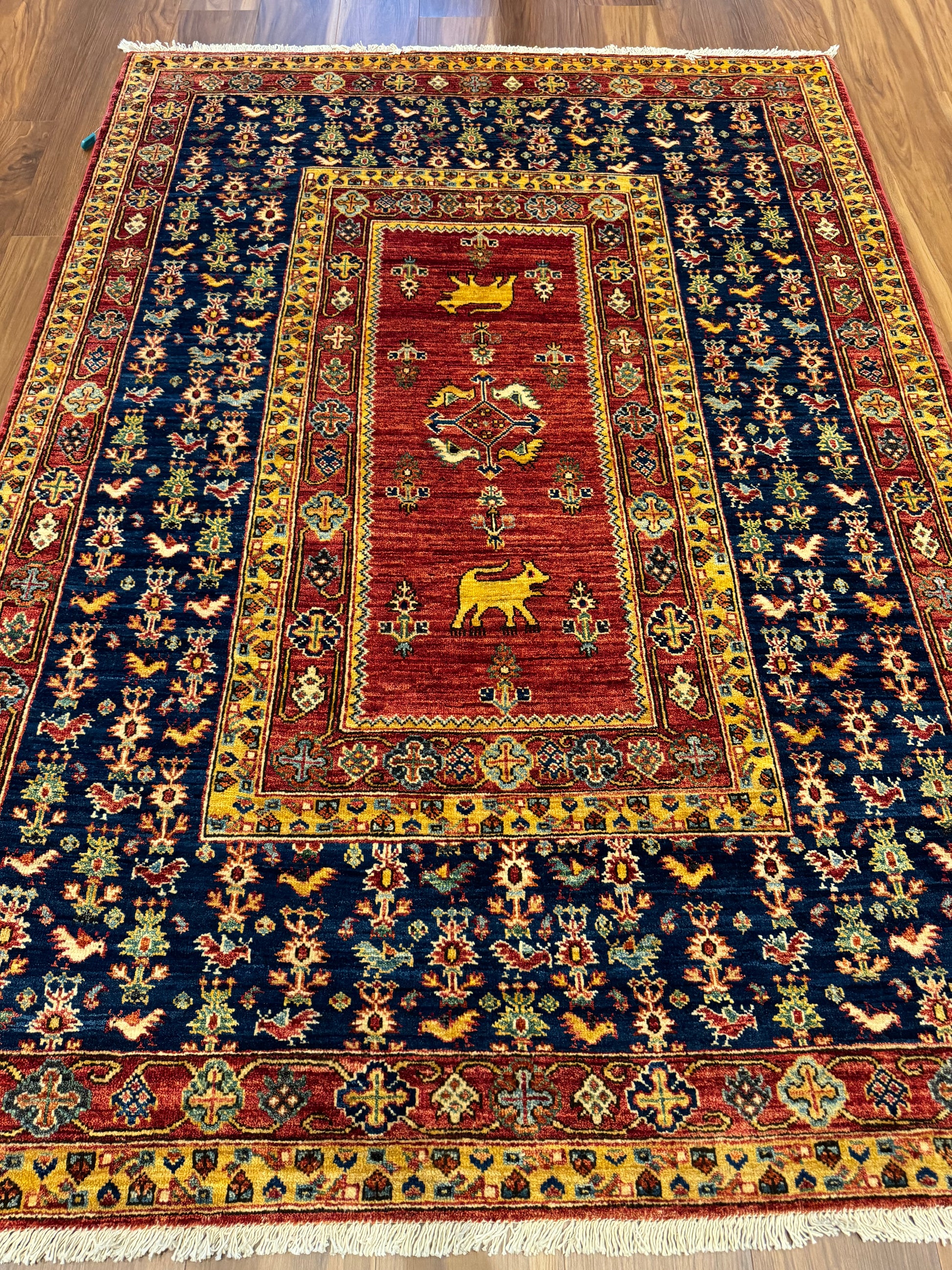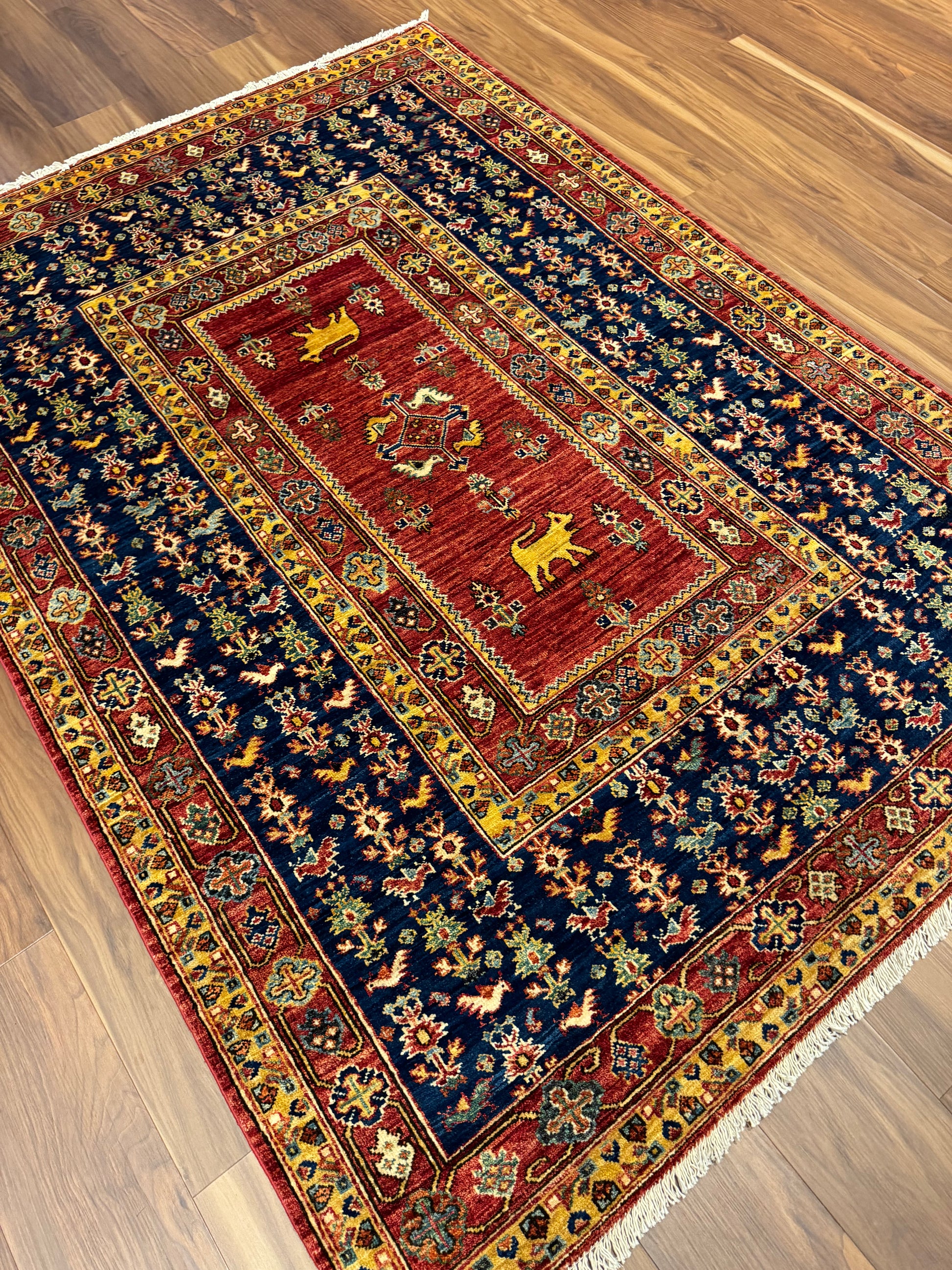 This exquisite Fine Ariana rug boasts a rich tapestry of intricate patterns and a classic medallion centerpiece, enveloped by ornate borders. Handwoven from high-quality wool, this rug showcases exceptional craftsmanship. Its warm and inviting palette combines deep navy blues with vibrant reds, accented by golden and ivory highlights, creating a timeless and elegant addition to any room.