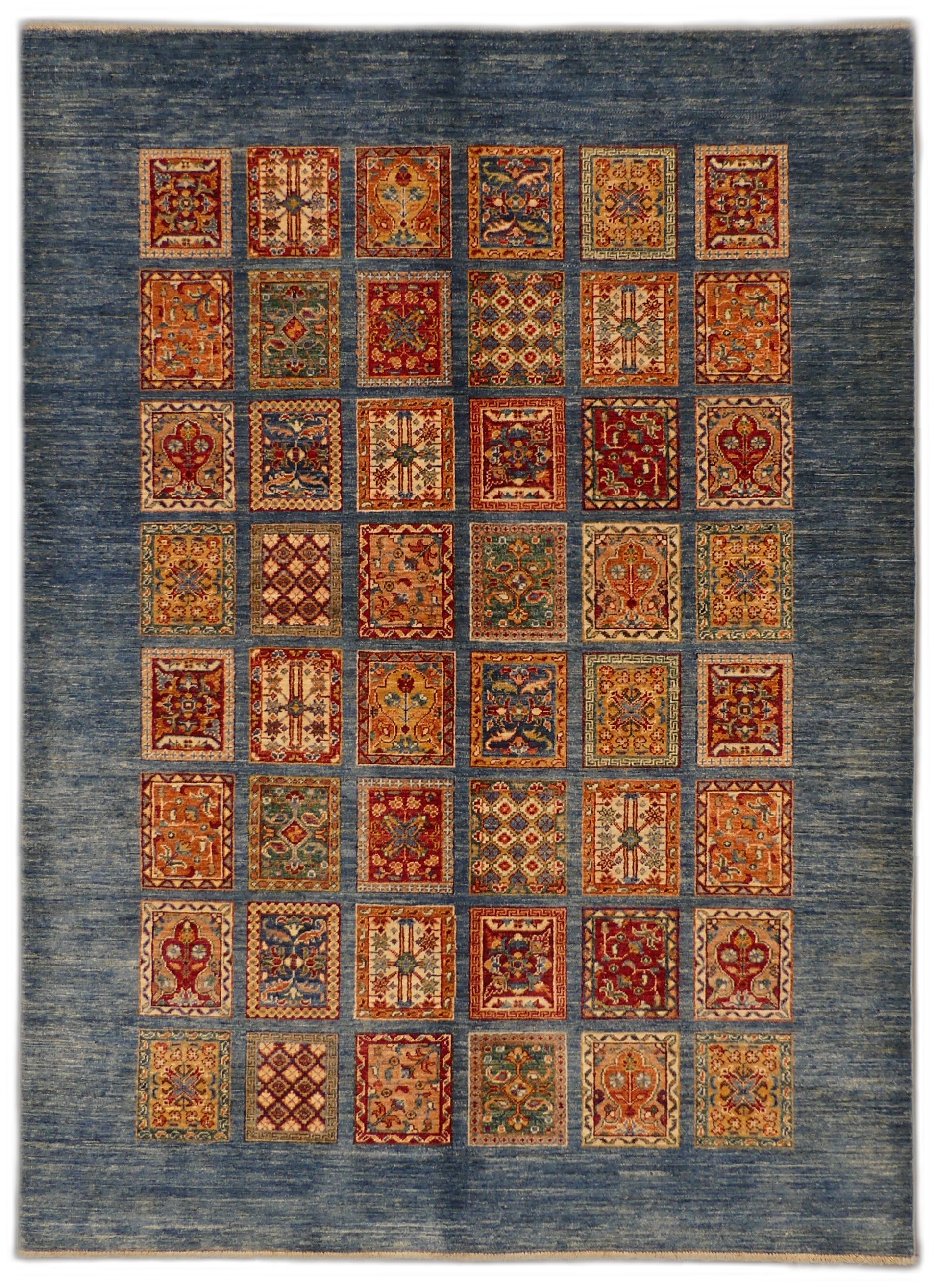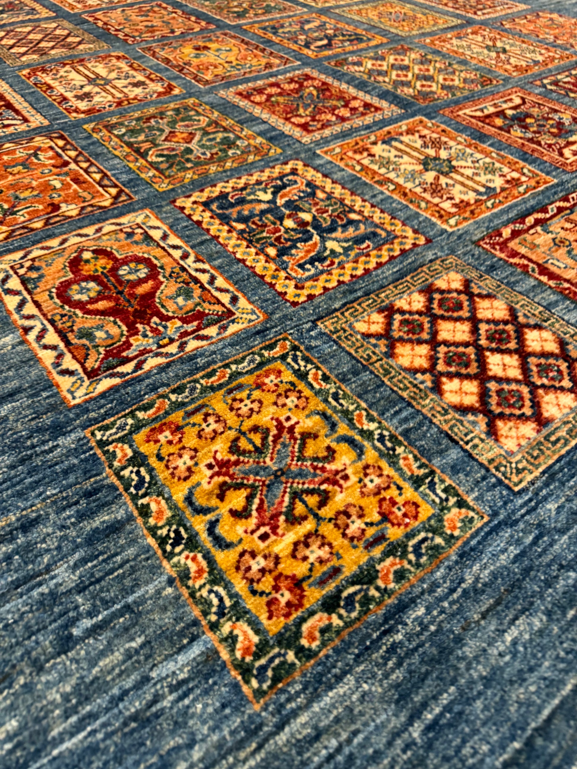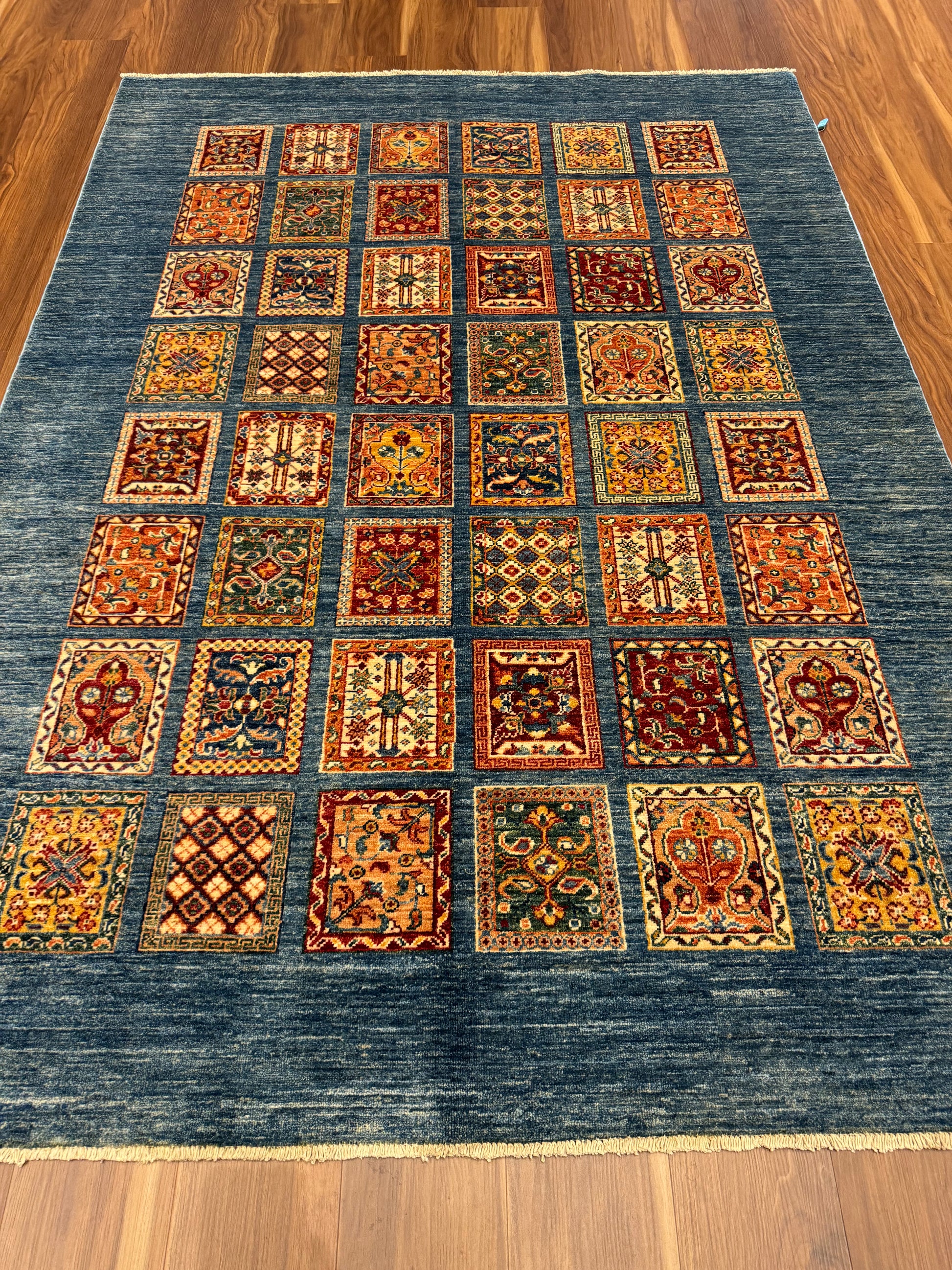 This exquisite Fine Bakhtiari rug features a harmonious grid of garden compartment patterns, elegantly showcasing a diversity of vibrant floral and geometric motifs. The central composition is artfully framed by a deep navy blue field, lending a dramatic contrast to the rich rust, beige, and ivory accents. Crafted from high-quality wool, this rug promises durability and comfort, making it an impressive addition to any room seeking a touch of traditional sophistication.