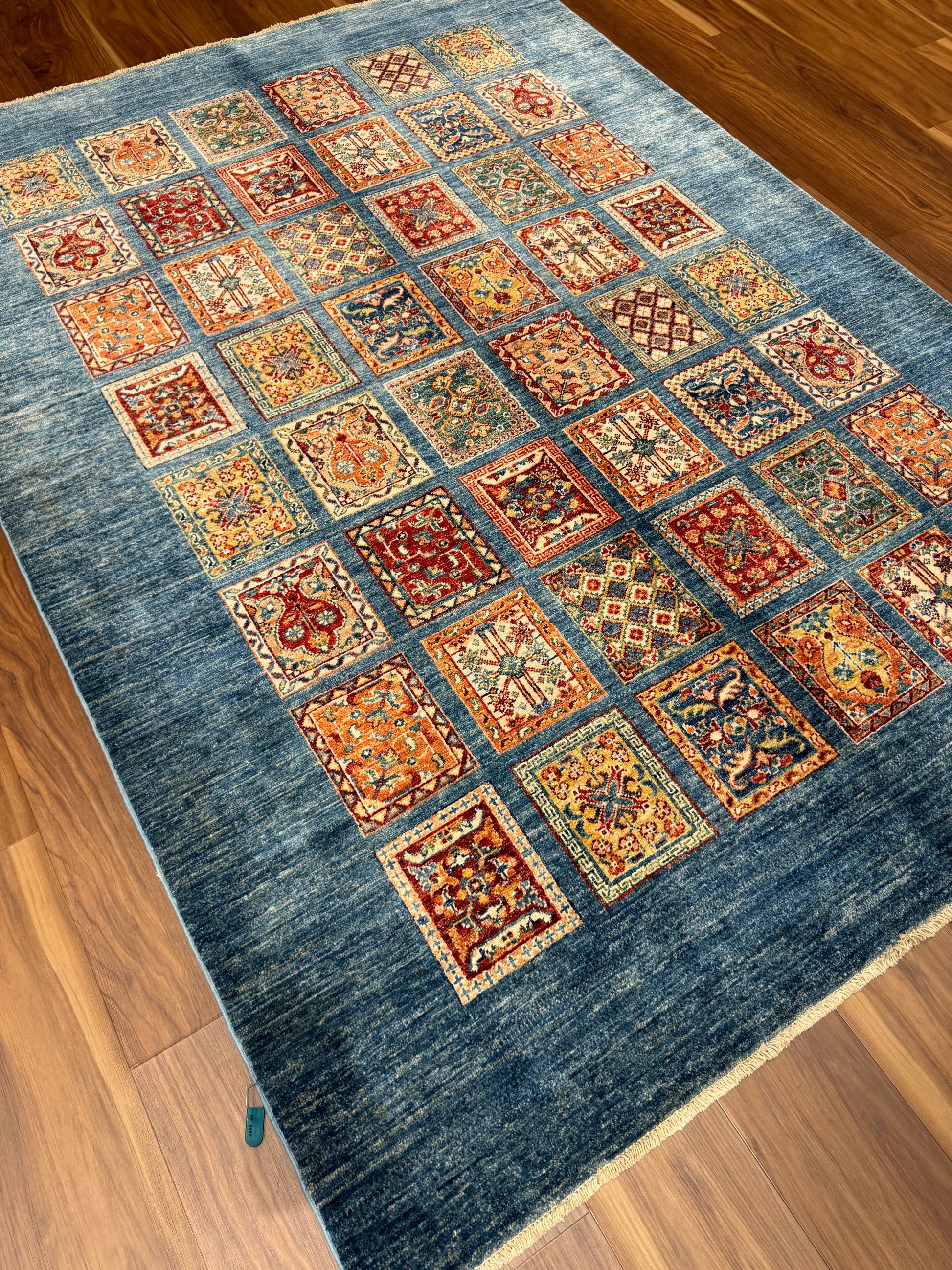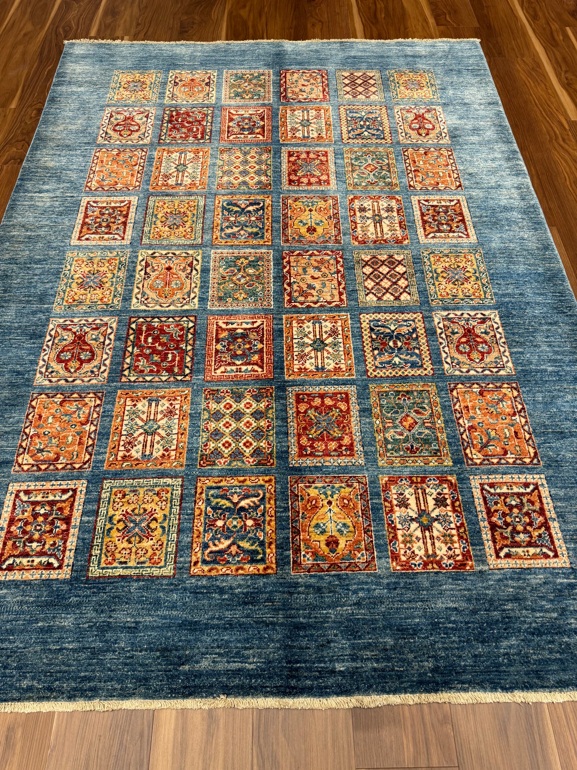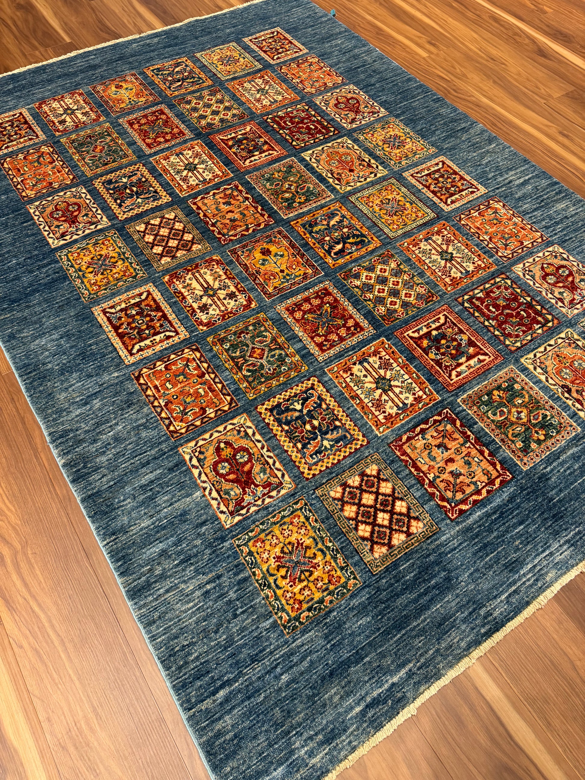 This exquisite Fine Bakhtiari rug features a harmonious grid of garden compartment patterns, elegantly showcasing a diversity of vibrant floral and geometric motifs. The central composition is artfully framed by a deep navy blue field, lending a dramatic contrast to the rich rust, beige, and ivory accents. Crafted from high-quality wool, this rug promises durability and comfort, making it an impressive addition to any room seeking a touch of traditional sophistication.