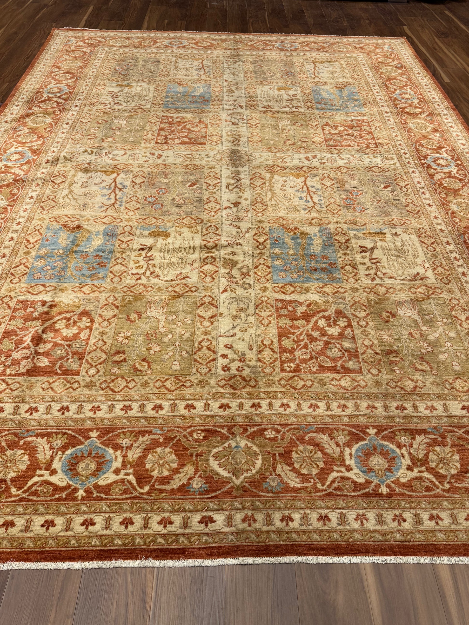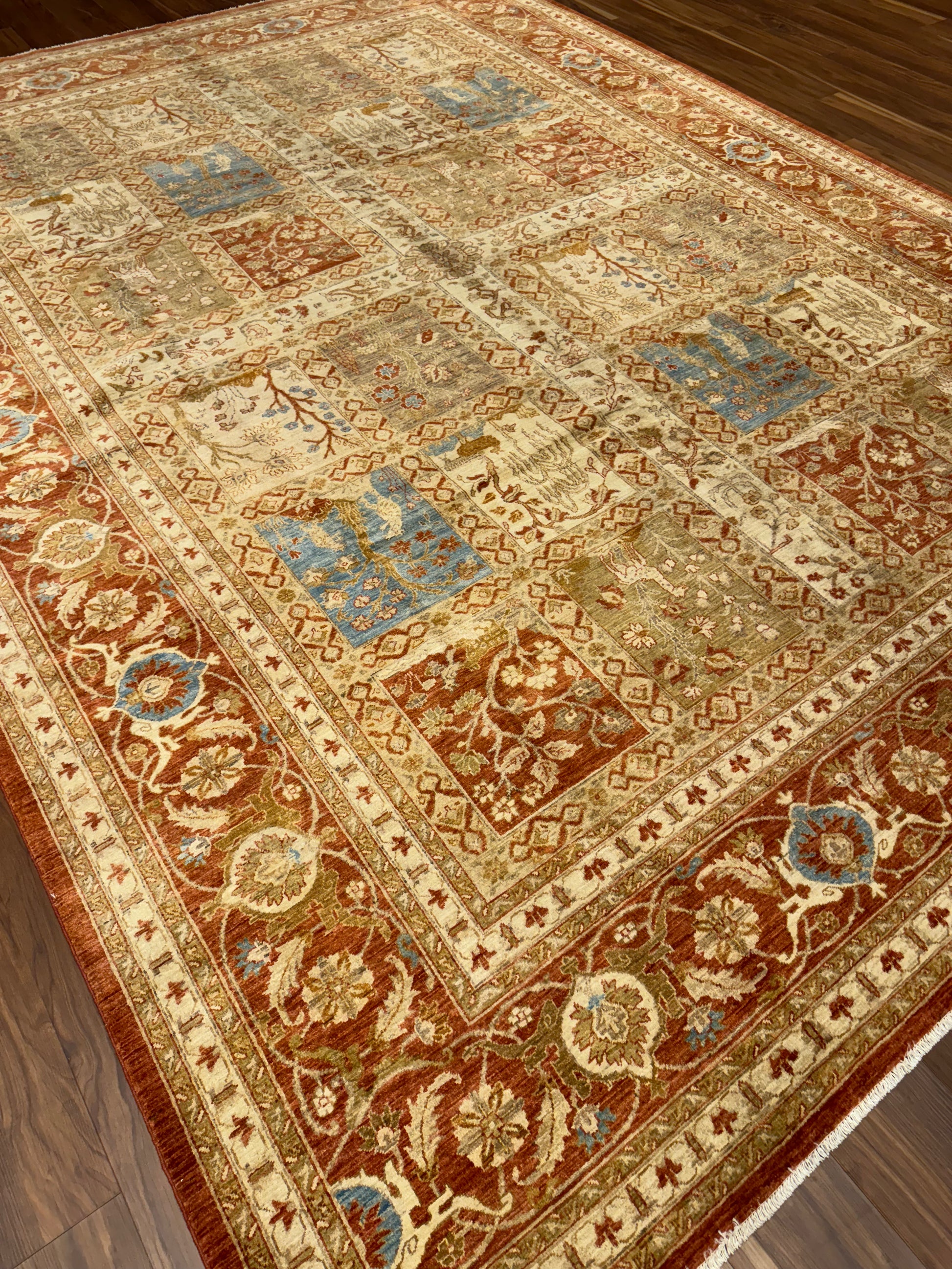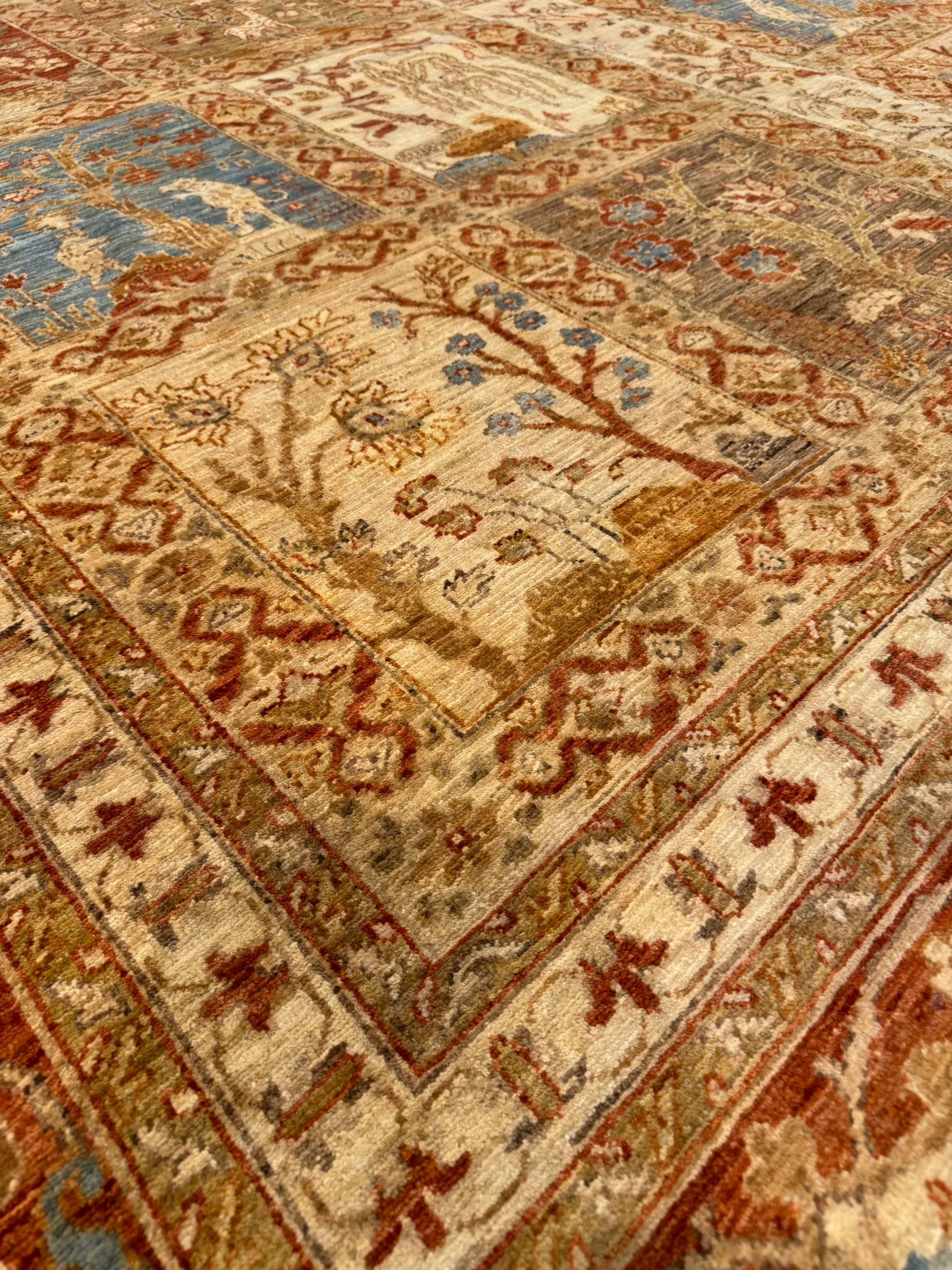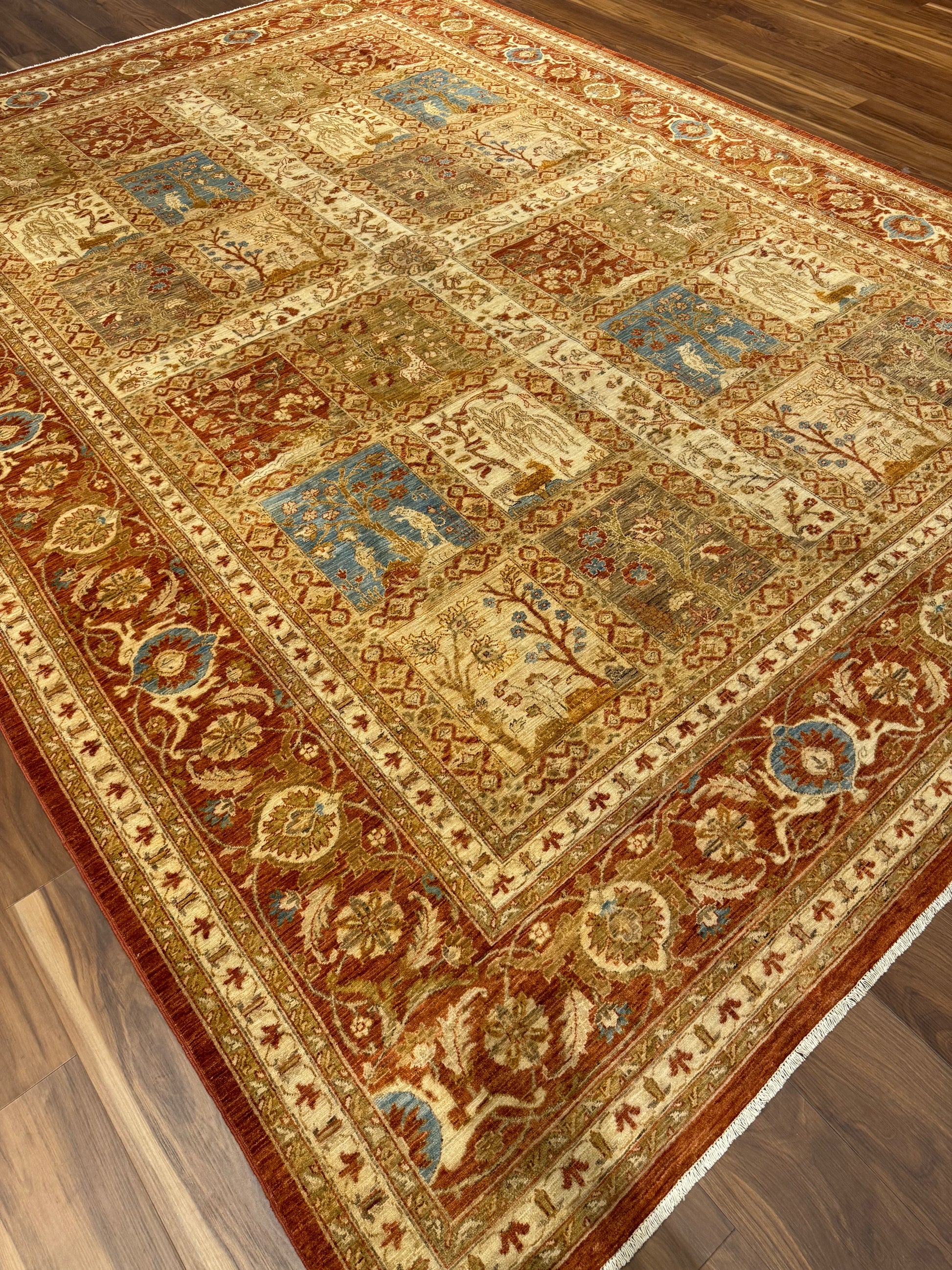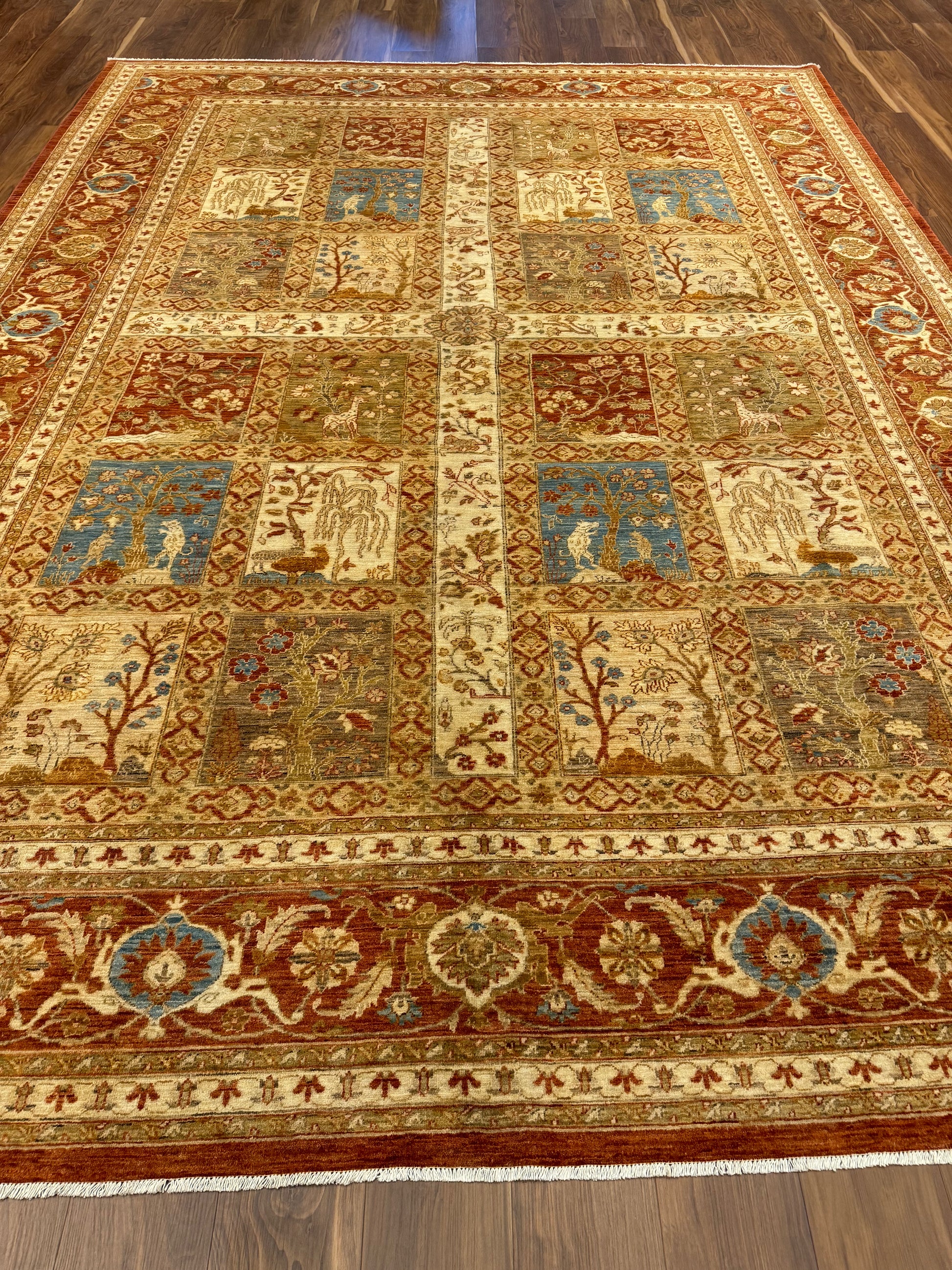 This exquisitely crafted Fine Bakhtiari rug features an intricate traditional design with rich, warm tones and distinctive garden motifs. Each panel showcases a symphony of nature-inspired scenes, bordered by an elegant, detailed pattern. Crafted from high-quality wool, this rug promises durability and a luxurious feel underfoot. Its timeless elegance will undoubtedly enhance the character of any living space, making it a valuable addition to a discerning collector's assortment or a perfect statement piece for a refined home decor.