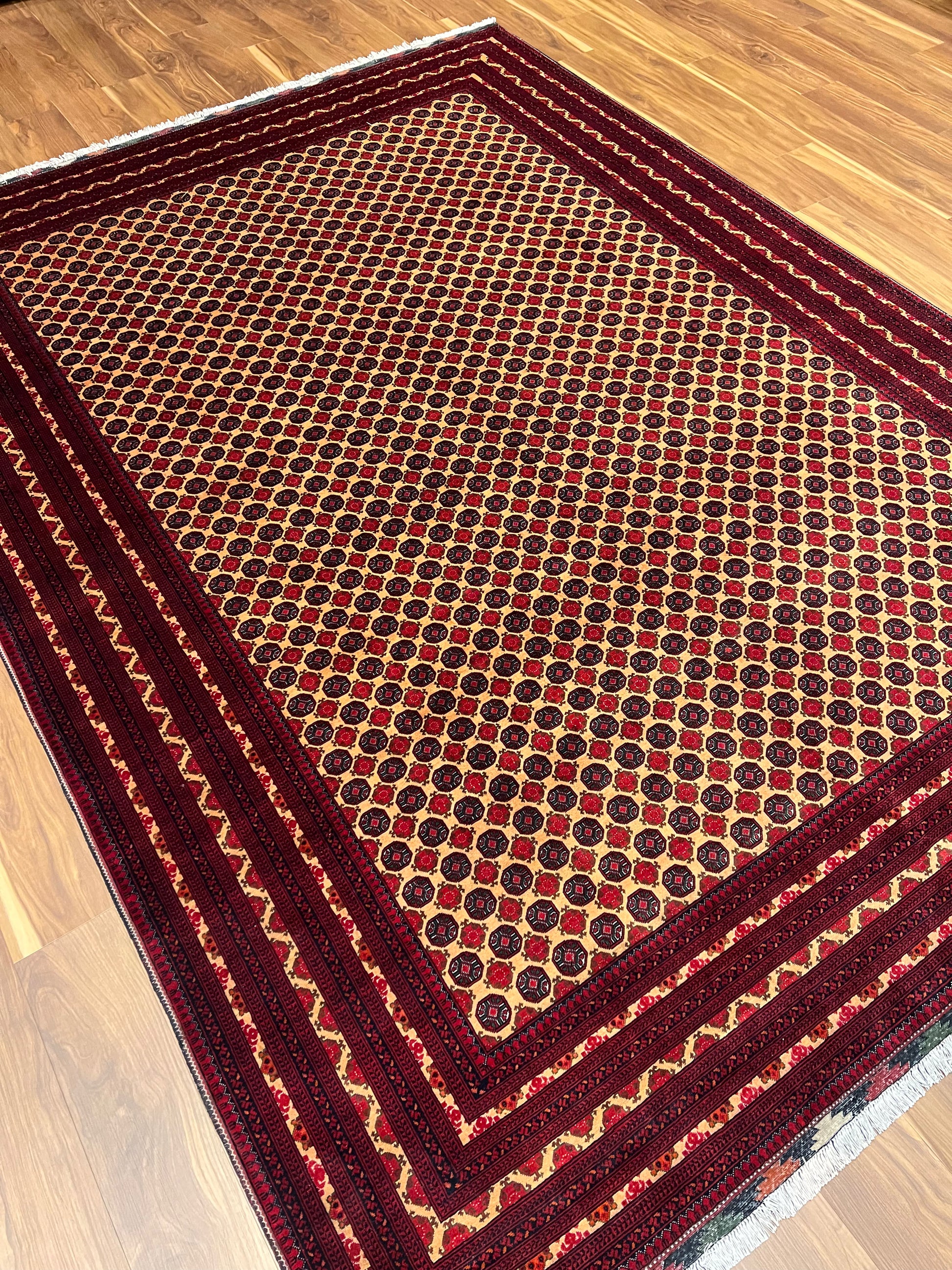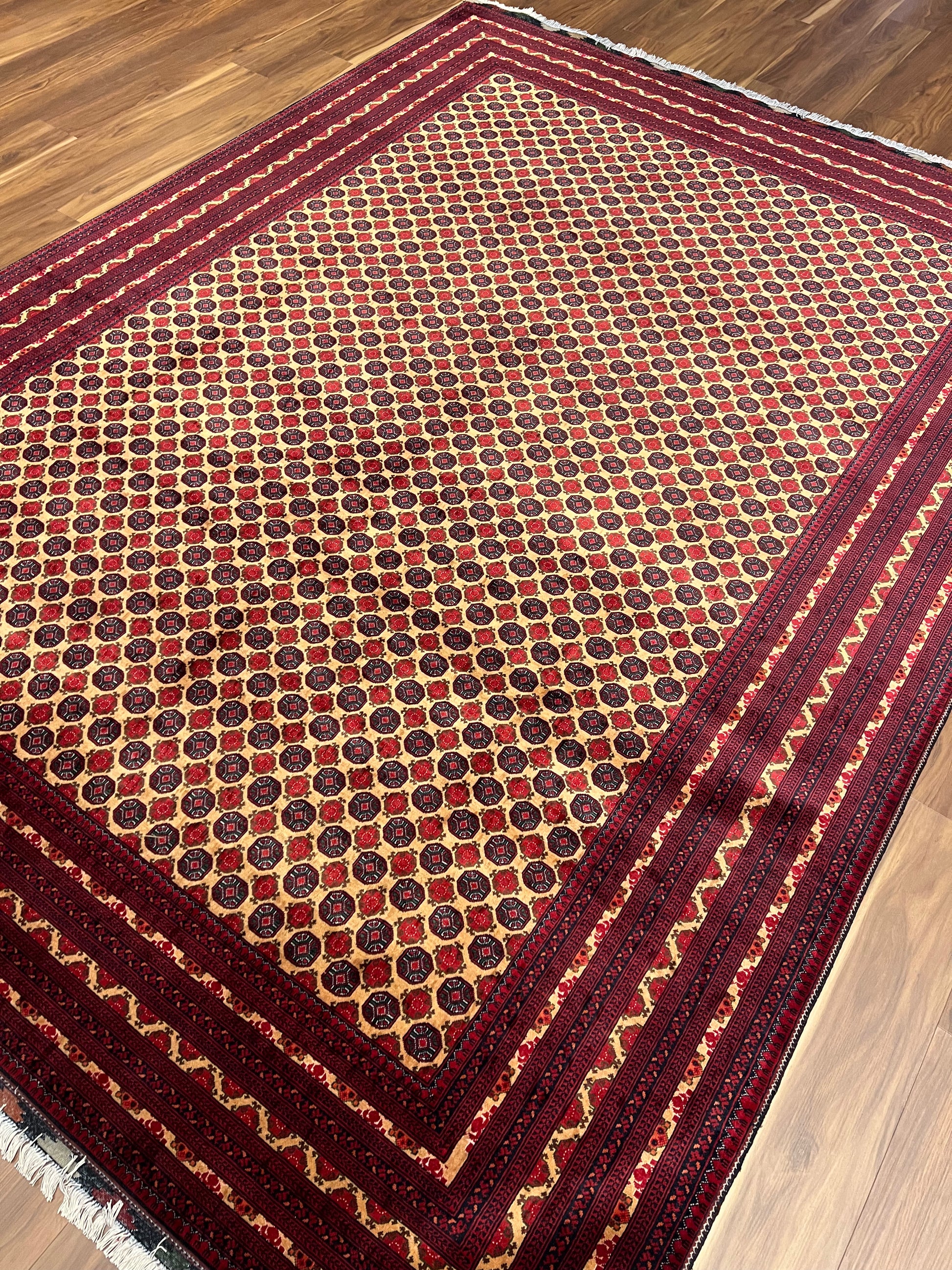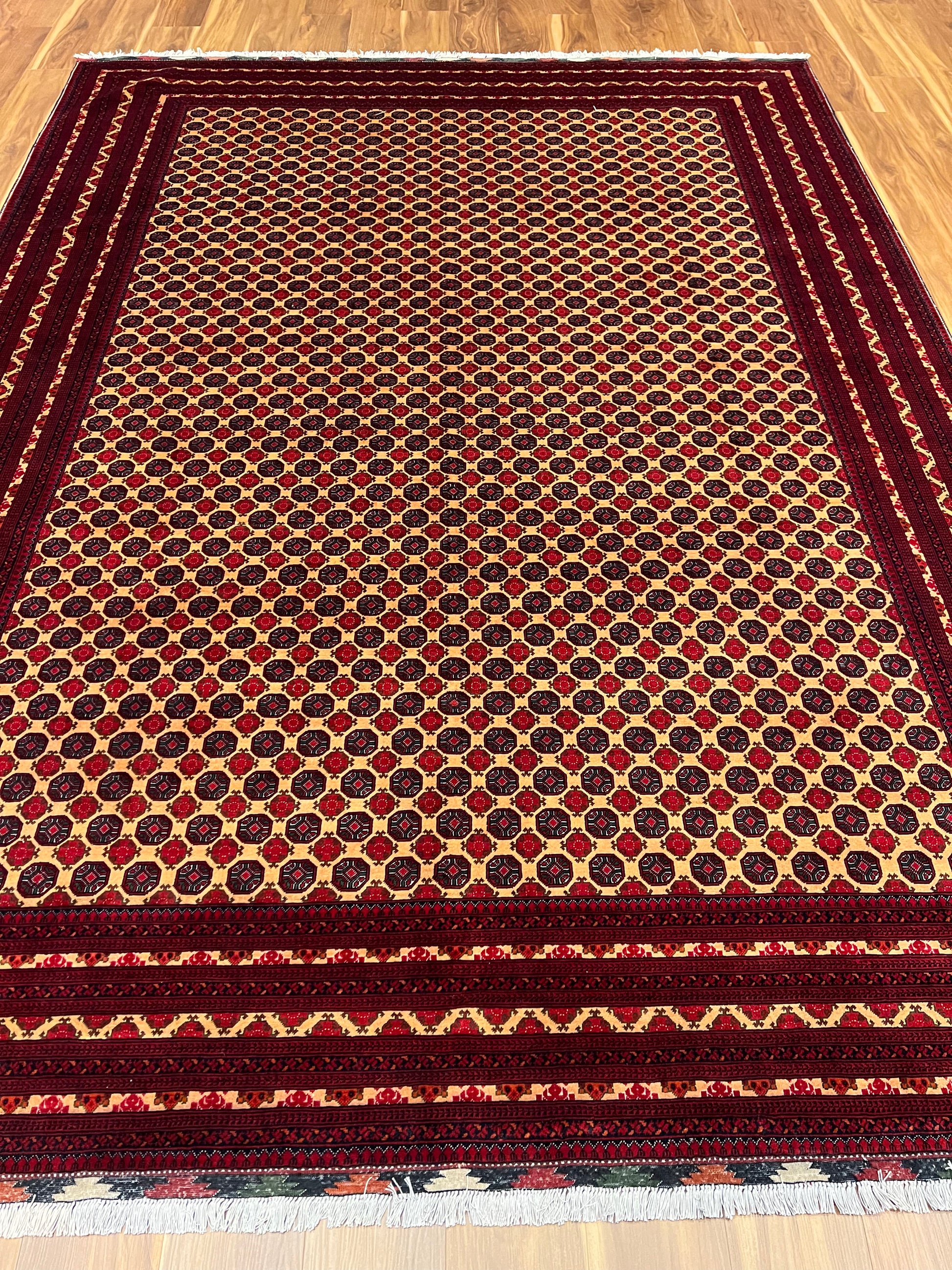 This exquisite Fine Bukhara rug boasts traditional sophistication with its intricate geometric patterns and rich color palette. Hand-knotted from the finest wool, the rug features a deep red field accented by beige and brown motifs, encapsulated by intricate borders that retain the classic aesthetic. Perfect for adding a touch of elegance to any space, this rug is a testament to exceptional craftsmanship and enduring design.