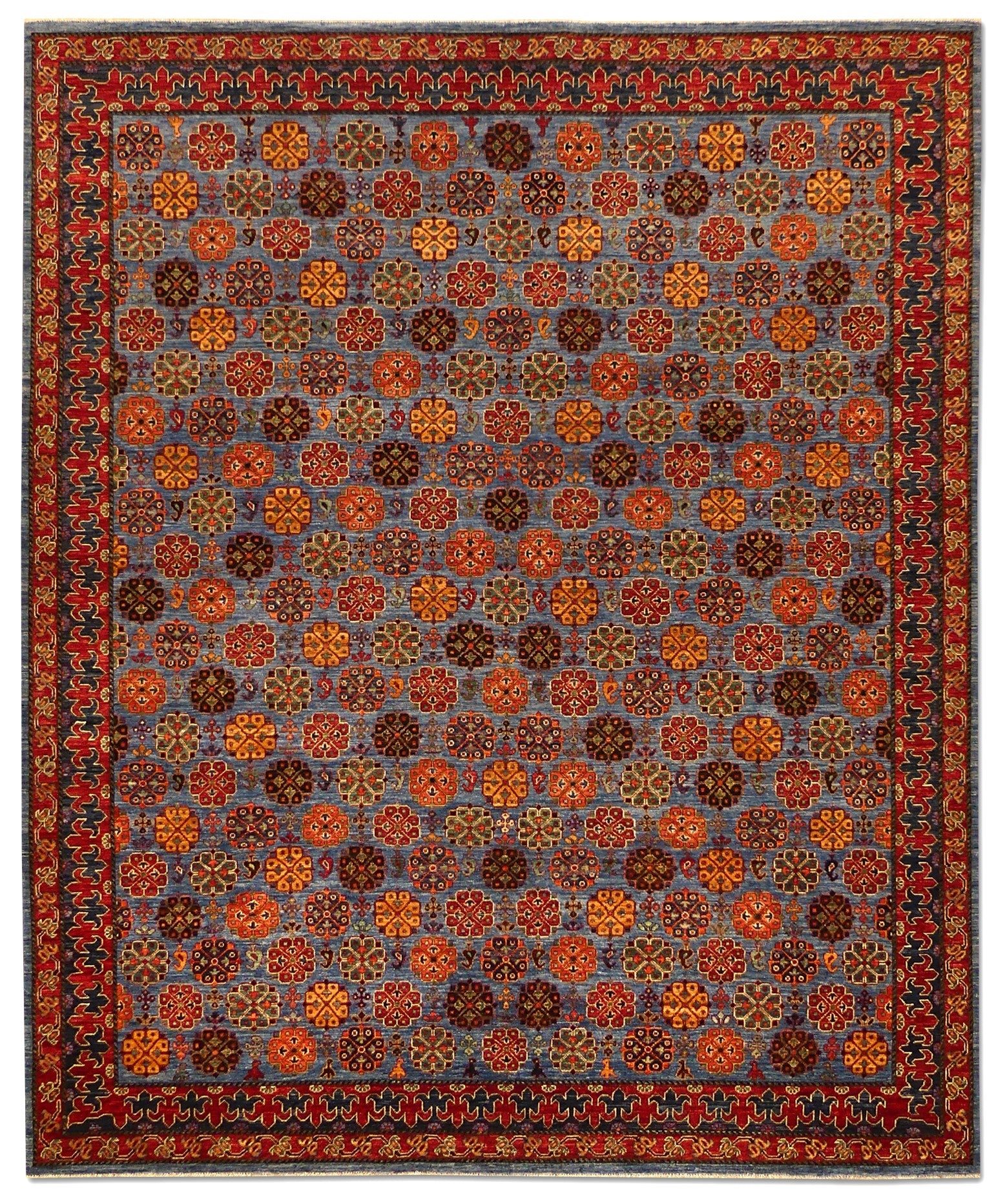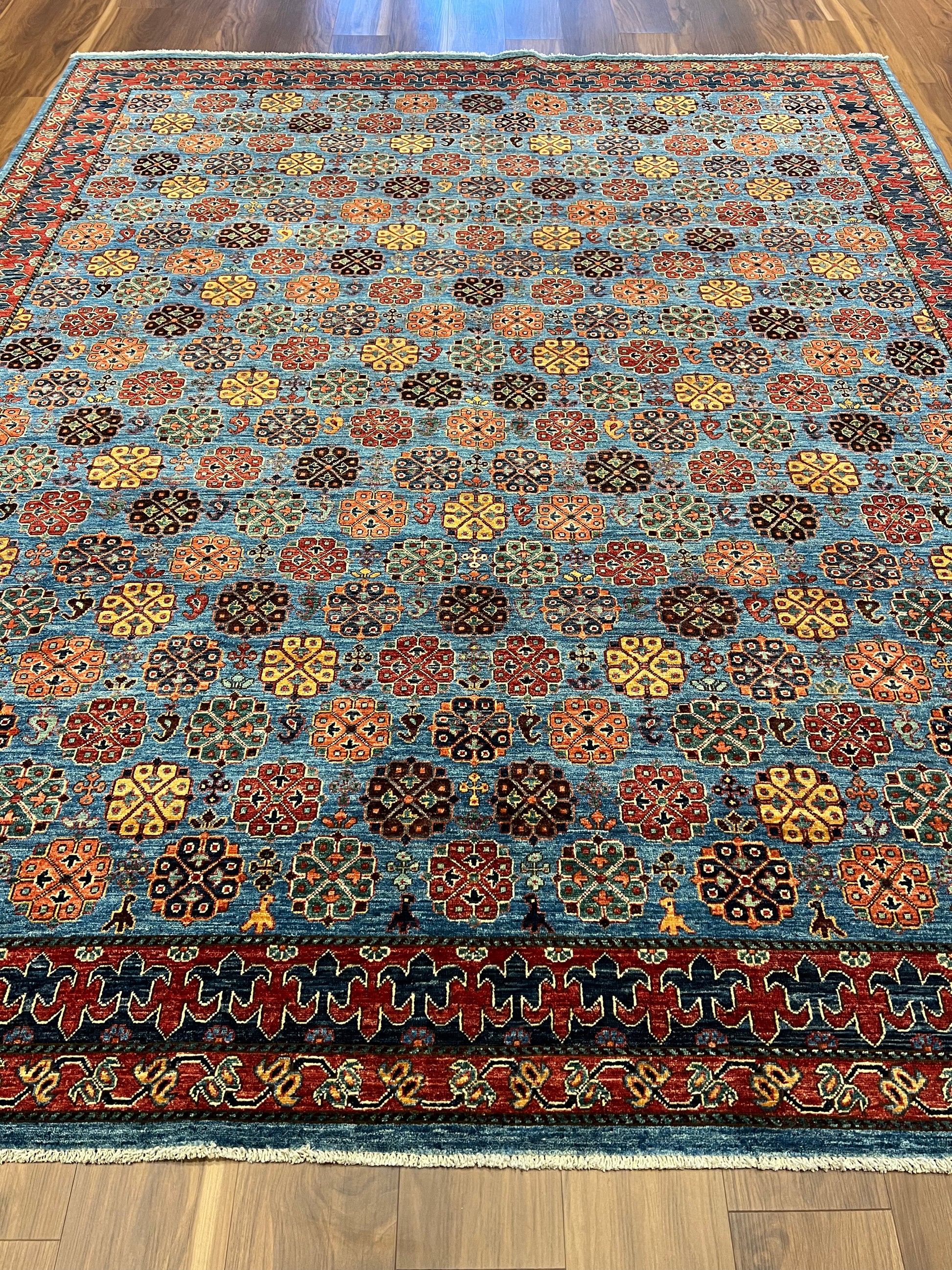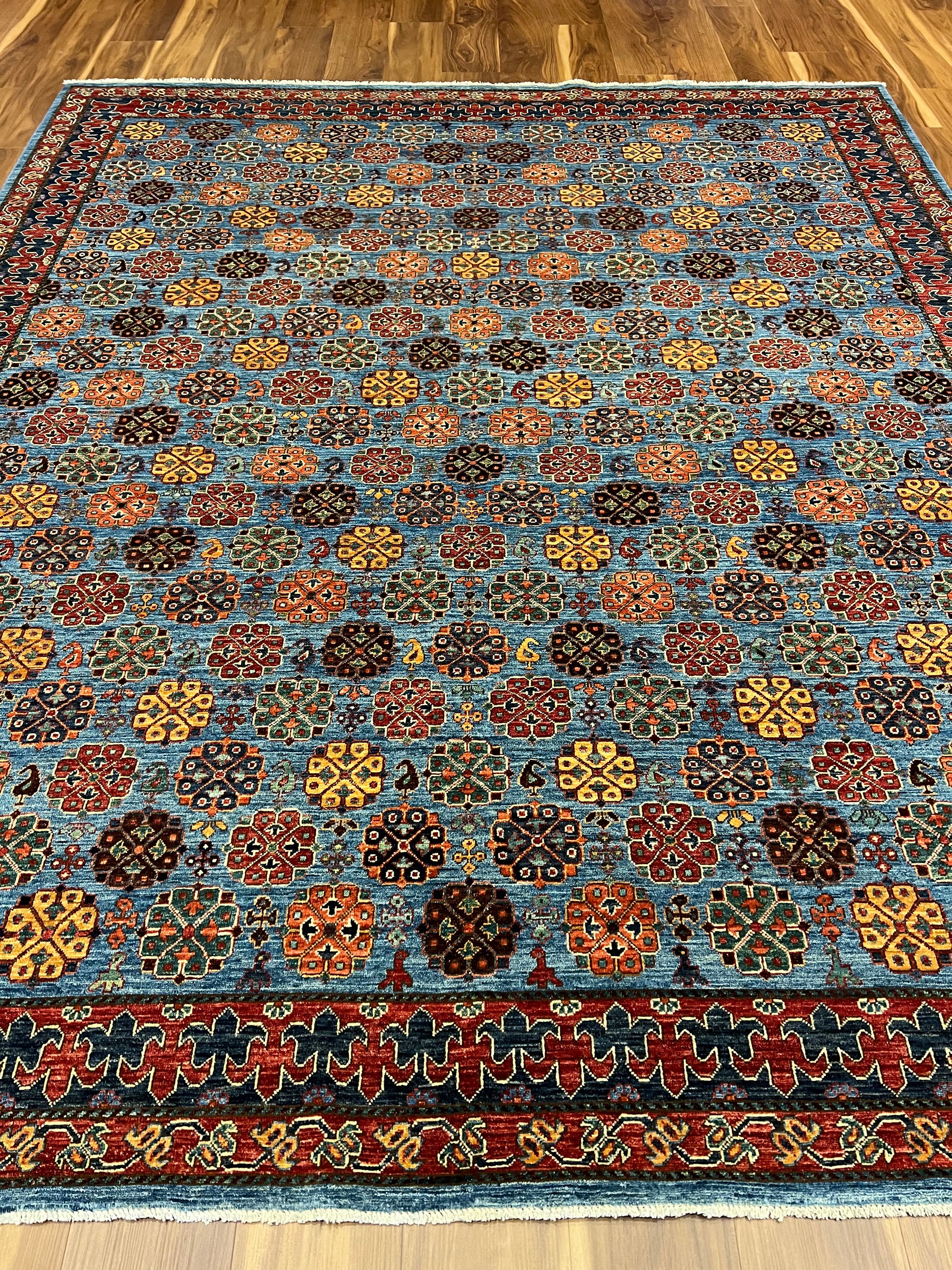 The Fine Nomadic Wool Rug showcases the timeless beauty of traditional nomadic craftsmanship. The intricate geometric patterns, composed of octagonal motifs and complimented by stylized floral designs, are expertly woven in navy blue, rust, burnt orange, and beige, creating a tapestry of rich, warm colors. This piece is a testament to the enduring artistry of nomadic weavers and would be a sophisticated and cozy addition to any living space.