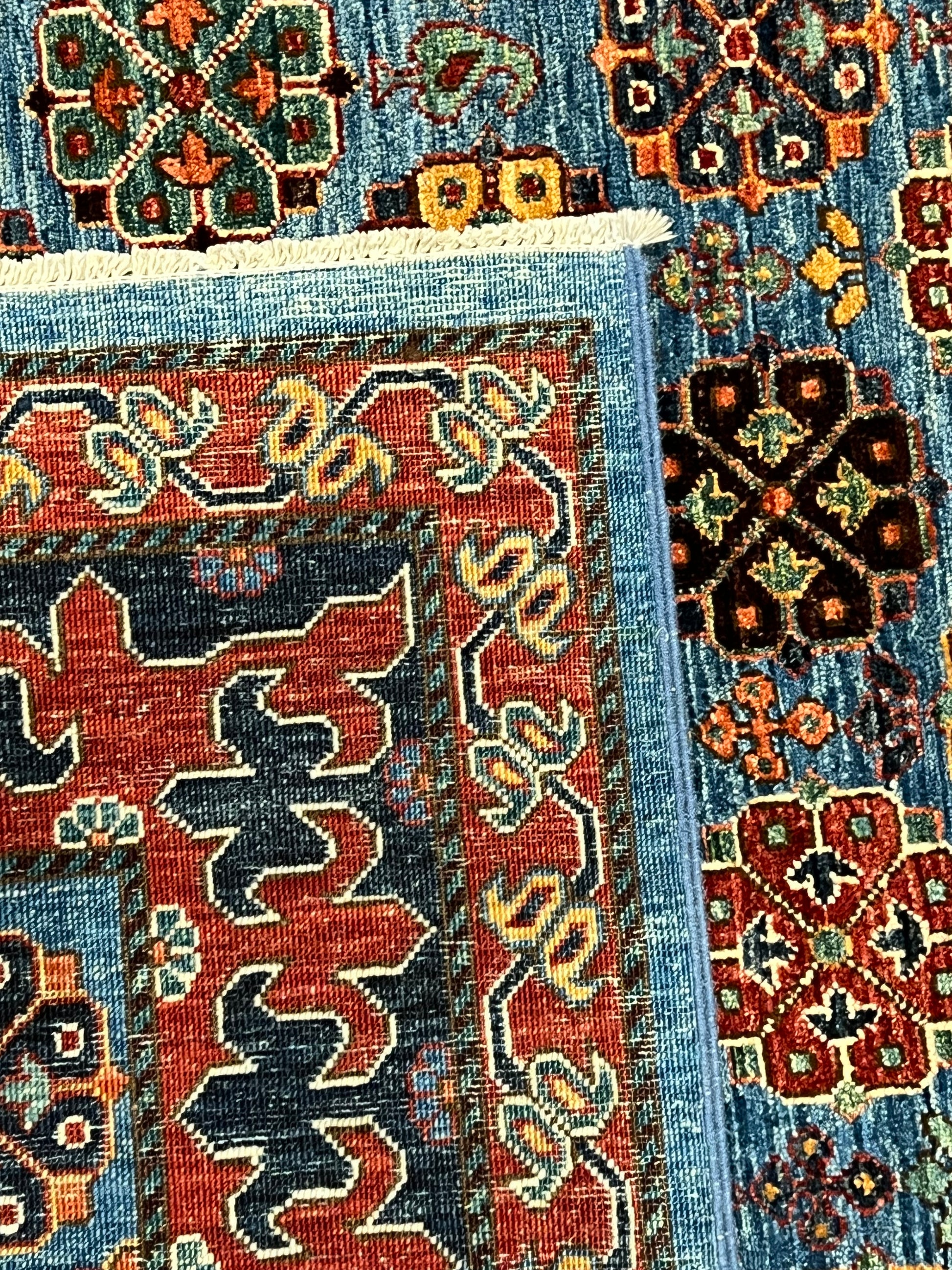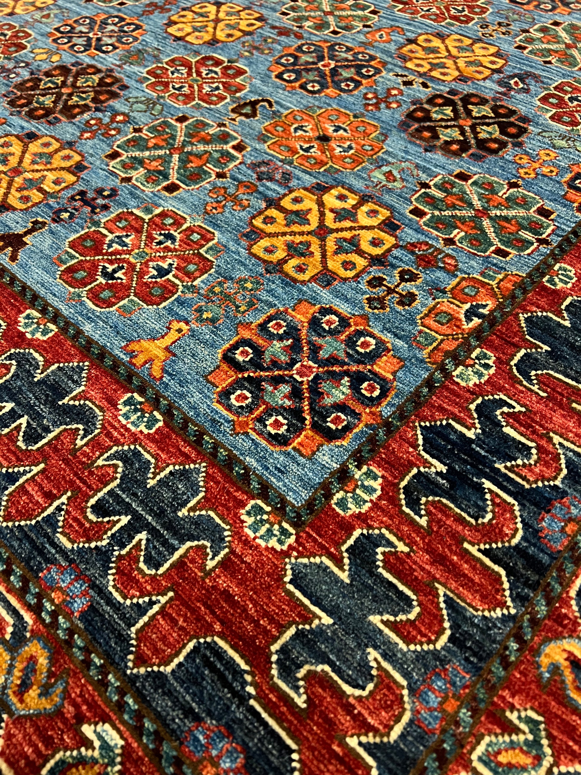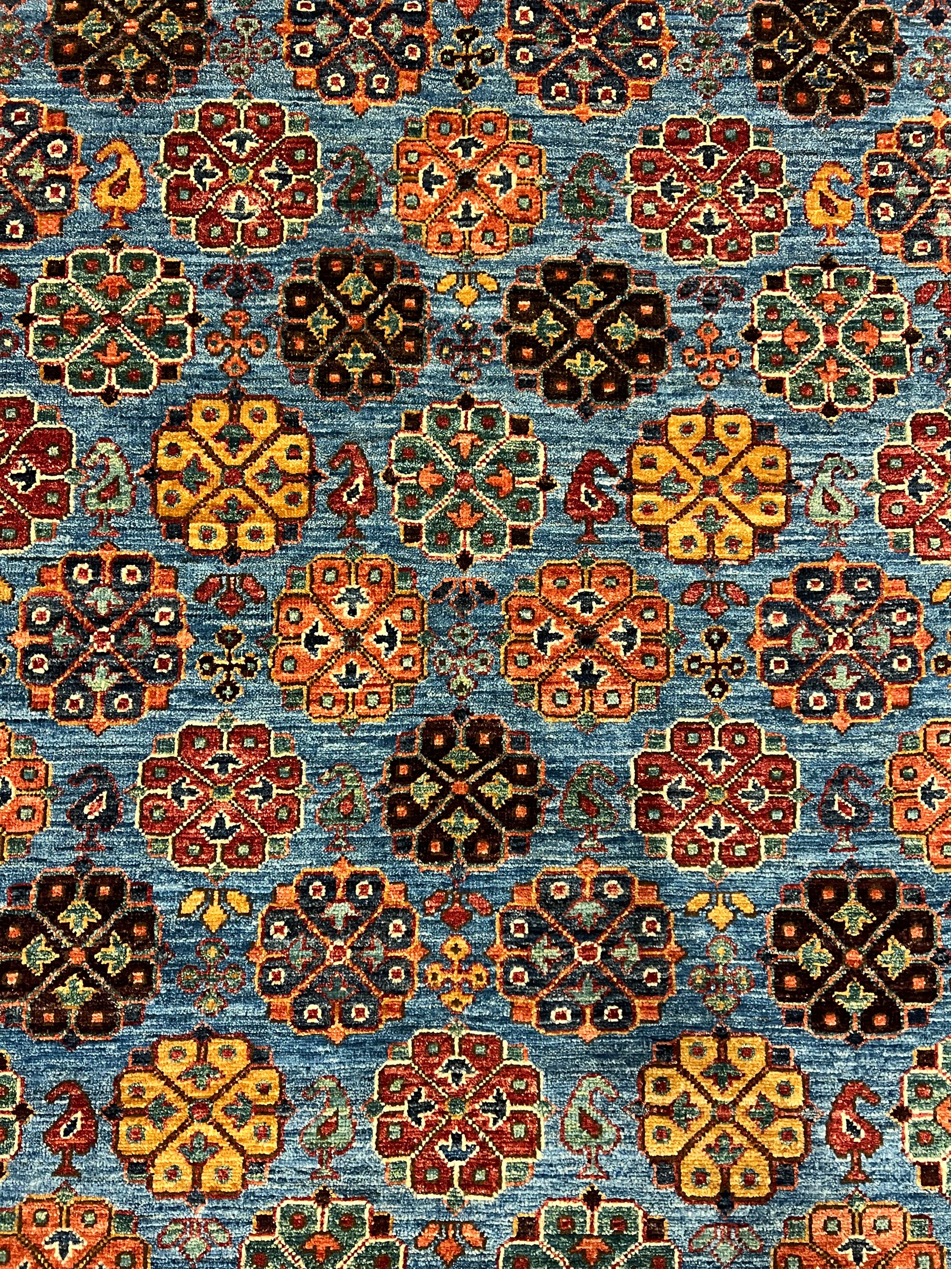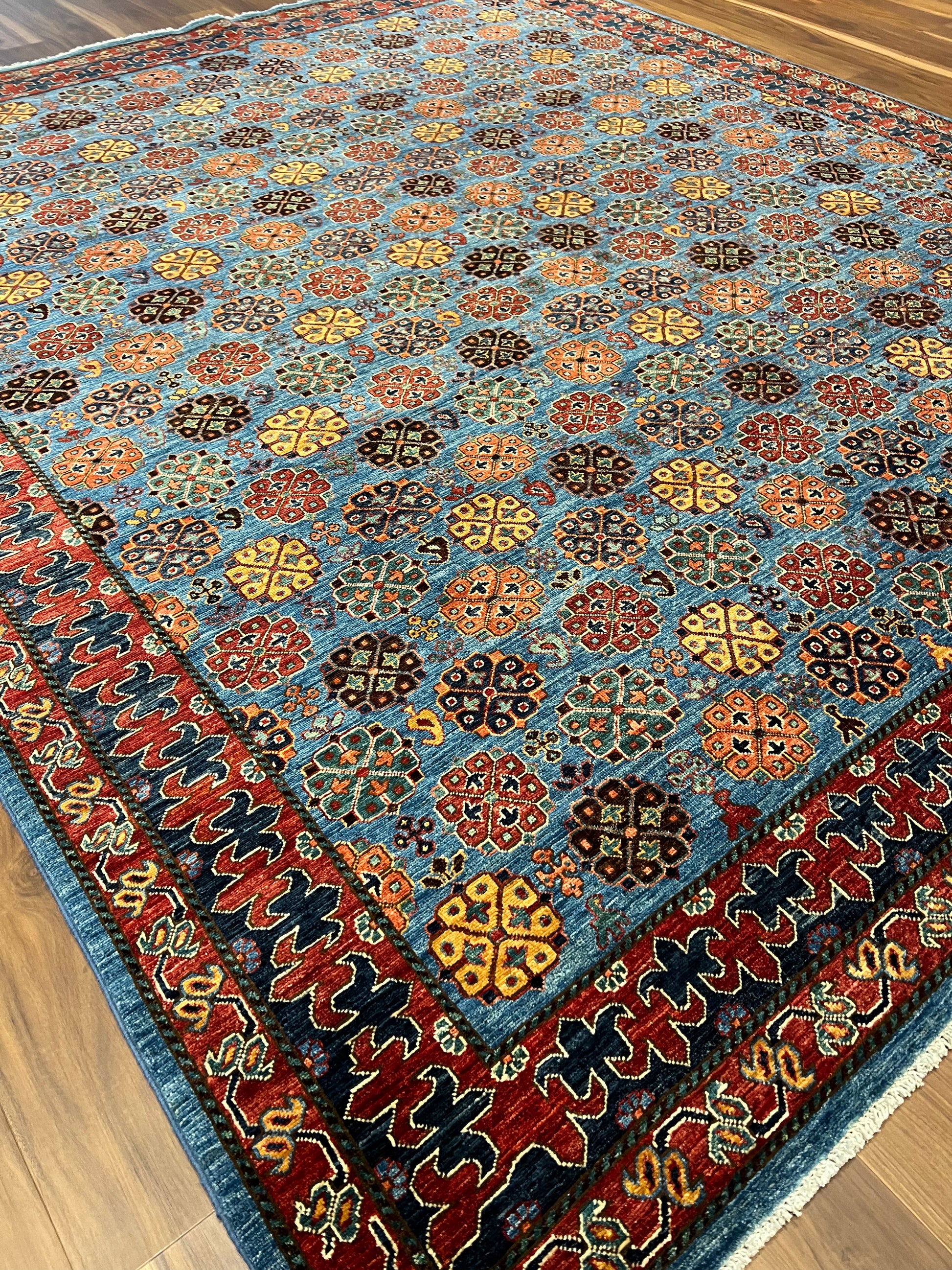 The Fine Nomadic Wool Rug showcases the timeless beauty of traditional nomadic craftsmanship. The intricate geometric patterns, composed of octagonal motifs and complimented by stylized floral designs, are expertly woven in navy blue, rust, burnt orange, and beige, creating a tapestry of rich, warm colors. This piece is a testament to the enduring artistry of nomadic weavers and would be a sophisticated and cozy addition to any living space.