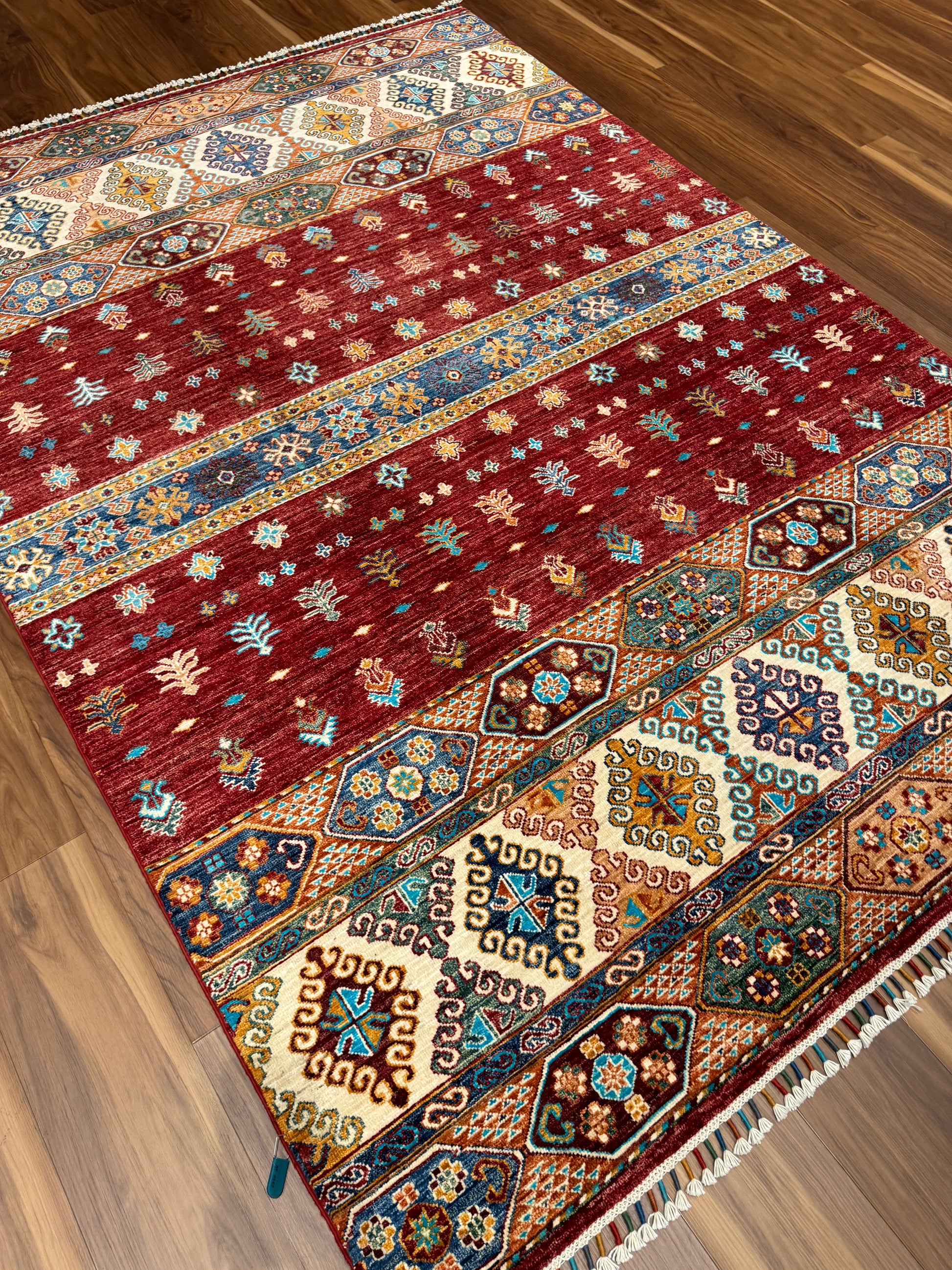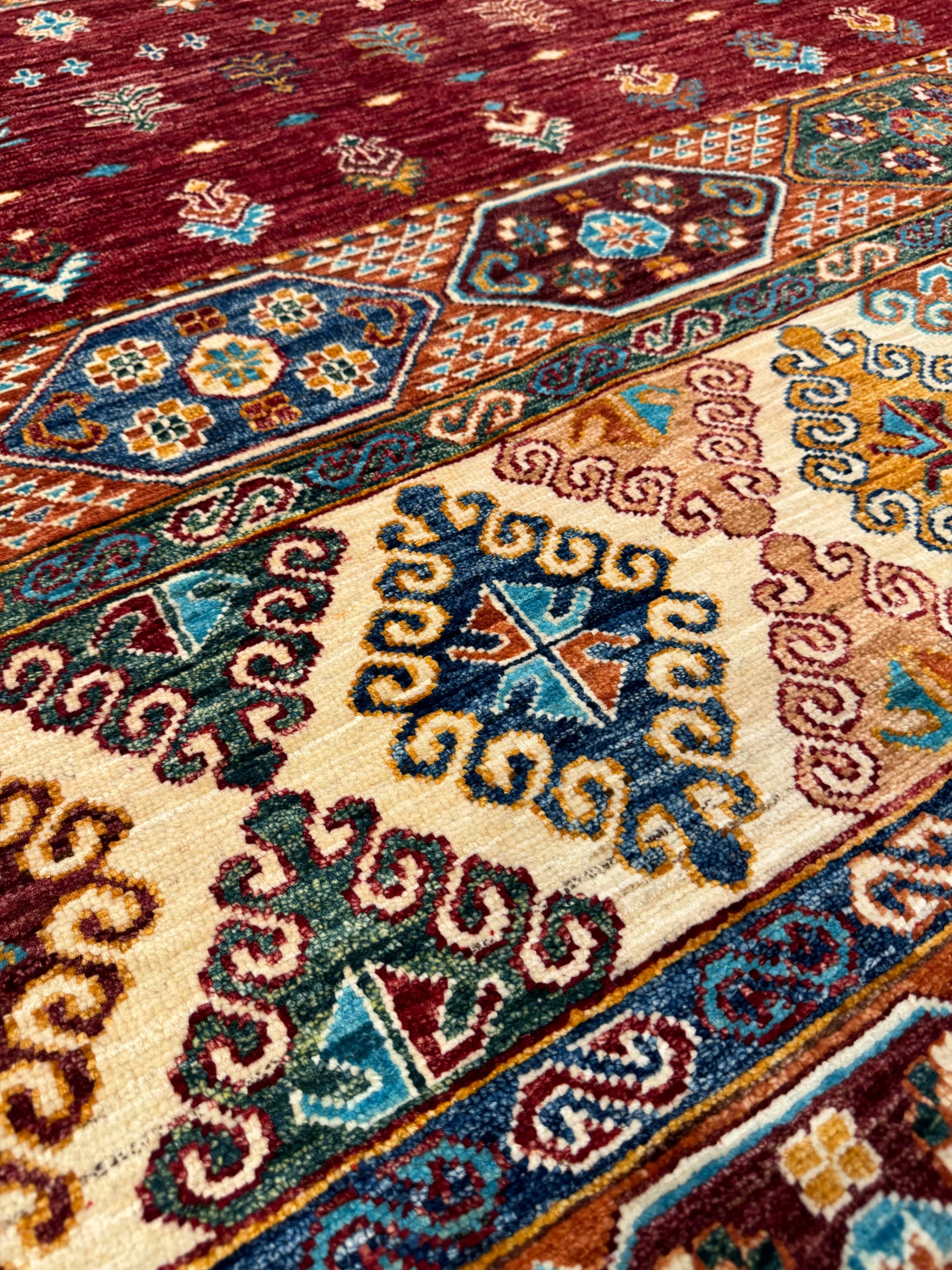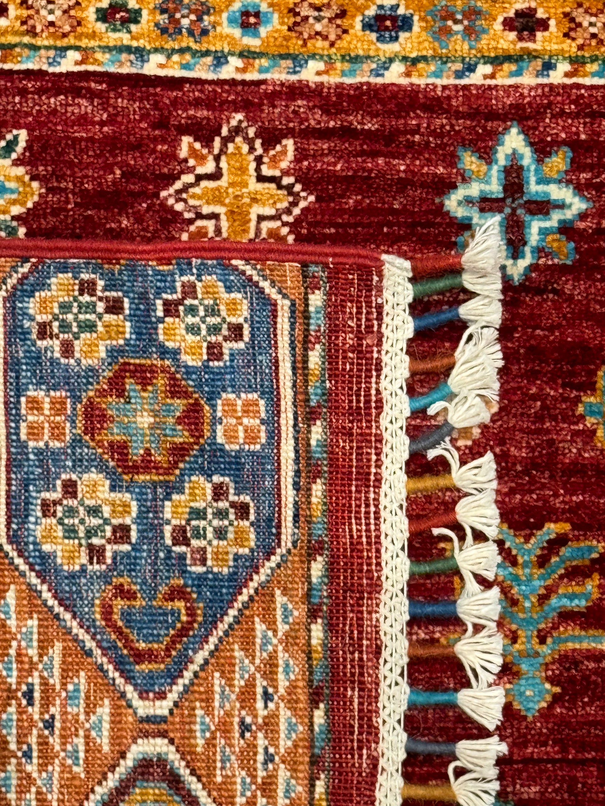 This exquisite Fine Sal rug boasts a traditional design that evokes the rich tapestry of ancient craftsmanship. The red base is adorned with intricate geometric and botanical motifs in contrasting shades of blue, beige, and gold, exuding a sense of timeless elegance. Expertly woven from high-quality wool, this piece is both durable and soft to the touch, making it a functional yet sophisticated addition to any space.