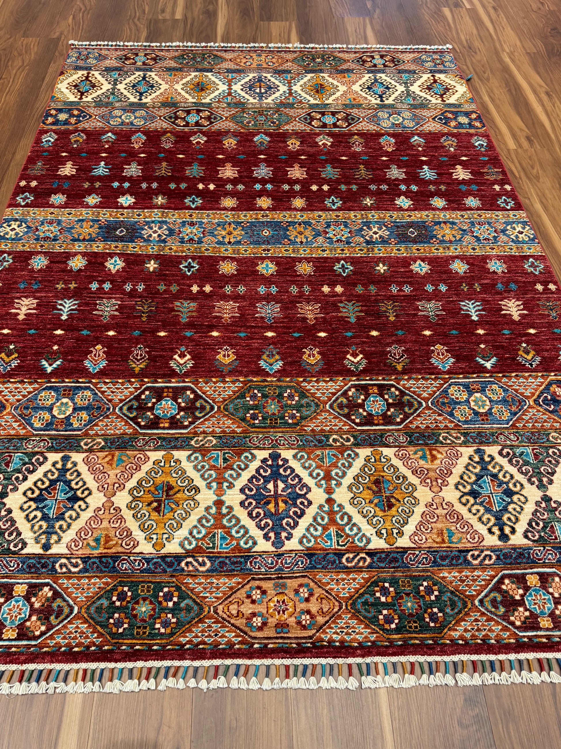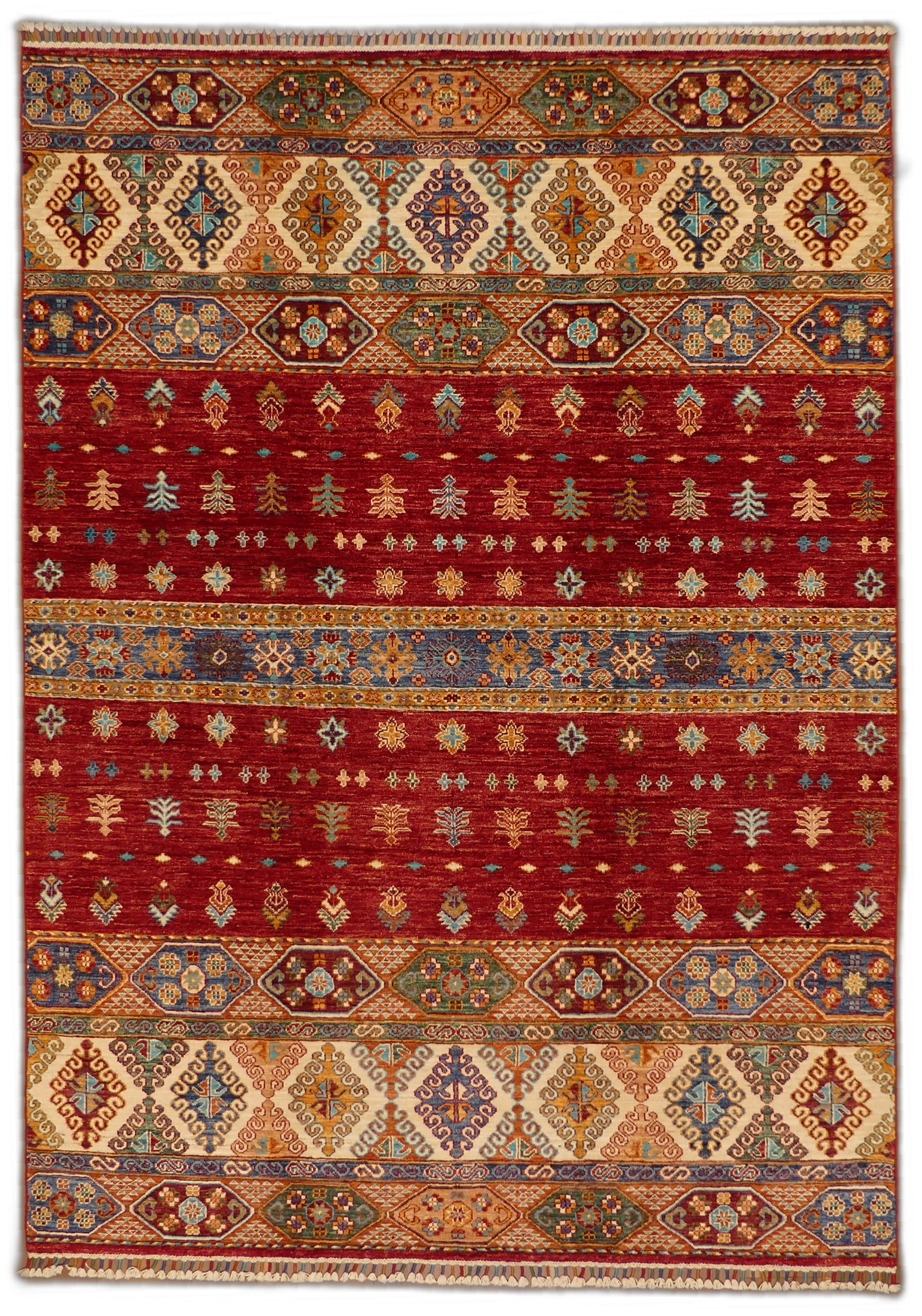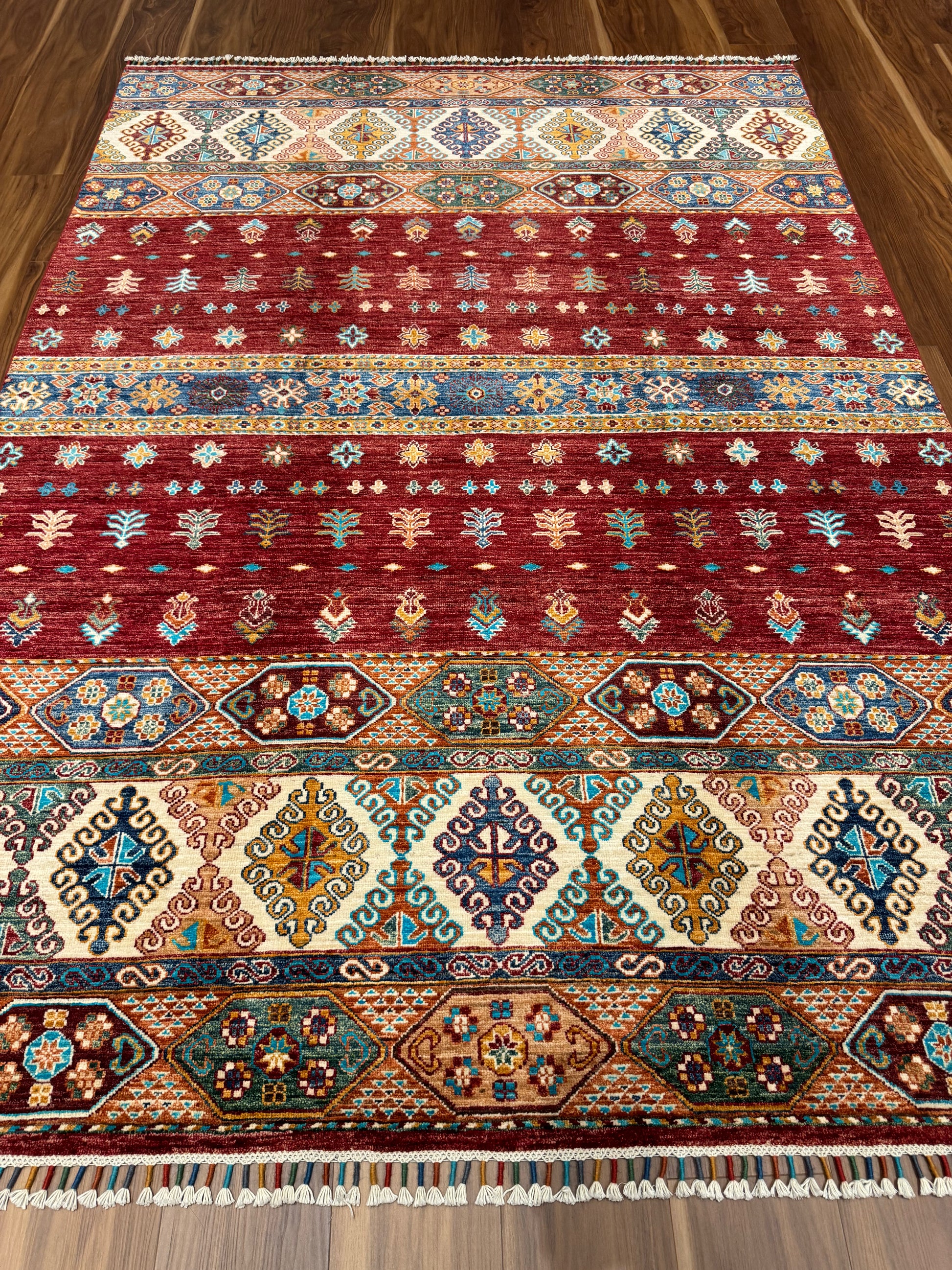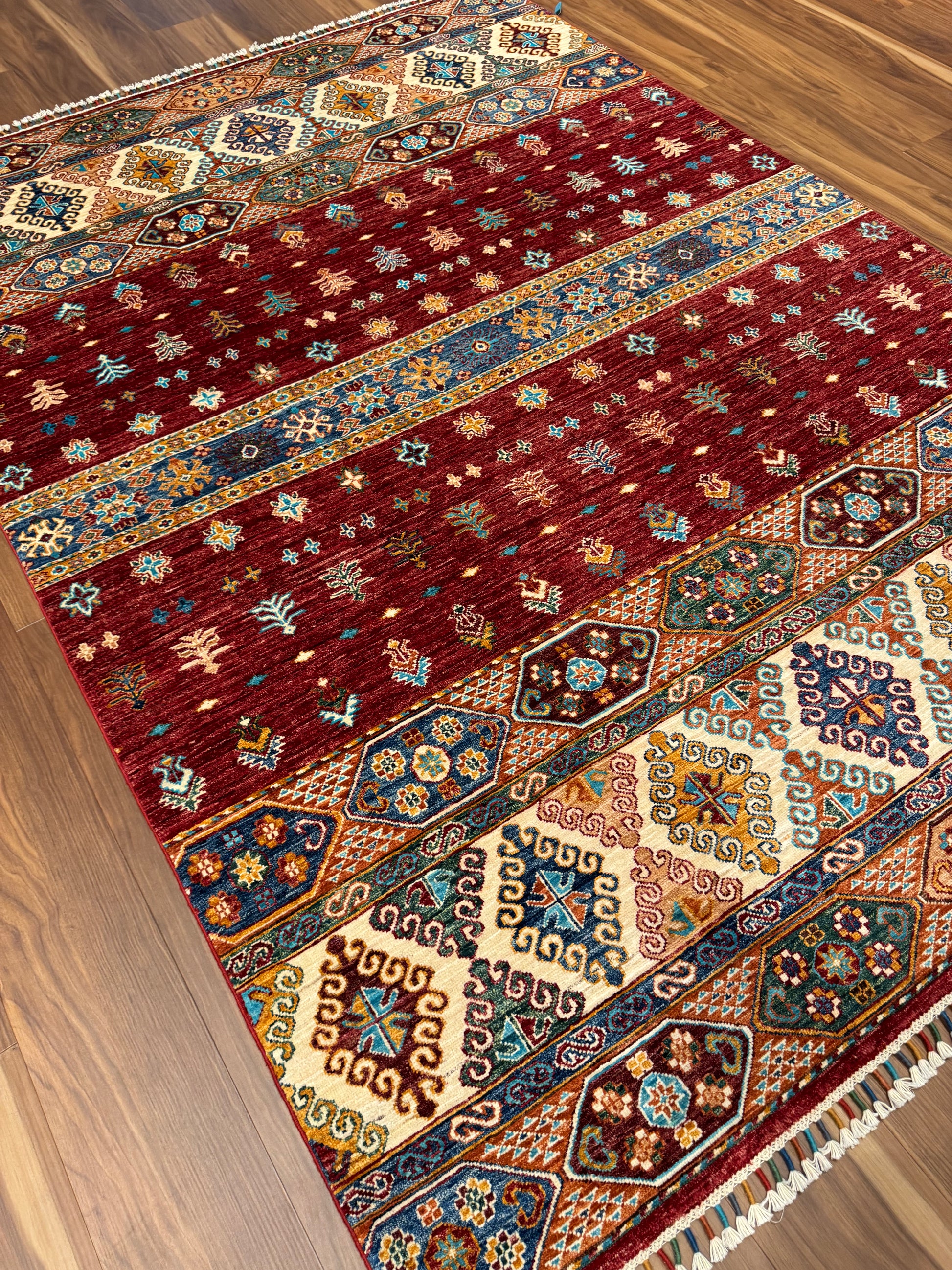 This exquisite Fine Sal rug boasts a traditional design that evokes the rich tapestry of ancient craftsmanship. The red base is adorned with intricate geometric and botanical motifs in contrasting shades of blue, beige, and gold, exuding a sense of timeless elegance. Expertly woven from high-quality wool, this piece is both durable and soft to the touch, making it a functional yet sophisticated addition to any space.