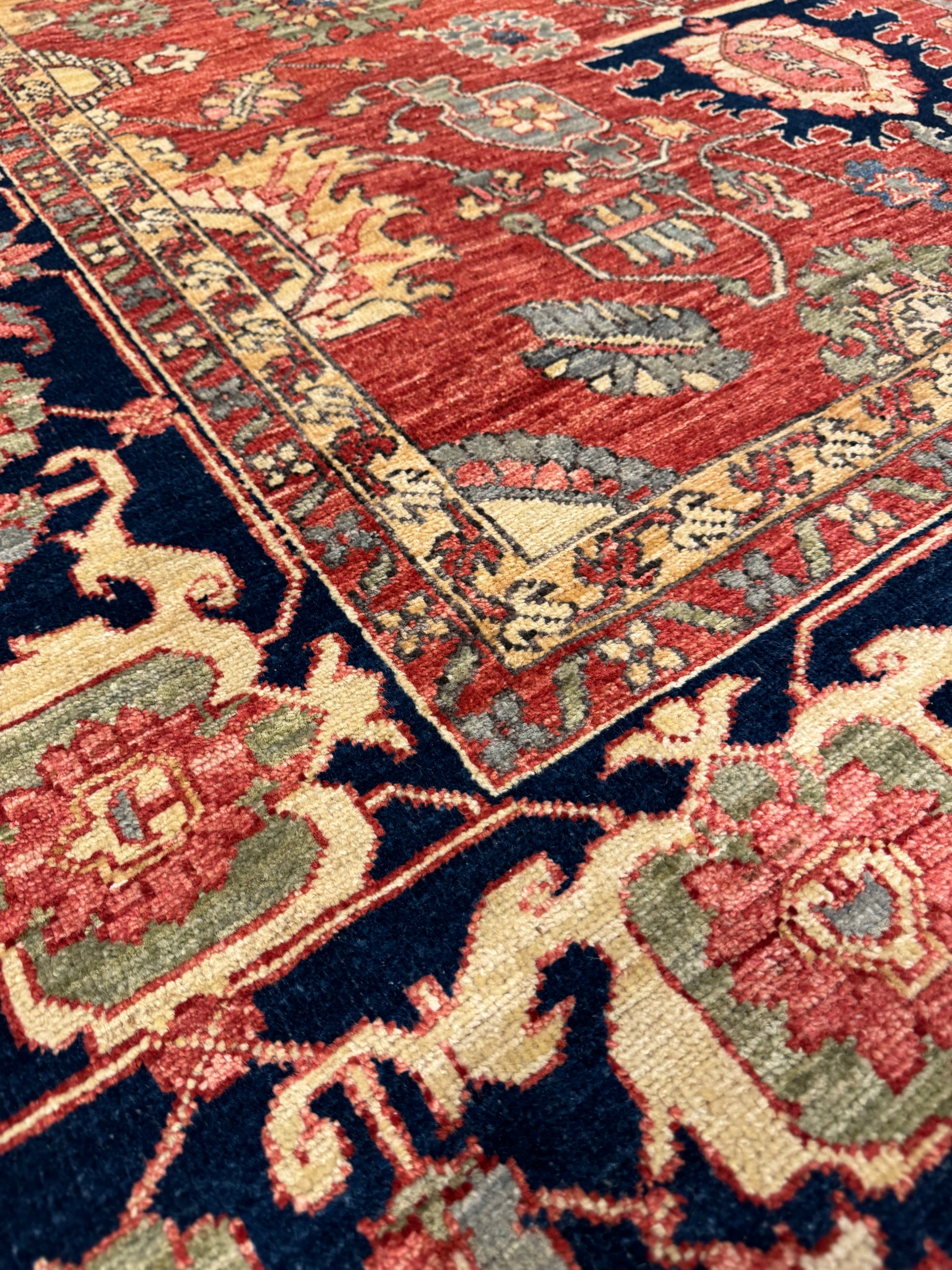 This Fine Serapi/Heriz rug flaunts an exquisite traditional design, rich in symmetrical patterns and a luxuriously dense weave. Hand-knotted from pure wool, it features classical motifs, embodying timeless elegance. Its plush texture and durable construction ensure long-lasting beauty, ideal for both modern and classic interiors. With a strikingly bold color palette, it commands attention and adds warmth to any room. The care in craftsmanship speaks of ancient rug-making traditions, creating a piece that's just as much a work of art as it is a practical home accessory.