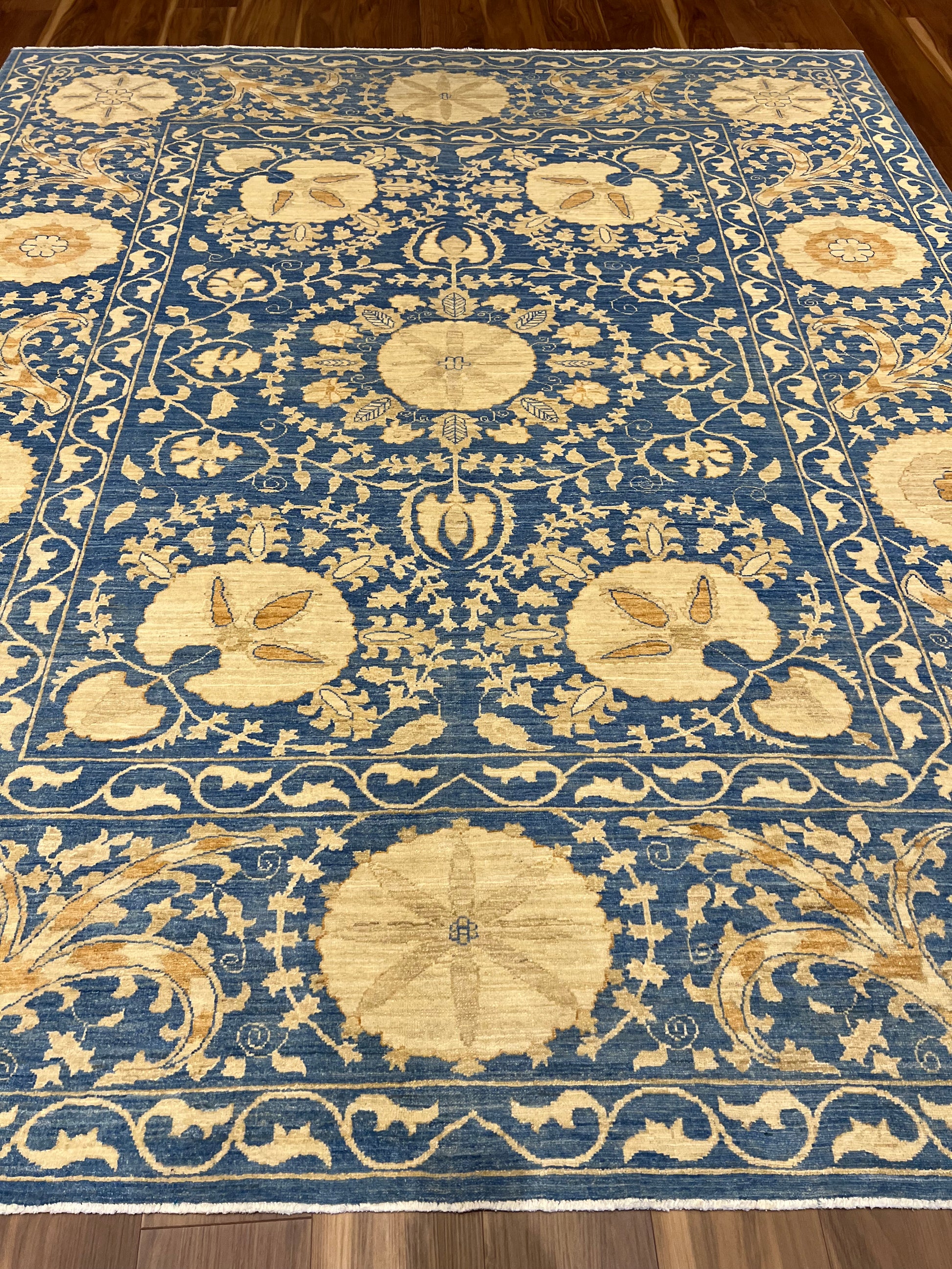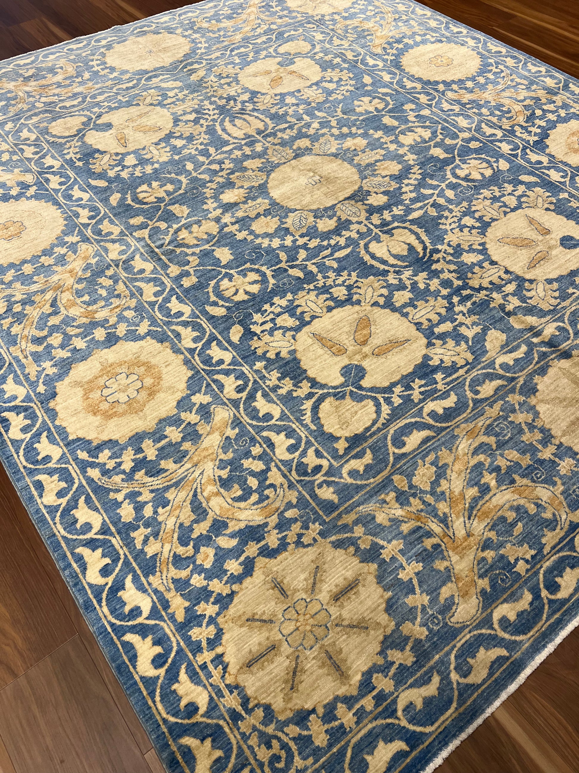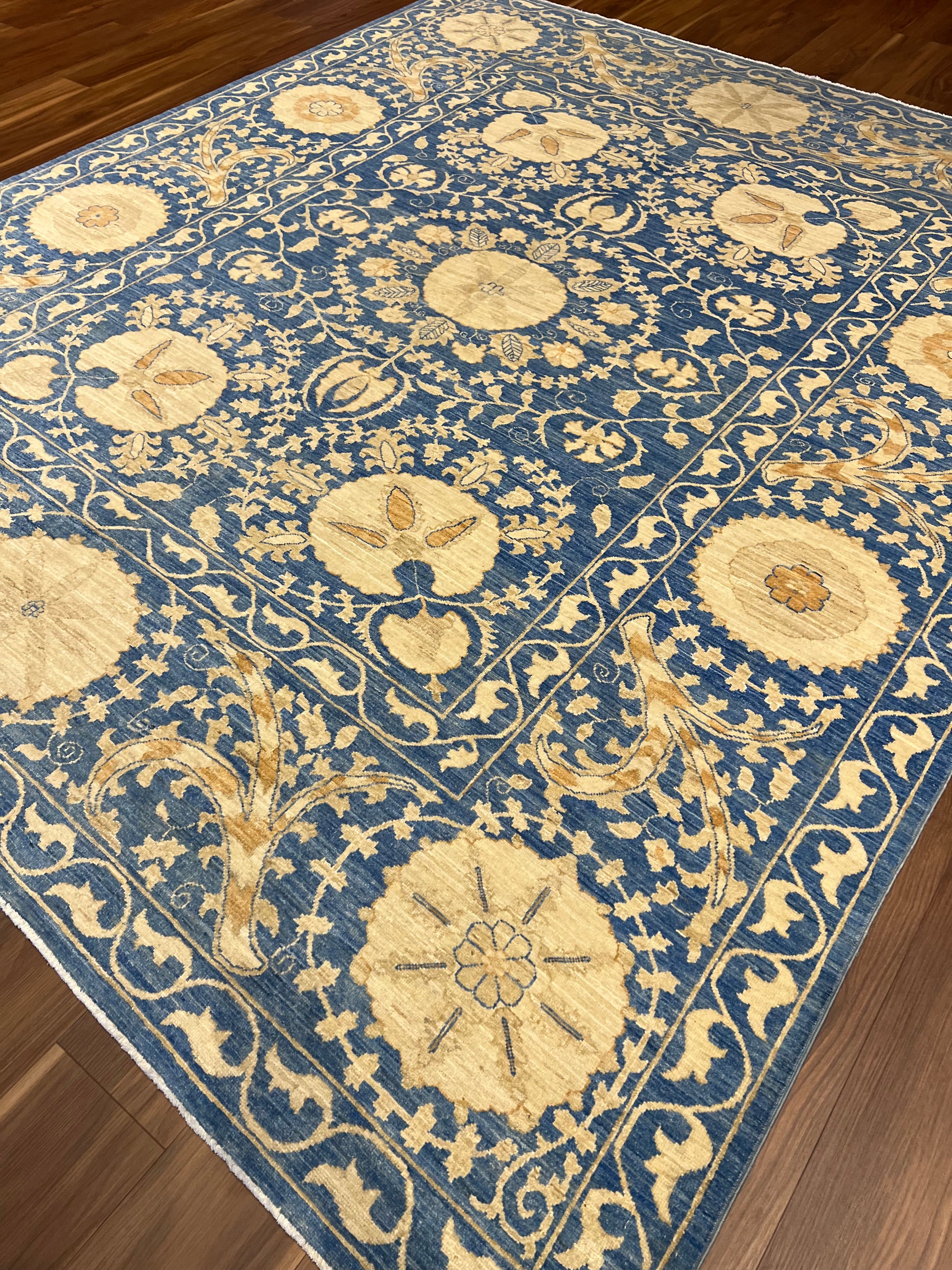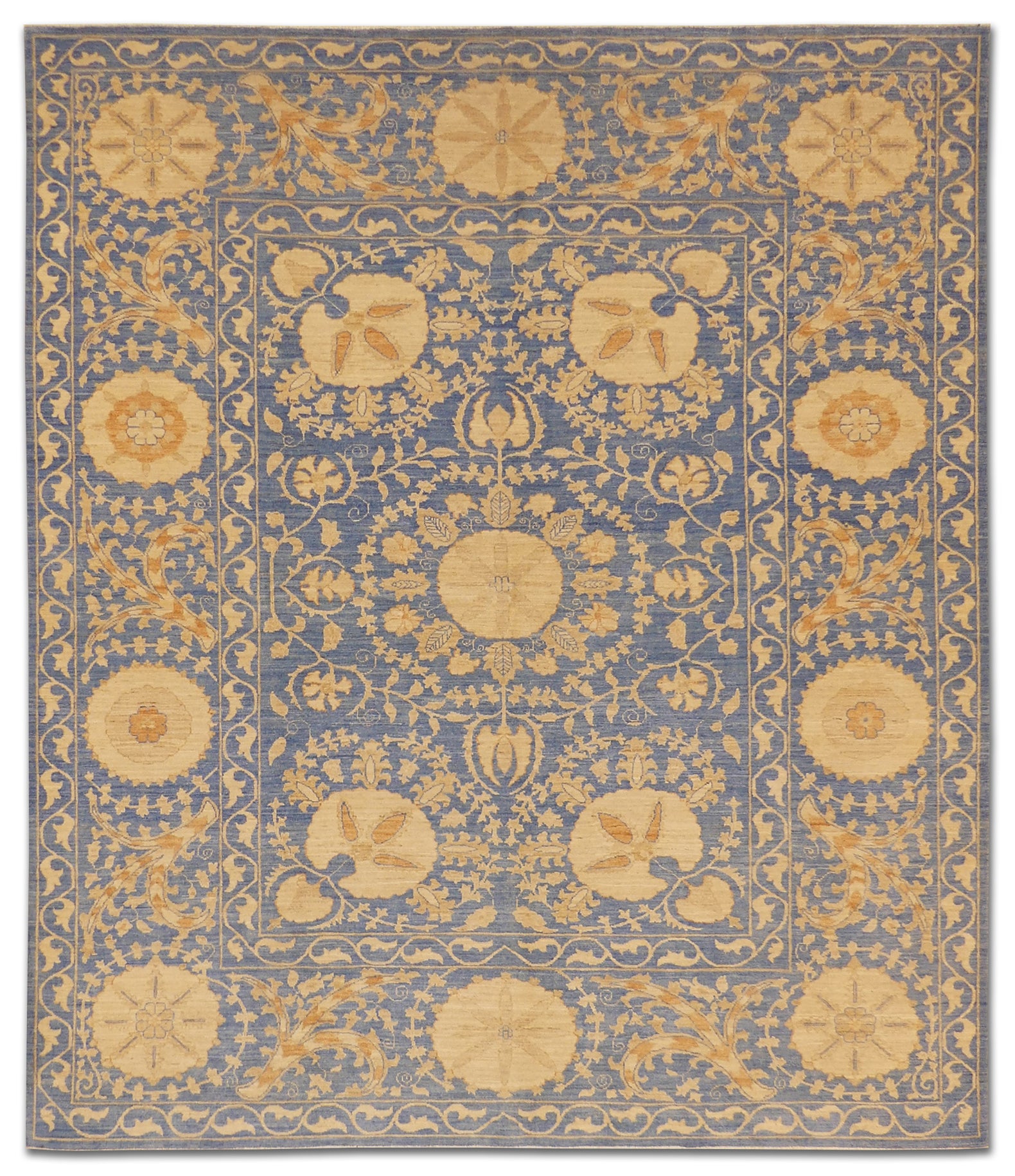 The Fine Suzanni rug features an exquisite design inspired by traditional Suzani textiles. Its intricate pattern combines floral motifs with geometric shapes, rendered in a harmonious palette of blue, beige, and gold. The artistry is evident in the fine detailing, especially the elegant border that frames the central composition. Handcrafted from the highest quality wool, this piece offers both durability and comfort, making it an ideal choice for adding a touch of luxury and cultural heritage to any interior space.