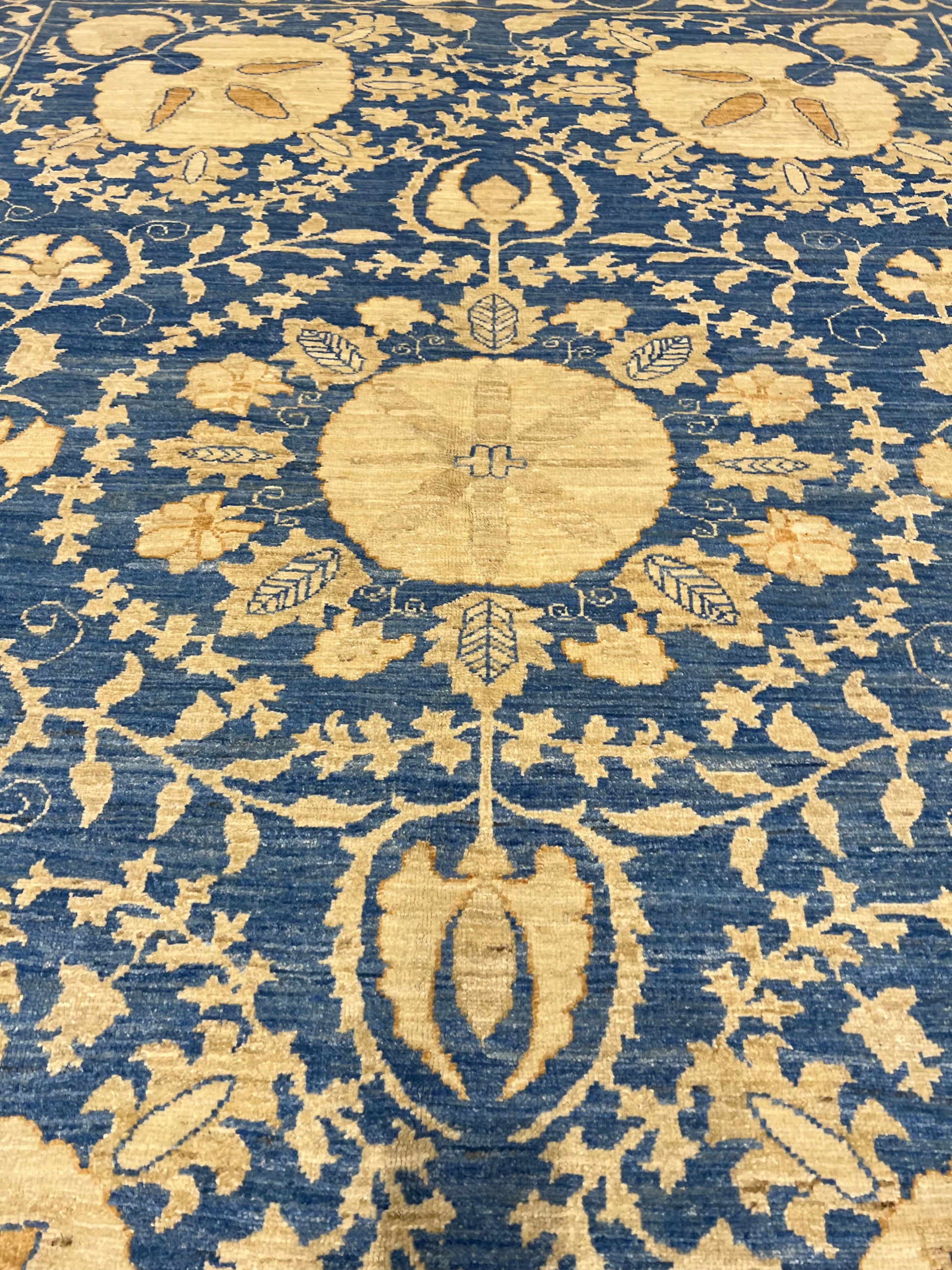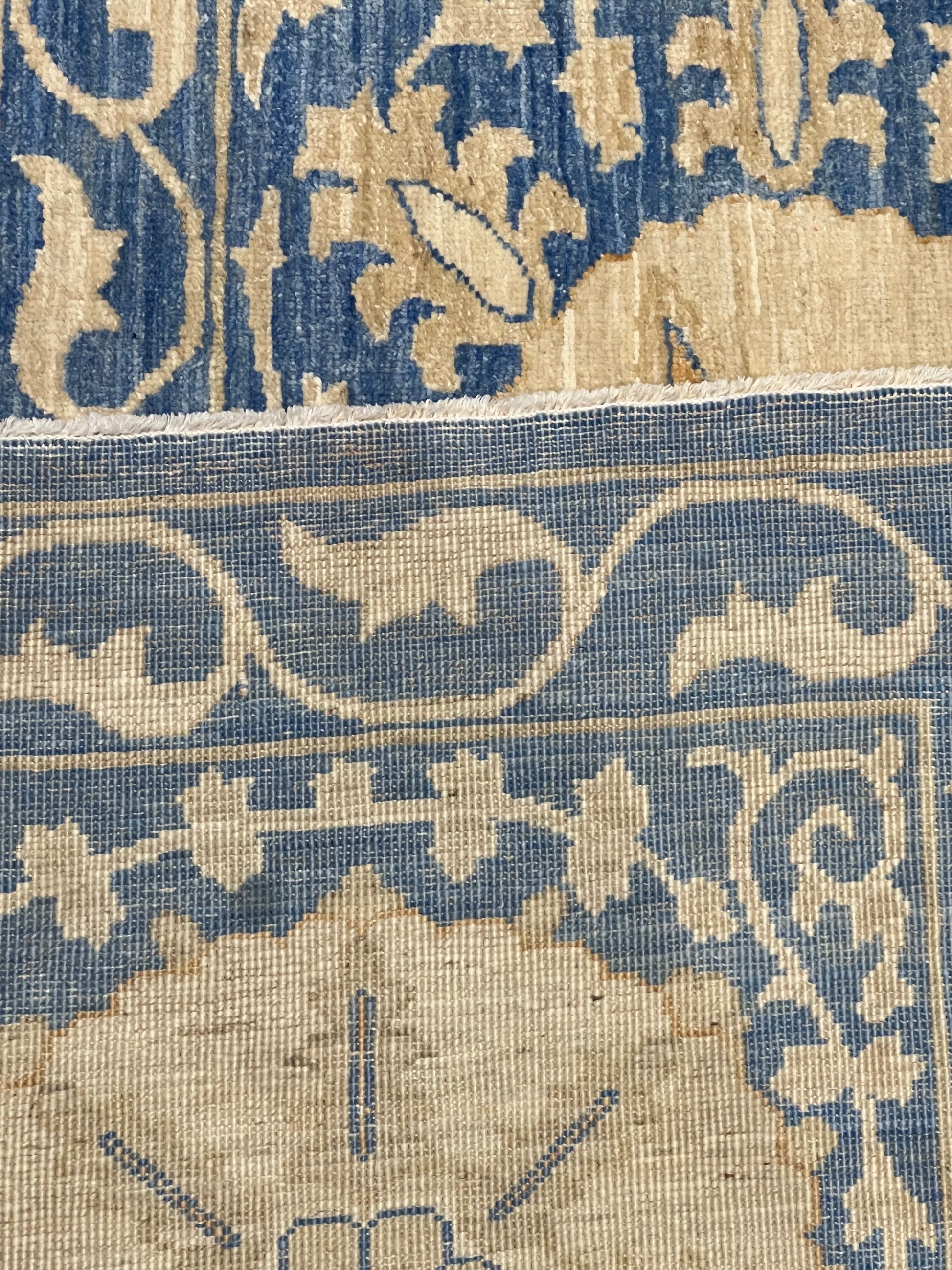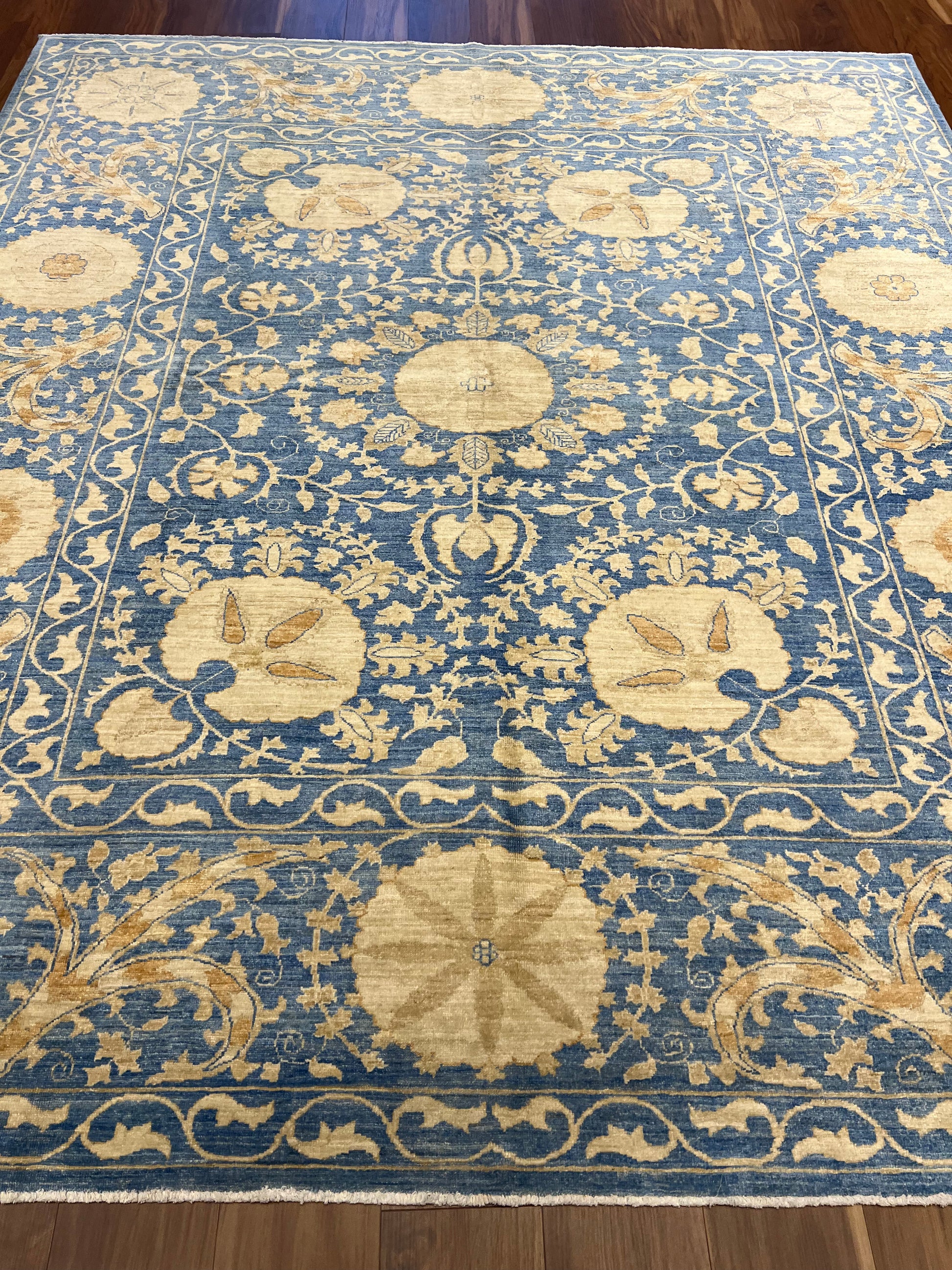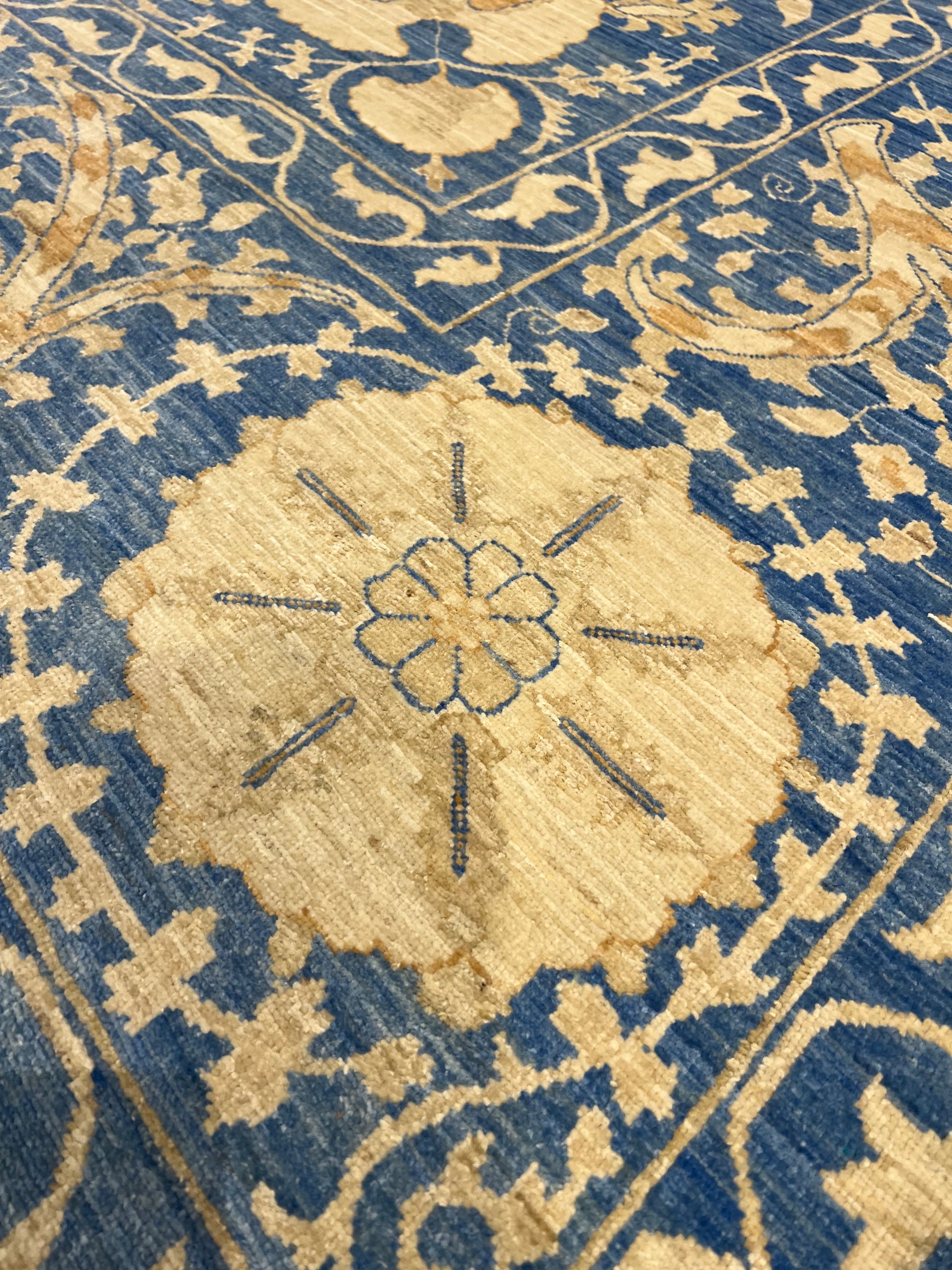 The Fine Suzanni rug features an exquisite design inspired by traditional Suzani textiles. Its intricate pattern combines floral motifs with geometric shapes, rendered in a harmonious palette of blue, beige, and gold. The artistry is evident in the fine detailing, especially the elegant border that frames the central composition. Handcrafted from the highest quality wool, this piece offers both durability and comfort, making it an ideal choice for adding a touch of luxury and cultural heritage to any interior space.