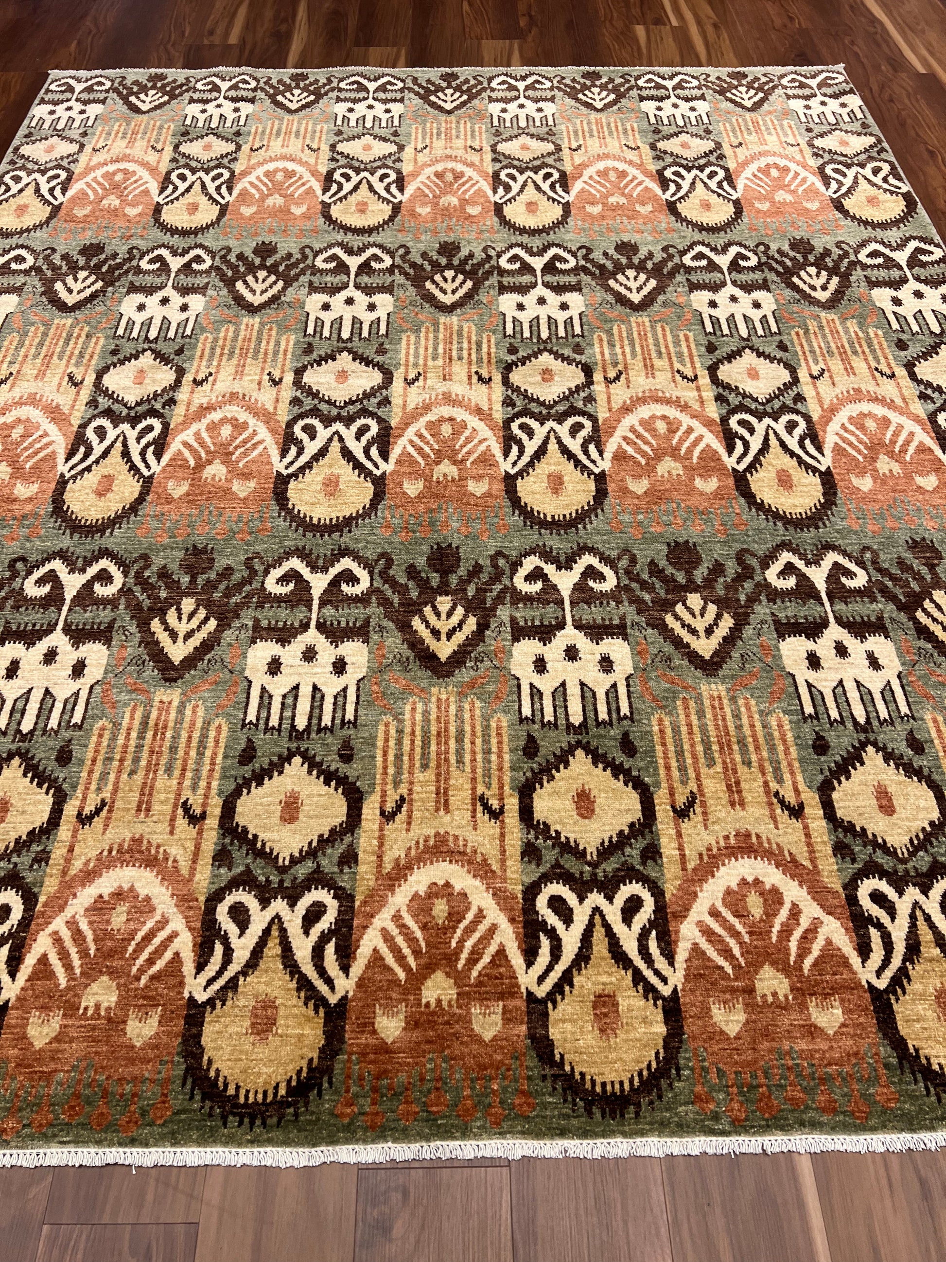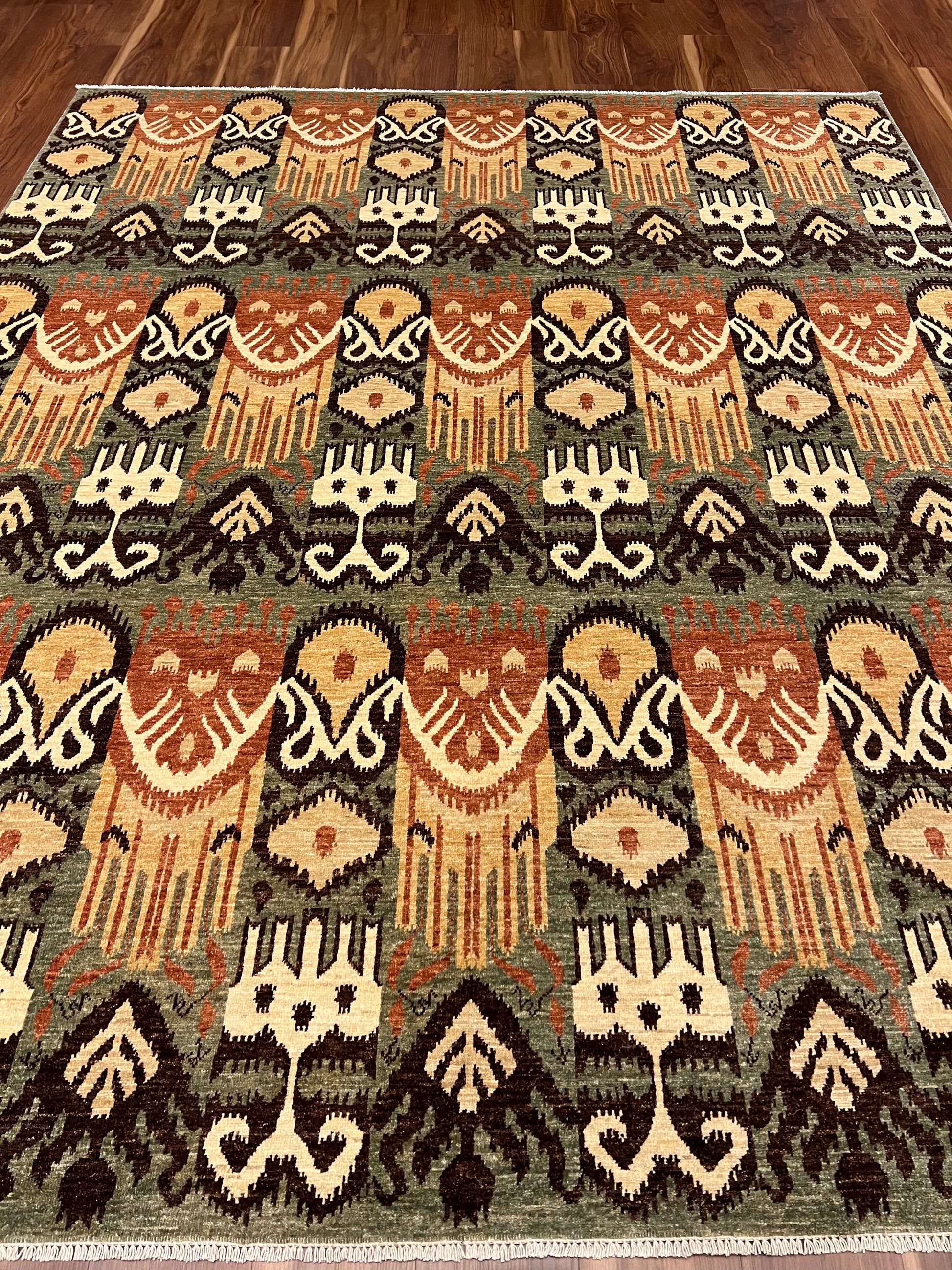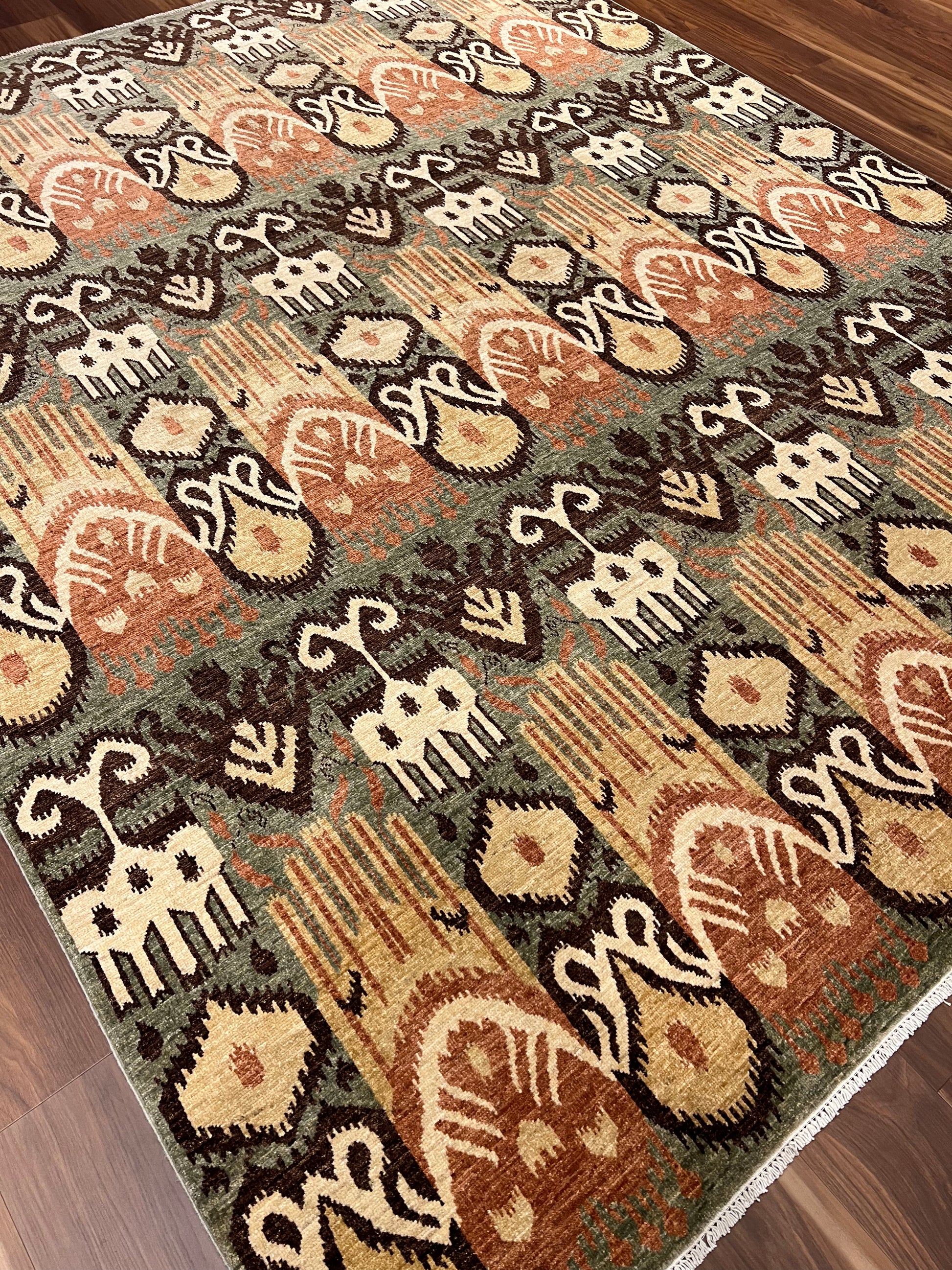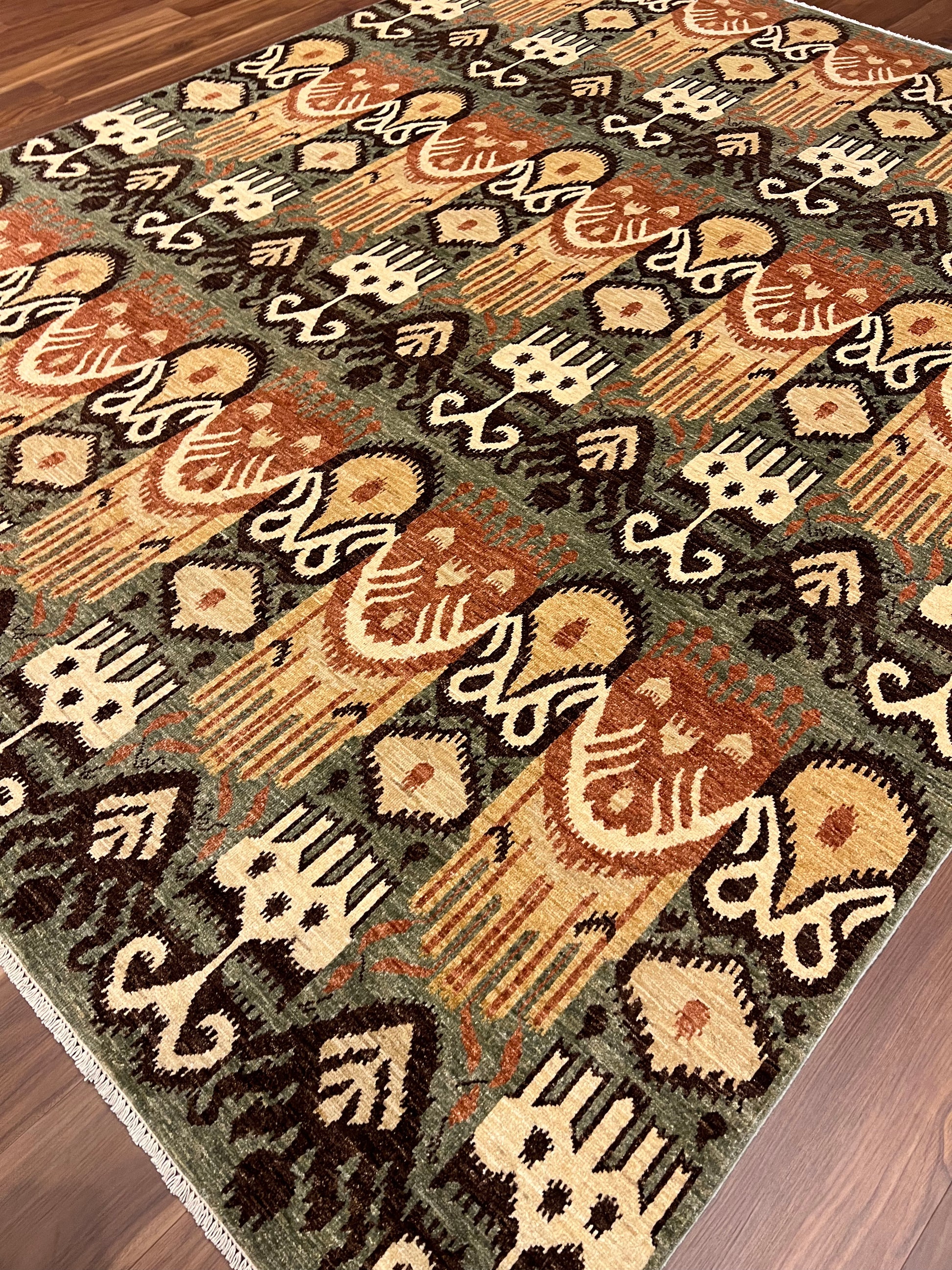 This exquisite rectangle-shaped Gabbeh rug presents a harmonious blend of burnt orange, beige, dark brown, and olive green, creating a warm and inviting ambiance. The carpet features a series of repeated tribal motifs, which evoke a sense of tradition and cultural heritage. Crafted from high-quality wool, the rug offers durability along with a soft and comfortable texture underfoot. Its robust construction ensures it can withstand high-traffic areas, making it a versatile addition to any space.