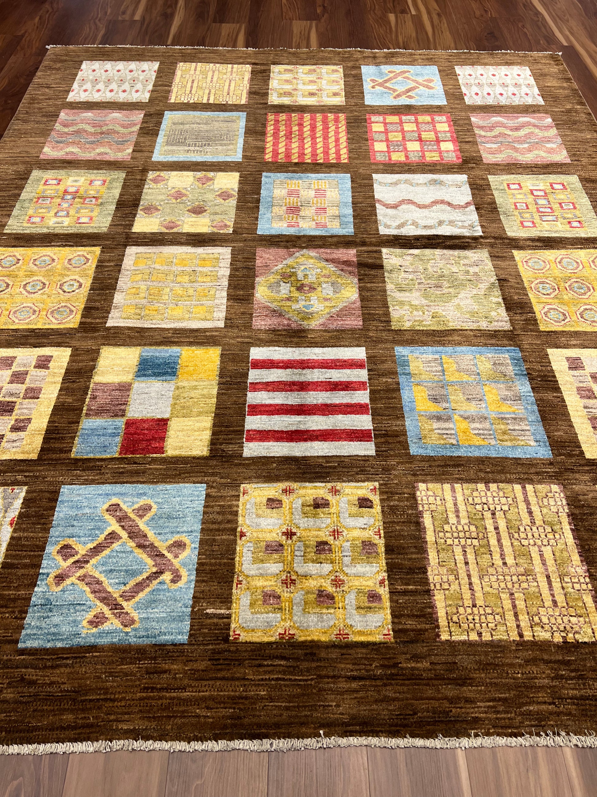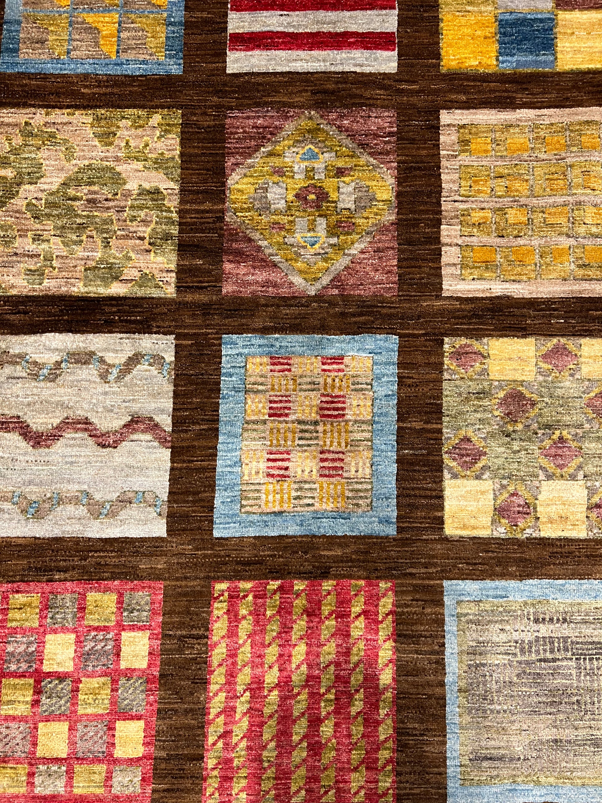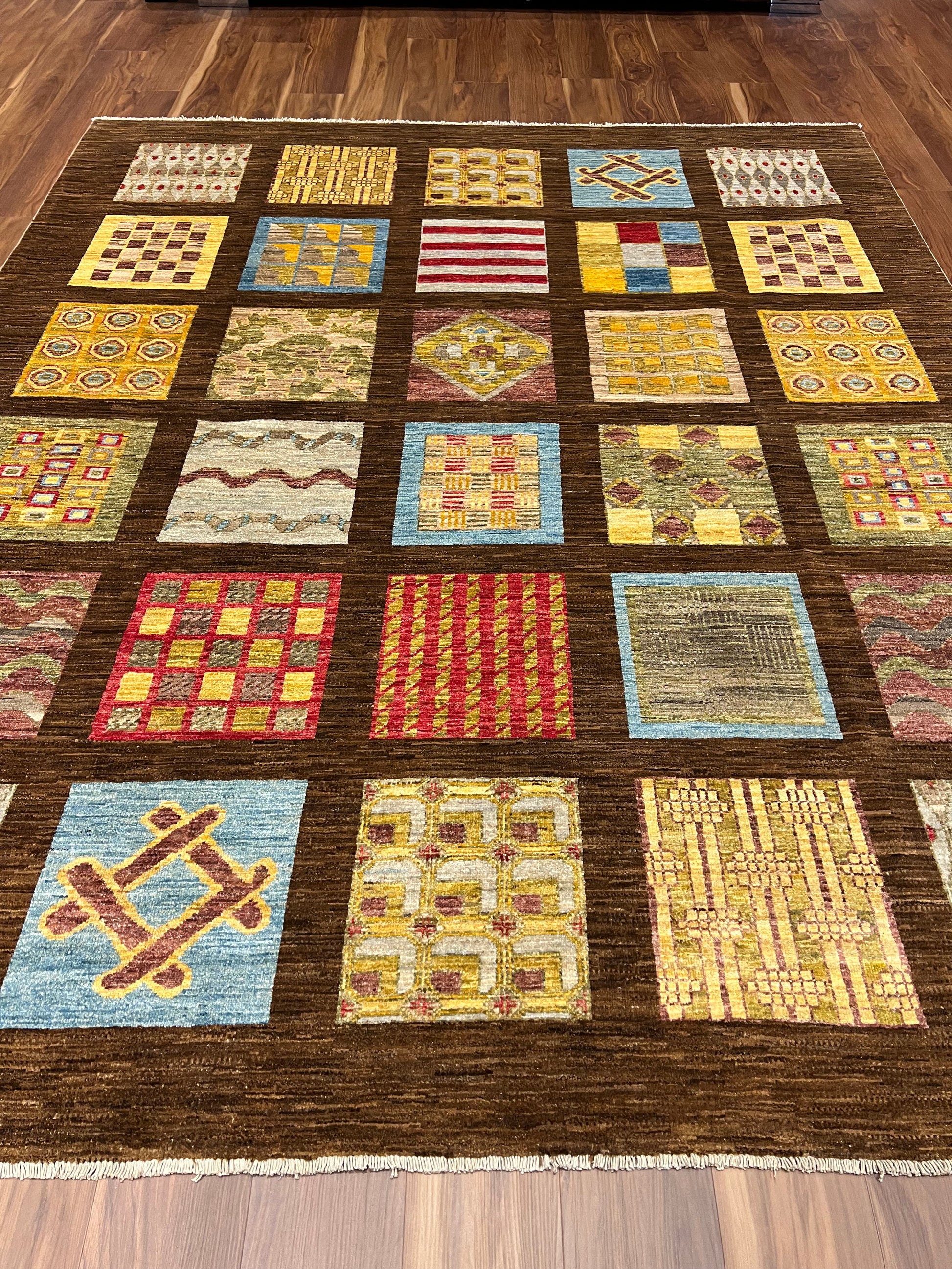This Gabbeh woollen rug is a lively tapestry of culture and history, featuring a patchwork of various geometric and abstract designs. Each square has unique patterns, reminiscent of traditional quilts, infusing warmth and storytelling into any room. The earthy tones and rustic charm of this piece create a timeless aesthetic that pairs well with both modern and classic decors. Handcrafted with care, it promises durability and comfort underfoot.