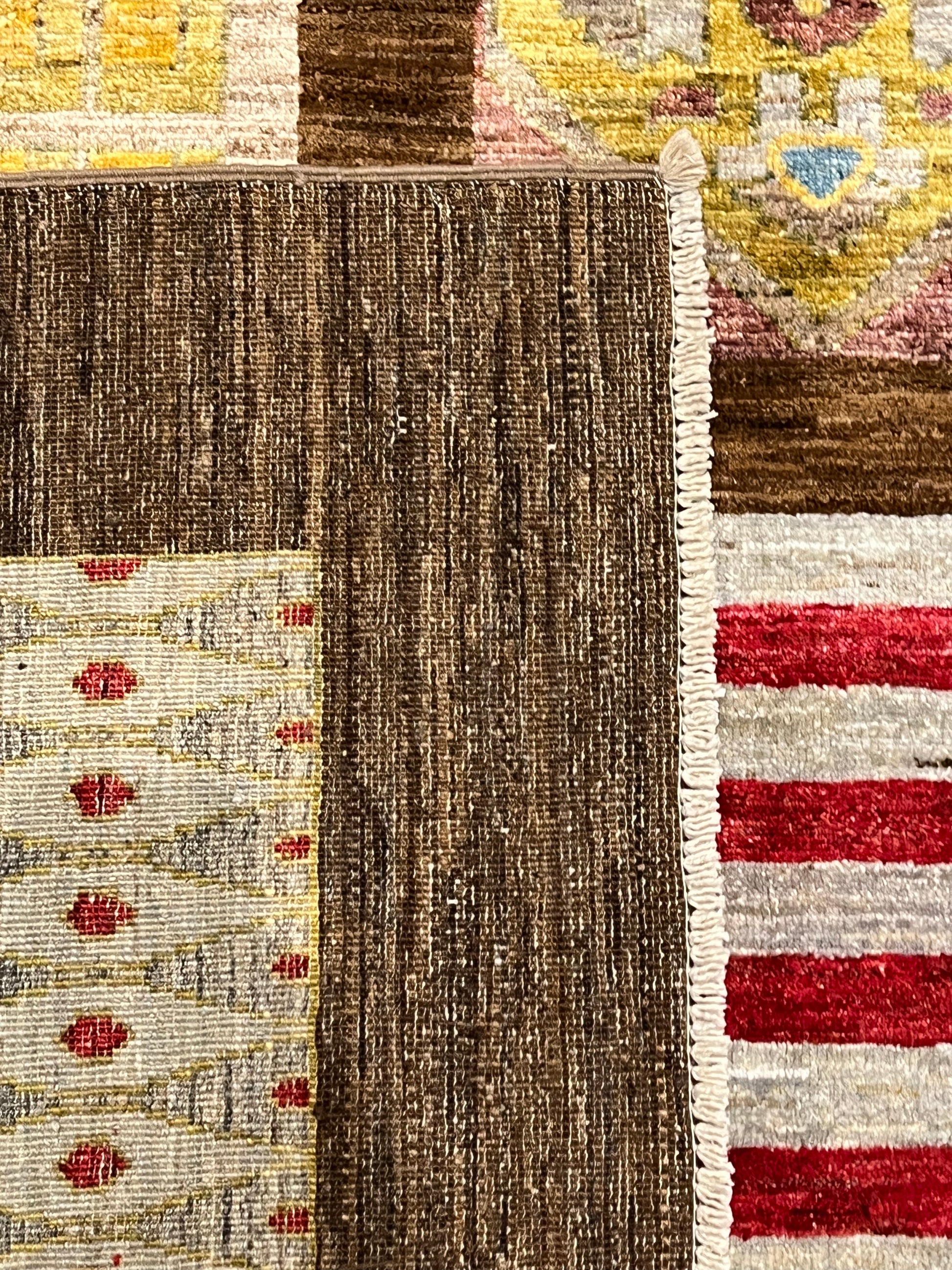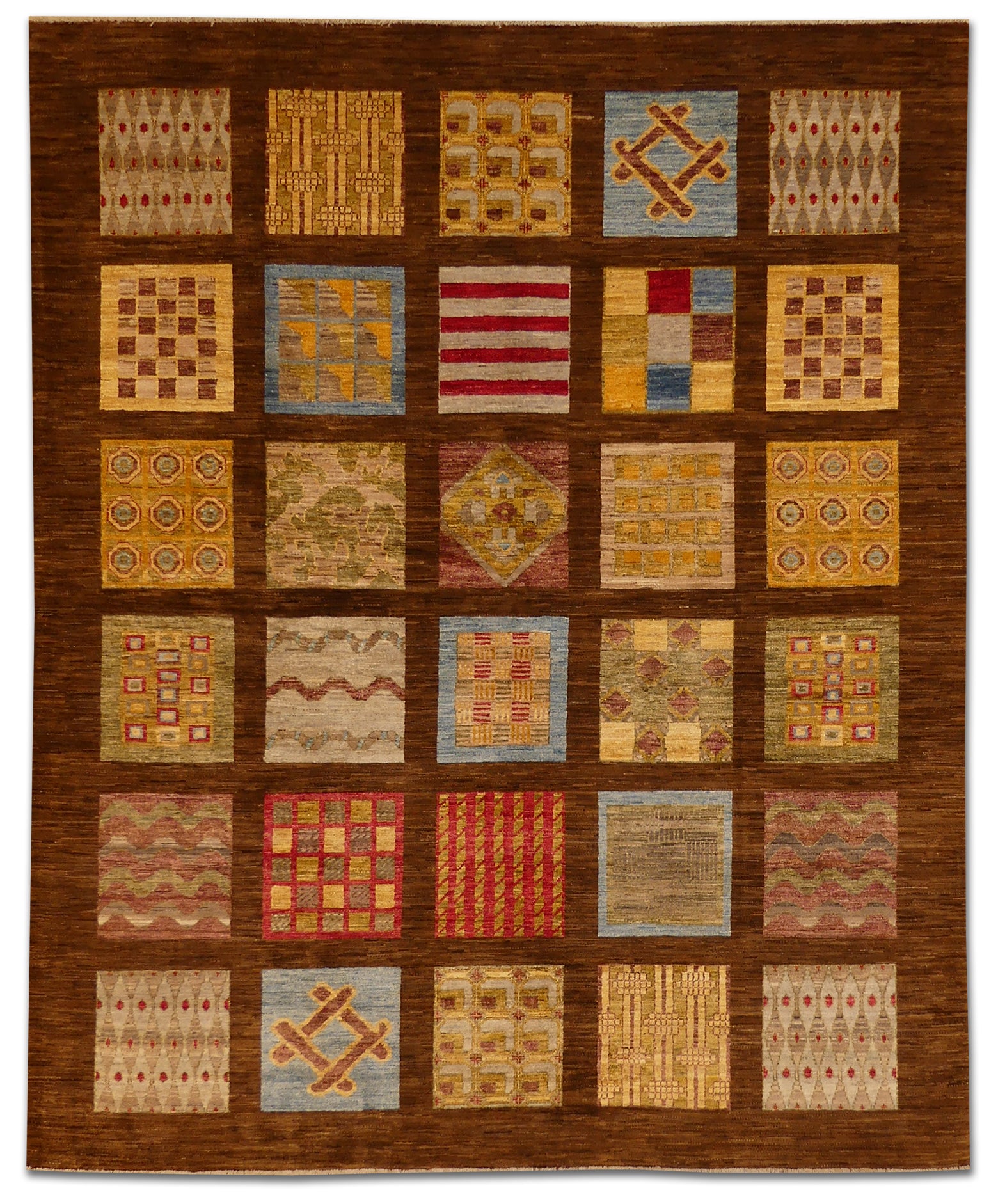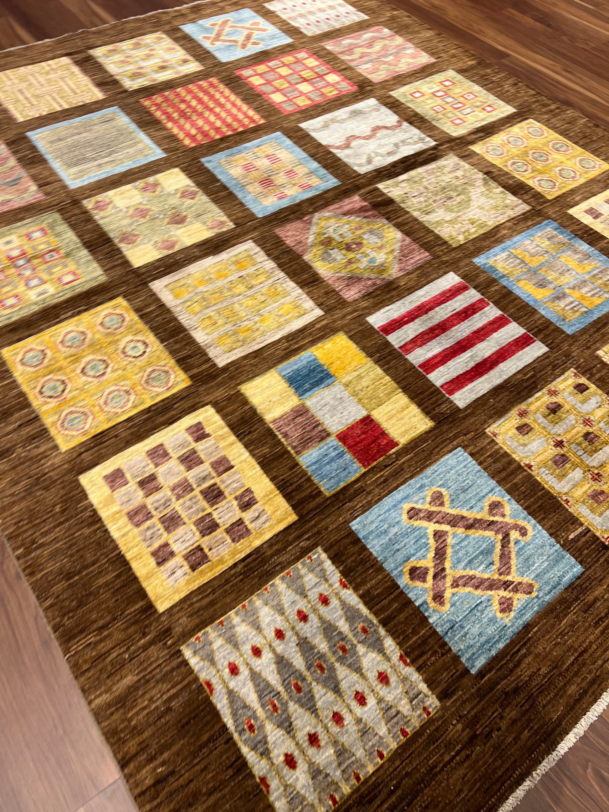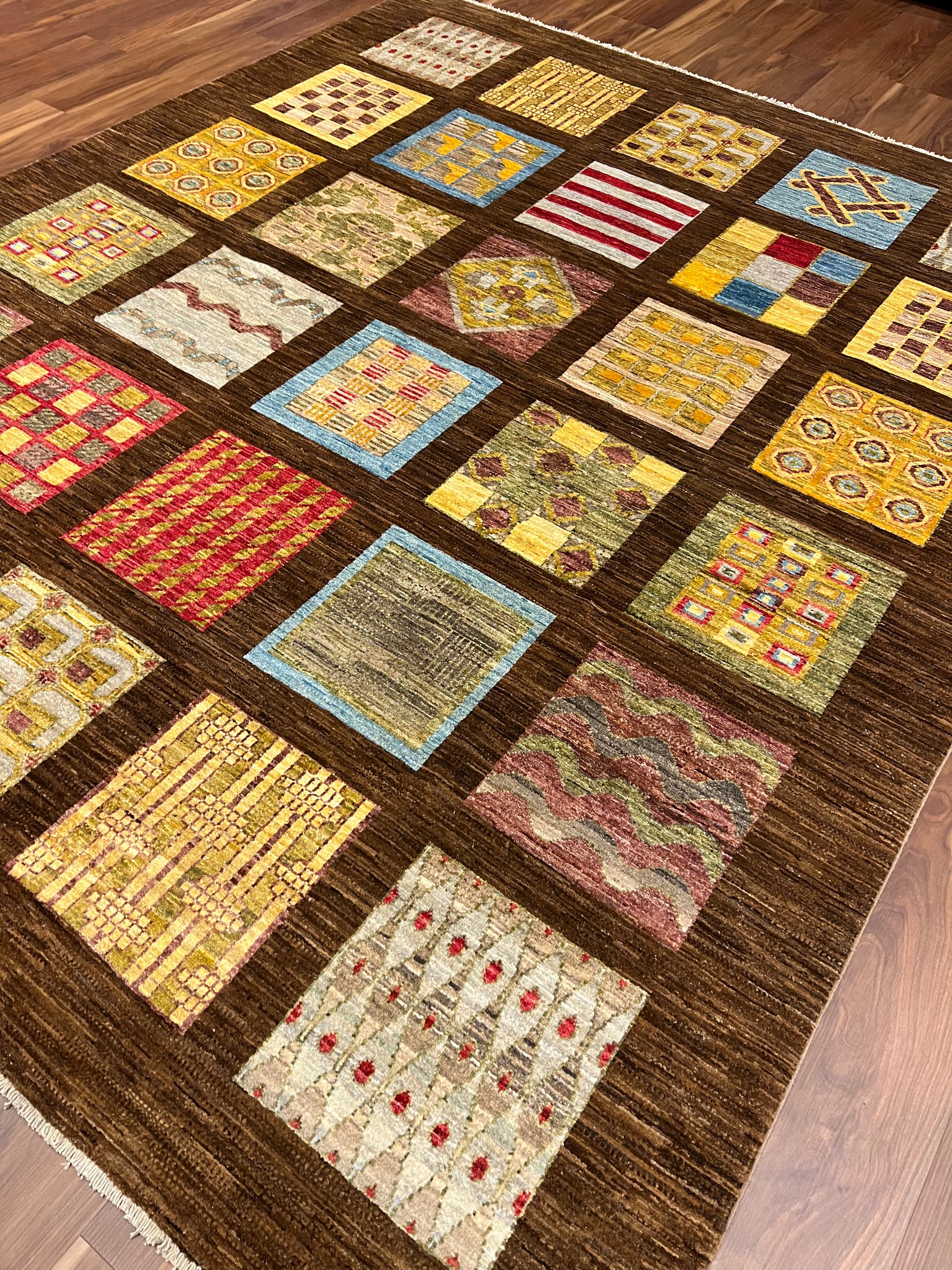 This Gabbeh woollen rug is a lively tapestry of culture and history, featuring a patchwork of various geometric and abstract designs. Each square has unique patterns, reminiscent of traditional quilts, infusing warmth and storytelling into any room. The earthy tones and rustic charm of this piece create a timeless aesthetic that pairs well with both modern and classic decors. Handcrafted with care, it promises durability and comfort underfoot.
