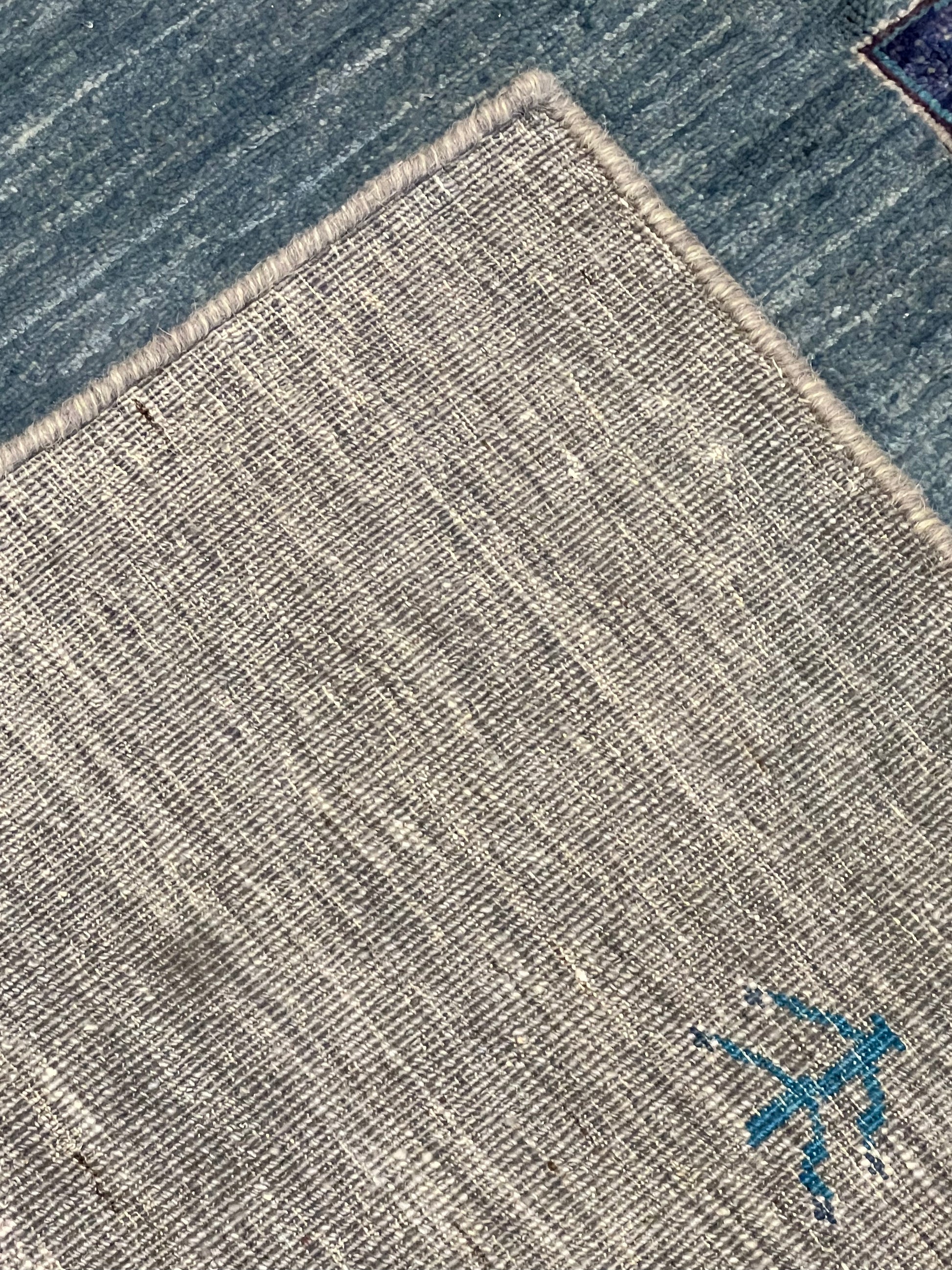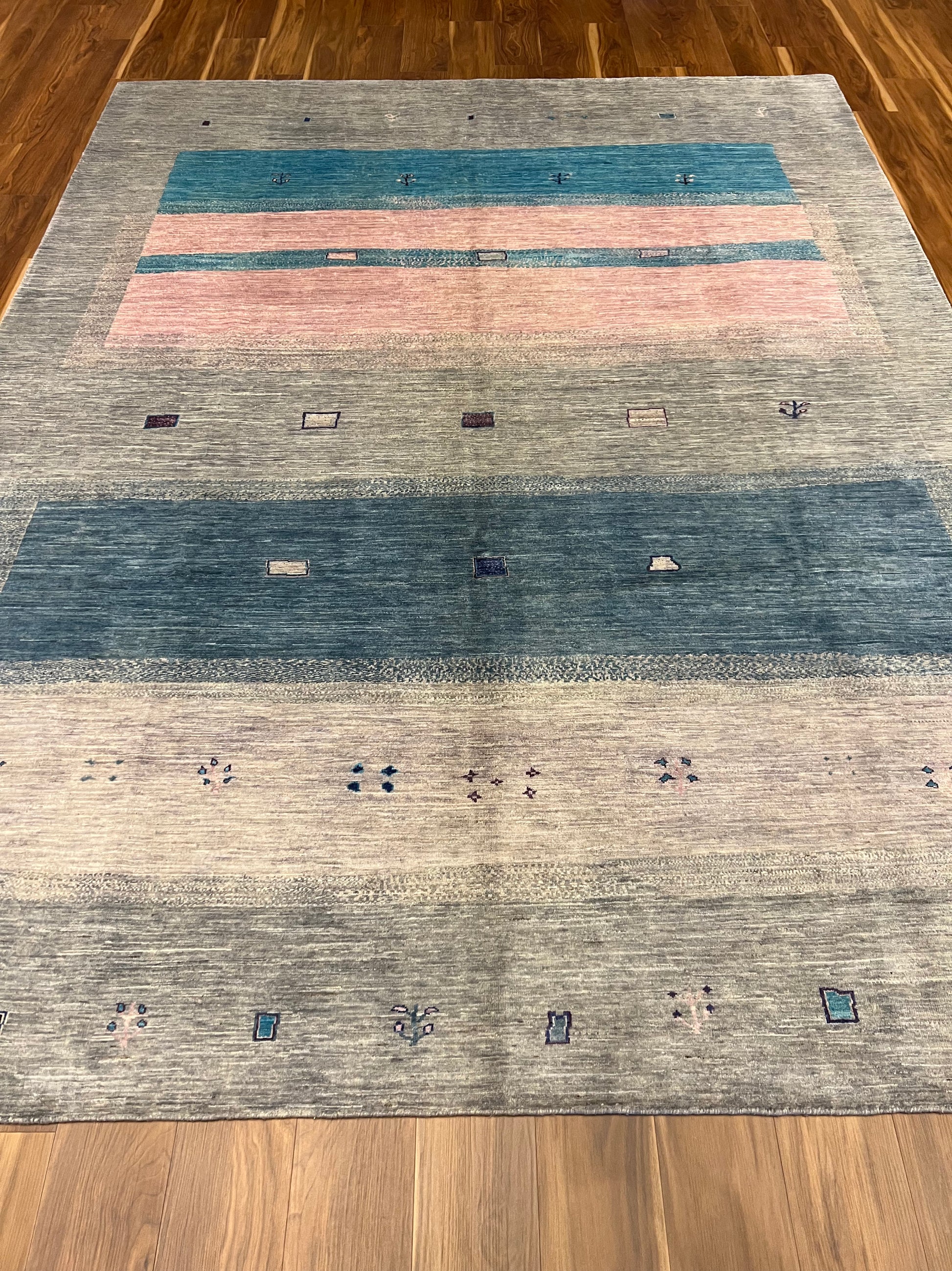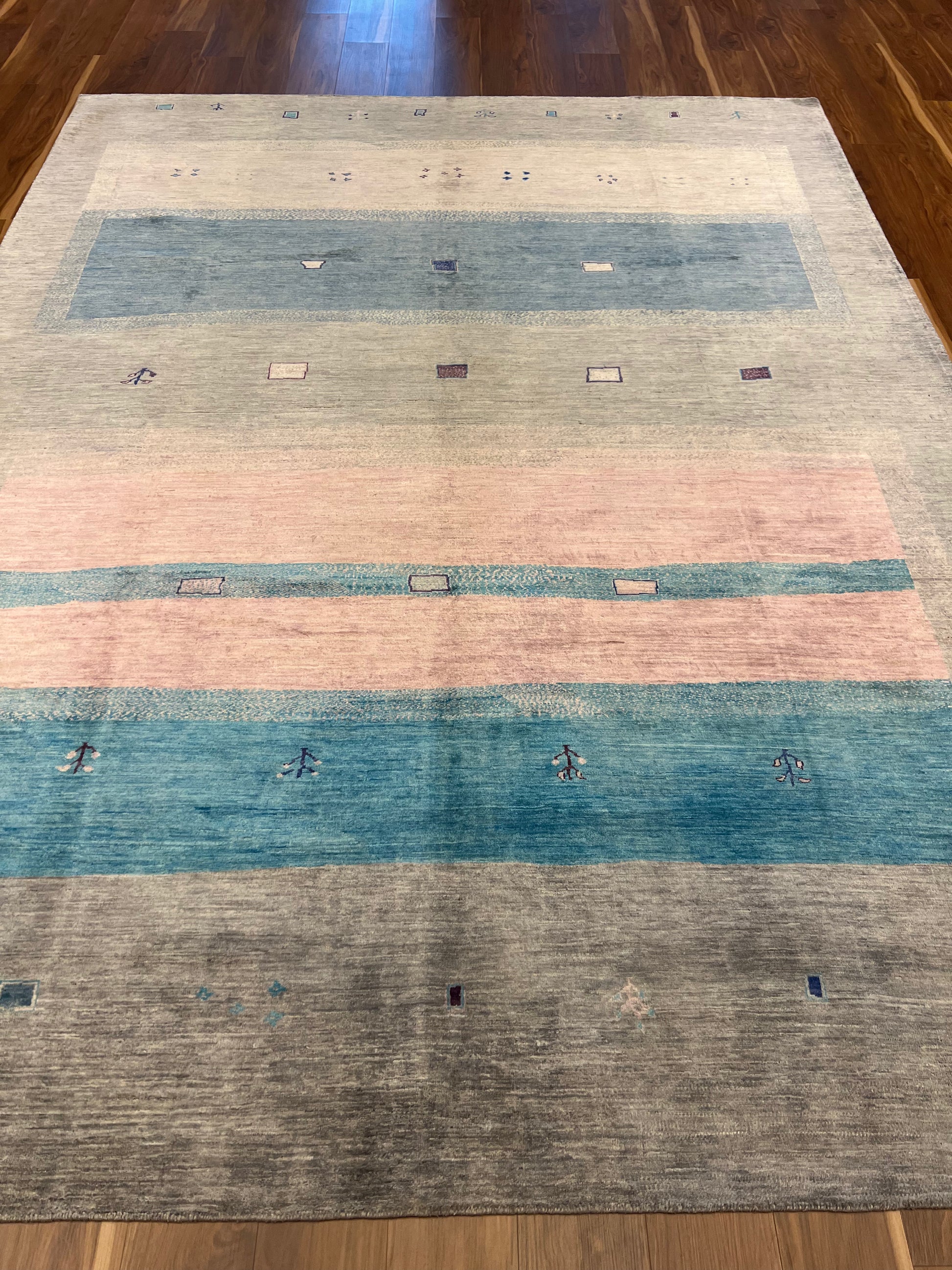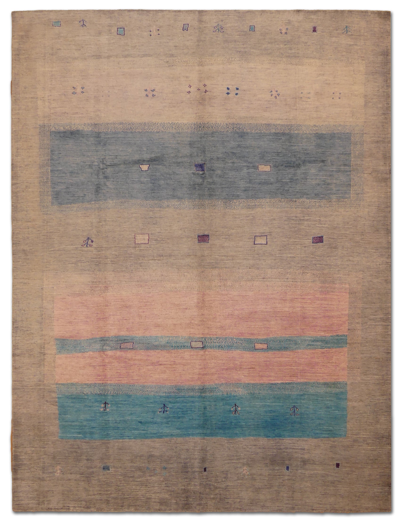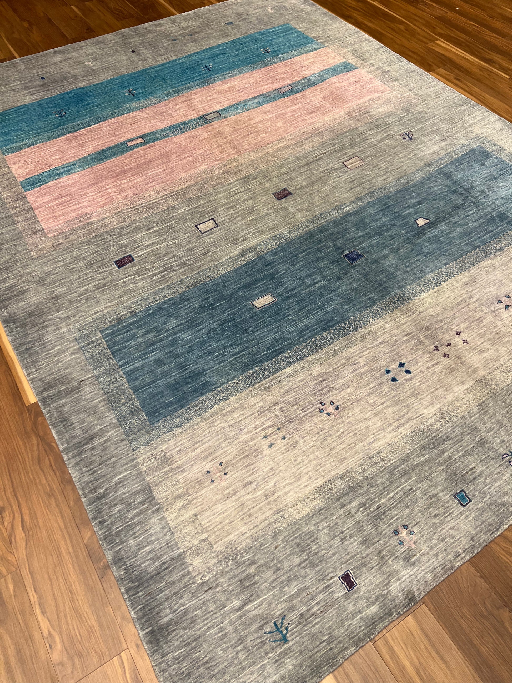 This handwoven Gabbeh rug features a simplistic yet captivating modern design. Its high-quality wool construction ensures durability and comfort underfoot. The design consists of horizontal stripes with subtle geometric motifs, offering a contemporary visual appeal suitable for any modern interior space. The color palette is soothing and earthy with accents of coral and blue, reminiscent of a serene landscape, which would bring a sense of tranquility to your home.