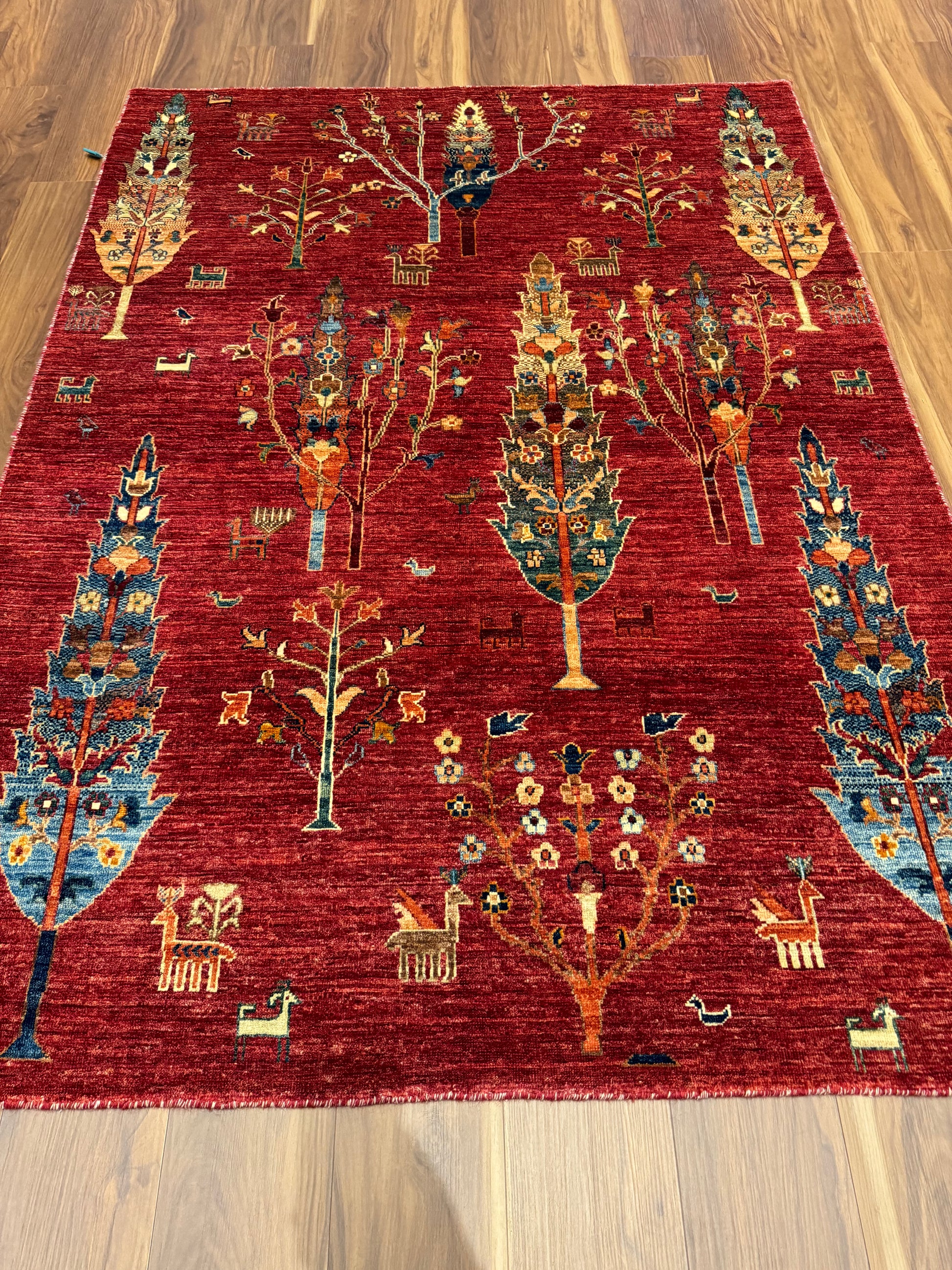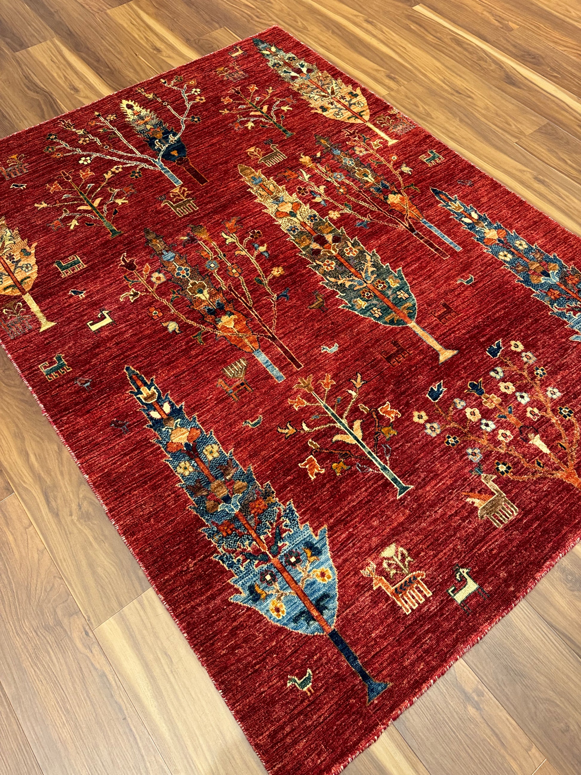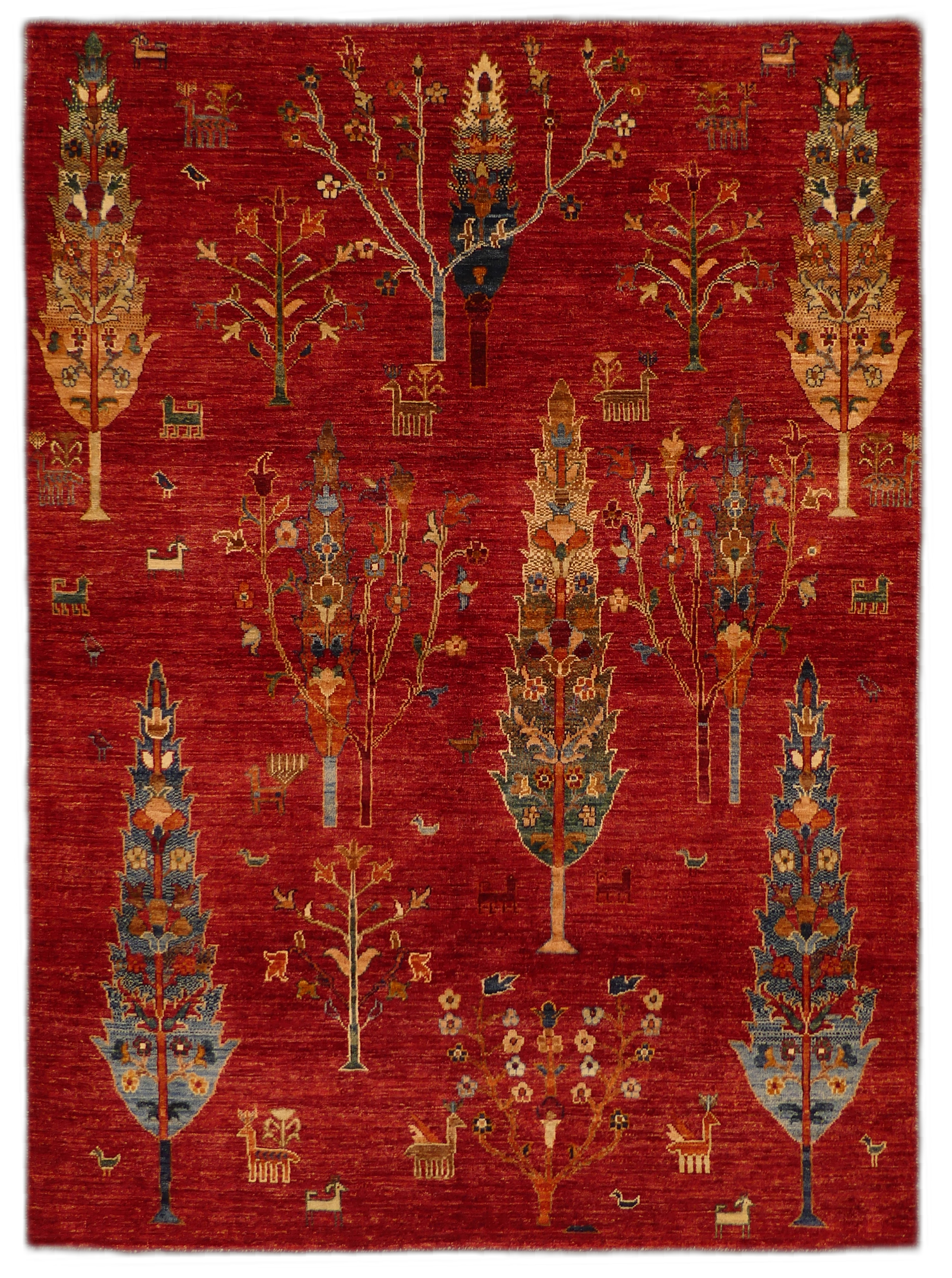 This exquisite Gabbeh rug boasts a lattice of vibrant trees and miniature animal motifs, adorning the rich red backdrop with touches of orange, blue, and gold highlights. The intricate craftsmanship and natural themes offer a warm and inviting feel, perfect for enhancing any room with its traditional charm and timeless elegance. Made from high-quality wool, it promises durability and comfort underfoot.