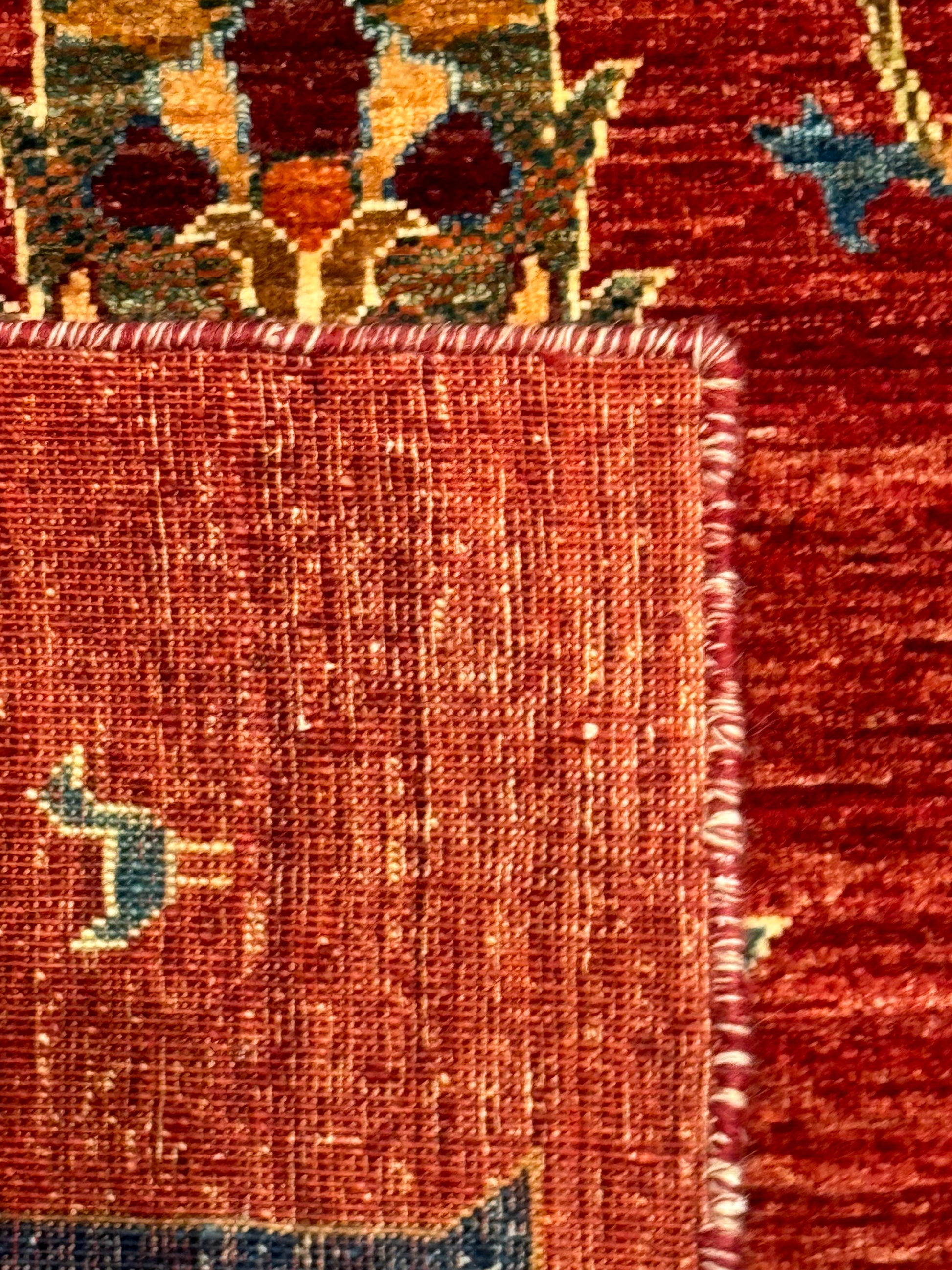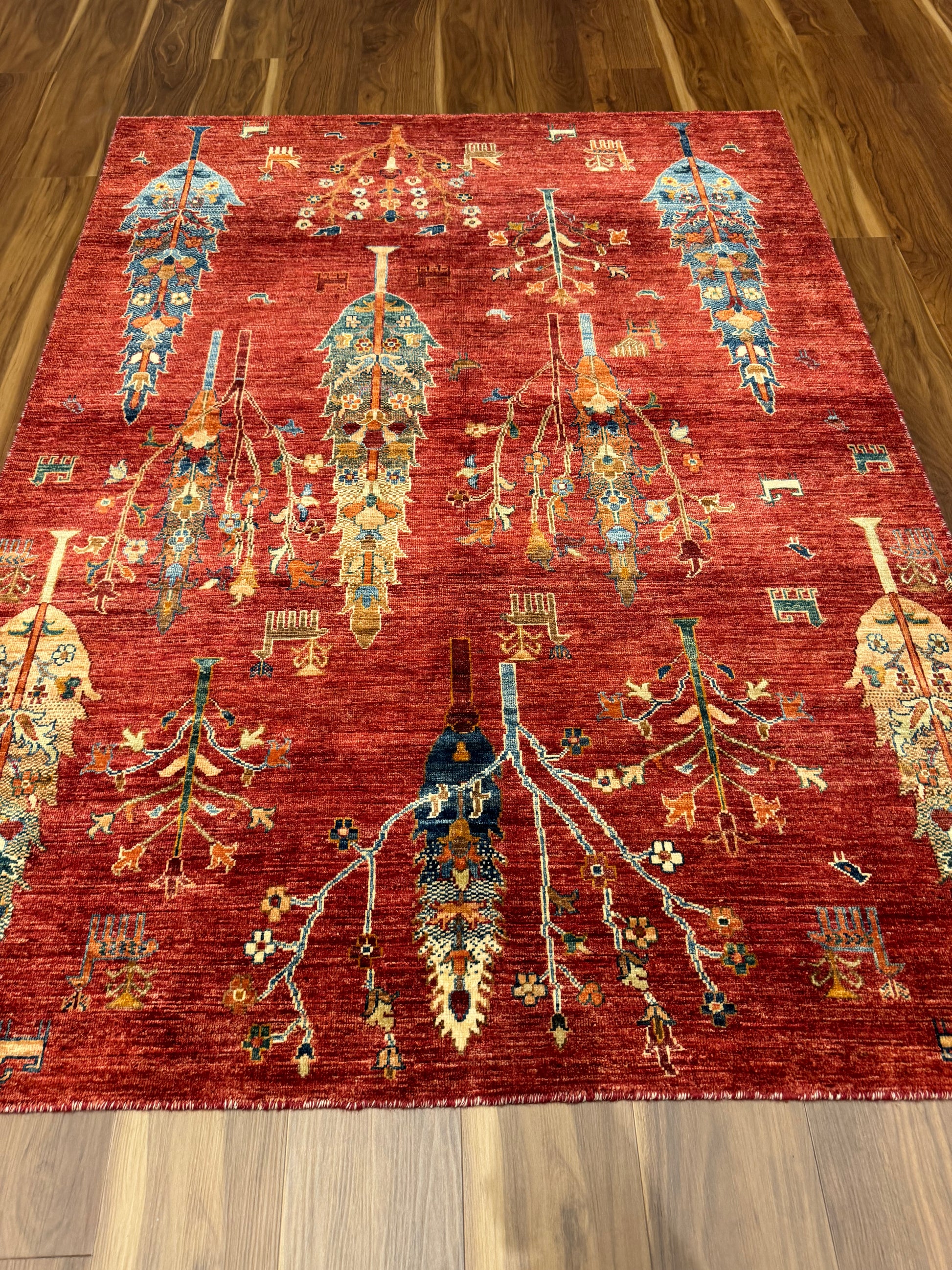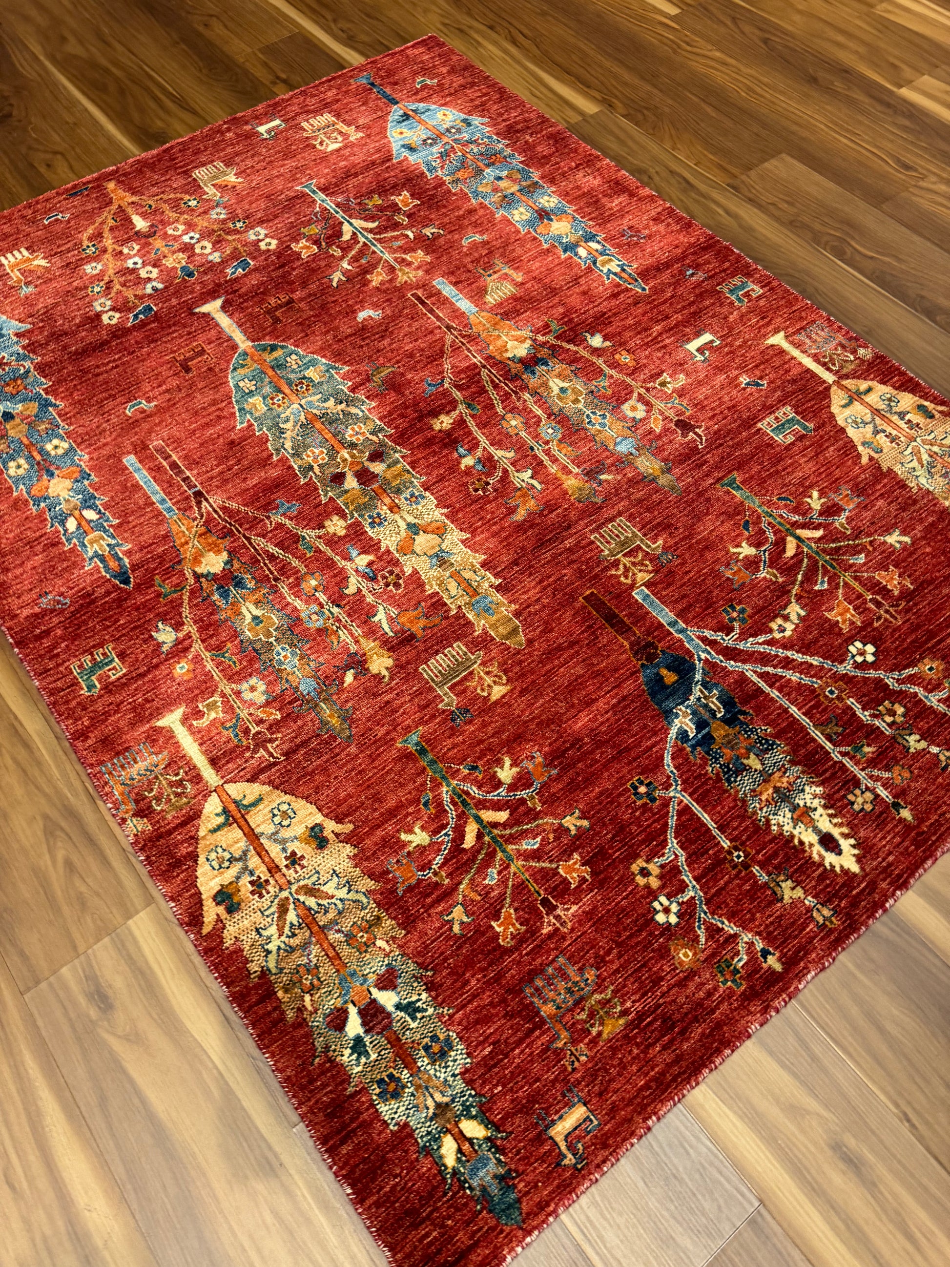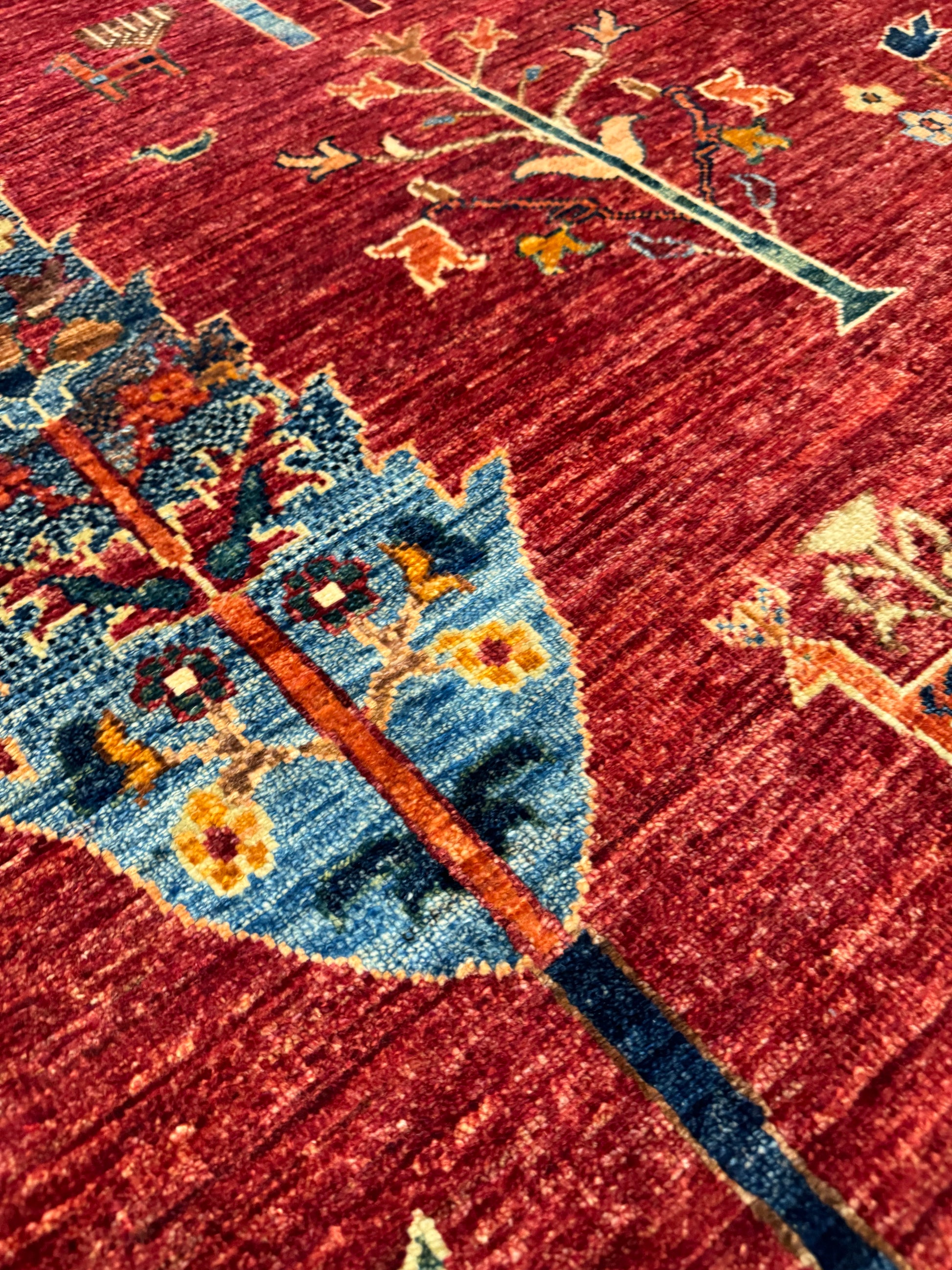 This exquisite Gabbeh rug boasts a lattice of vibrant trees and miniature animal motifs, adorning the rich red backdrop with touches of orange, blue, and gold highlights. The intricate craftsmanship and natural themes offer a warm and inviting feel, perfect for enhancing any room with its traditional charm and timeless elegance. Made from high-quality wool, it promises durability and comfort underfoot.
