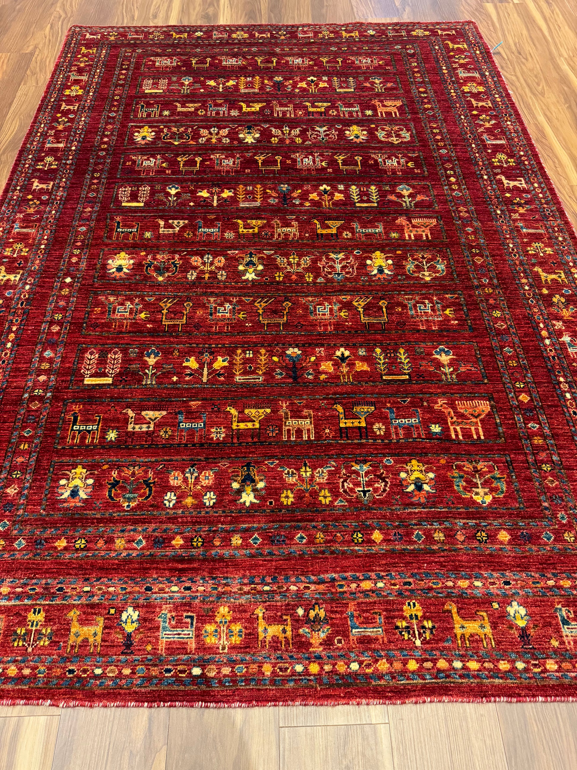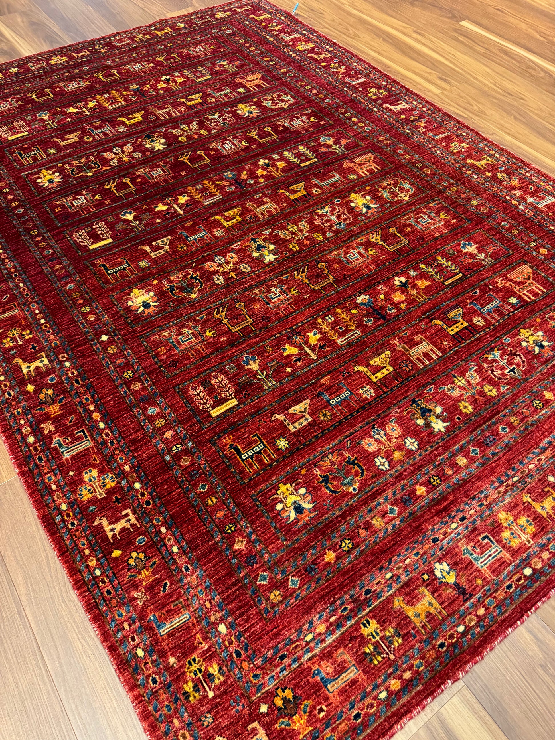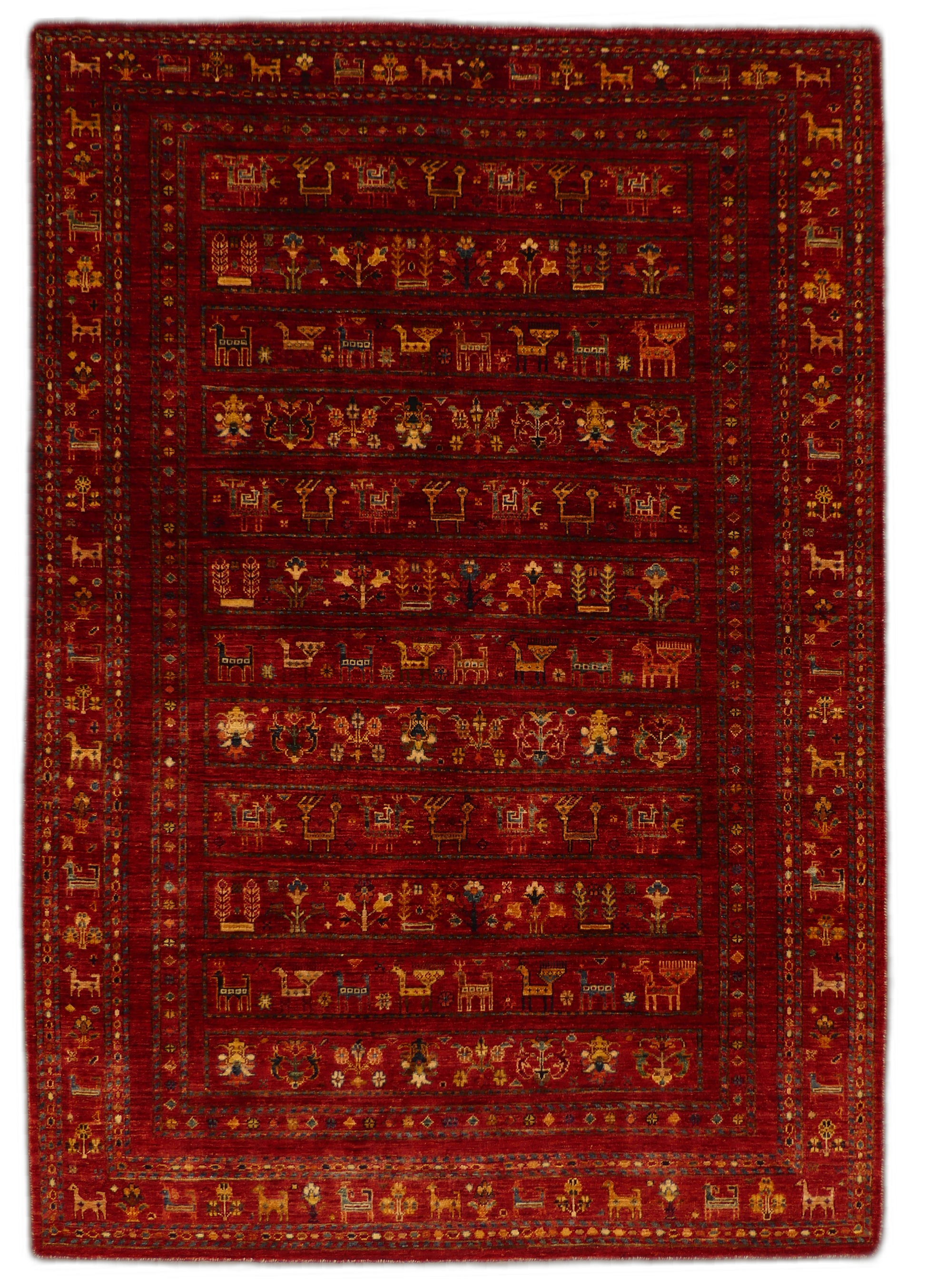 This exquisite Gabbeh wool rug features a traditional design with a rich tapestry of animal and plant motifs scattered throughout its deep red and orange fields. Each symbol is intricately detailed, evoking a sense of ancient craftsmanship. The border contains a series of complementary patterns, adding to the rug's overall harmonious aesthetic. Its woolen material ensures both durability and a soft underfoot feel, perfect for transforming any room with a touch of timeless elegance.