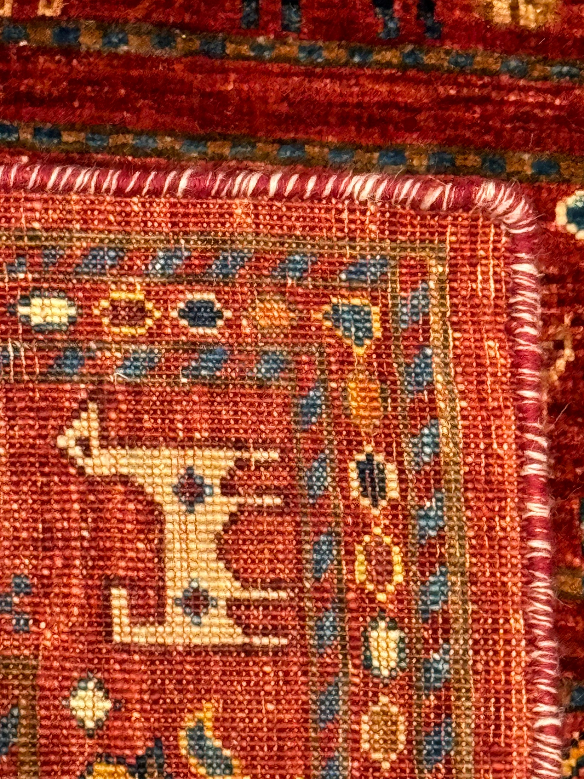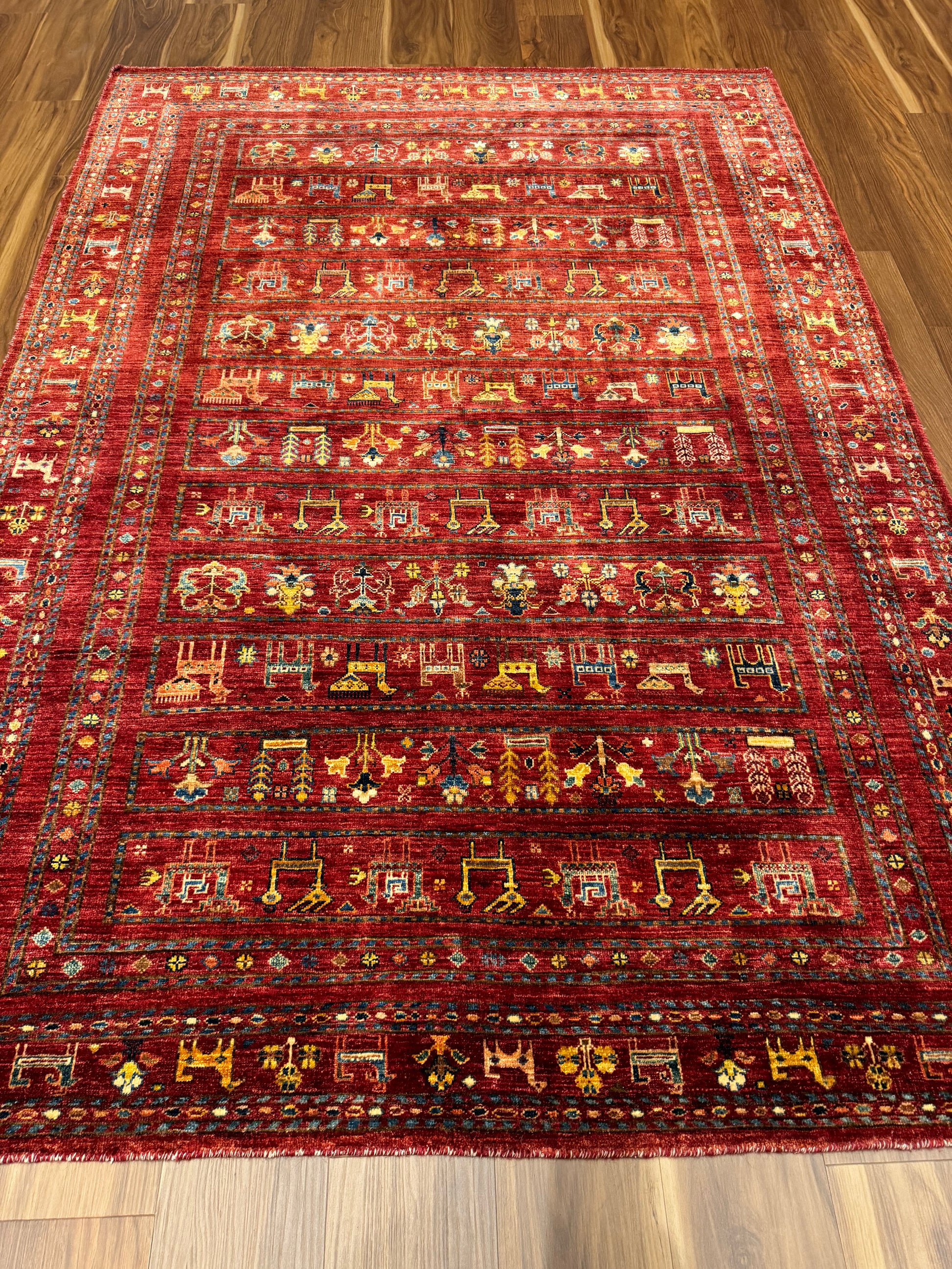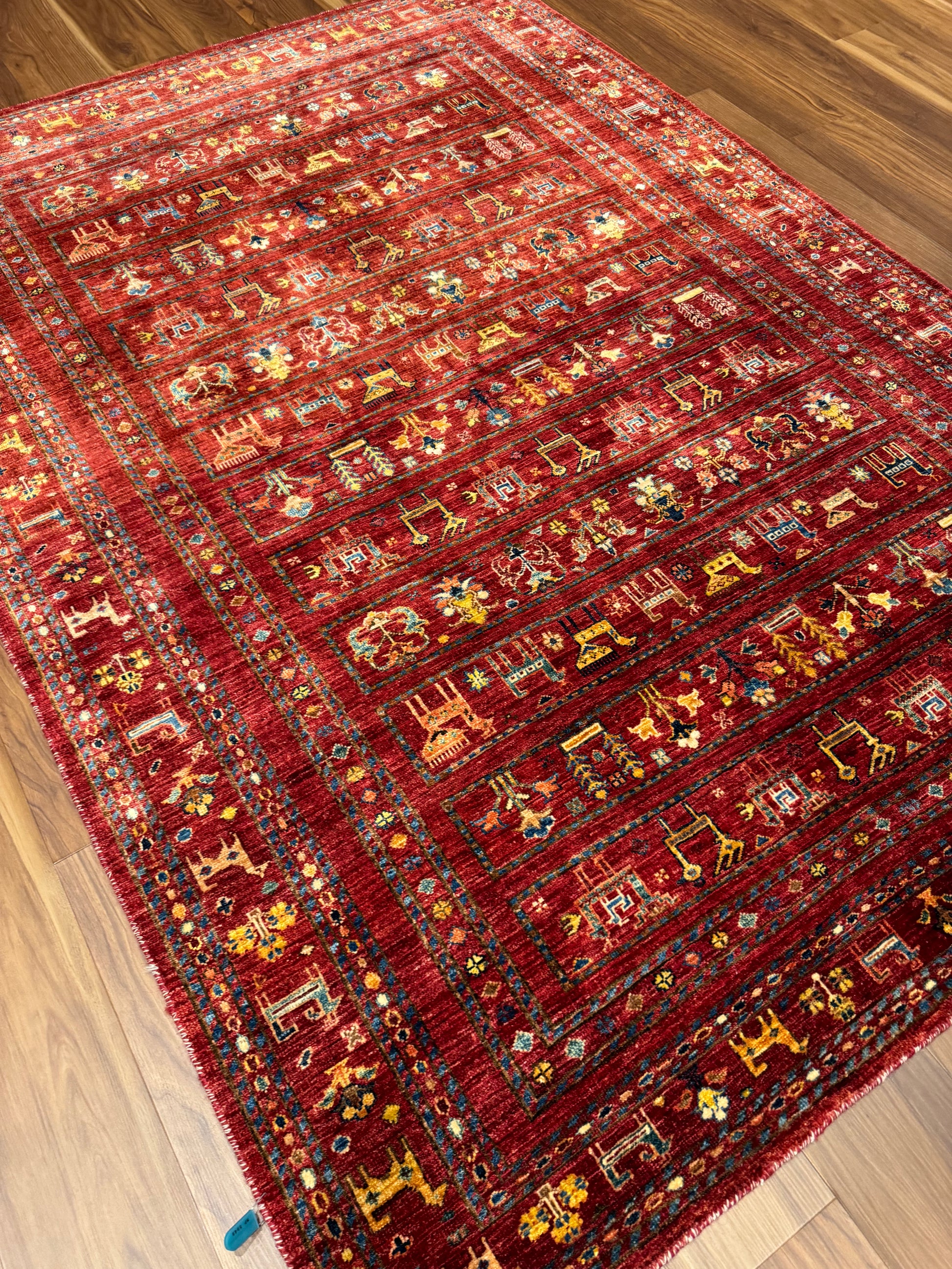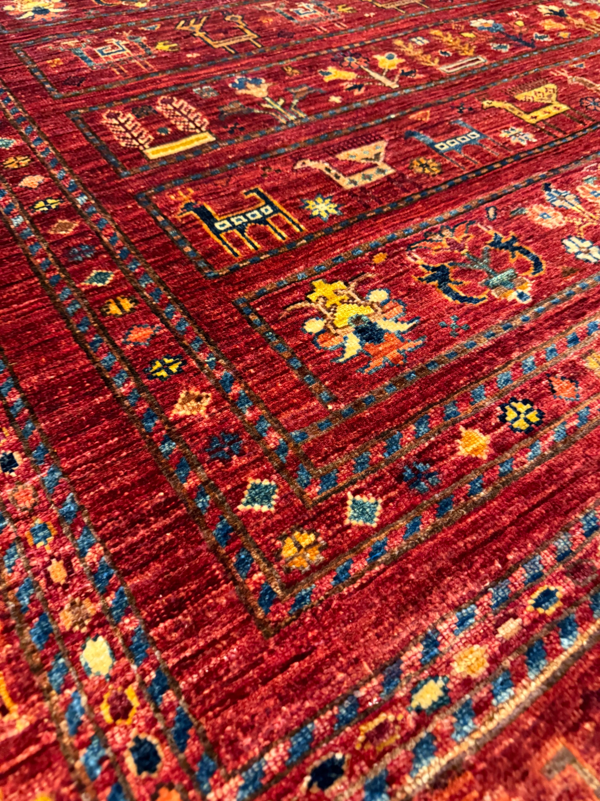 This exquisite Gabbeh wool rug features a traditional design with a rich tapestry of animal and plant motifs scattered throughout its deep red and orange fields. Each symbol is intricately detailed, evoking a sense of ancient craftsmanship. The border contains a series of complementary patterns, adding to the rug's overall harmonious aesthetic. Its woolen material ensures both durability and a soft underfoot feel, perfect for transforming any room with a touch of timeless elegance.