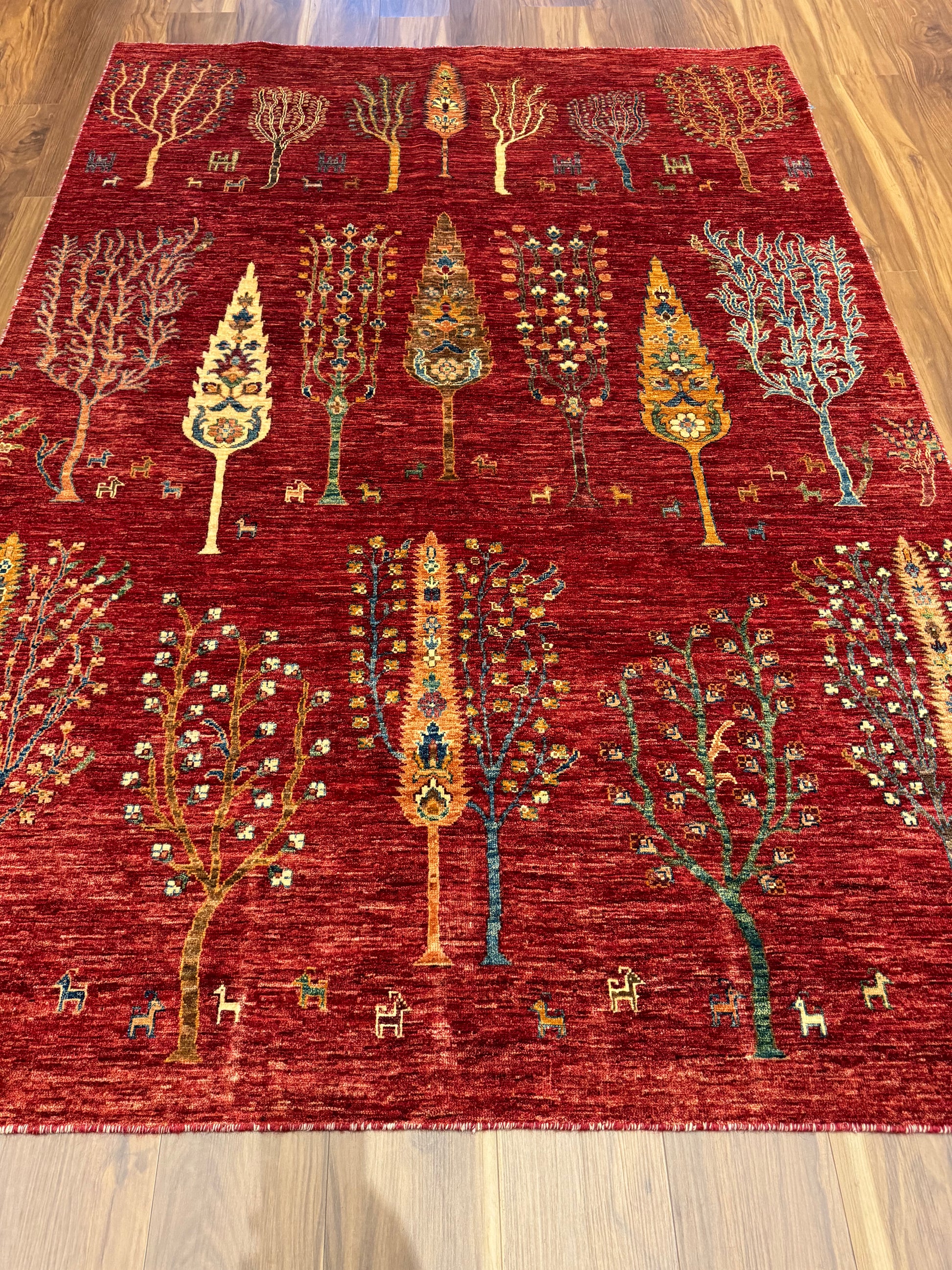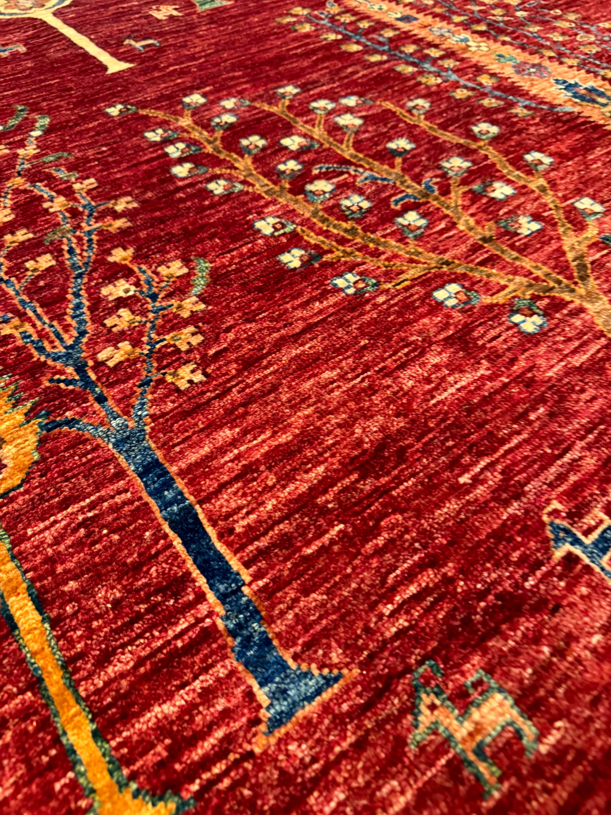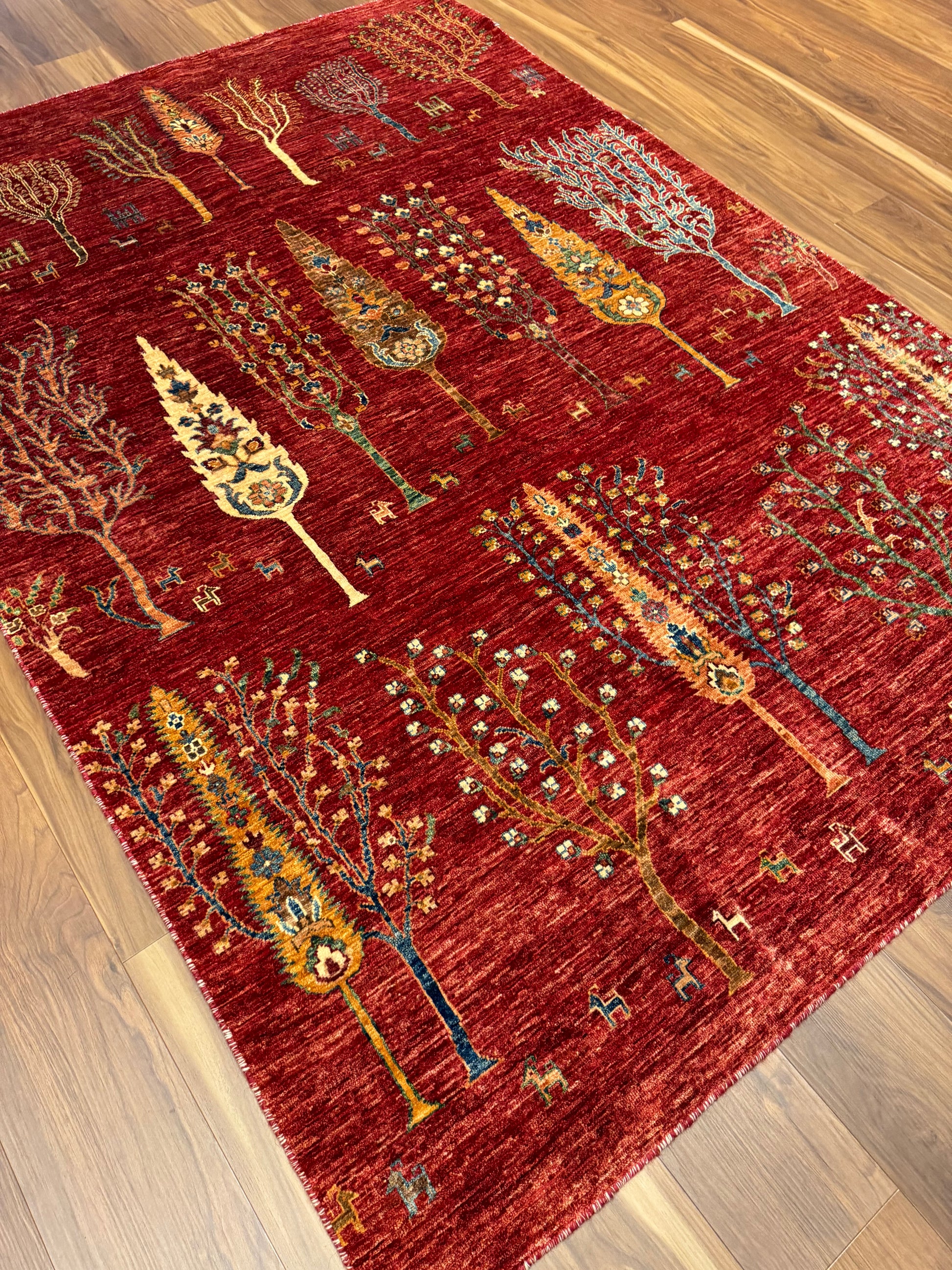 This hand-knotted Gabbeh wool rug is a genuine expression of tribal craftsmanship. Featuring a mesmerizing field of stylized trees and foliage, the rug exudes a rustic charm. Its warm red background is artfully complemented by orange, gold, and touches of blue, creating an inviting earthy atmosphere. Perfect for those seeking to add a touch of timeless tradition to their living space, each tree symbolizes the natural world, with subtle variations that celebrate the uniqueness of handcrafted art.