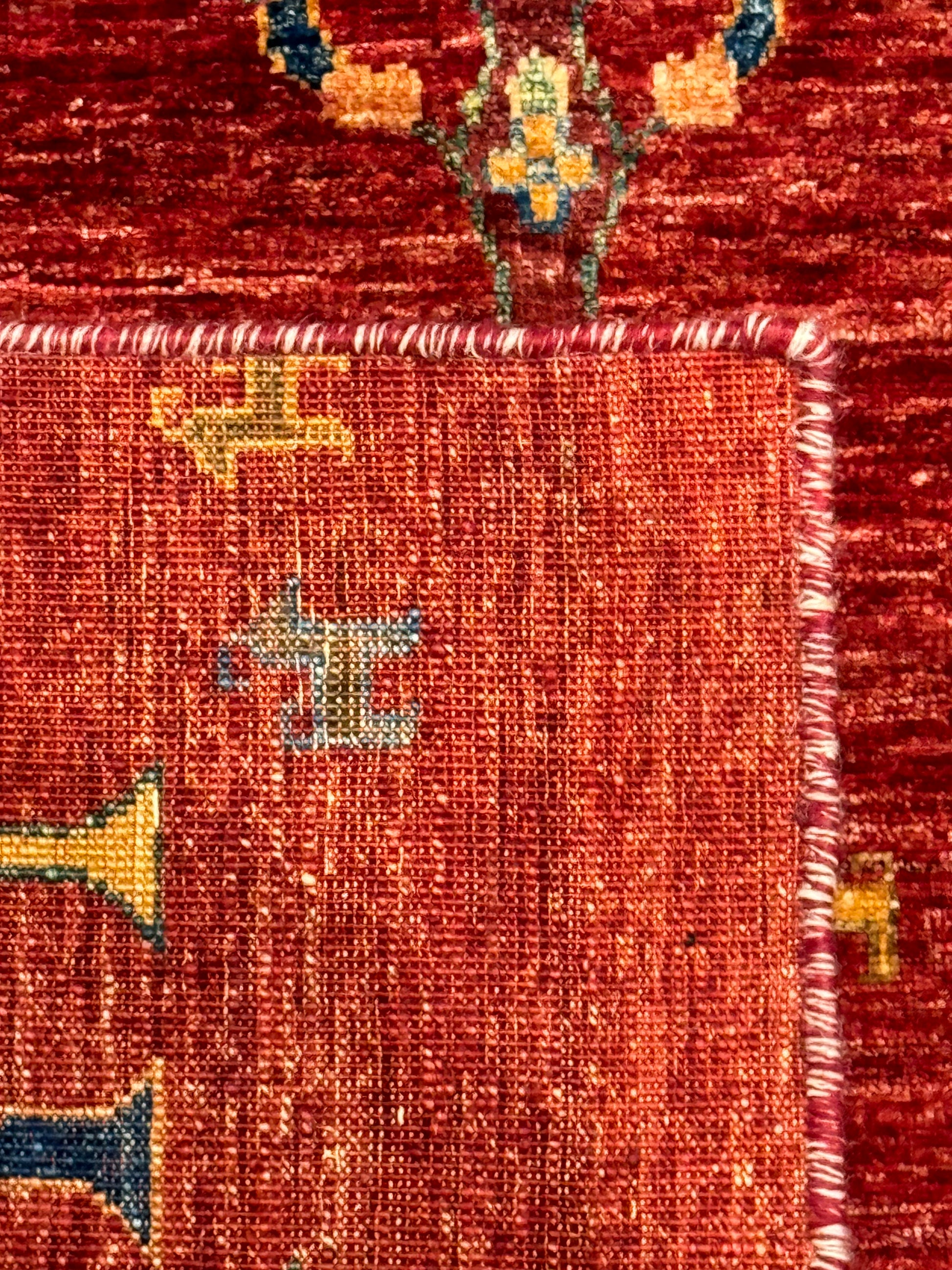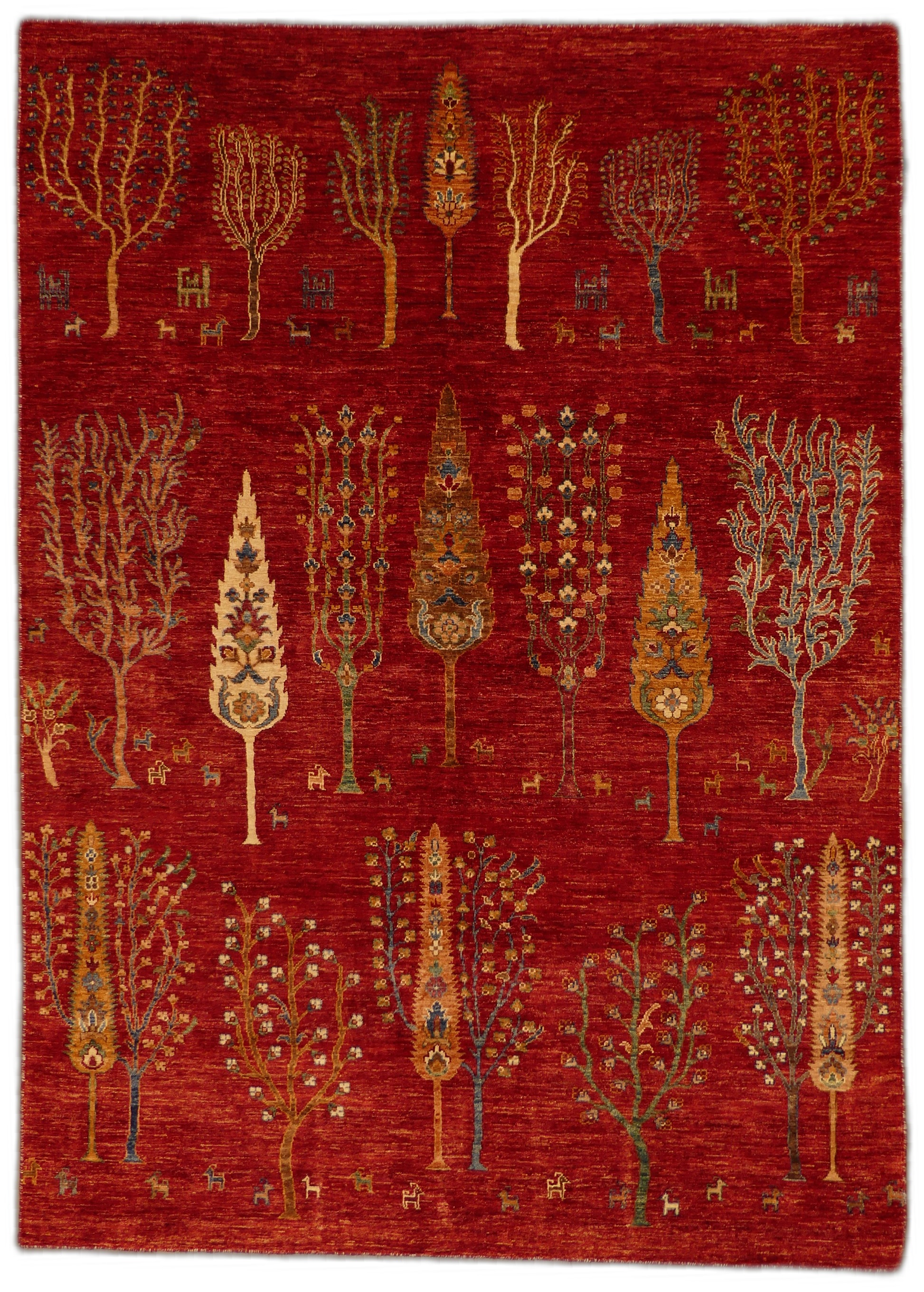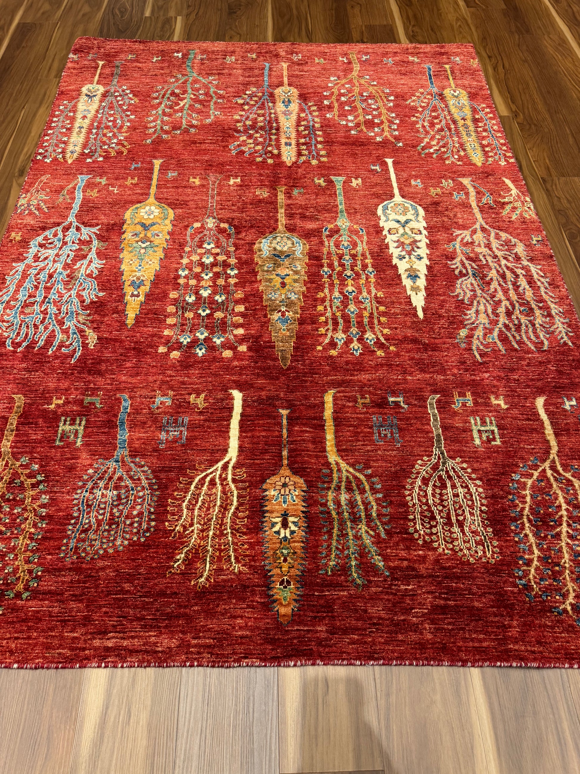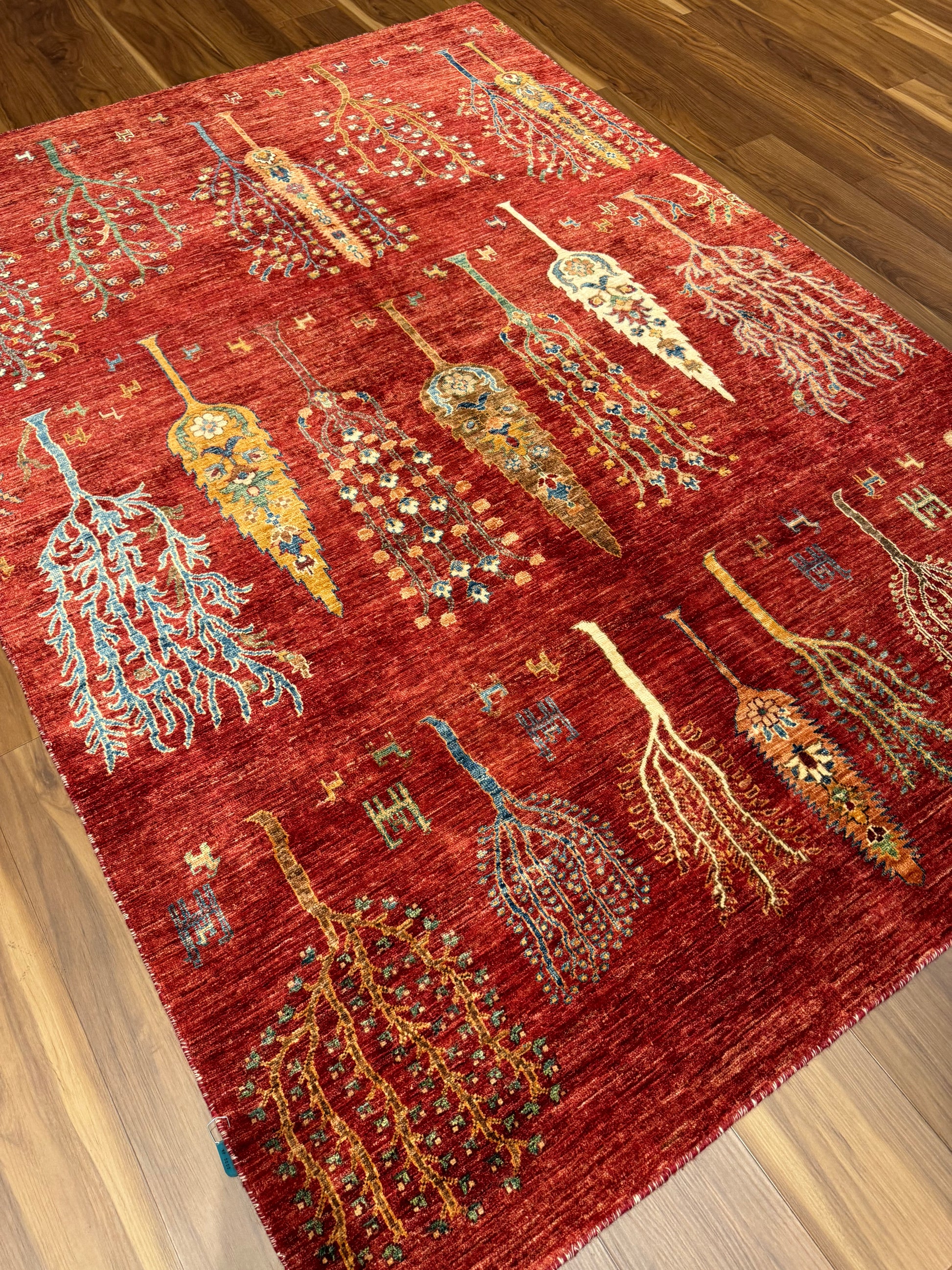 This hand-knotted Gabbeh wool rug is a genuine expression of tribal craftsmanship. Featuring a mesmerizing field of stylized trees and foliage, the rug exudes a rustic charm. Its warm red background is artfully complemented by orange, gold, and touches of blue, creating an inviting earthy atmosphere. Perfect for those seeking to add a touch of timeless tradition to their living space, each tree symbolizes the natural world, with subtle variations that celebrate the uniqueness of handcrafted art.