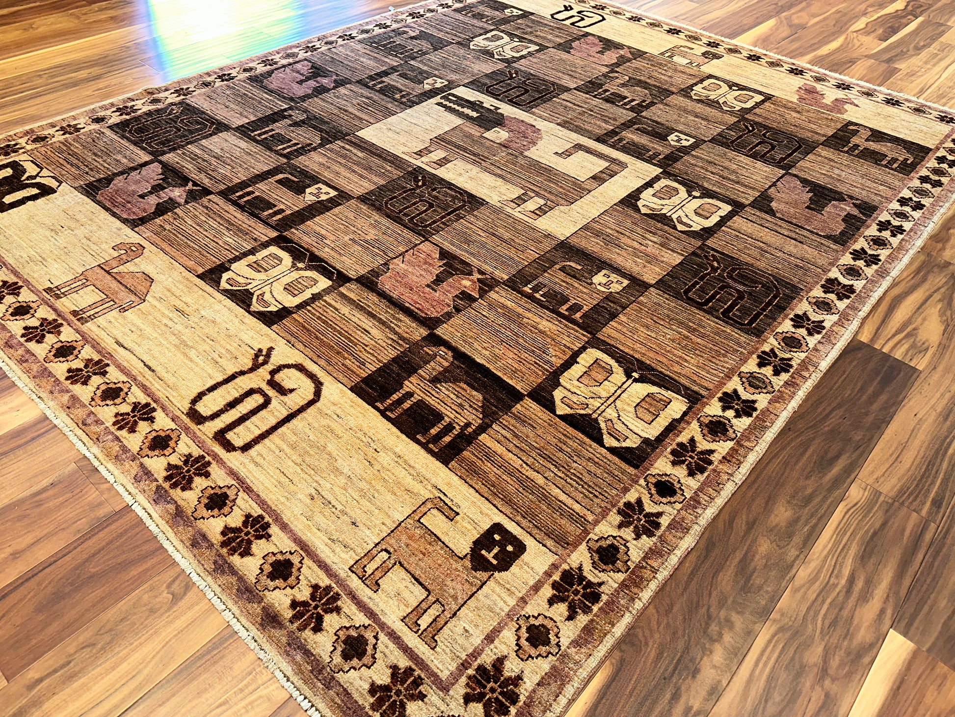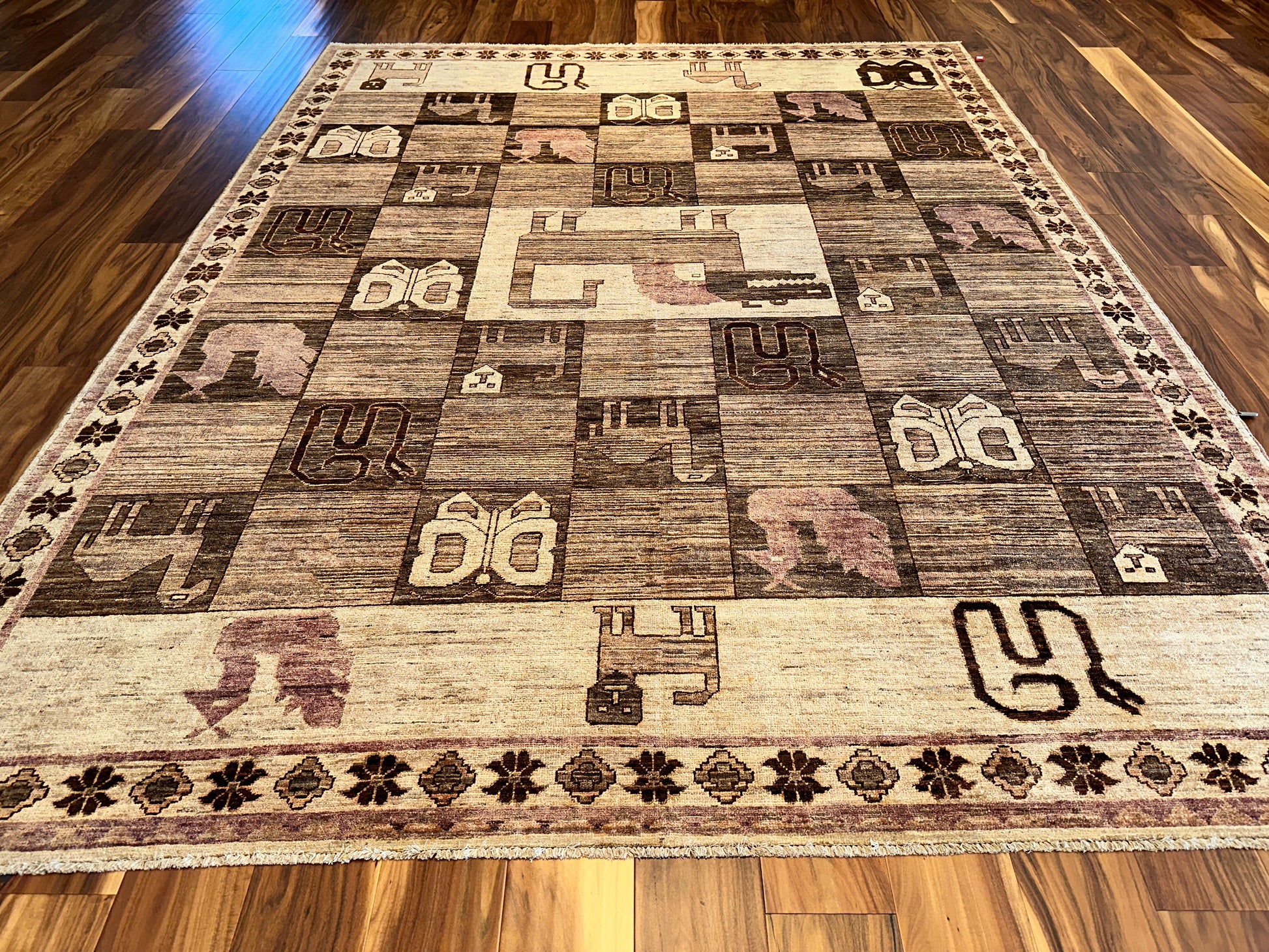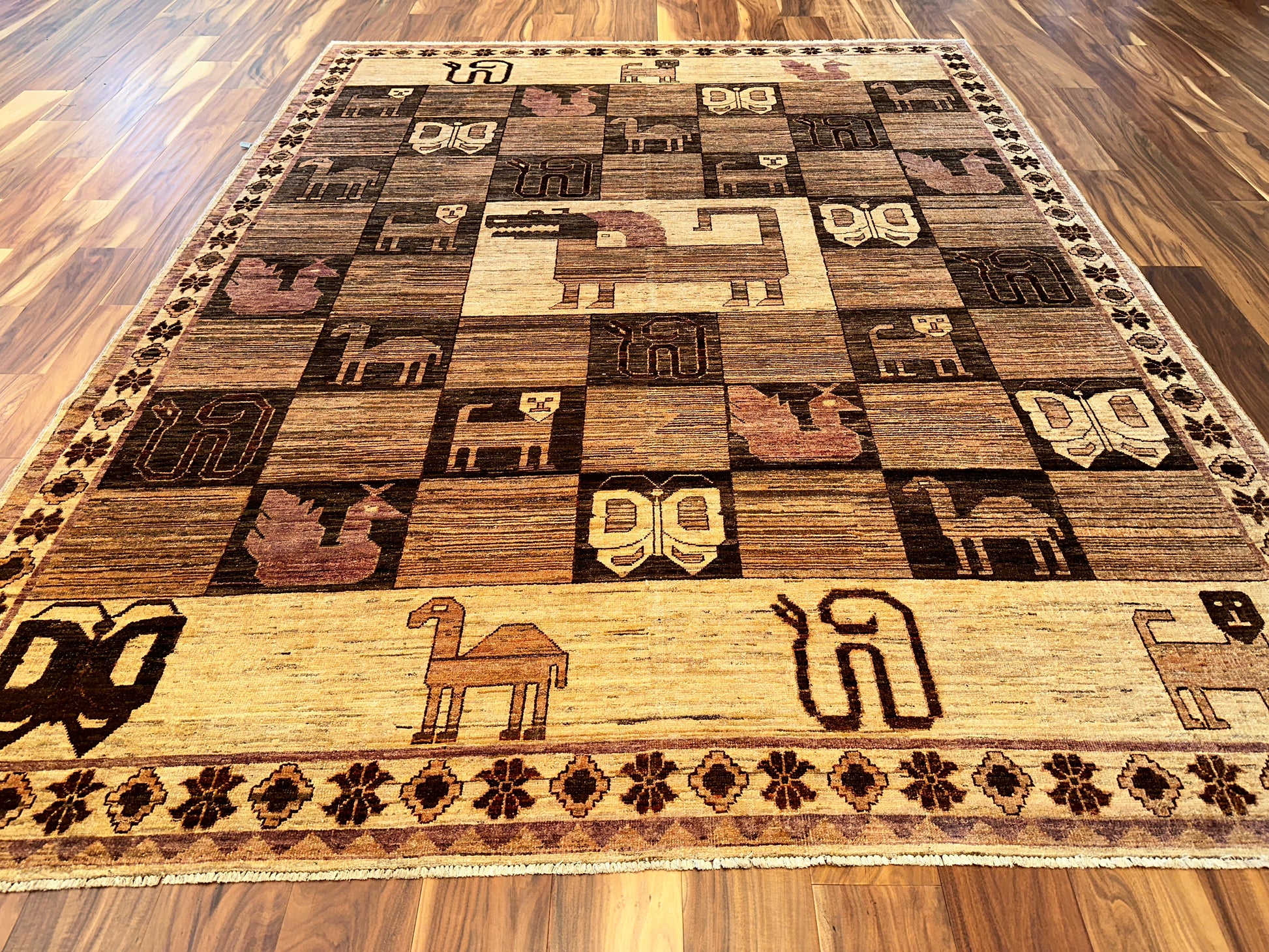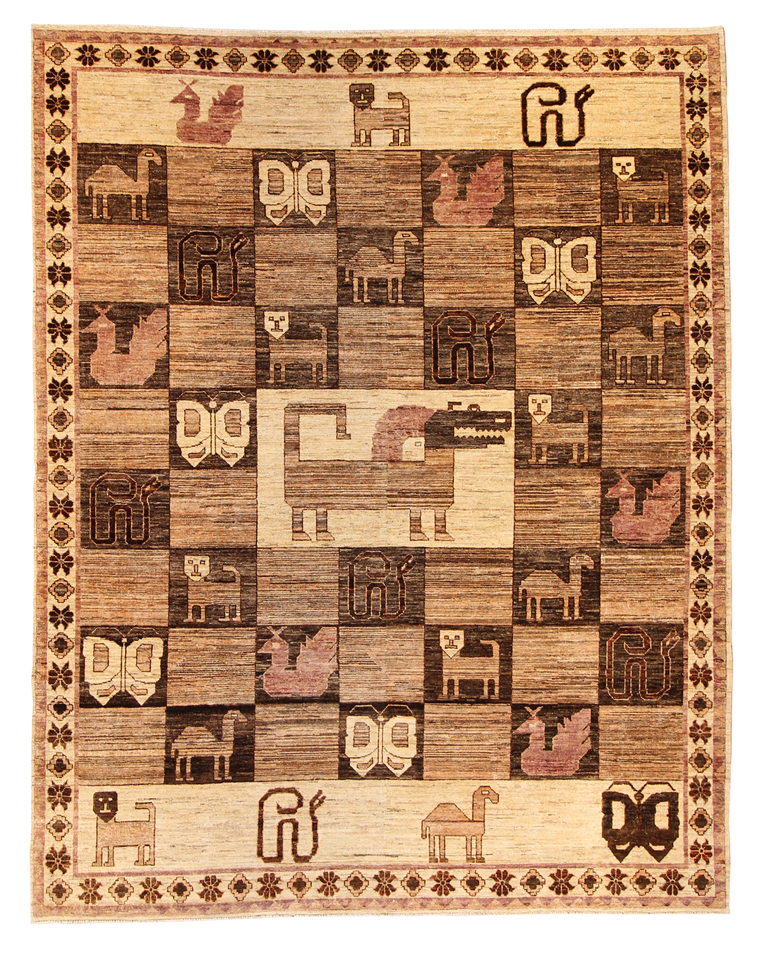 Playful yet grounded, this hand-knotted rug presents a captivating mosaic of whimsical animal and butterfly motifs set in a checkerboard layout. Warm shades of brown, tan, and soft rose form a harmonious palette, giving the design a folkloric charm. With its graphic silhouettes and natural wool texture, this piece brings a touch of artisanal whimsy to casual and eclectic interiors.