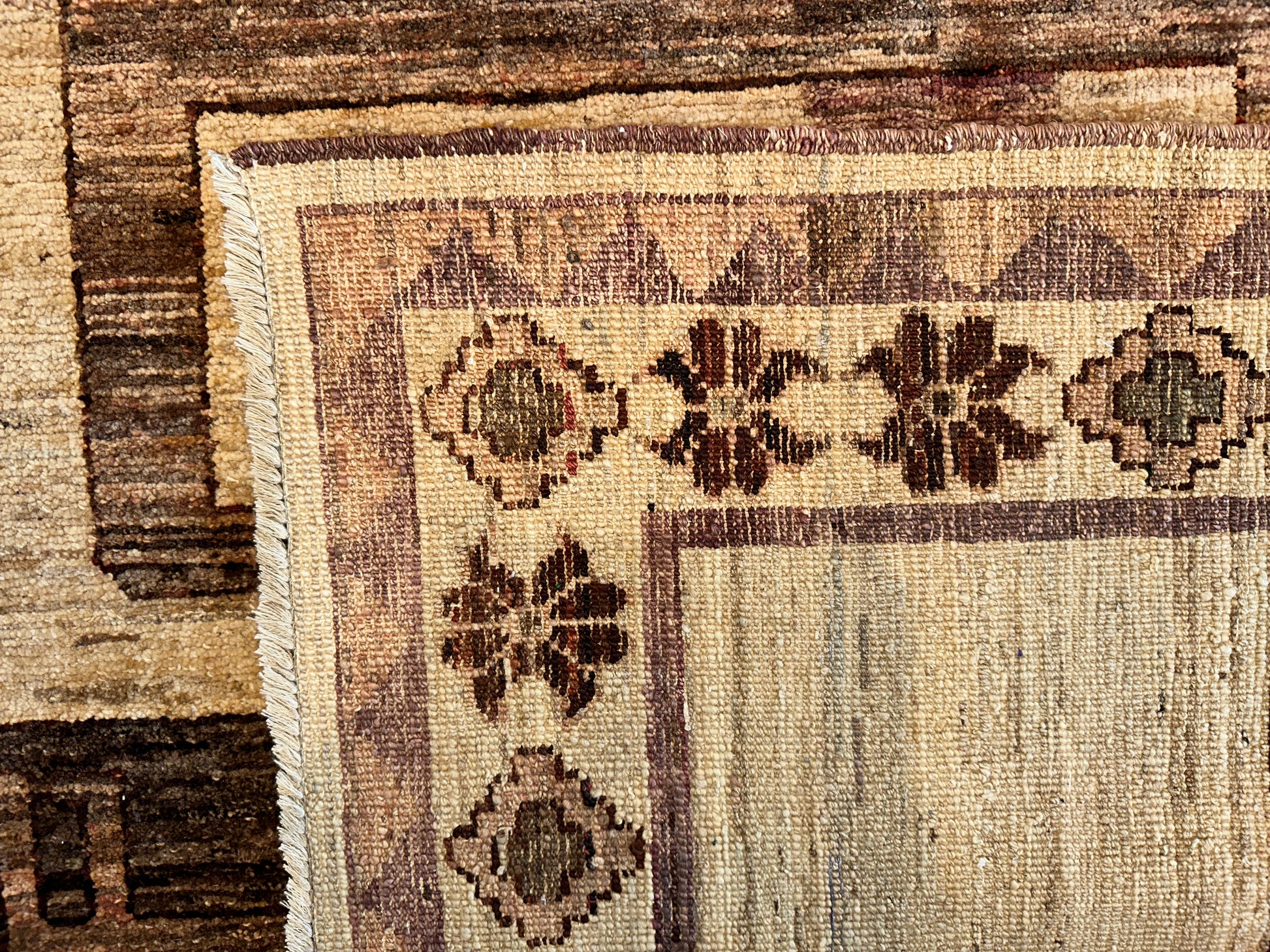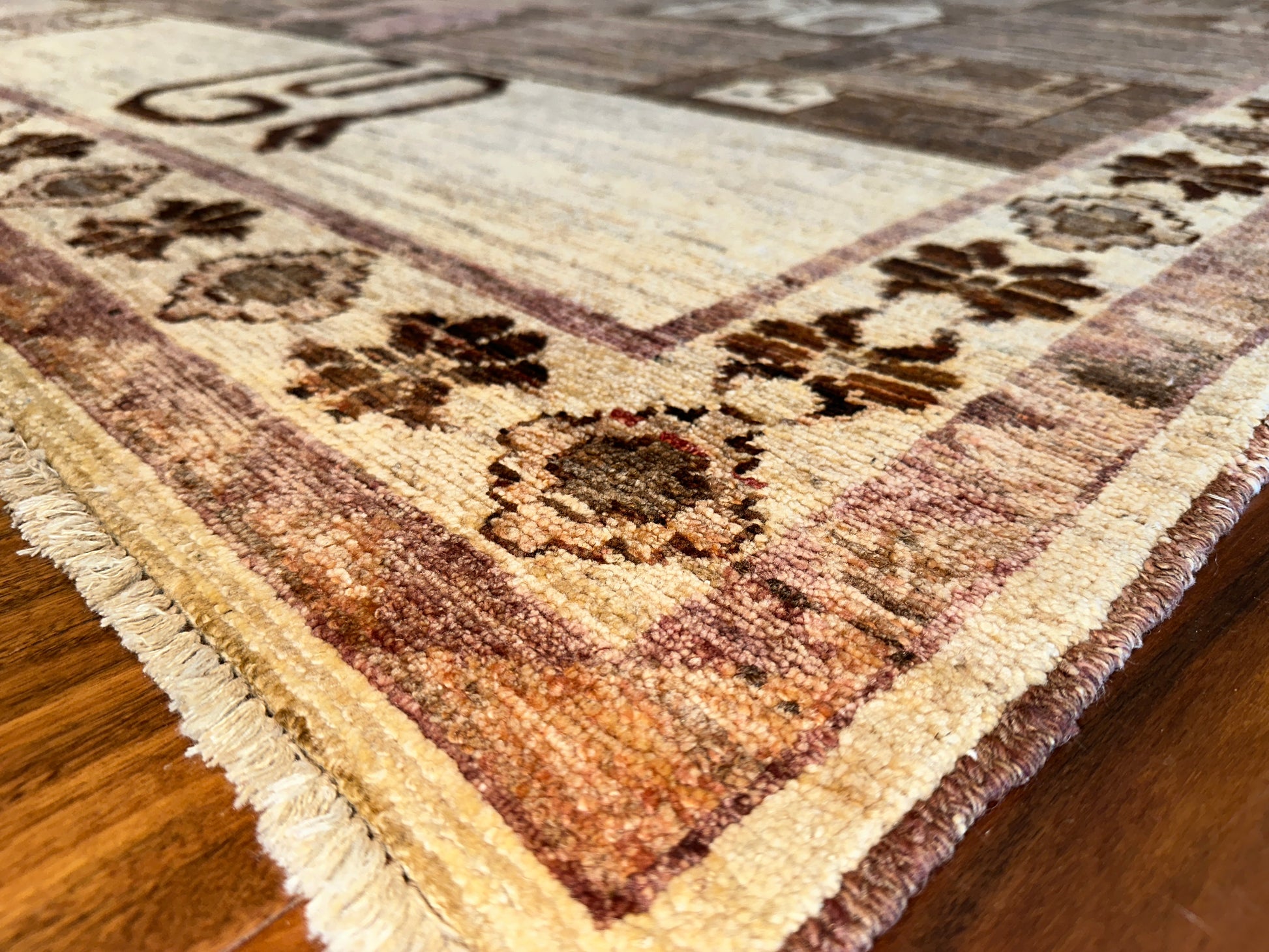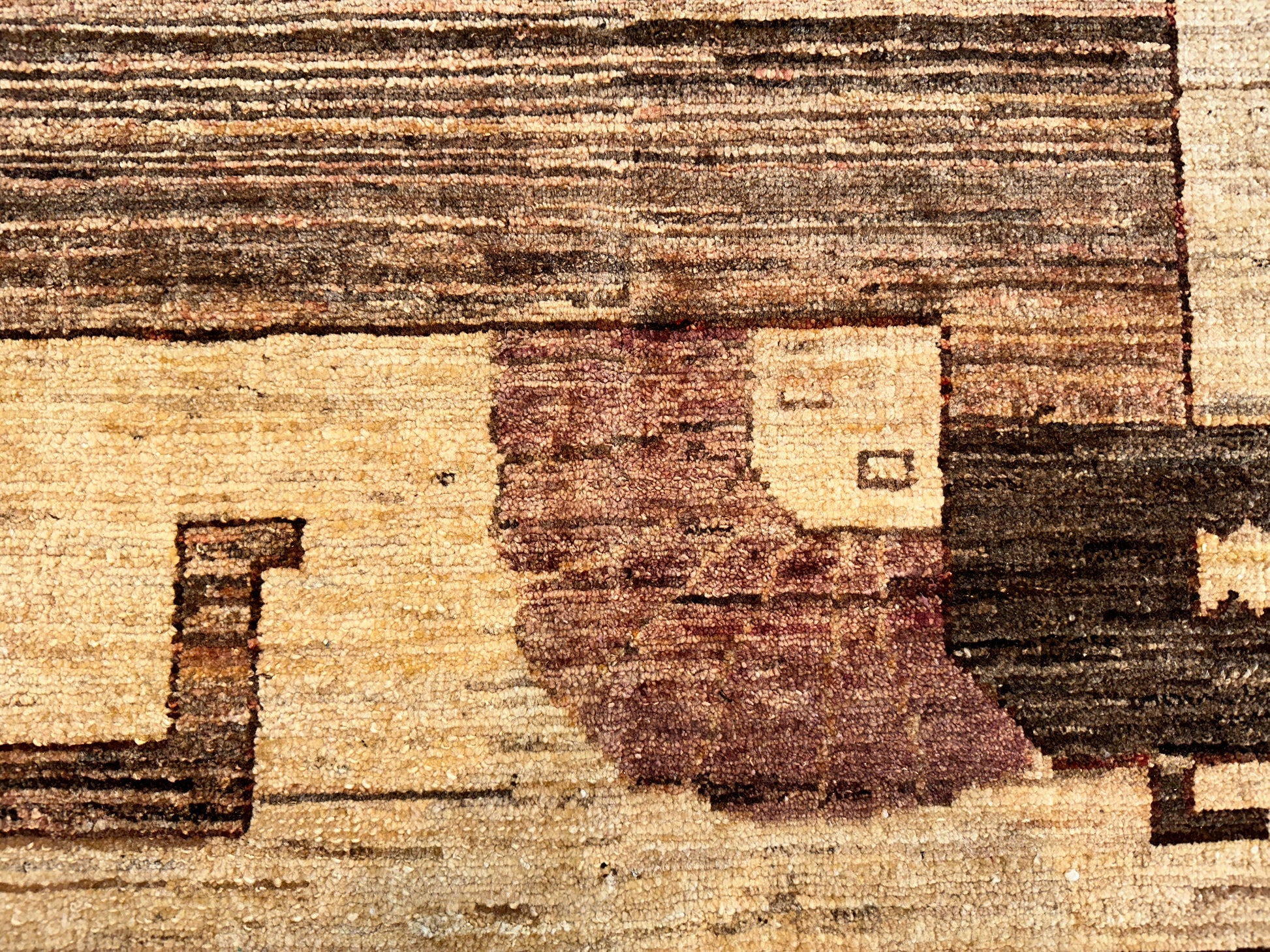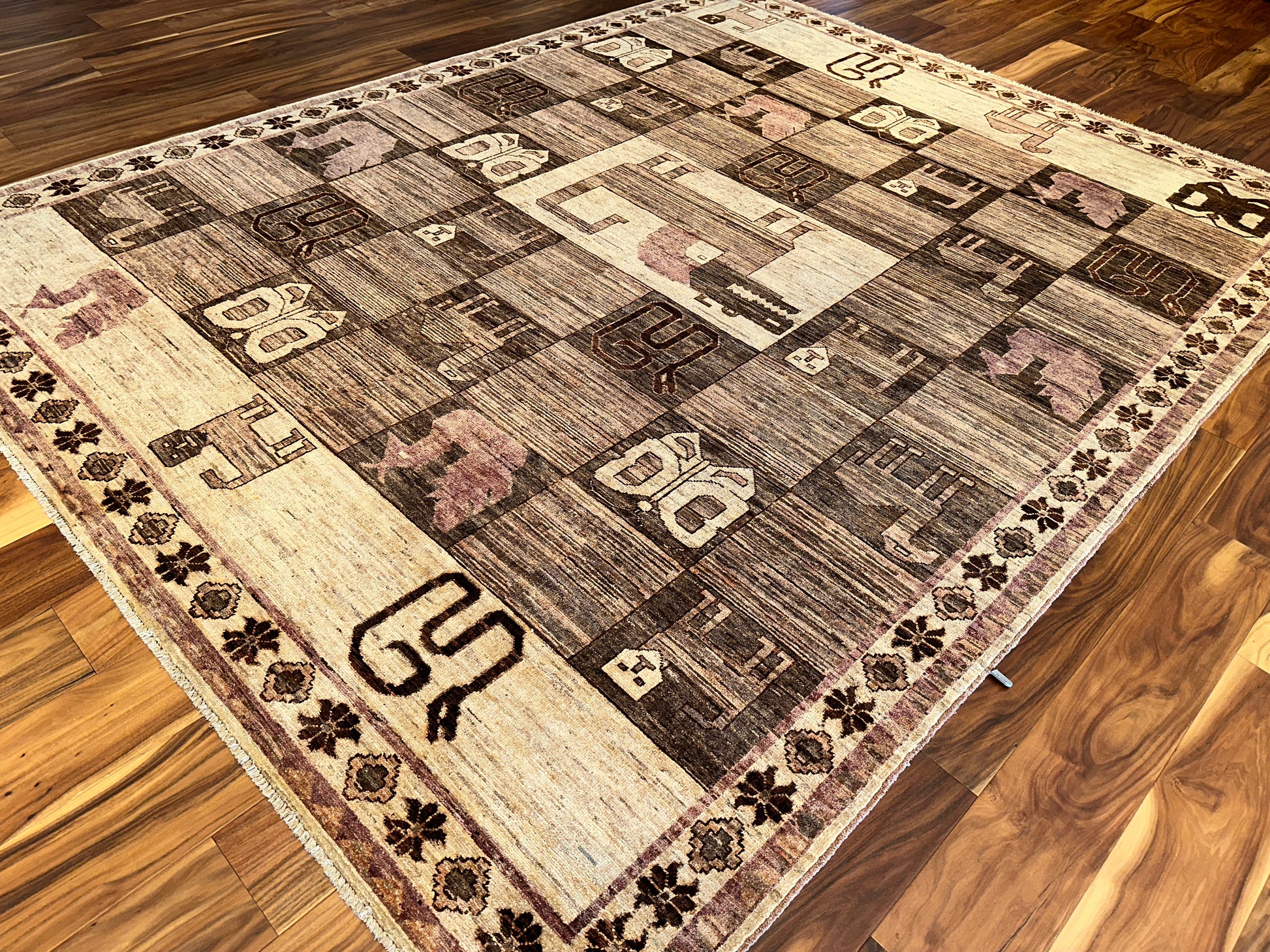 Playful yet grounded, this hand-knotted rug presents a captivating mosaic of whimsical animal and butterfly motifs set in a checkerboard layout. Warm shades of brown, tan, and soft rose form a harmonious palette, giving the design a folkloric charm. With its graphic silhouettes and natural wool texture, this piece brings a touch of artisanal whimsy to casual and eclectic interiors.