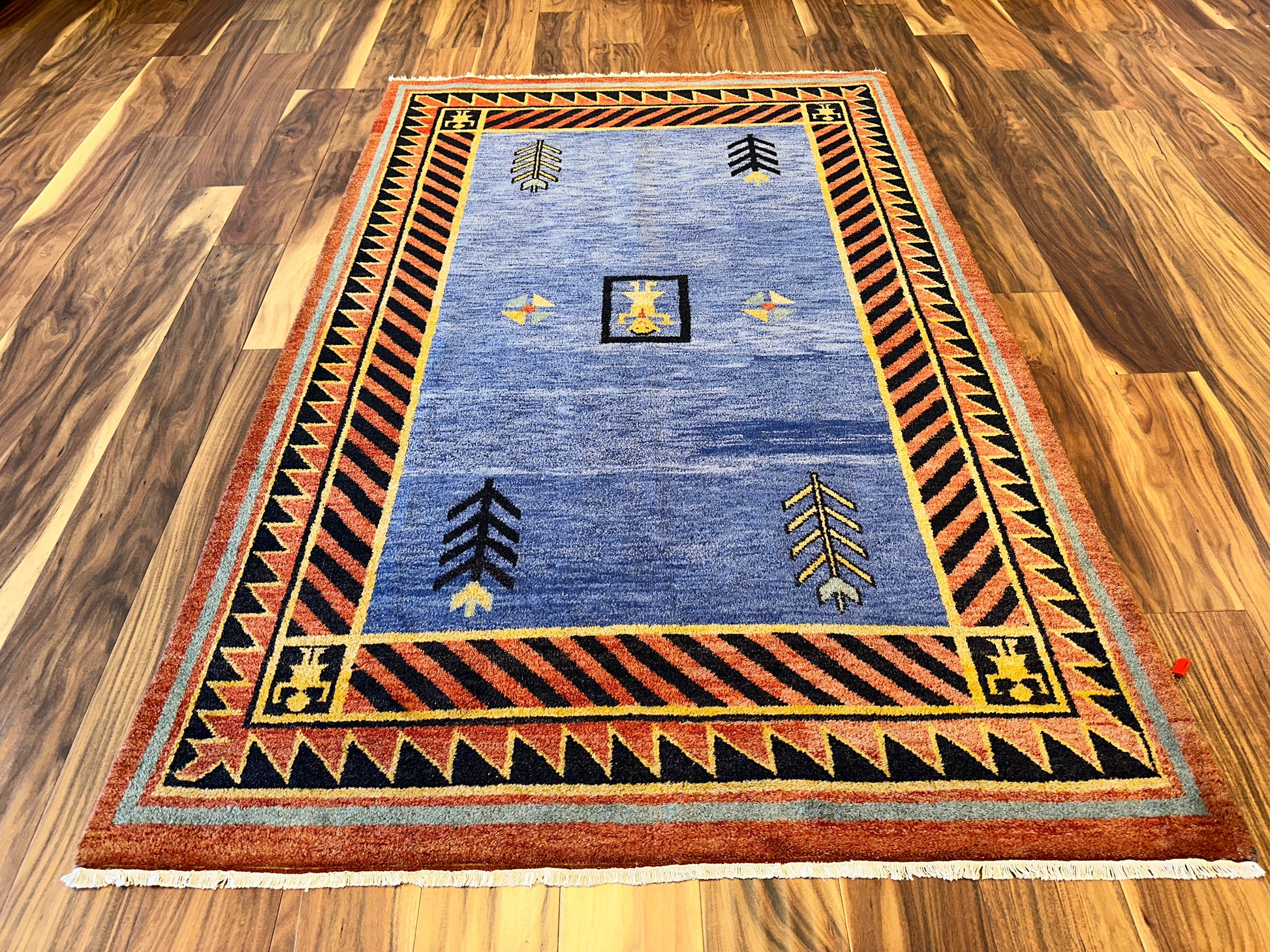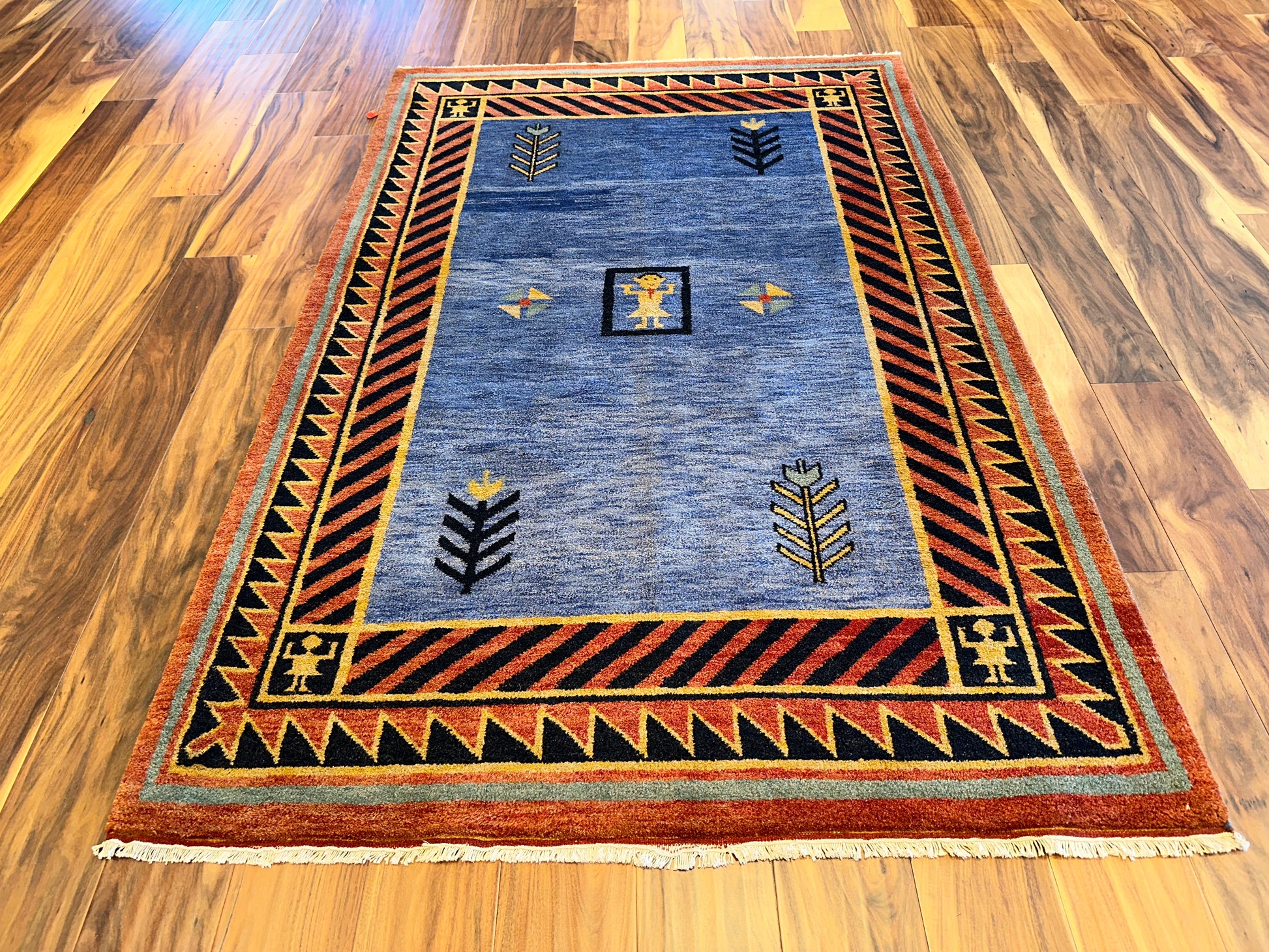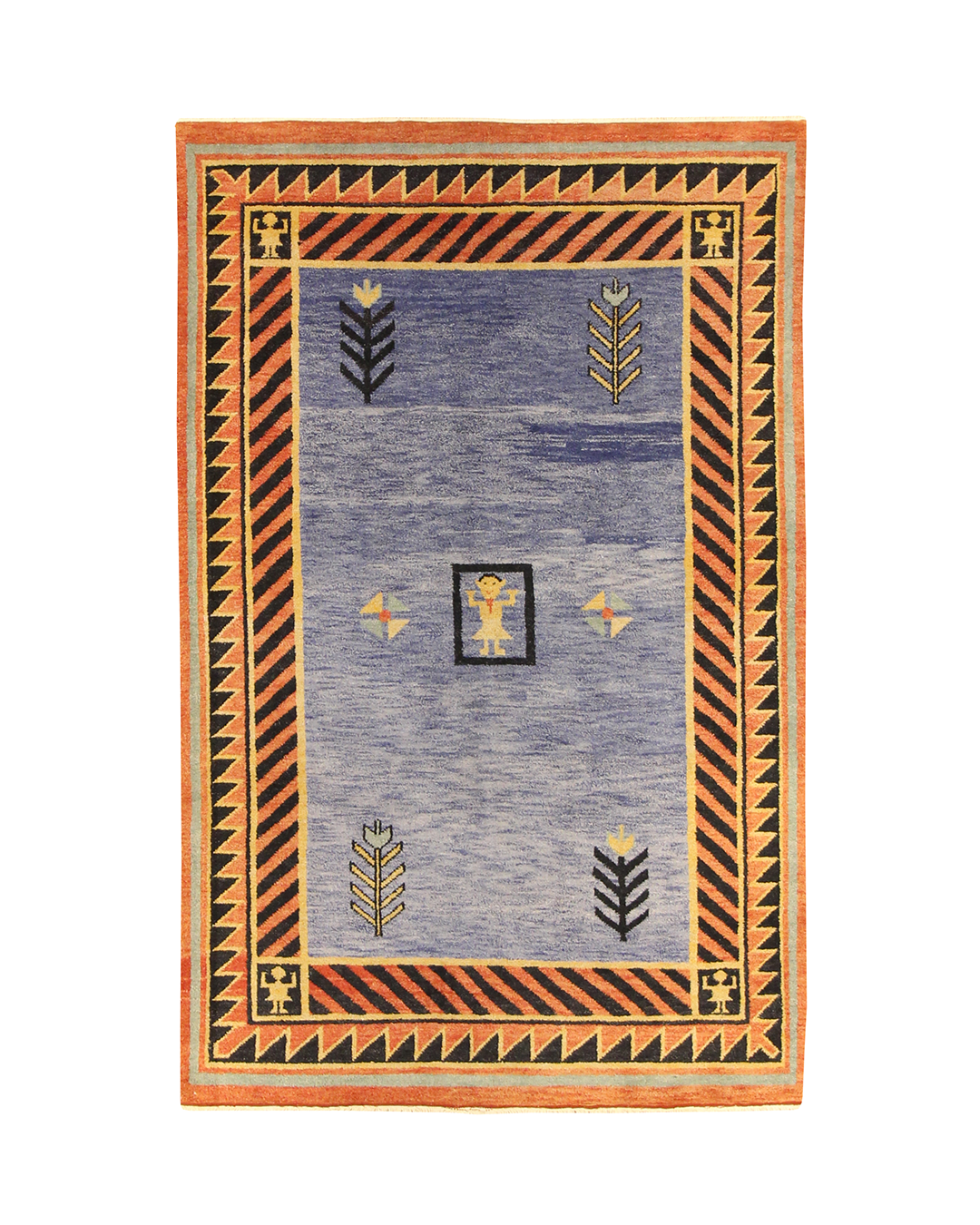 A vivid and spirited rug with tribal-inspired geometry, this handmade piece features a bold central medallion figure surrounded by graphic tree-like motifs and directional emblems. The field of mottled blue is framed by a dramatic diagonal stripe border in black and rust, accented with gold triangular elements and stylized corner figures. Its striking contrast and folk-art symbolism lend a sense of movement and storytelling to the room.