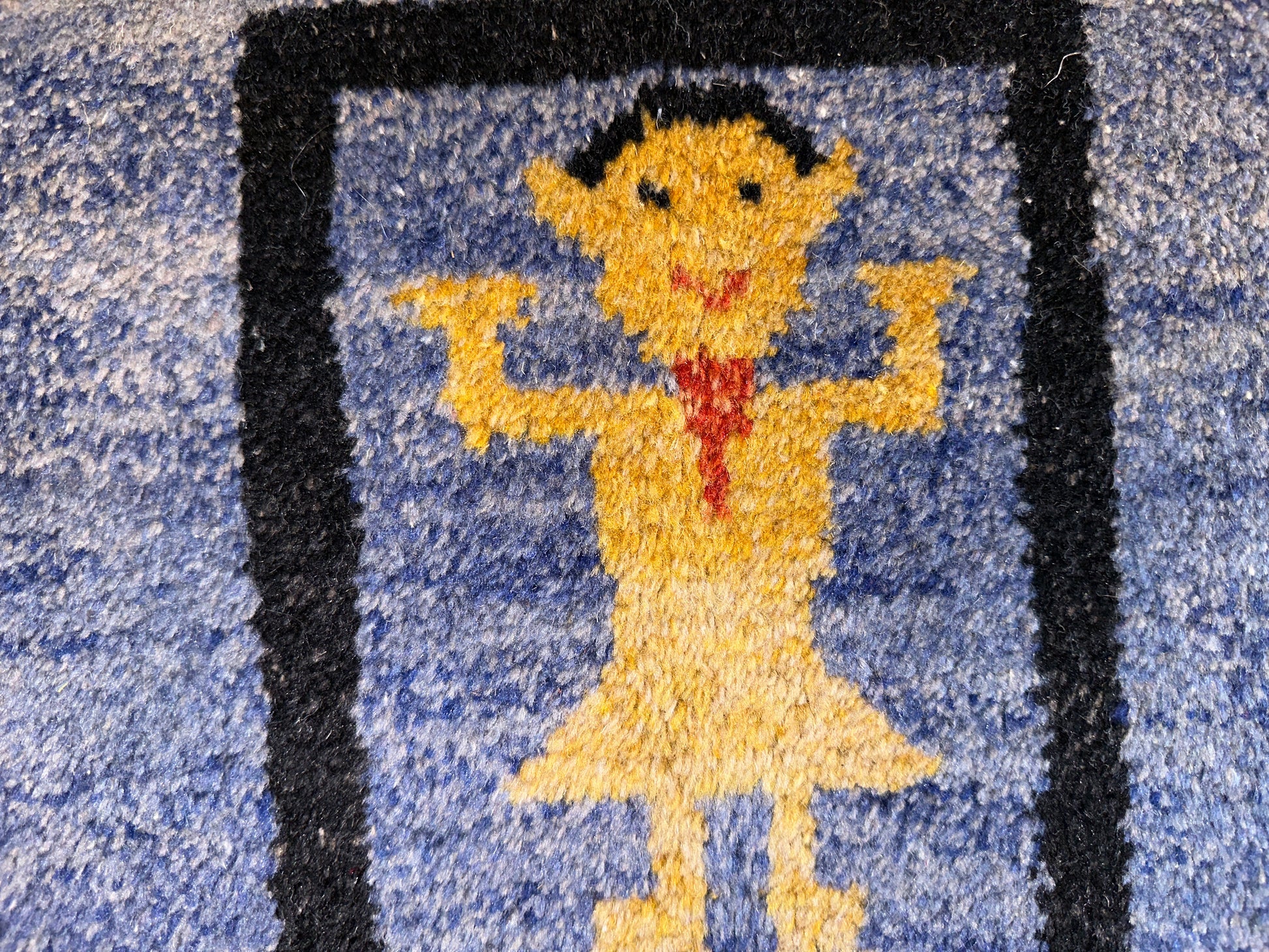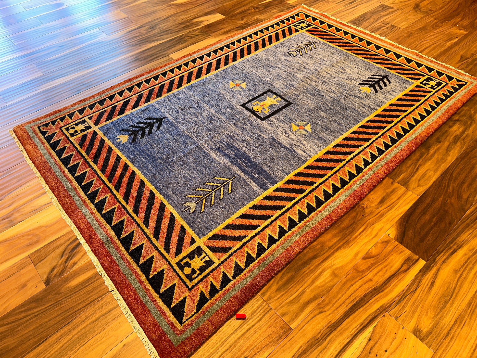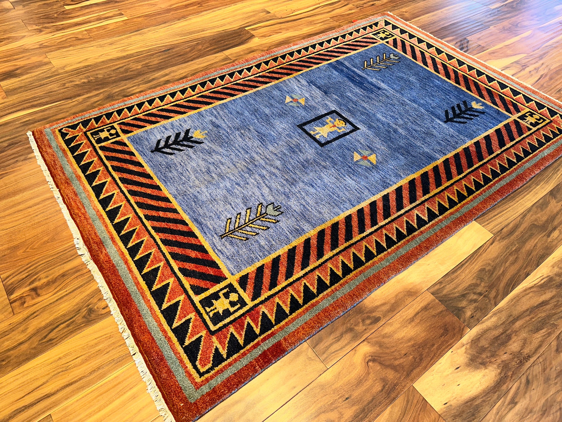 A vivid and spirited rug with tribal-inspired geometry, this handmade piece features a bold central medallion figure surrounded by graphic tree-like motifs and directional emblems. The field of mottled blue is framed by a dramatic diagonal stripe border in black and rust, accented with gold triangular elements and stylized corner figures. Its striking contrast and folk-art symbolism lend a sense of movement and storytelling to the room.