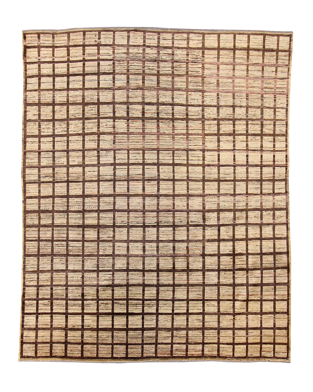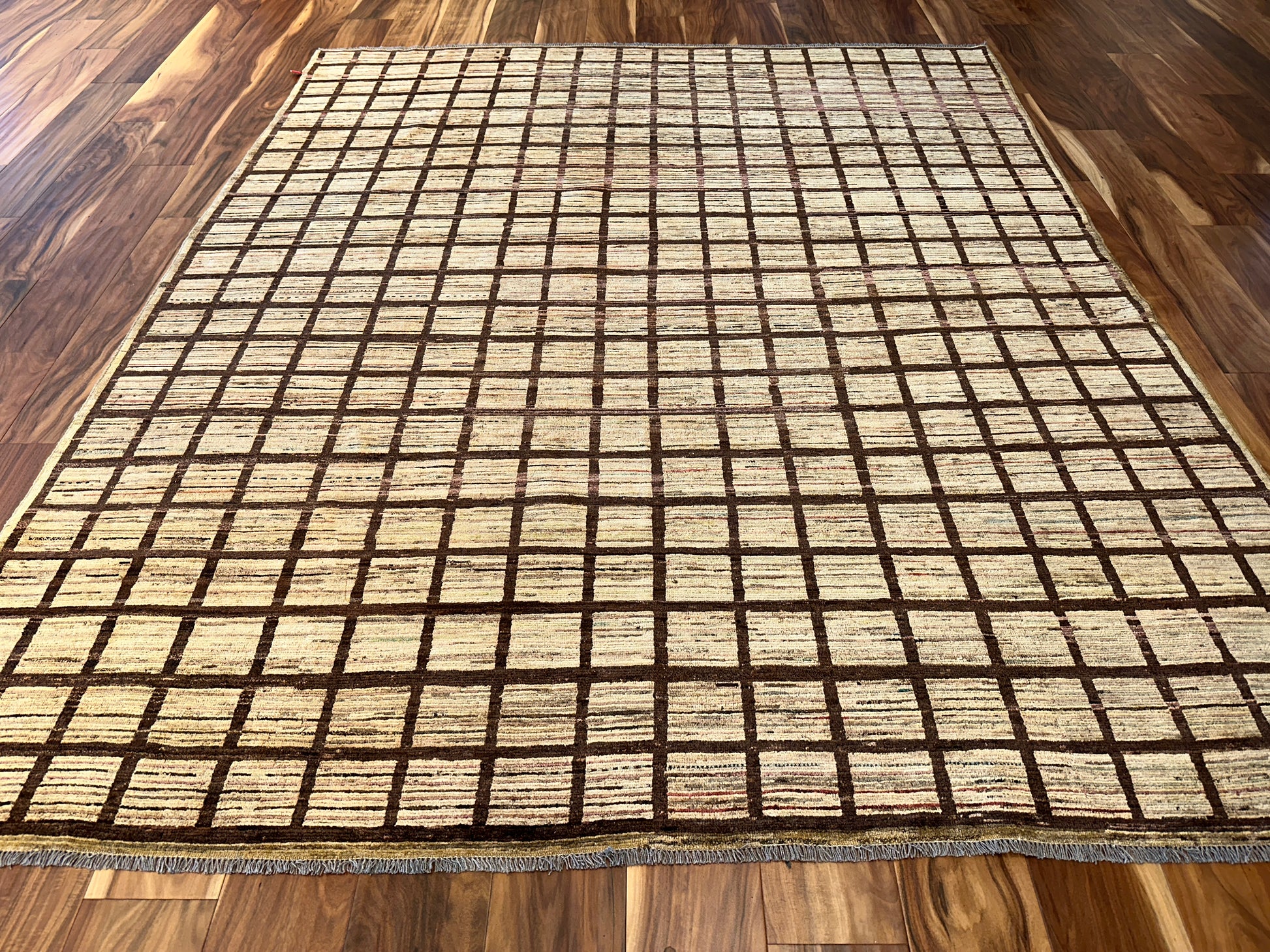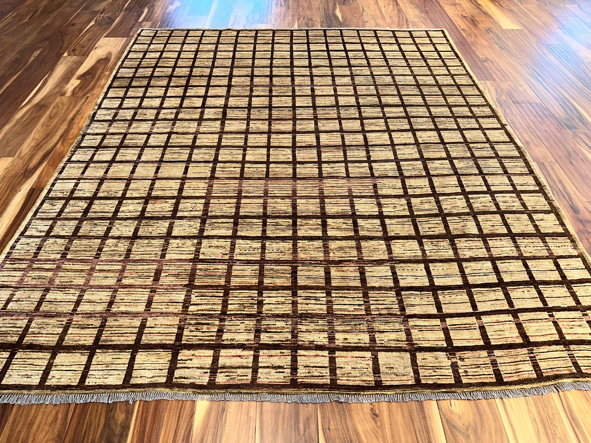 This handmade rug features a striking gridwork of warm brown lines over a softly variegated beige field, creating a rhythm of order and texture that feels both grounded and contemporary. The subtle shifts in tone within each square introduce a handcrafted irregularity, giving life to the simplicity of the geometric layout. Its minimalist elegance makes it a versatile foundation piece for modern, transitional, or even rustic settings.