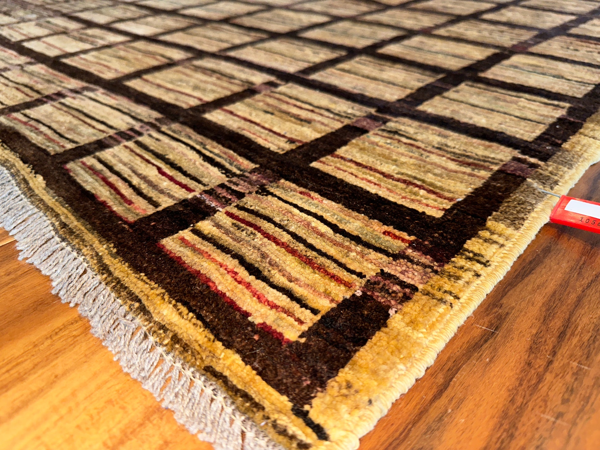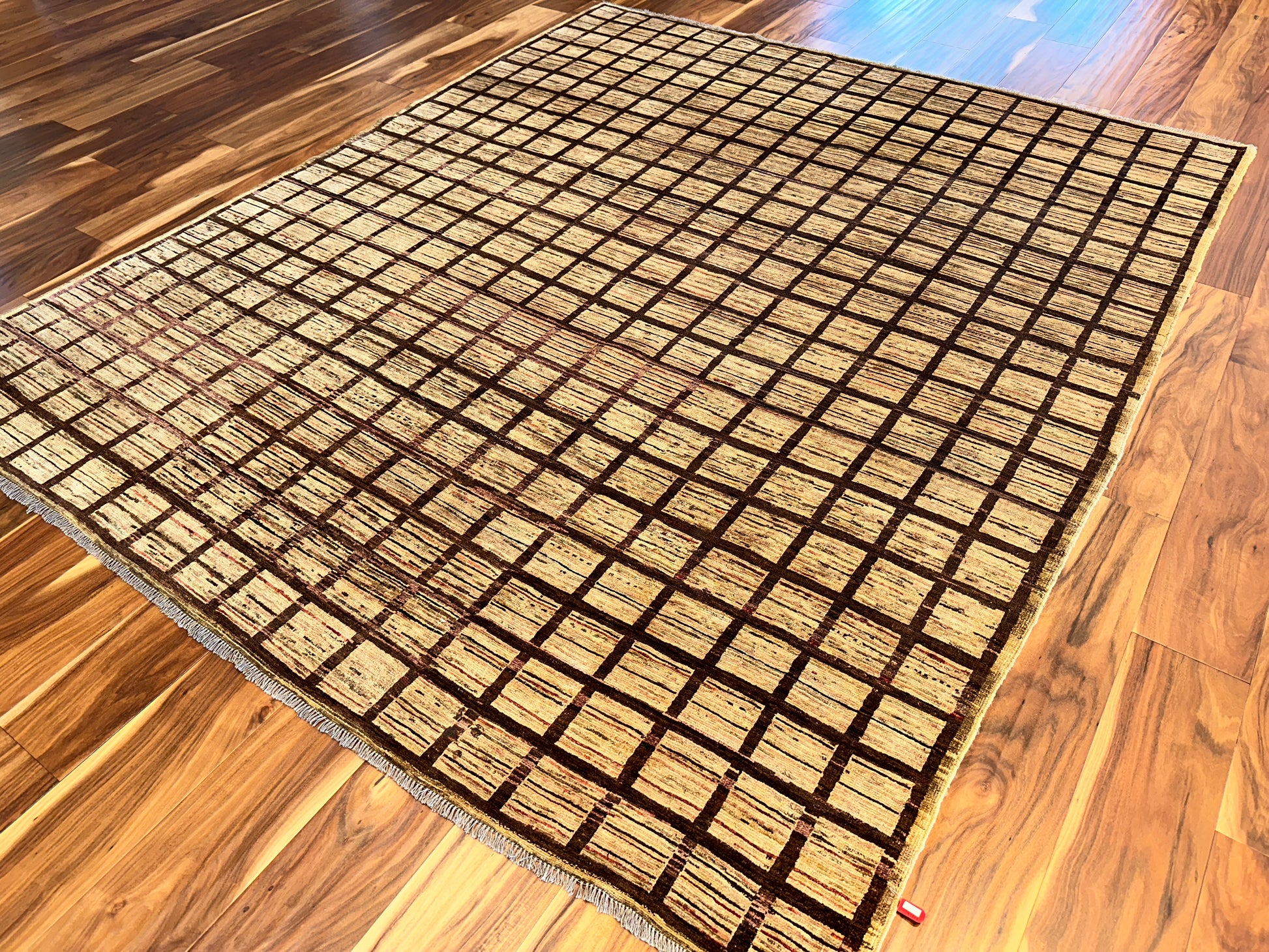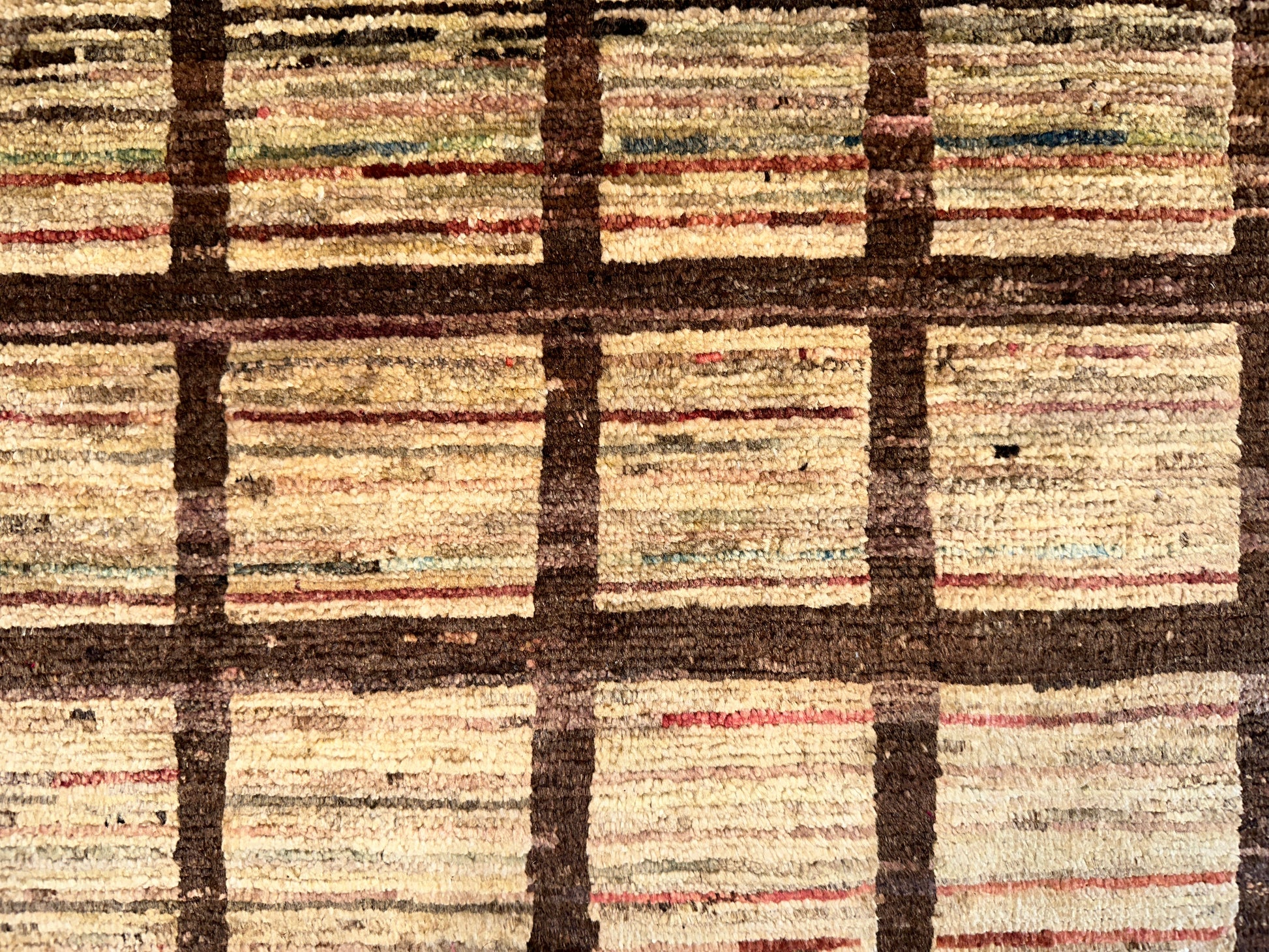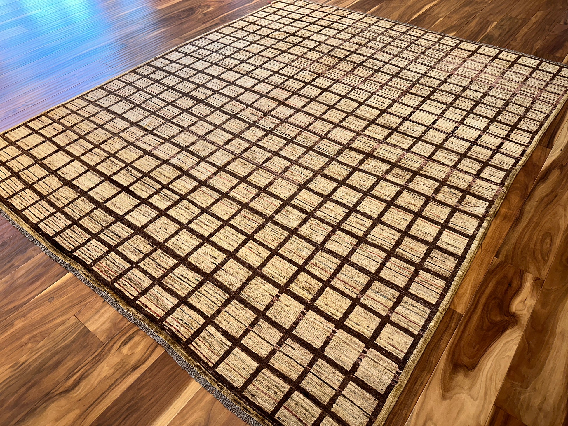 This handmade rug features a striking gridwork of warm brown lines over a softly variegated beige field, creating a rhythm of order and texture that feels both grounded and contemporary. The subtle shifts in tone within each square introduce a handcrafted irregularity, giving life to the simplicity of the geometric layout. Its minimalist elegance makes it a versatile foundation piece for modern, transitional, or even rustic settings.