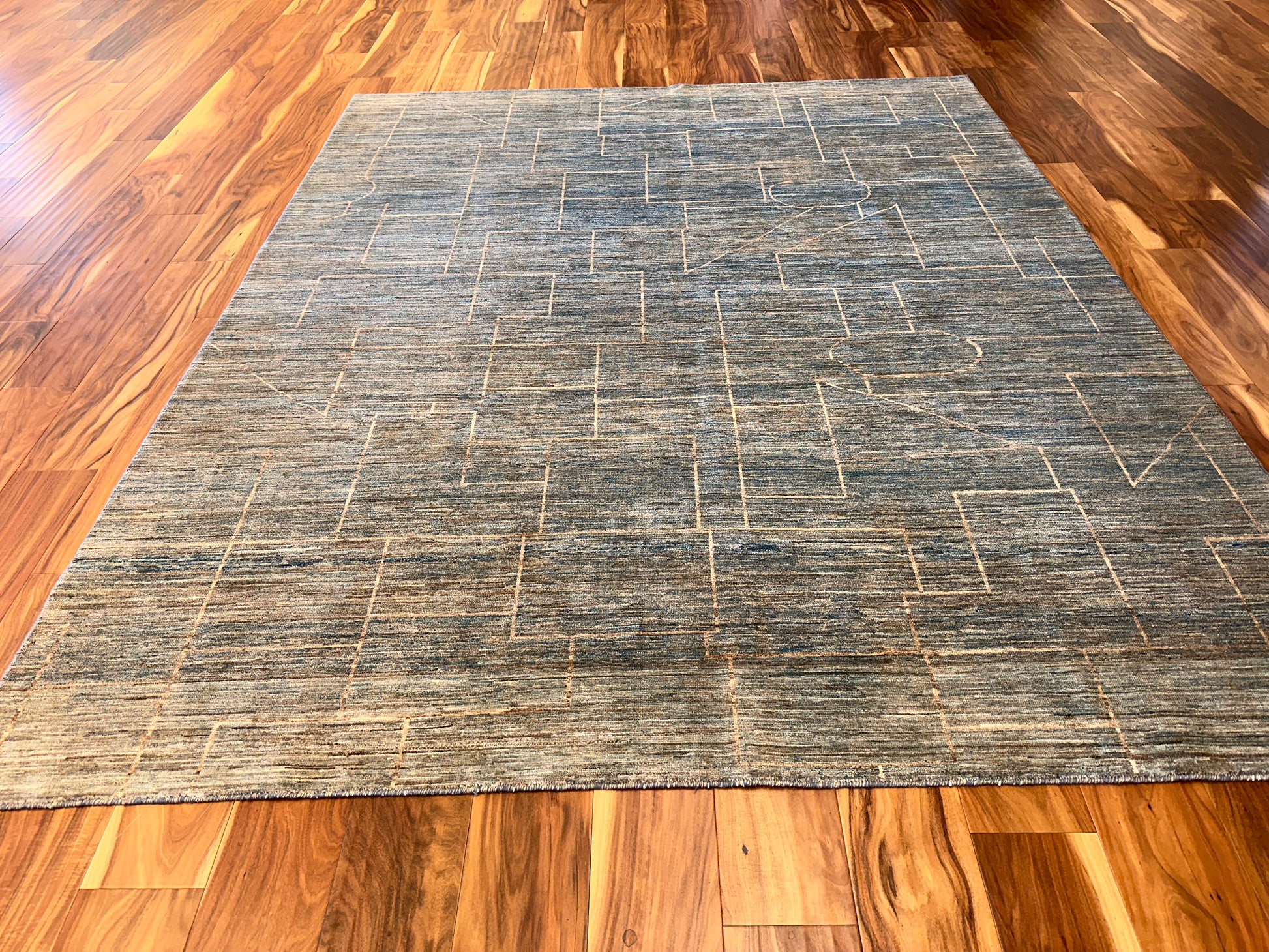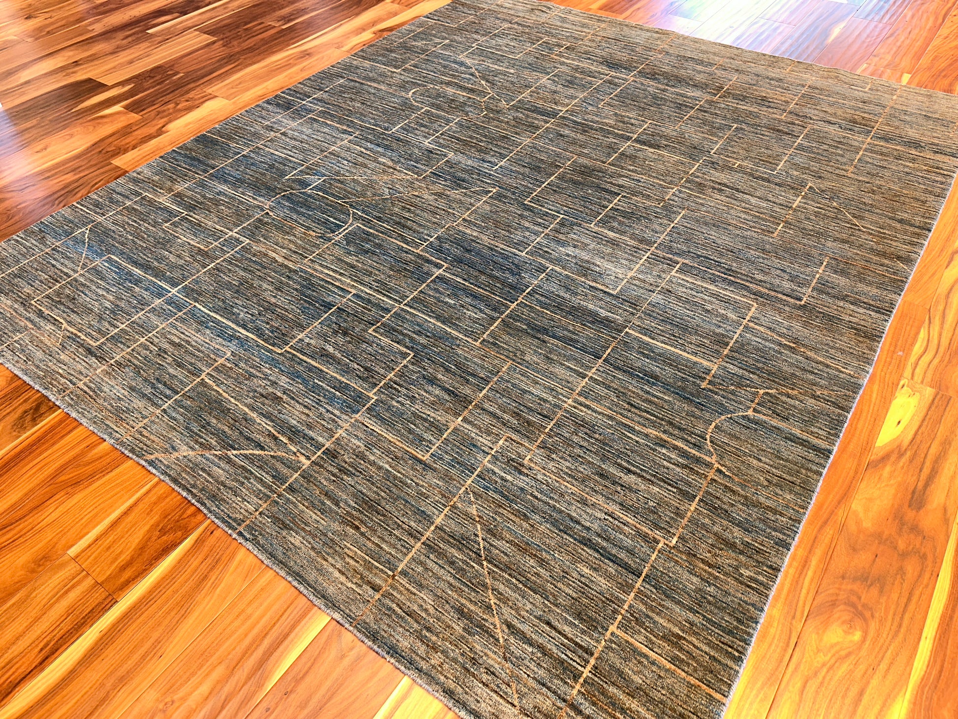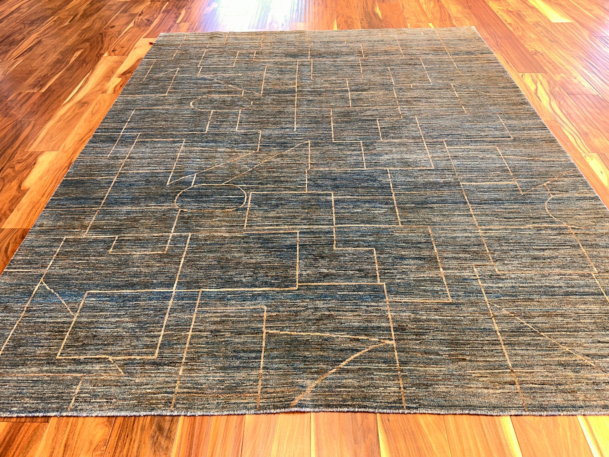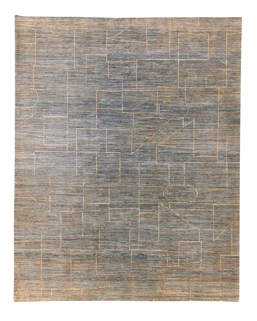 A soft graphite and mineral-blue palette brings a calm, architectural feeling to this contemporary handwoven rug. Fine-lined geometric contours rise subtly from the background, creating a layered, abstract grid with just enough contrast to capture the eye without disrupting the space. Its tonal restraint and modern pattern make it a sophisticated anchor for open, minimalist, or transitional rooms.