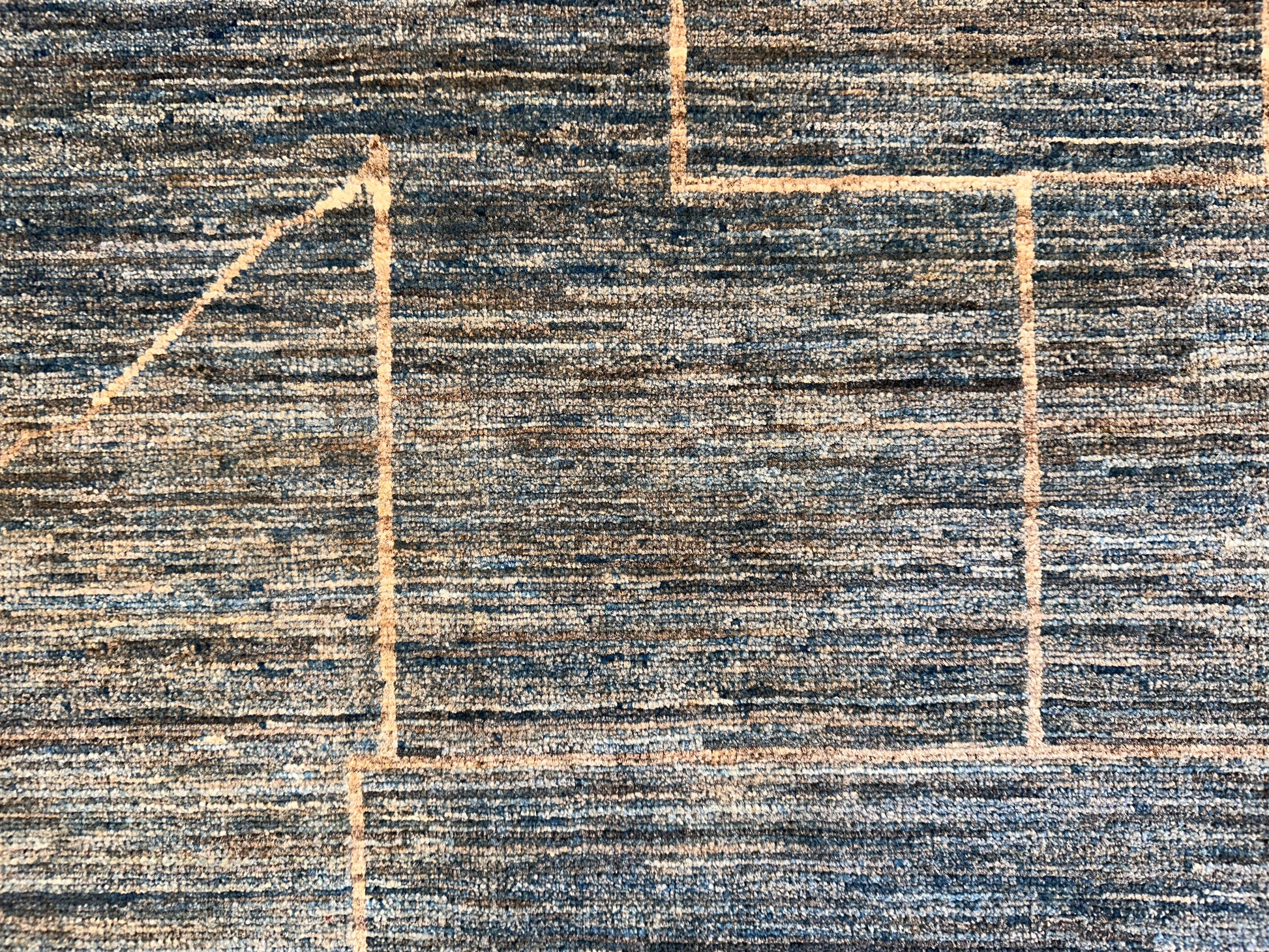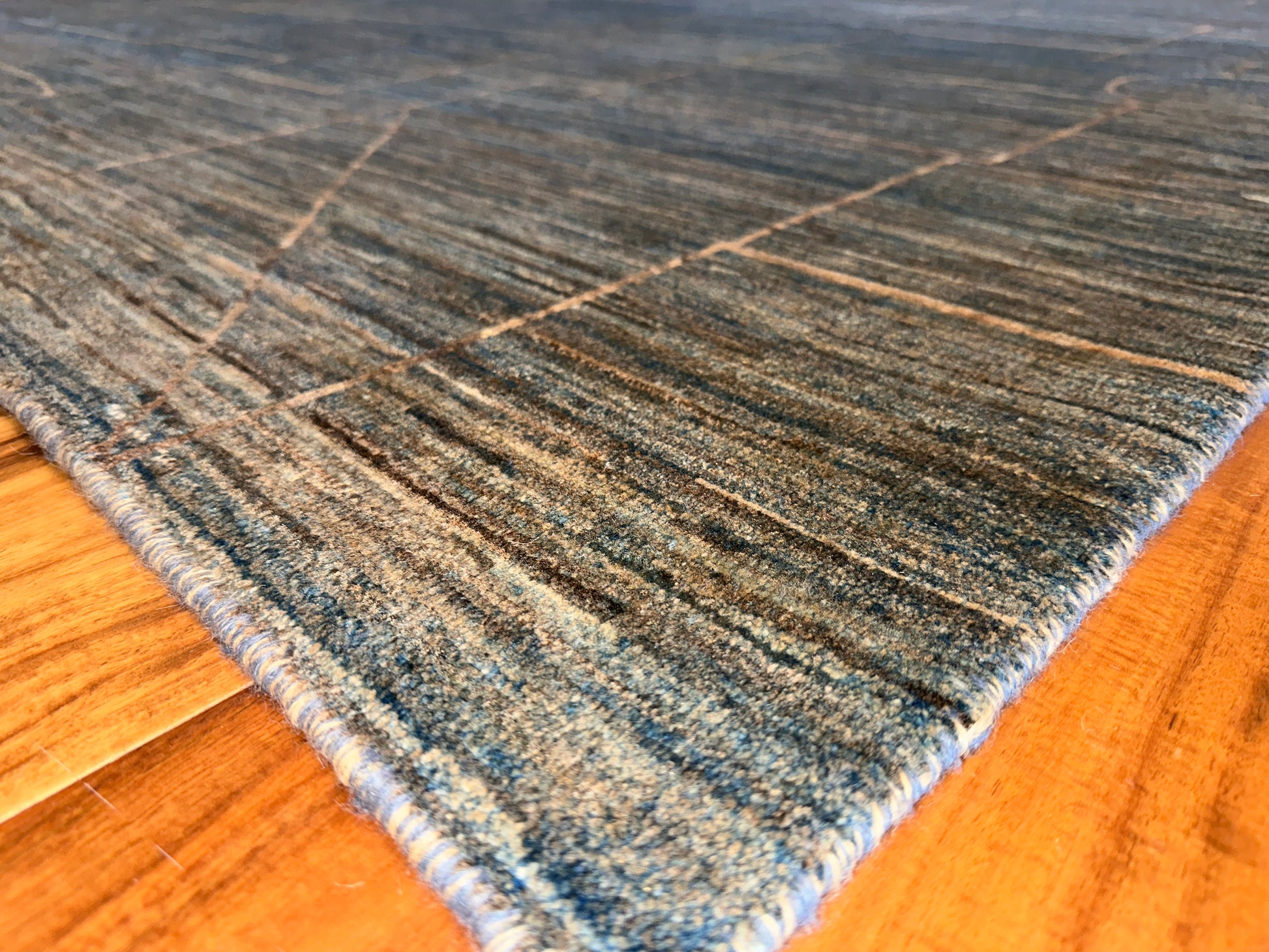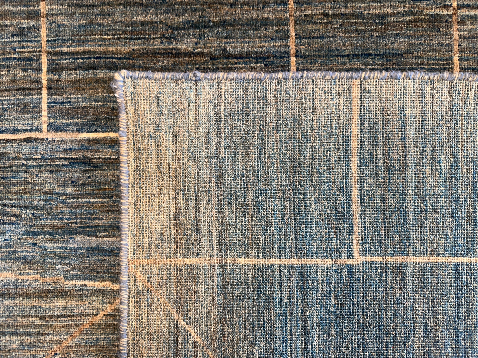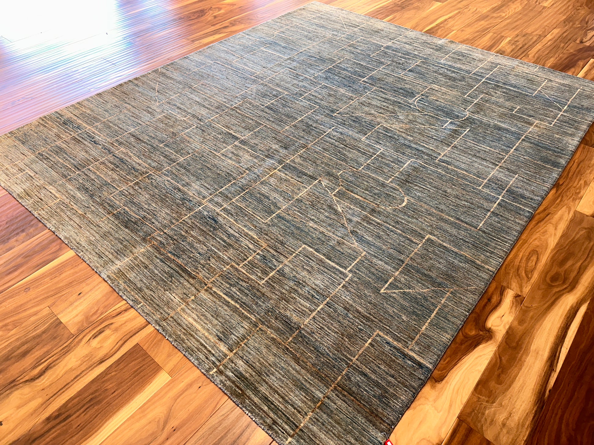 A soft graphite and mineral-blue palette brings a calm, architectural feeling to this contemporary handwoven rug. Fine-lined geometric contours rise subtly from the background, creating a layered, abstract grid with just enough contrast to capture the eye without disrupting the space. Its tonal restraint and modern pattern make it a sophisticated anchor for open, minimalist, or transitional rooms.