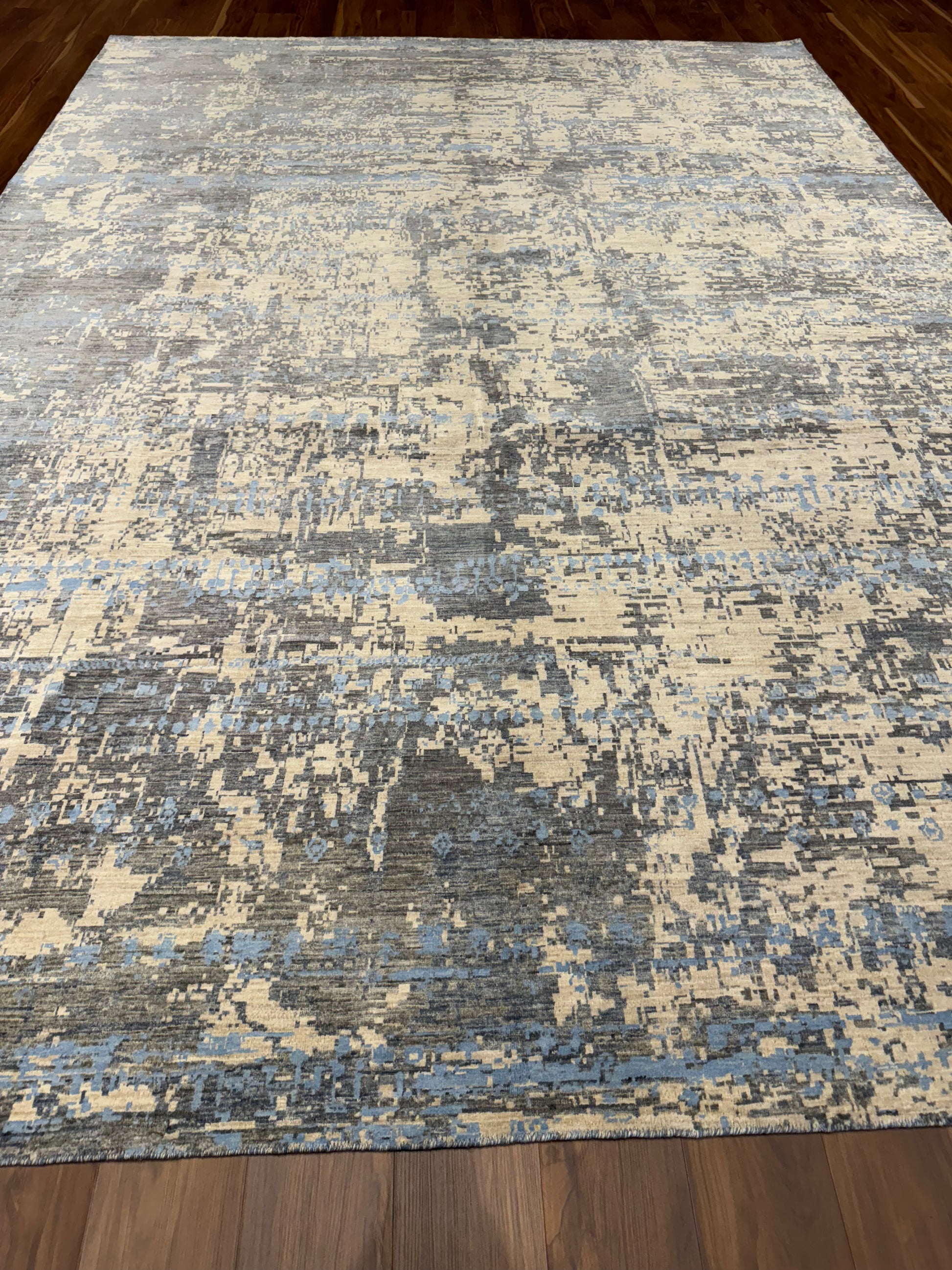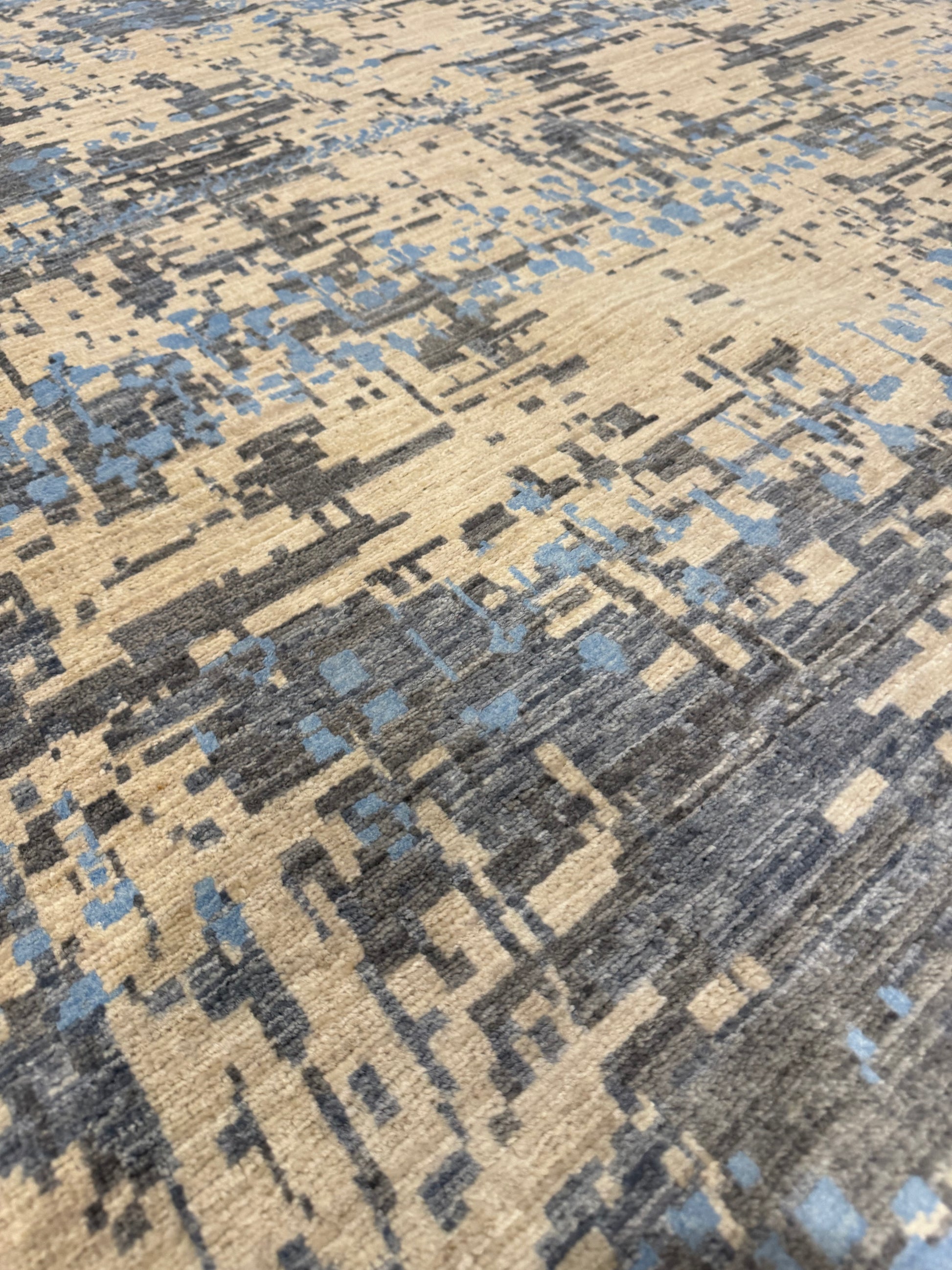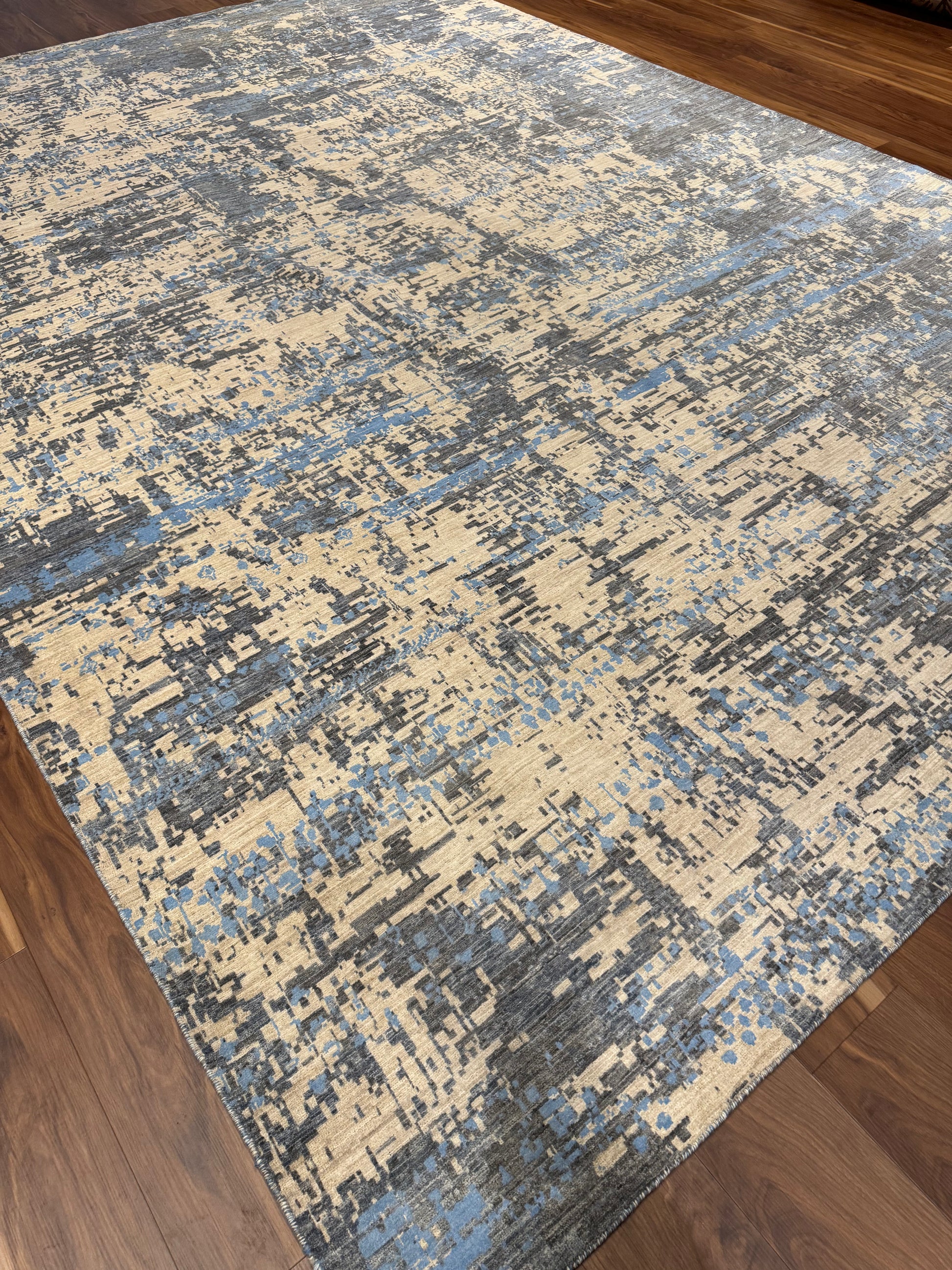 This Modern Abstract Wool/Silk rug showcases an avant-garde design, mixing a luxurious golden tone with subtle hints of beige and taupe. Its abstract pattern mimics an organic, weathered texture, resembling watermarks or an ancient fresco. The use of high-quality wool and silk provides both comfort and elegance, making it a versatile addition to any contemporary living space.