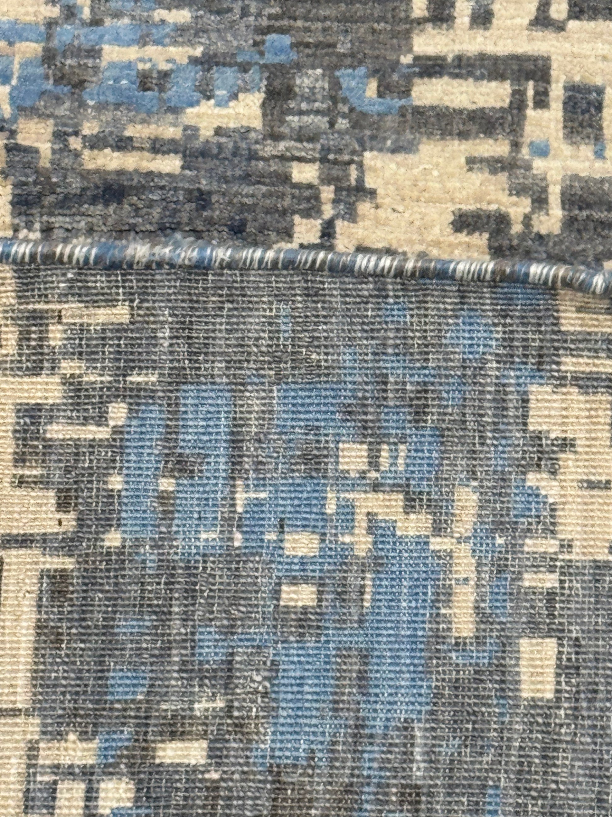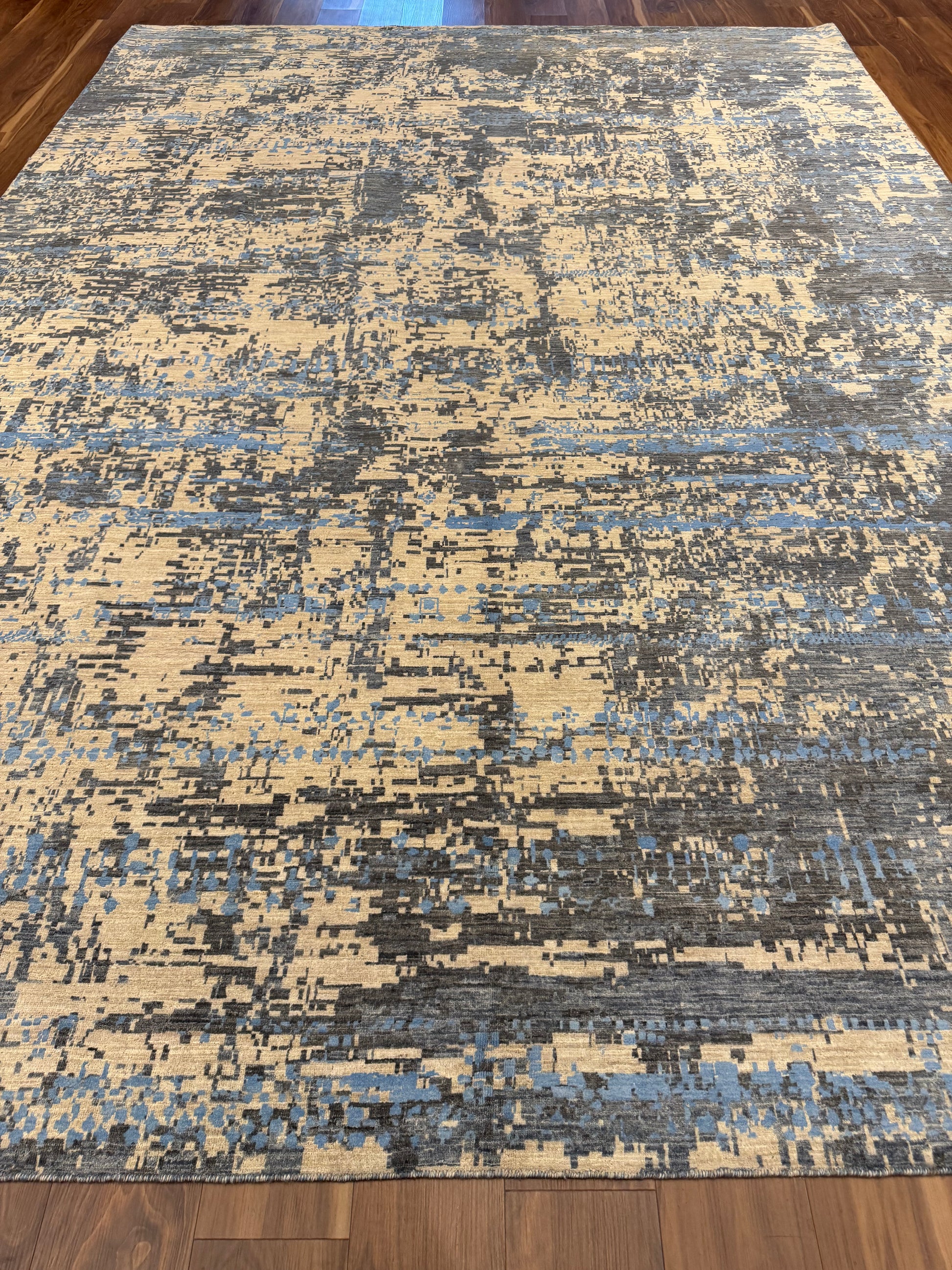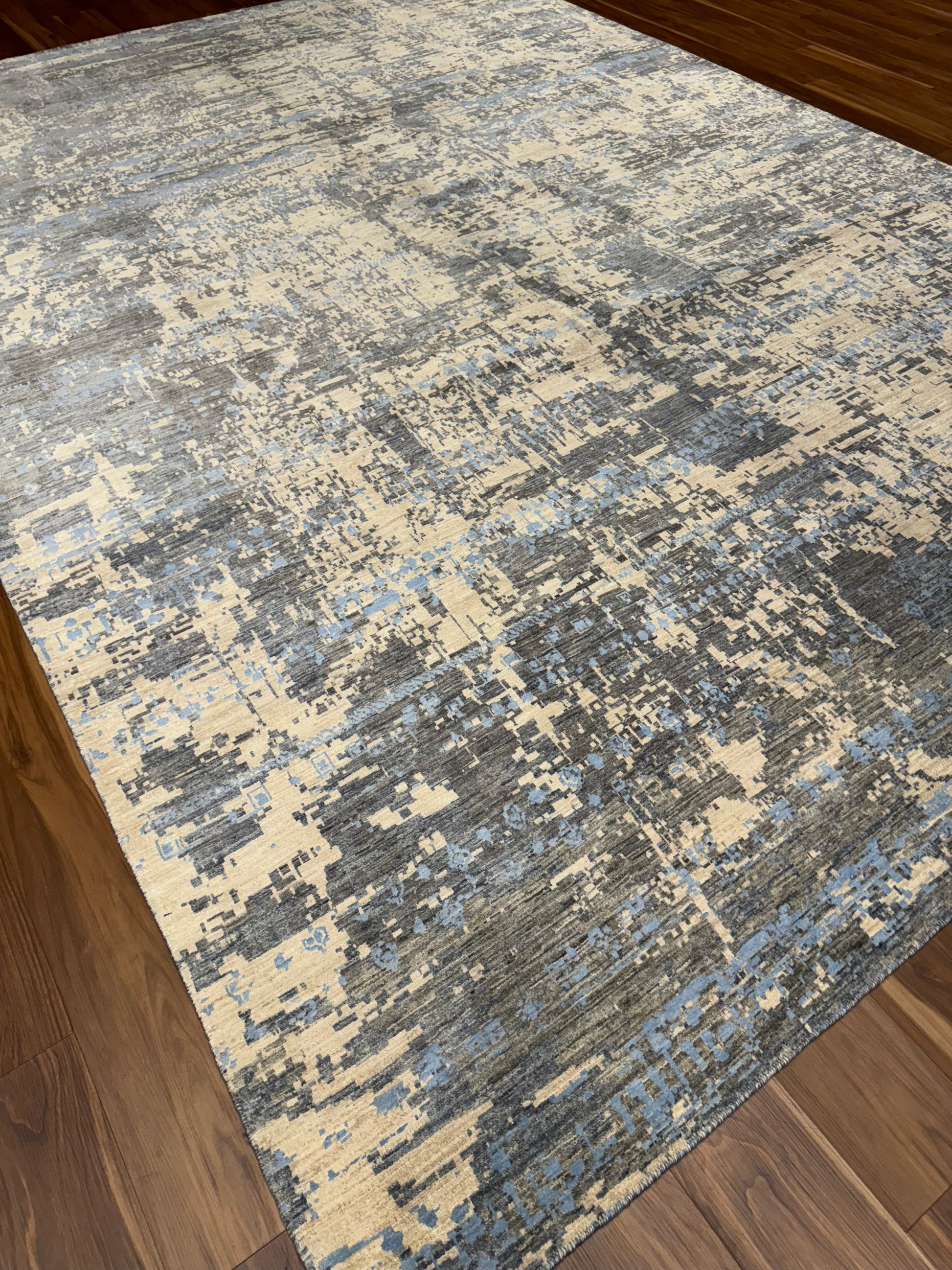 This Modern Abstract Wool/Silk rug showcases an avant-garde design, mixing a luxurious golden tone with subtle hints of beige and taupe. Its abstract pattern mimics an organic, weathered texture, resembling watermarks or an ancient fresco. The use of high-quality wool and silk provides both comfort and elegance, making it a versatile addition to any contemporary living space.
